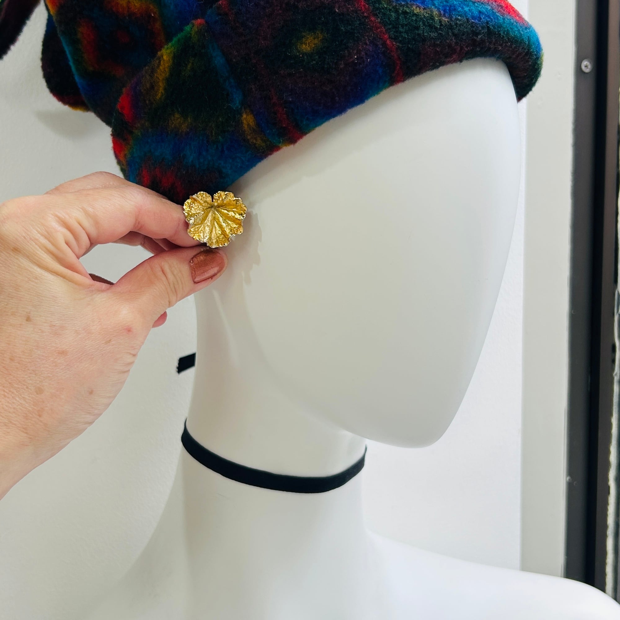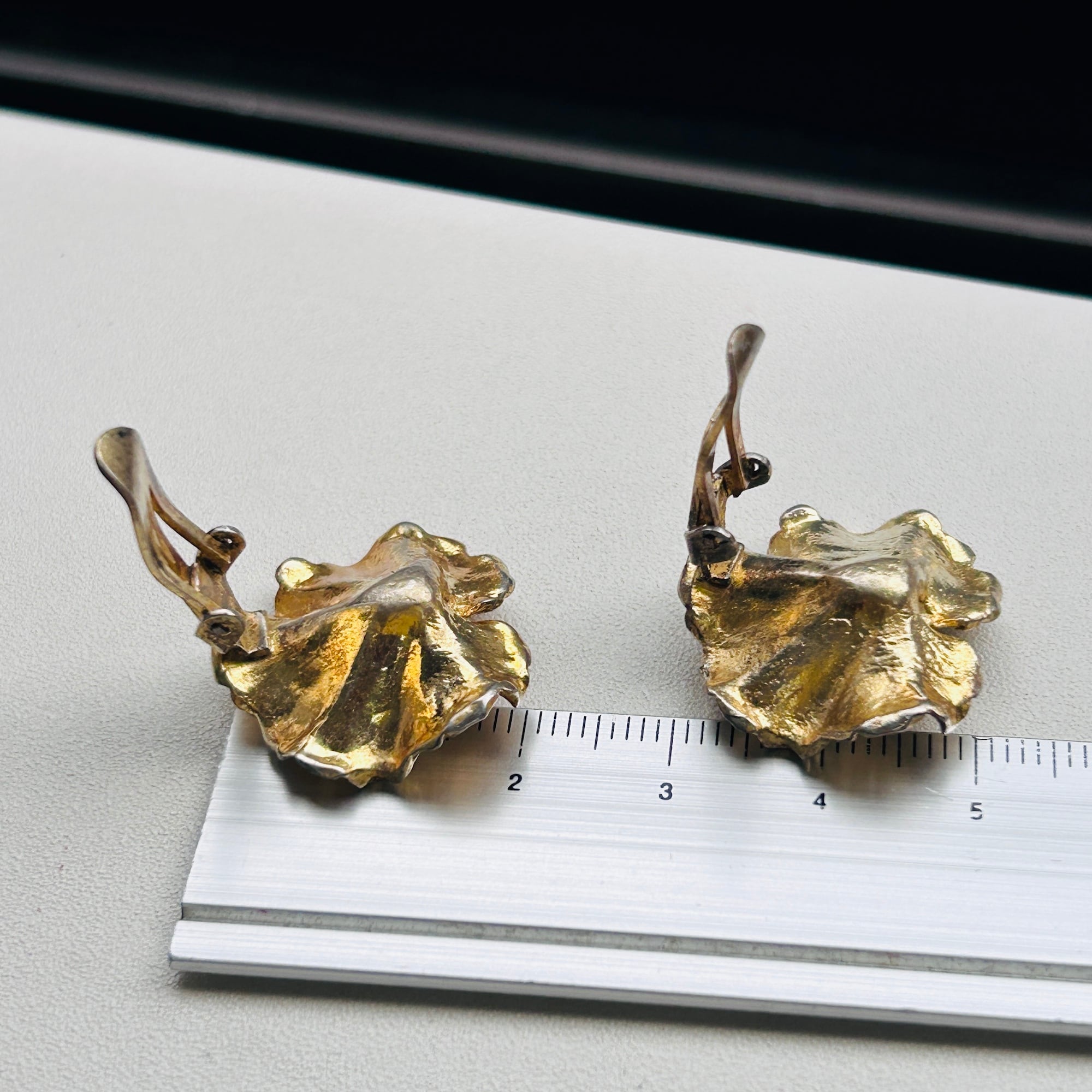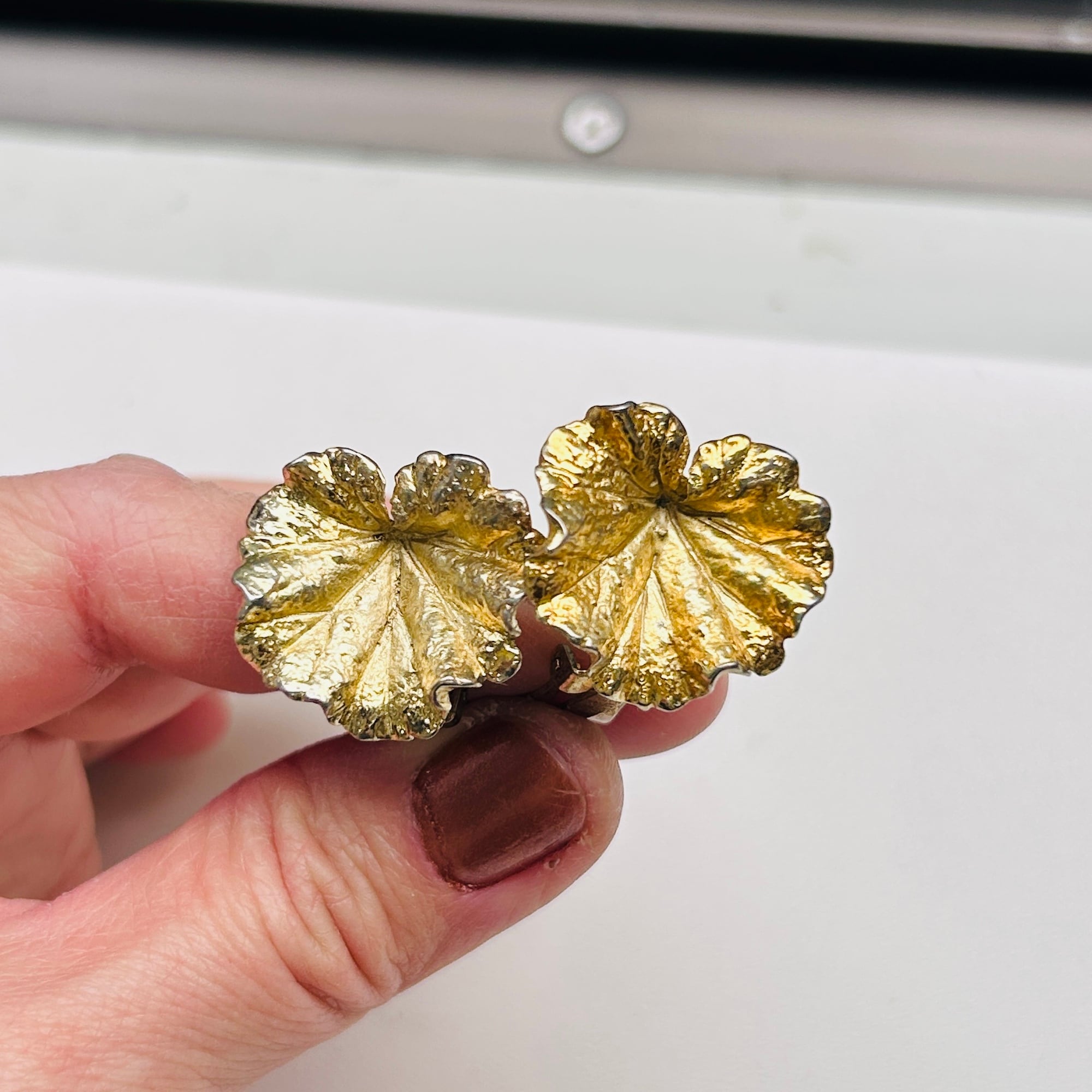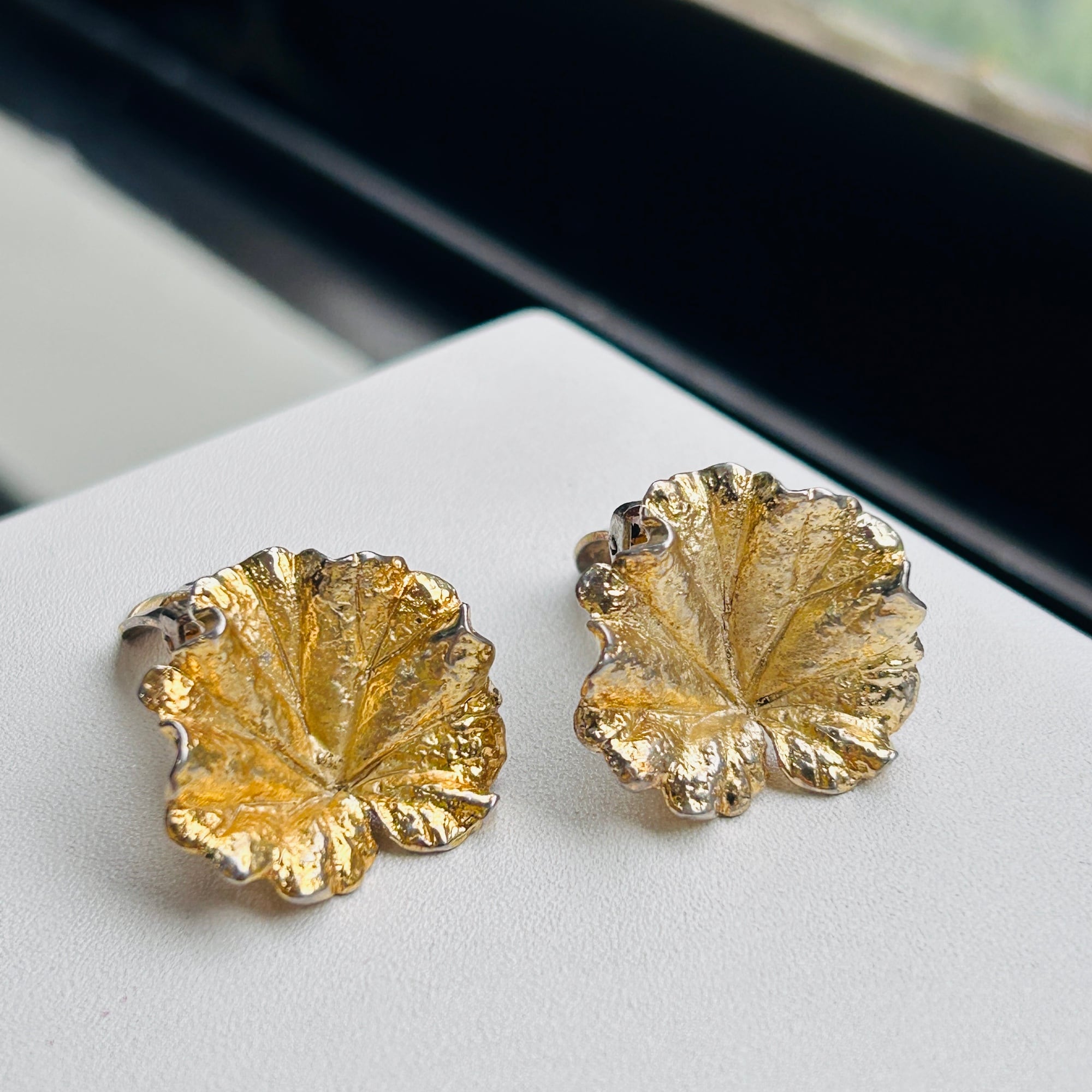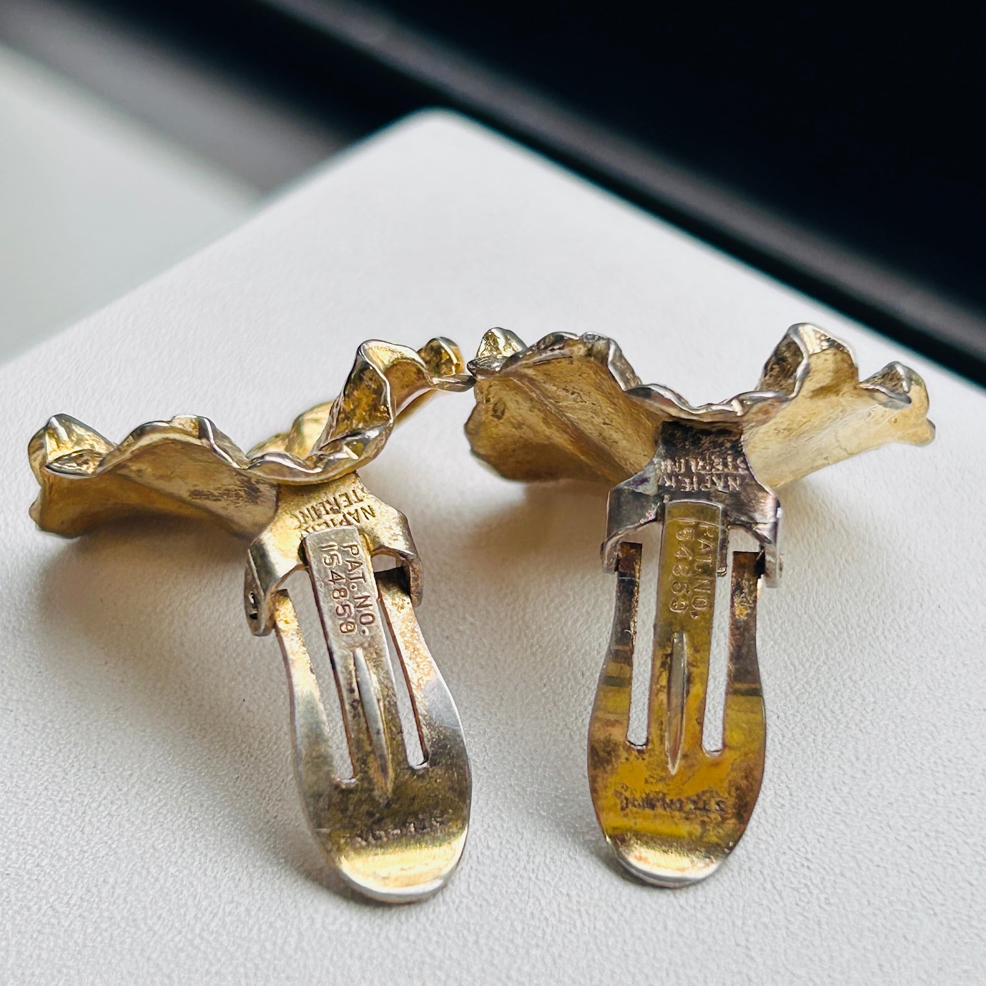 リアルなリーフモチーフイヤリング。シルバーに金メッキが施されています。所々薄れたりハゲたりして古い味わいのあるイヤリングです。左右で色褪せ方も違います。手元で見比べると気づきますが着けると気にならない程度です。金メッキシルバーは下地のシルバーが変色して金の色味が濃く変色していきます。現状の写真はシルバー液体クリーナーでキレイにしたところです。使っているともう少しダークな金色になってきます。どちらの色味も新品とは全く異なる古い風合いがあり素敵です。クリップは軽くて優しいつけ心地。「NAPIER」「STERLING」刻印。コスチュームジュエリーメーカーのシルバーアイテムです。Good Price!