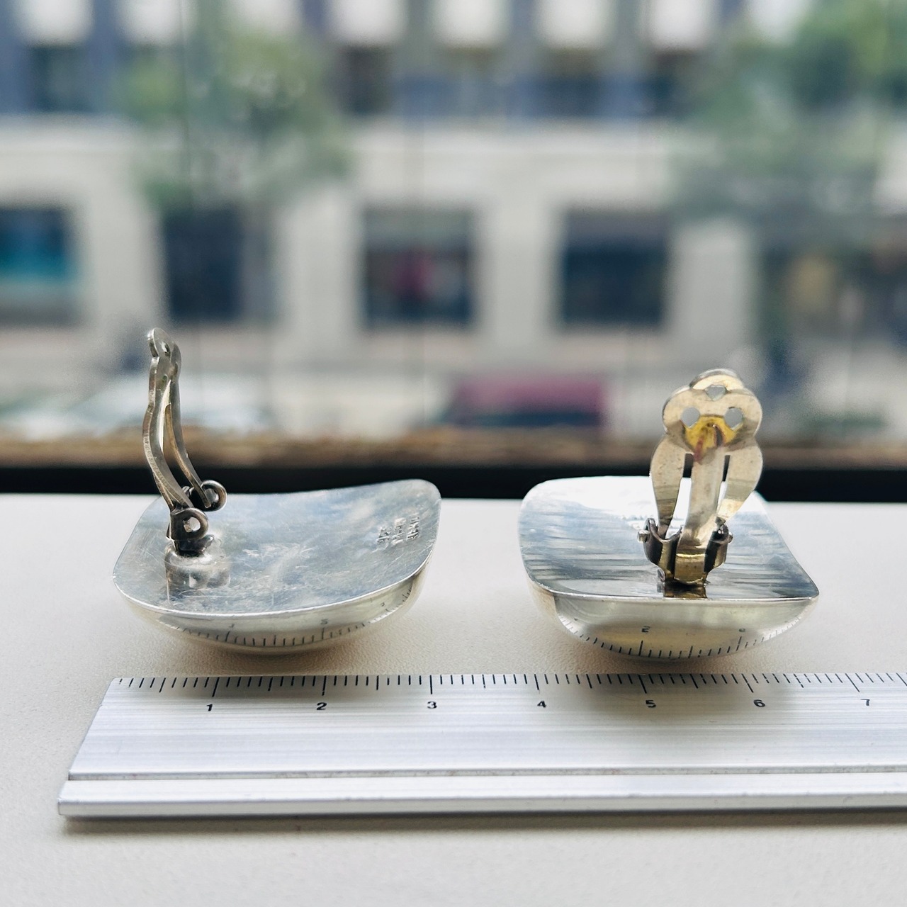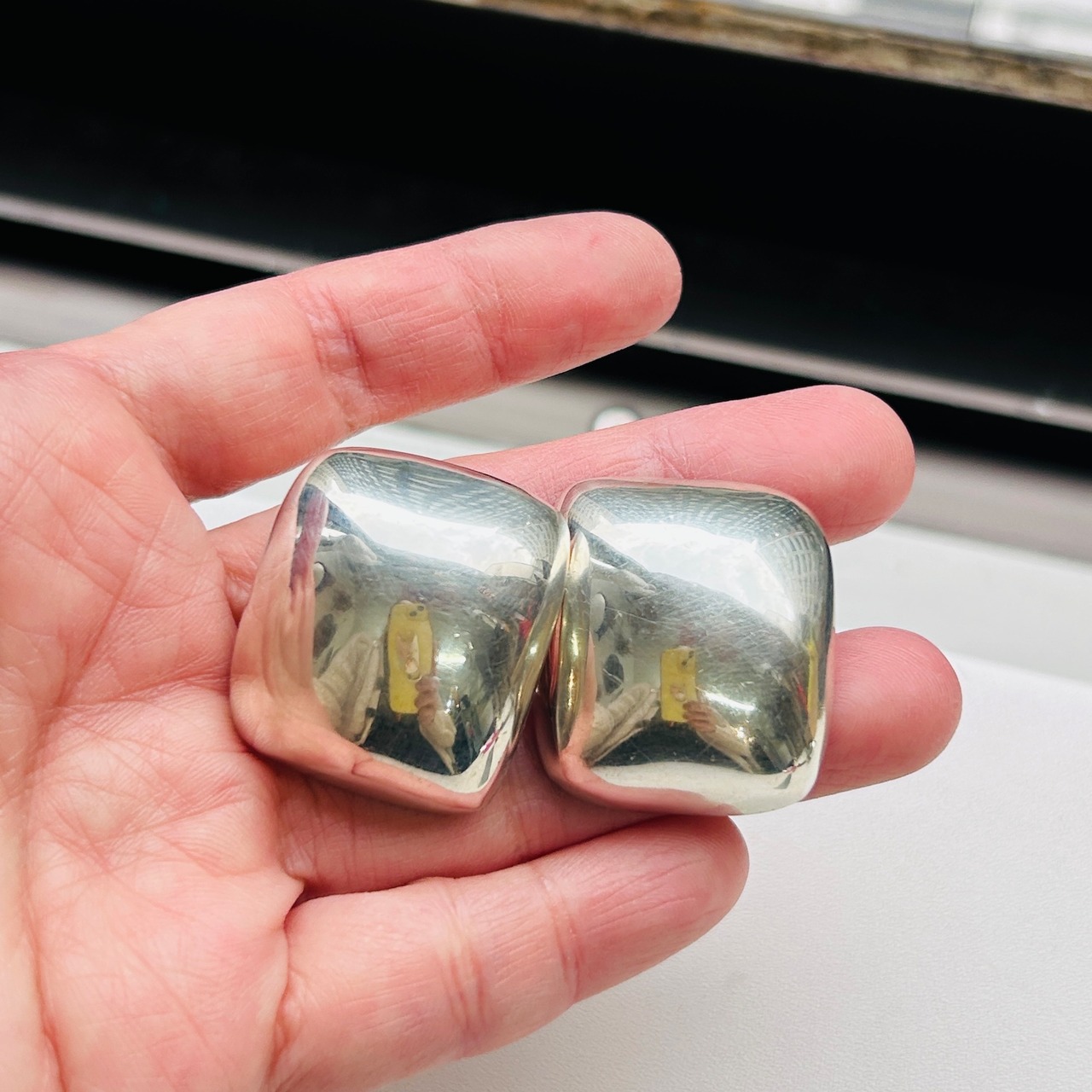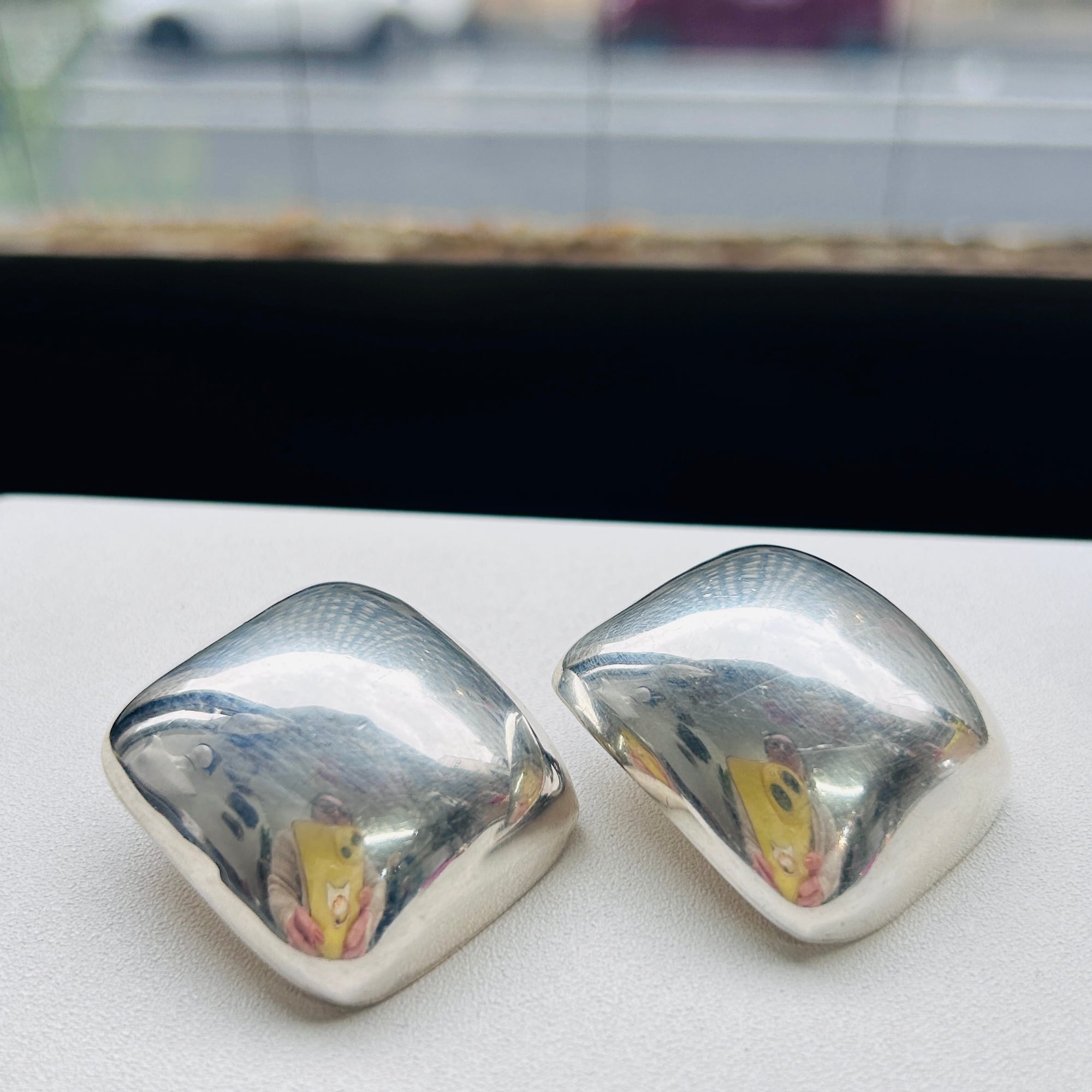 ボリュームあるスクエアイヤリング。インパクトある大きな四角が耳元でキラリと輝いてモードな印象です。中空ですが薄すぎずしっかりした作り。大きなクリップは圧迫感なく安定感ある着け心地です。「MEXICO」「925」刻印。