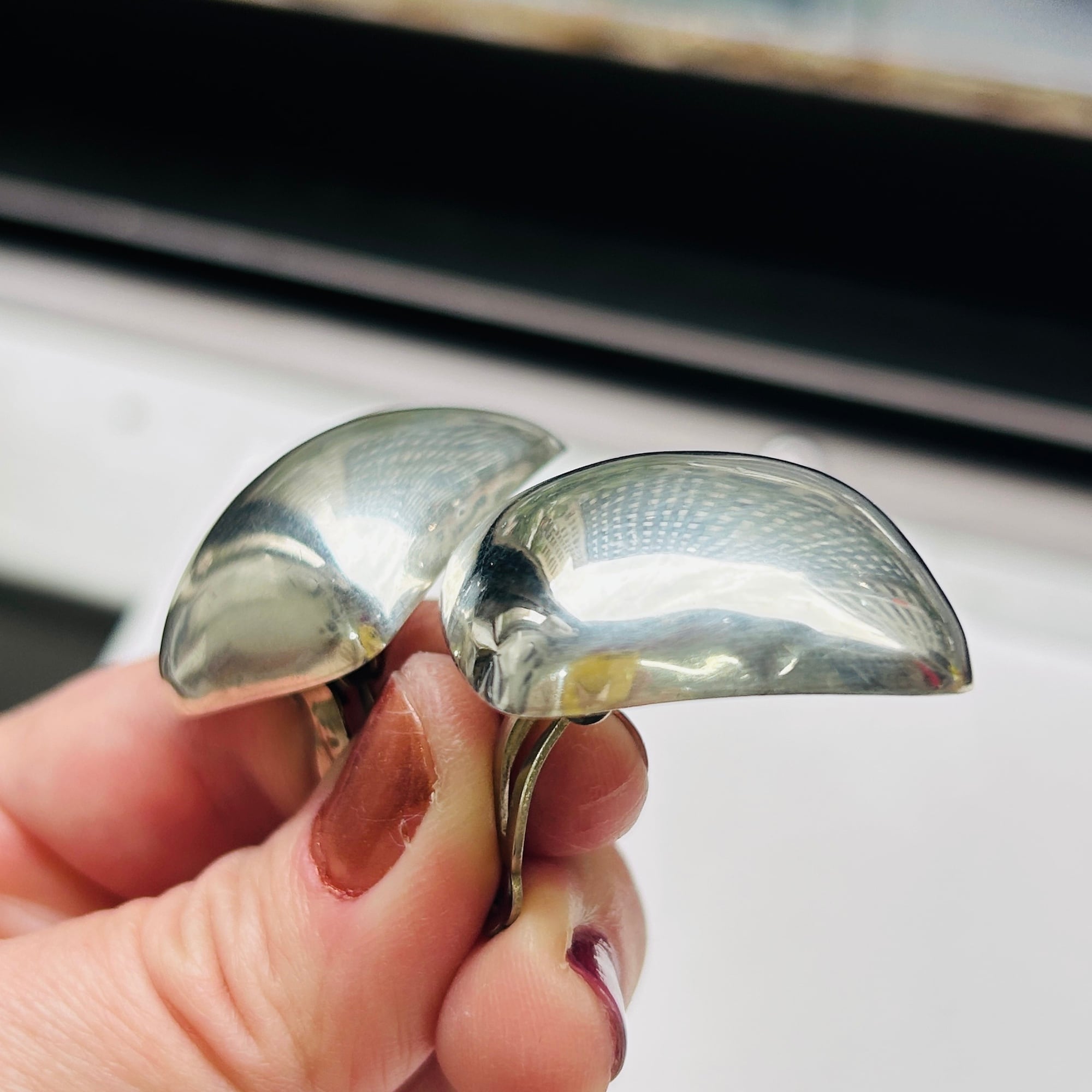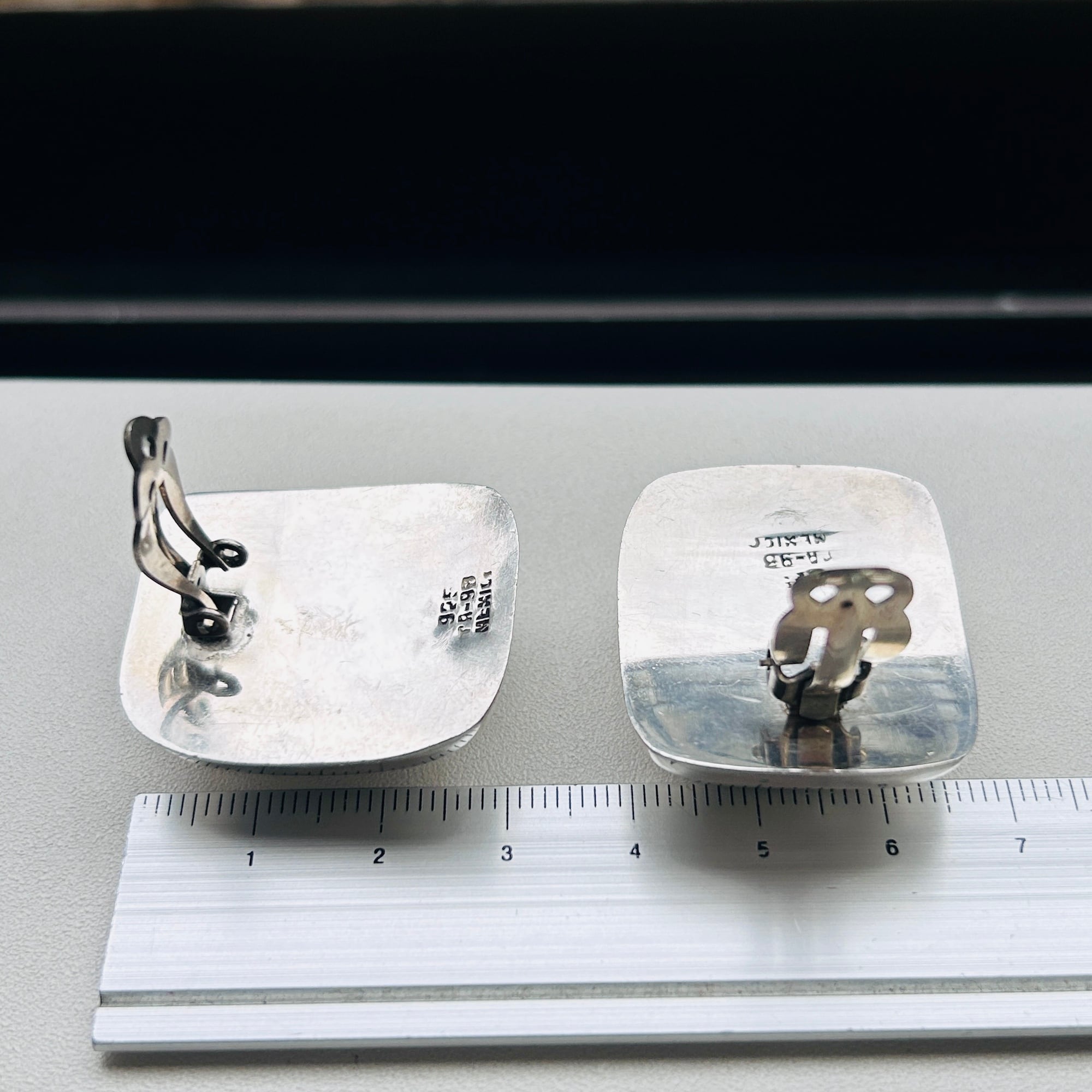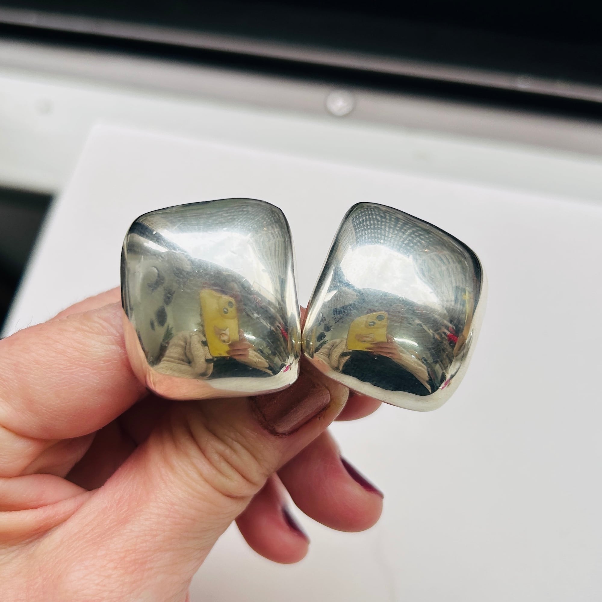 ボリュームあるスクエアイヤリング。インパクトある大きな四角が耳元でキラリと輝いてモードな印象です。中空ですが薄すぎずしっかりした作り。大きなクリップは圧迫感なく安定感ある着け心地です。「MEXICO」「925」刻印。