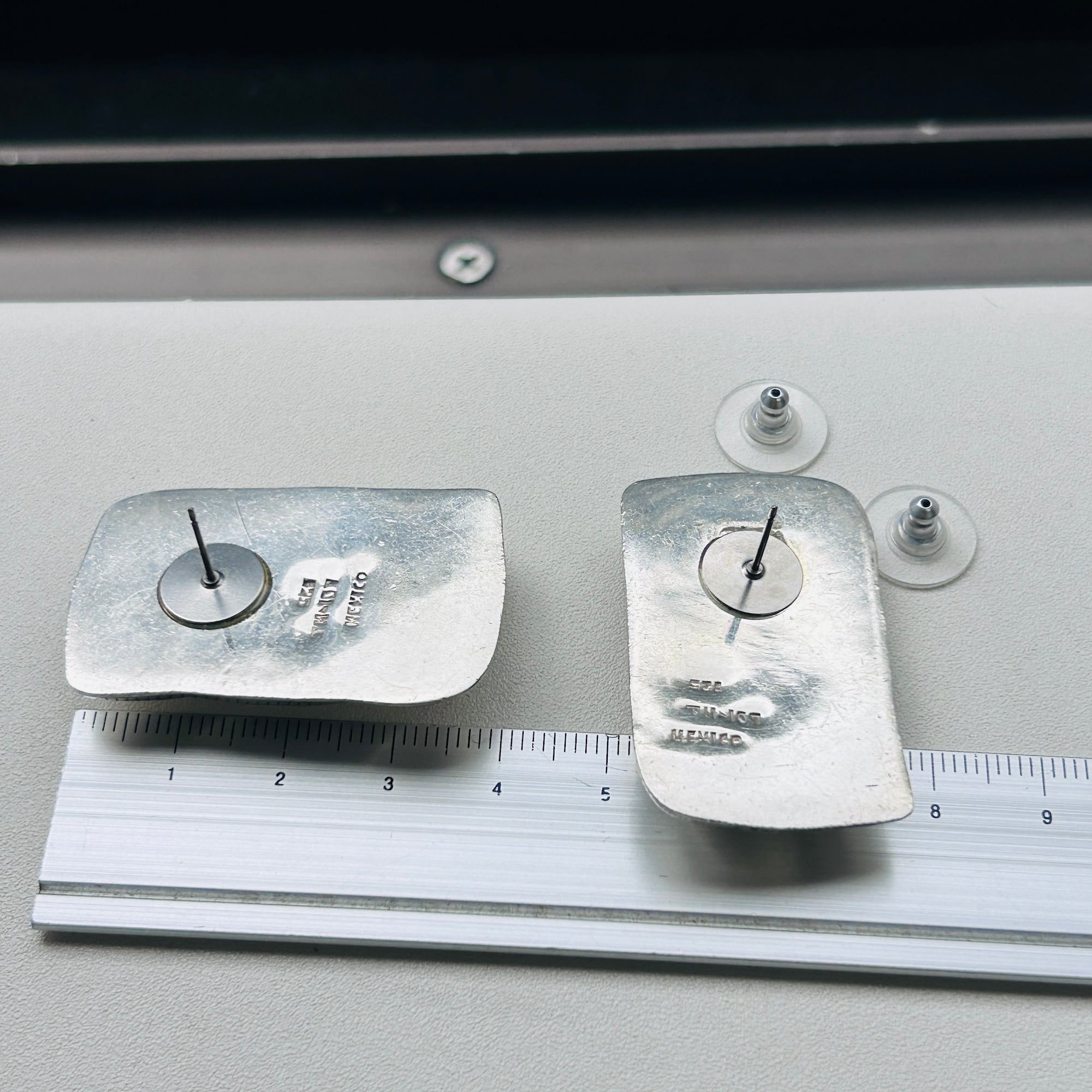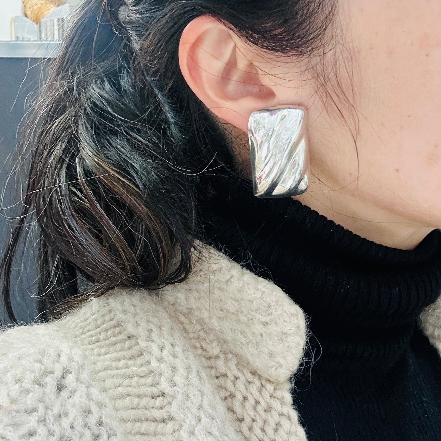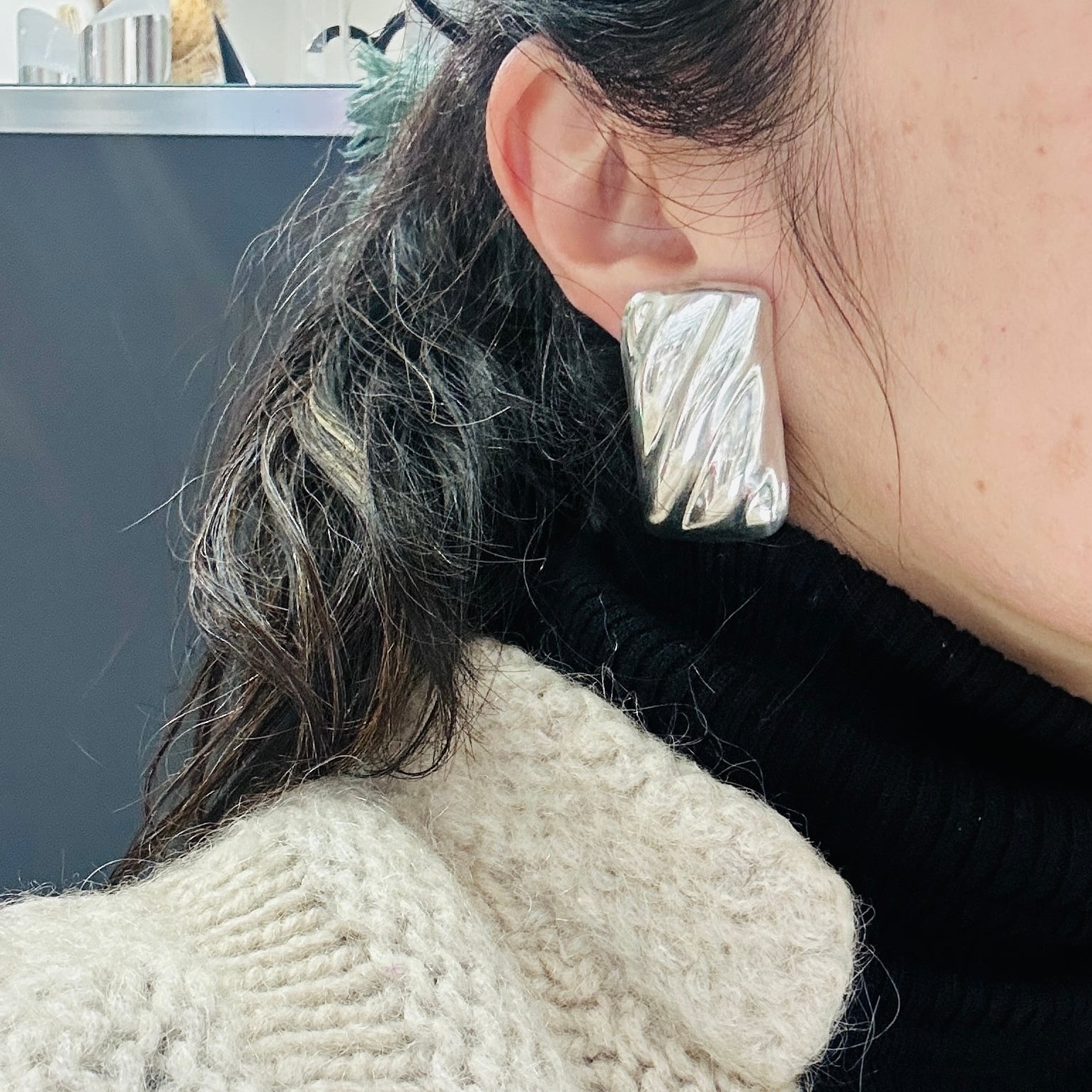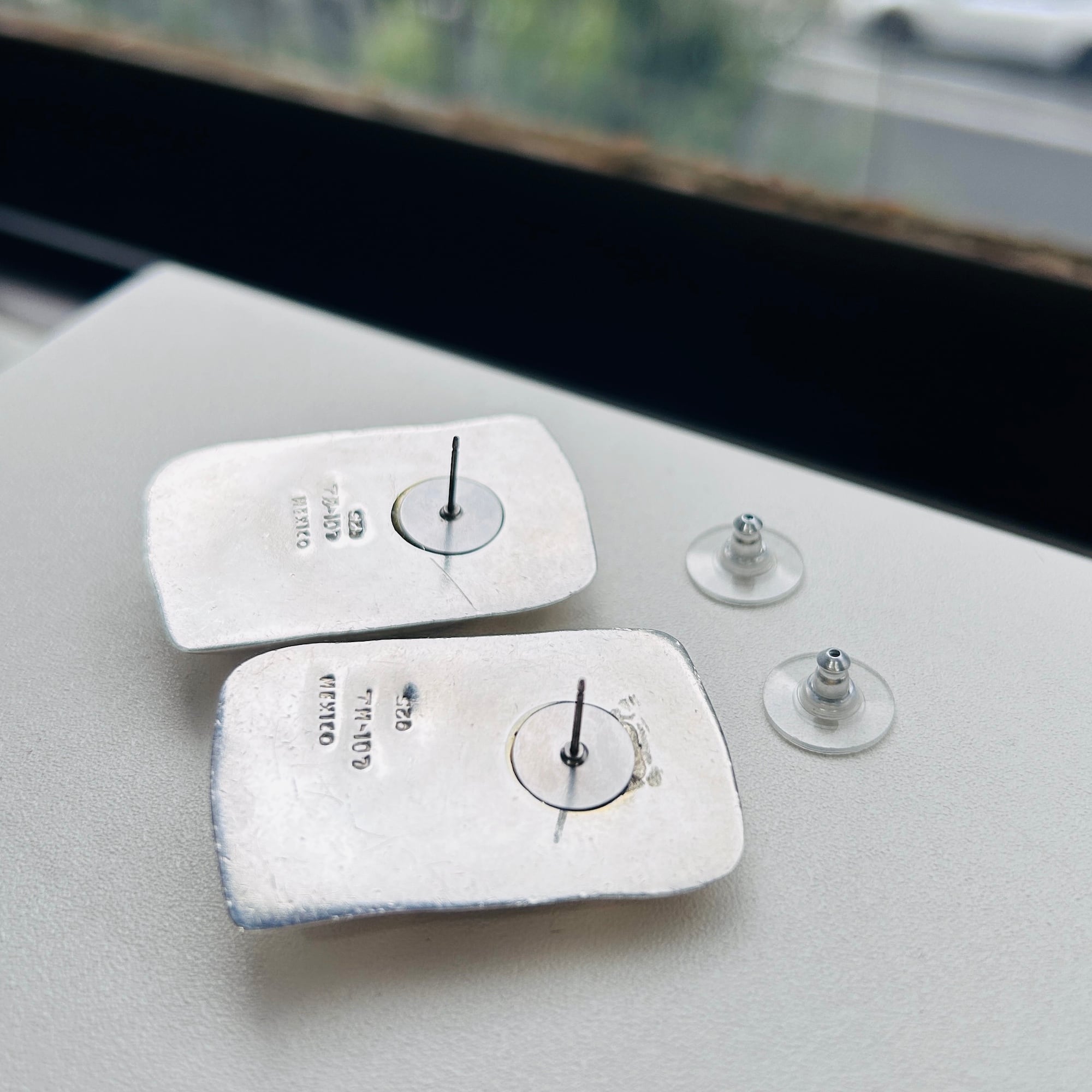 大きな長方形に緩いリブ模様、1口サイズのクッキーみたいな可愛いボリュームピアス。元々はイヤリングでしたが金具修理が必要だったのを機にピアスにしてもらいました。ピアスの材質はサージカルステンレス(針と平皿全て)です。このサイズ感ですと大体イヤリングです。ピアスにしましたが重さや傾きは気になりません。「MEXICO」「925」刻印。