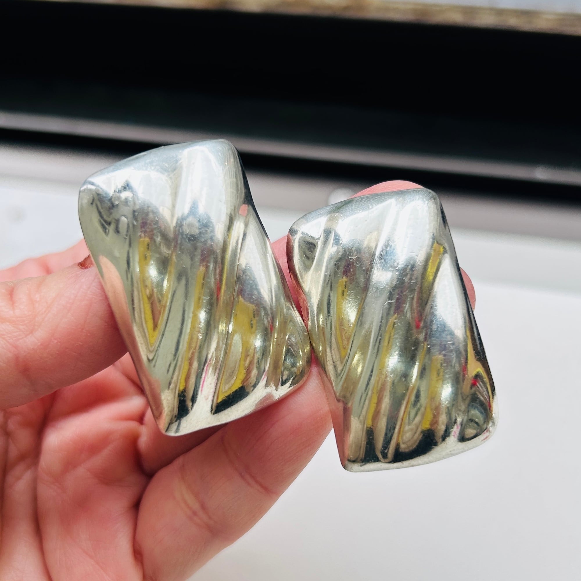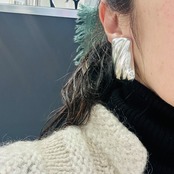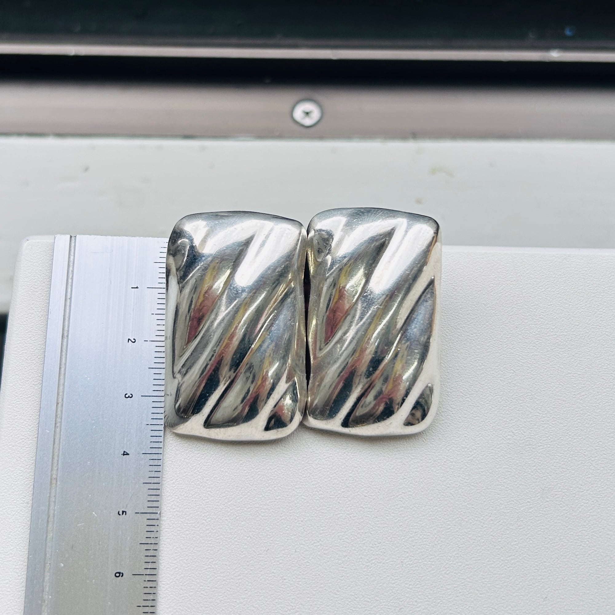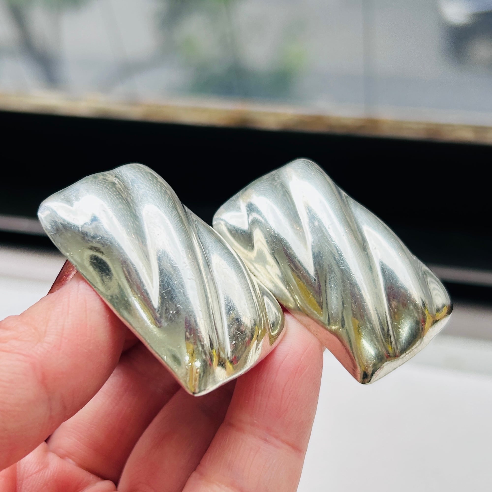 大きな長方形に緩いリブ模様、1口サイズのクッキーみたいな可愛いボリュームピアス。元々はイヤリングでしたが金具修理が必要だったのを機にピアスにしてもらいました。ピアスの材質はサージカルステンレス(針と平皿全て)です。このサイズ感ですと大体イヤリングです。ピアスにしましたが重さや傾きは気になりません。「MEXICO」「925」刻印。