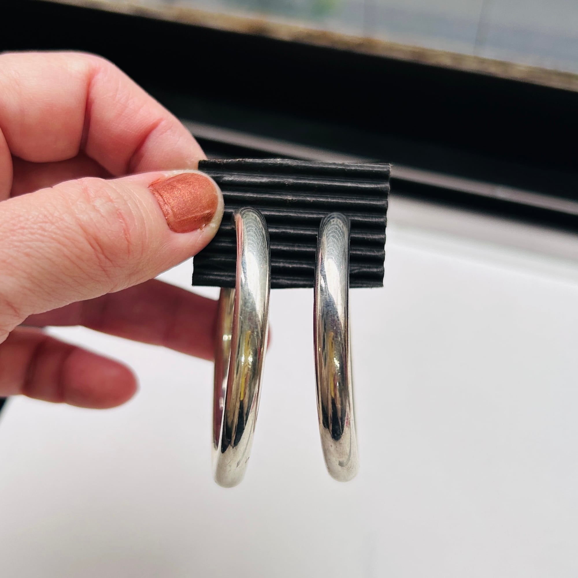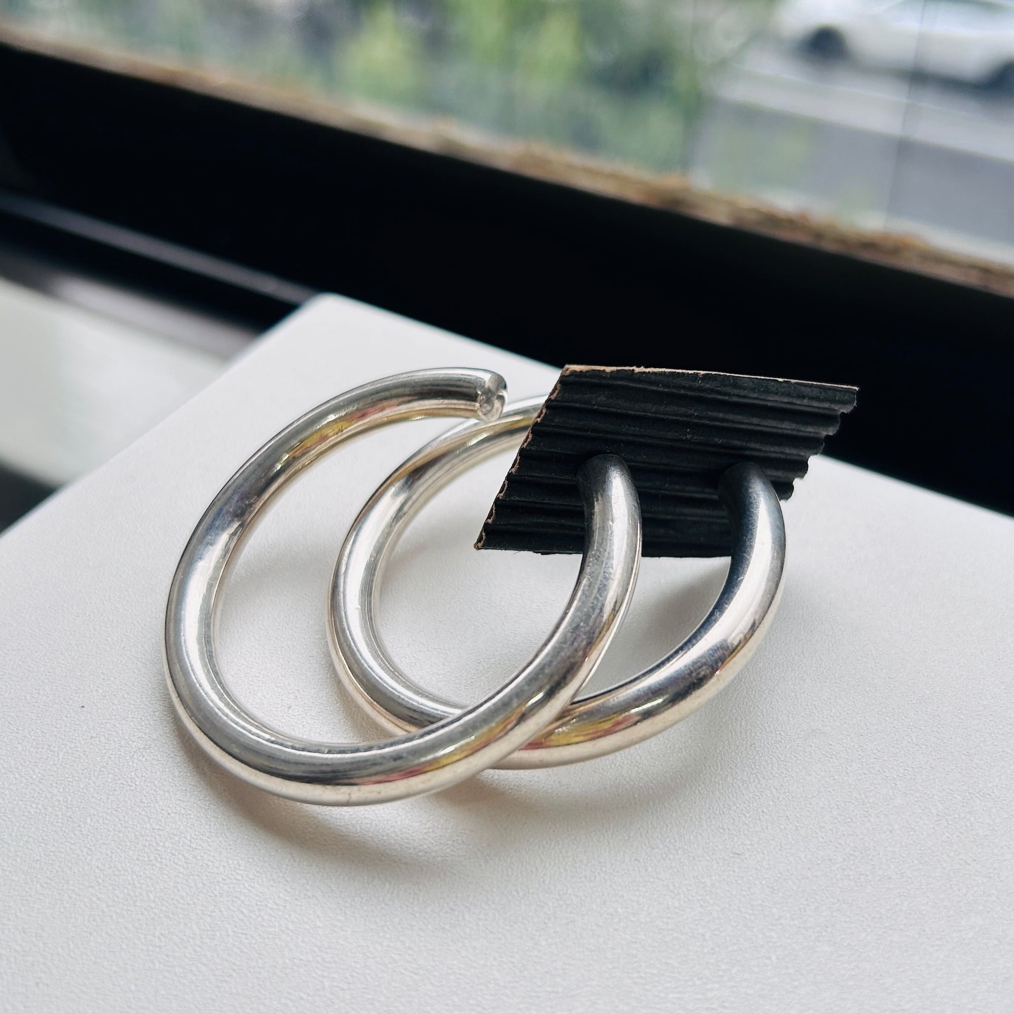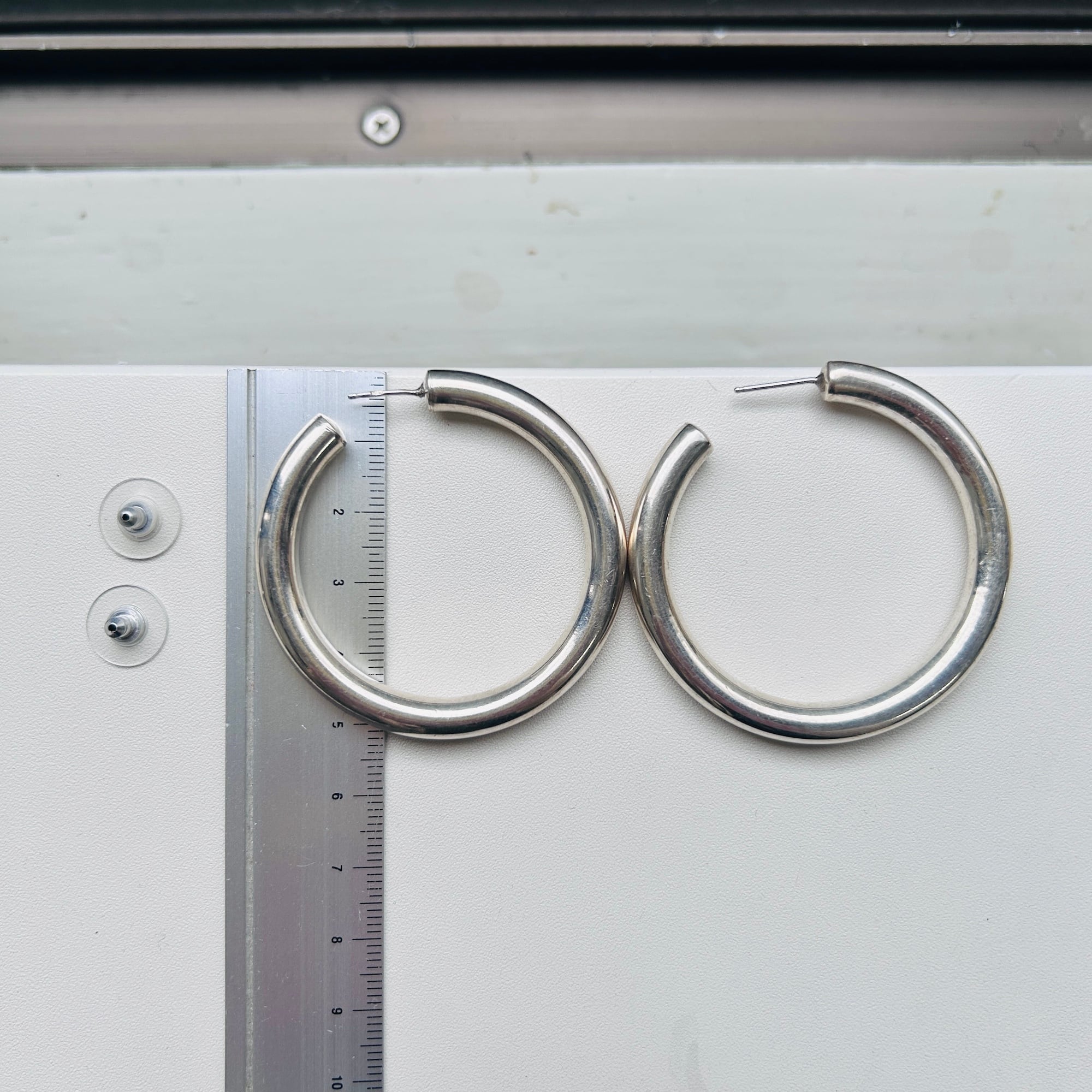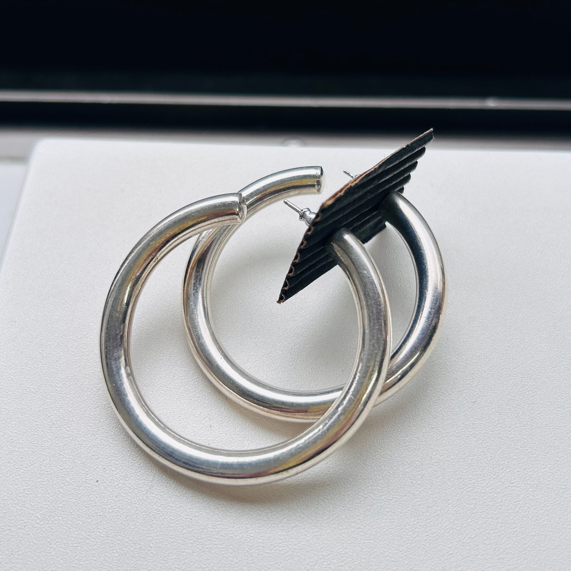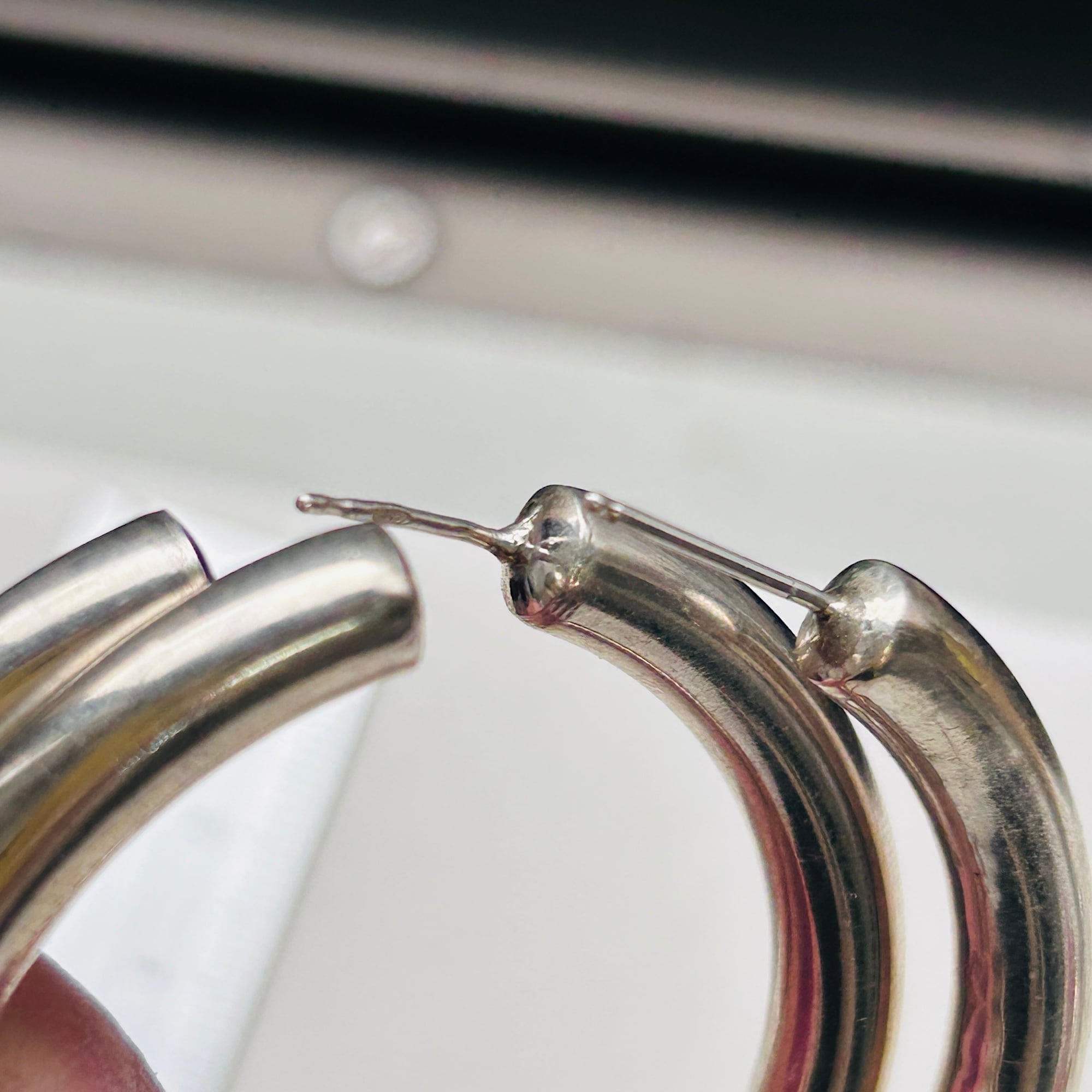径6mmチューブの大きなピアス。中空ですが薄すぎずしっかりした作りです。重ねて見ると左右微妙に大きさが違います。ヴィンテージですのでご了承ください。針とフープの隙間が狭いように感じますが着脱が特別やりにくいと感じることはありません。キャッチは新品既製品をお付けしてます。片方の針に「925」刻印。