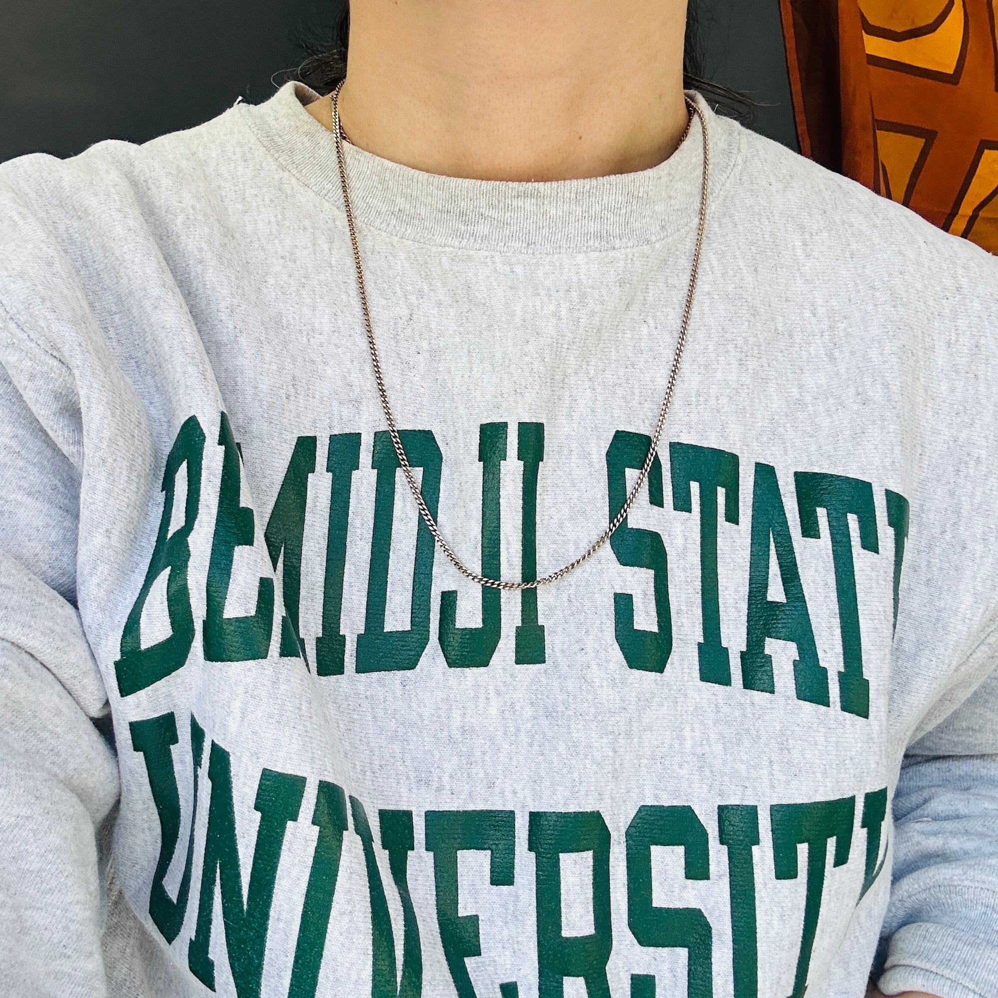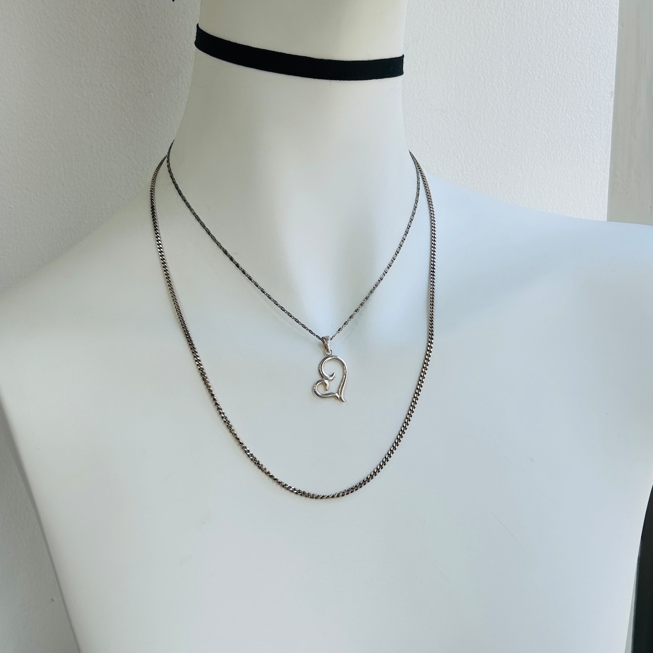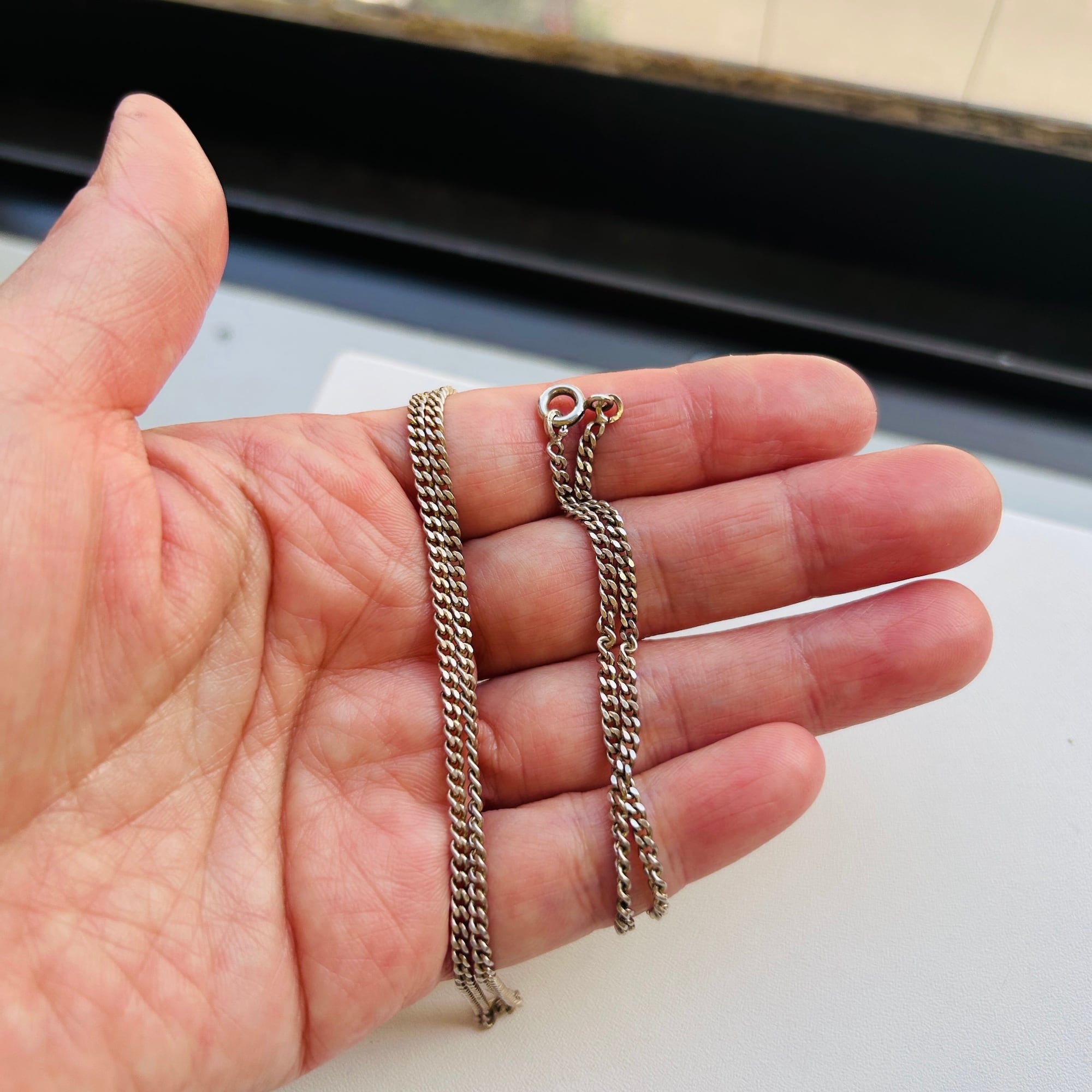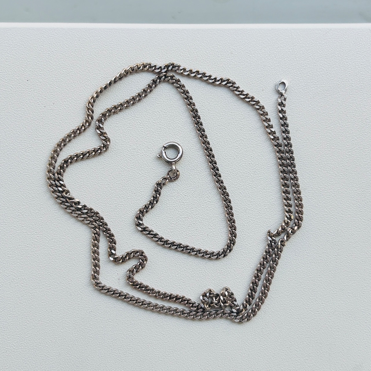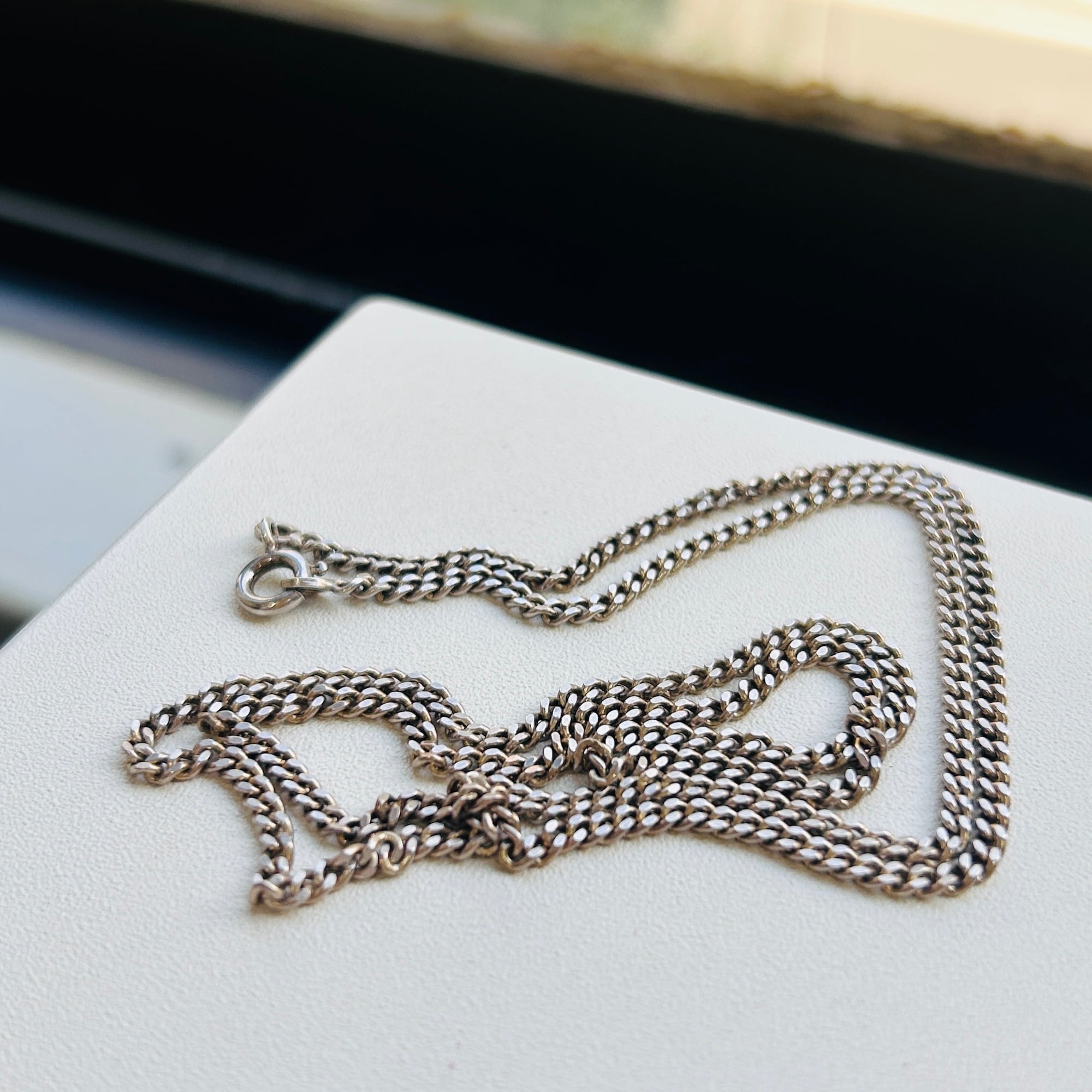 目の詰まったキヘイチェーンネックレス。古い風合いのシンプルでかっこいいチェーンです。単体でシャラっと着けたり、トップと合わせたり、男女問わず使っていただけるチェーンです。すごく小さな事ですがフランスチェーンはエンドの丸カンとチェーンが接合・一体化しているのが多いです。ドーナツみたいなフチの太い丸です。フチが太い分、引っ掛けにくさは少々ありますが、一般的に流通しているチェーンと違う作りで気に入っています。丸カンに「925」とフランスメーカーマークと読み取れない刻印。*チェーンのみの販売です。チャームは付属しません。