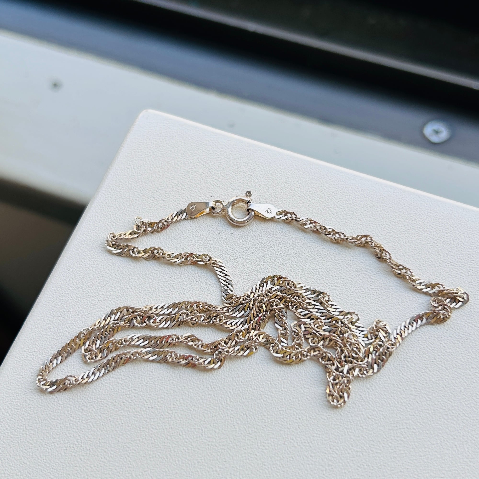 キラキラ輝くツイストネックレス。細かいキヘイチェーンがツイストしています。品があり華やかな印象のチェーンです。軽めのチャームでしたら合わせやすいです。「ITALY」「925」刻印。変色しましたら液体クリーナーの使用をオススメします。