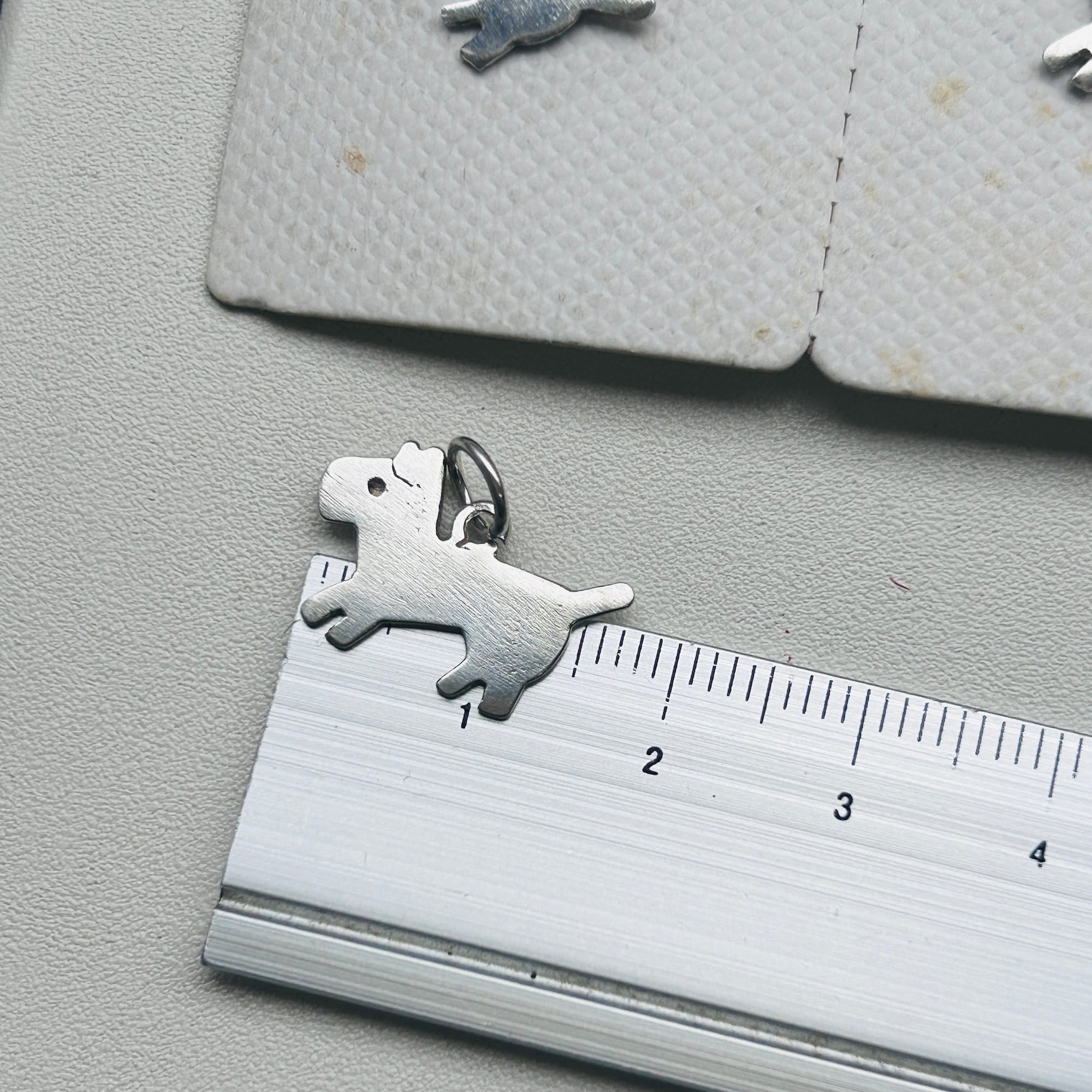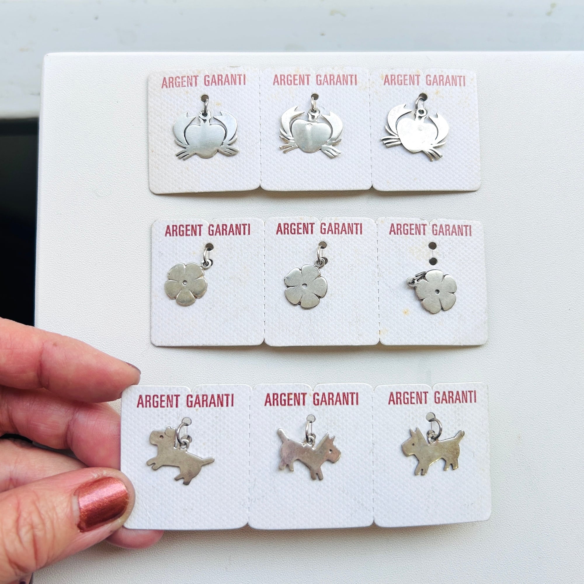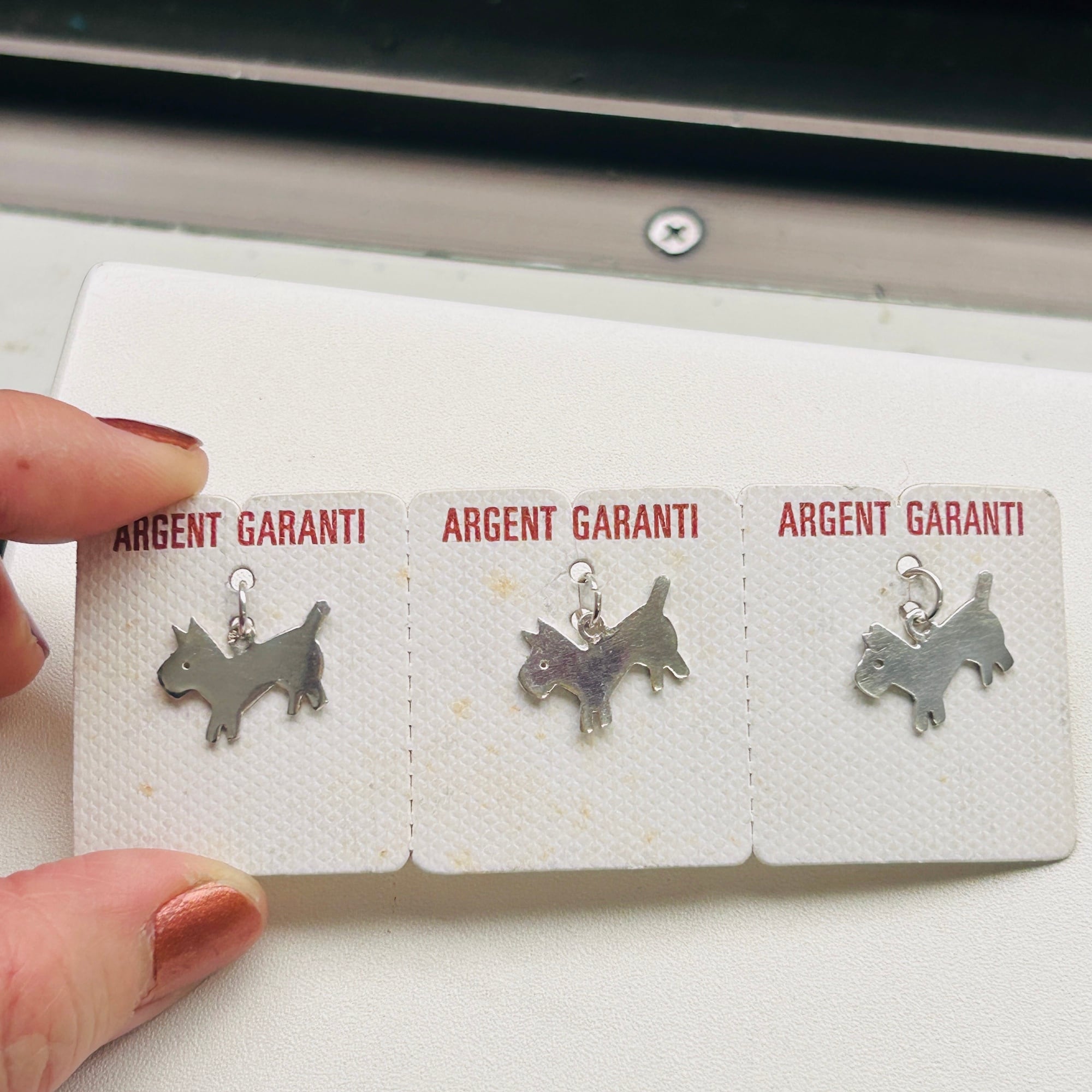 台紙についたままのテリアDOGチャーム。薄くて小さな可愛いチャームです。3つともフランスメーカー刻印が入っています。丸カン内径4mm。台紙に「ARGENT GARANTI」(シルバー保証)。一度こちらで重曹+アルミホイル・熱湯クリーニングしました。もう少し磨いてからお届け致します。