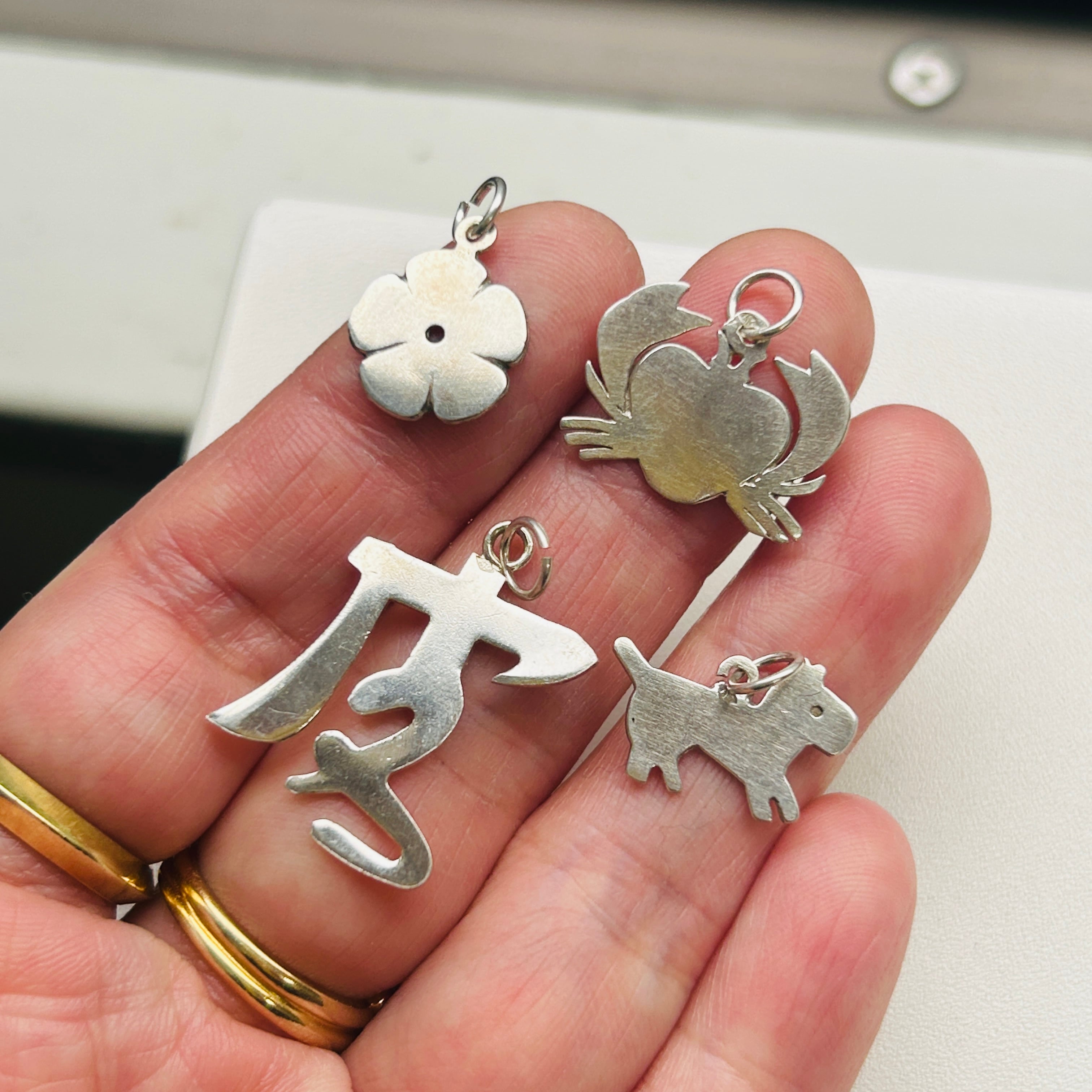台紙についたままのカニ+ハートチャーム。ユニークなモチーフで可愛いです。6つともフランスメーカー刻印が入っています。丸カン内径4mm。台紙に「ARGENT GARANTI」(シルバー保証)。一度こちらで重曹+アルミホイル・熱湯クリーニングしました。もう少し磨いてからお届け致します。