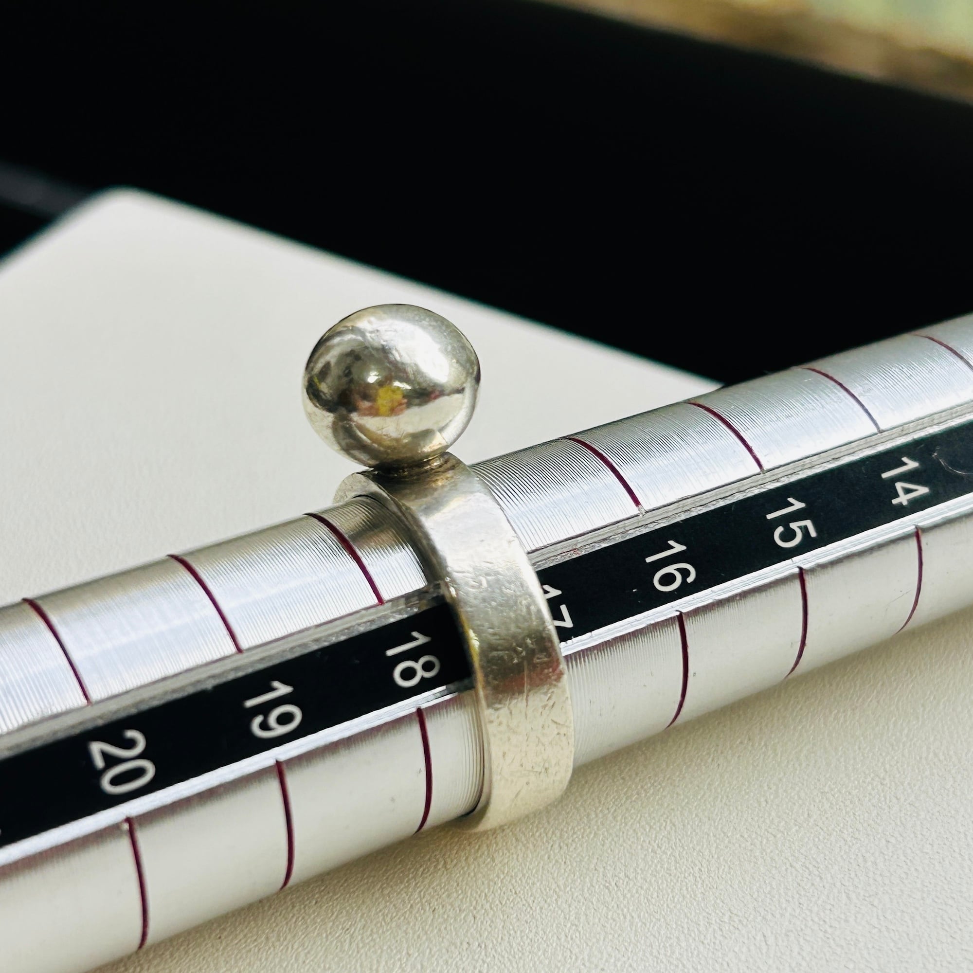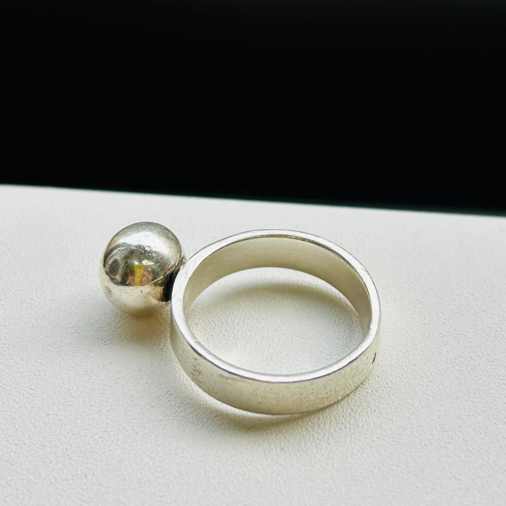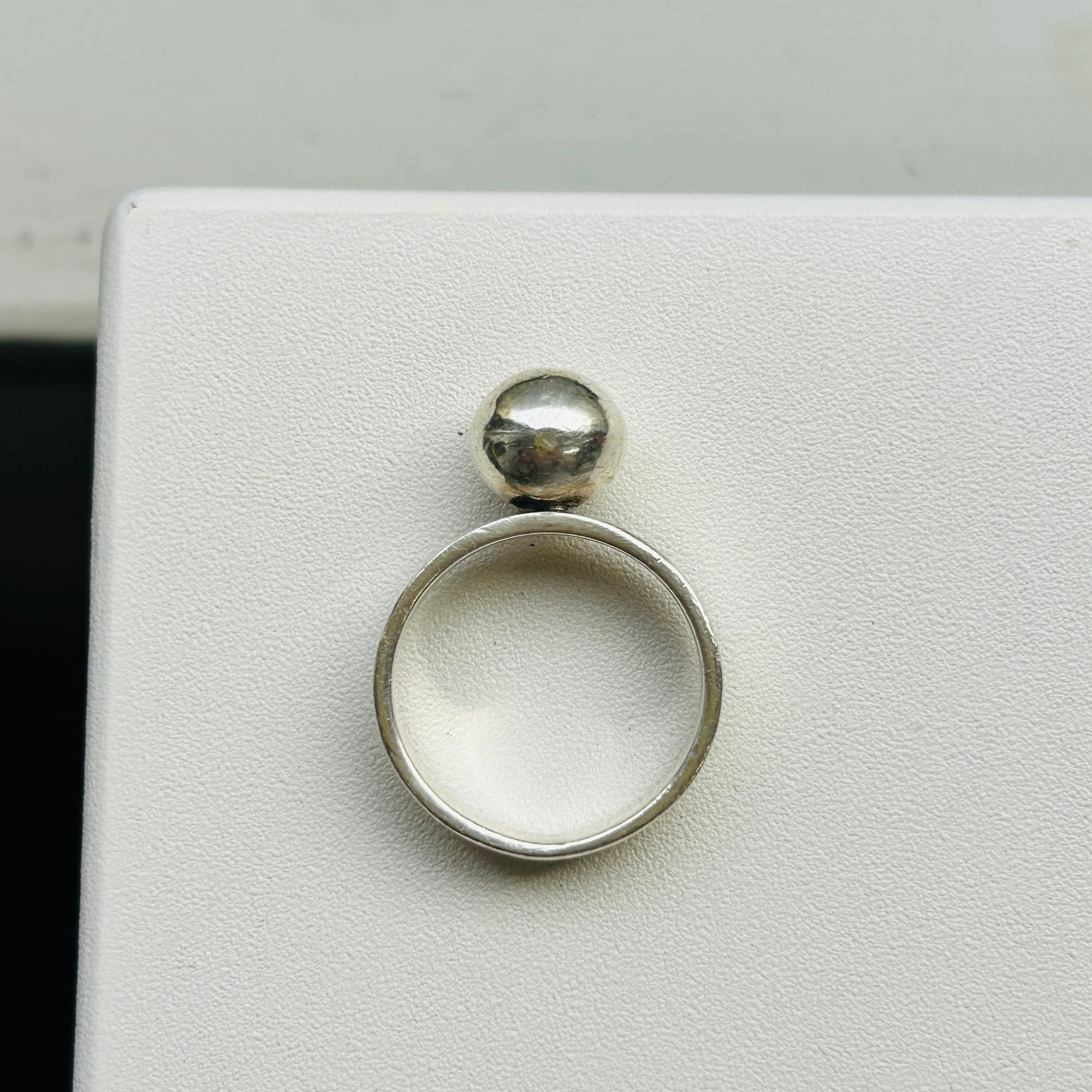 10mmボールリング。全体的に中厚な作りでポテっとしたフランスシルバーです。シルバー表面にスレ・擦り傷ありますが普通のvintaege conditionです。私の人差し指(14-15号)には少し緩いので抑えリングが必要です。内側に「925」、外側にフランスメーカーマーク。
