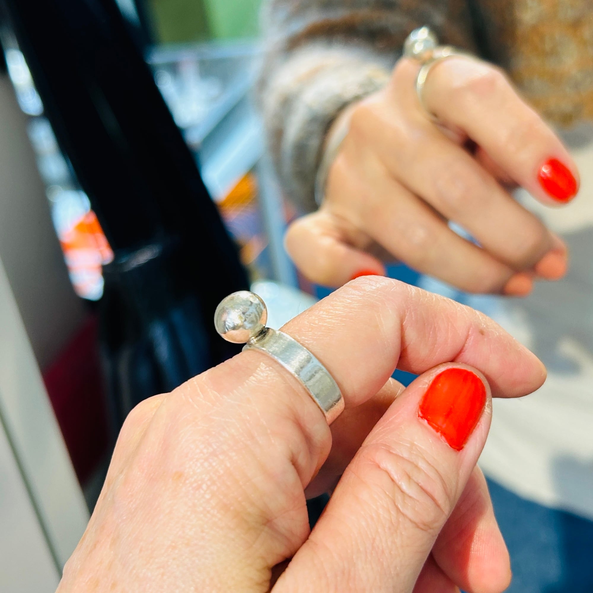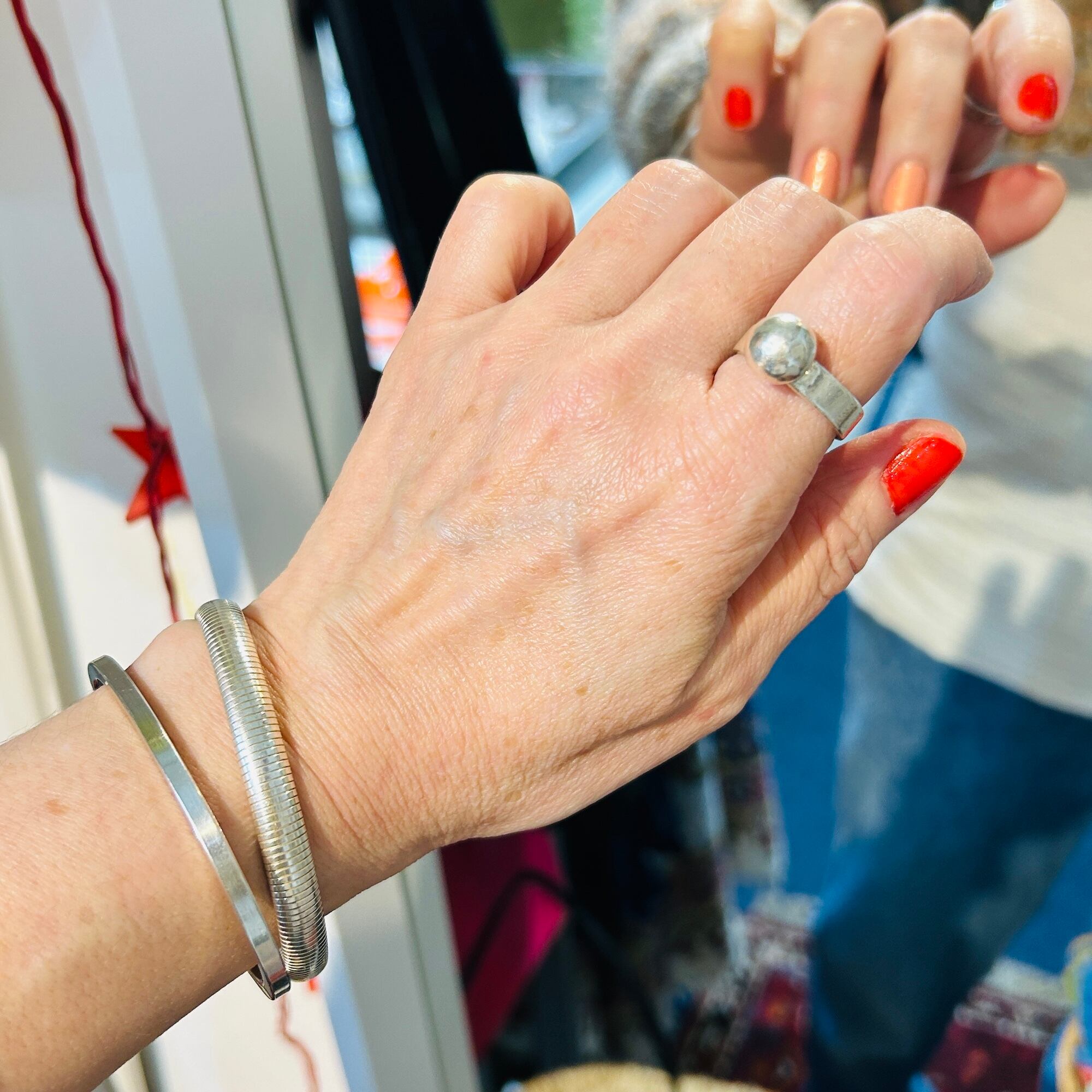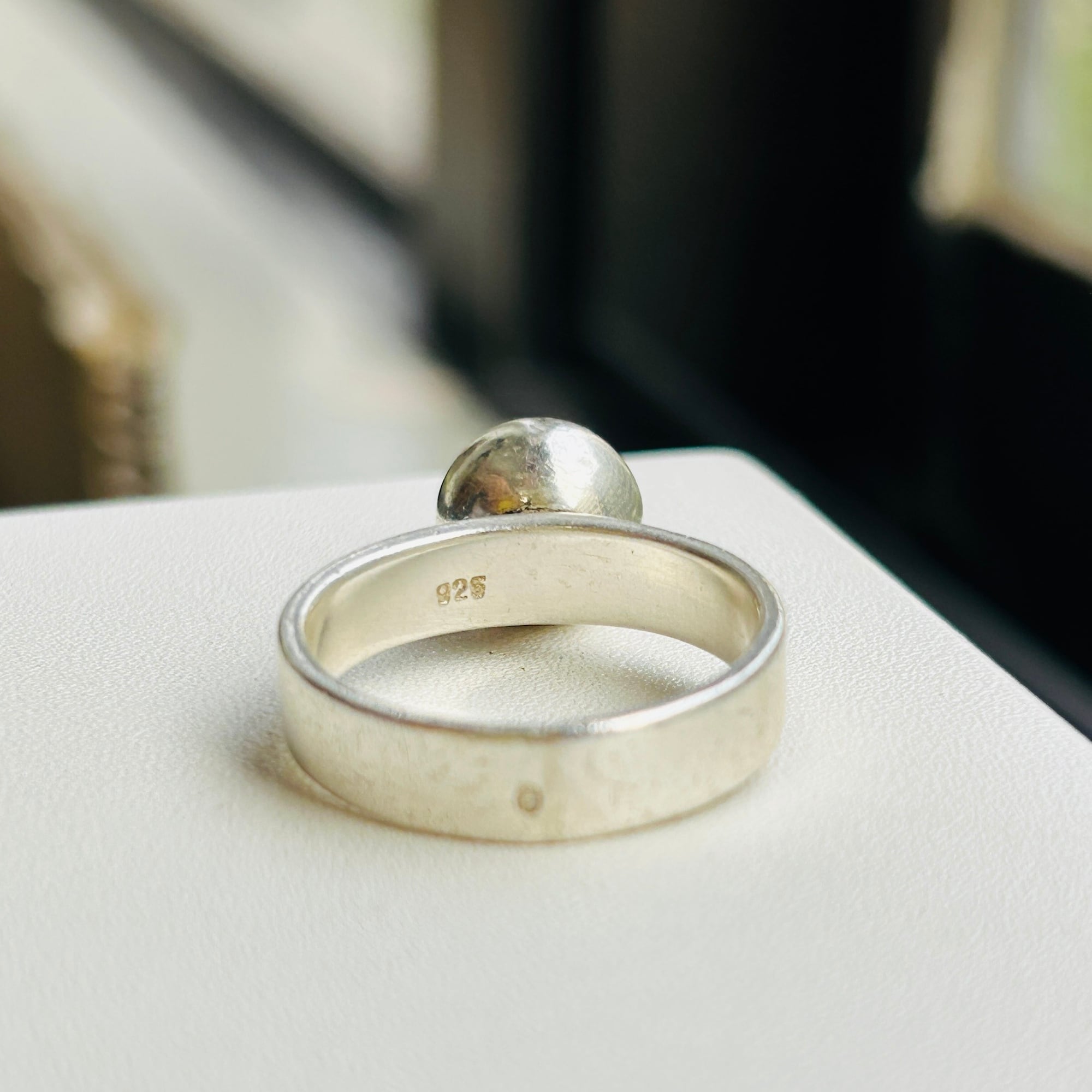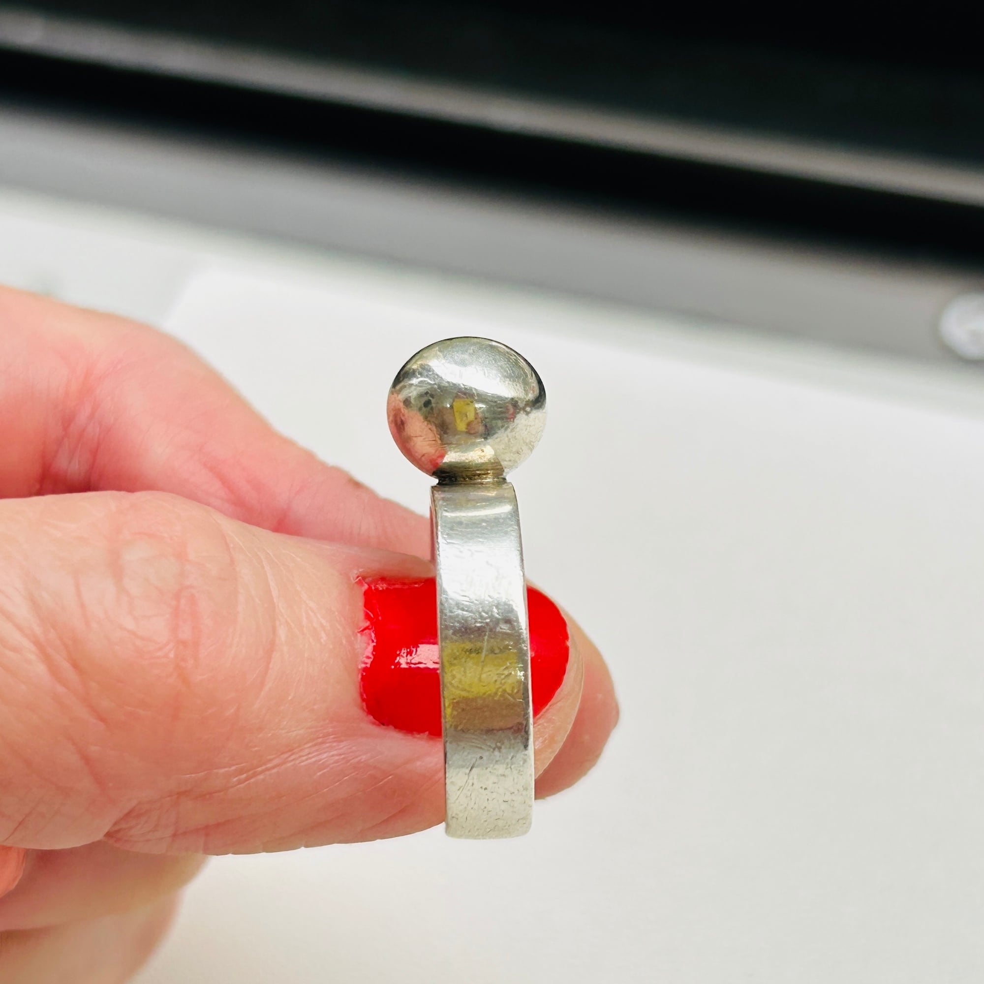 10mmボールリング。全体的に中厚な作りでポテっとしたフランスシルバーです。シルバー表面にスレ・擦り傷ありますが普通のvintaege conditionです。私の人差し指(14-15号)には少し緩いので抑えリングが必要です。内側に「925」、外側にフランスメーカーマーク。