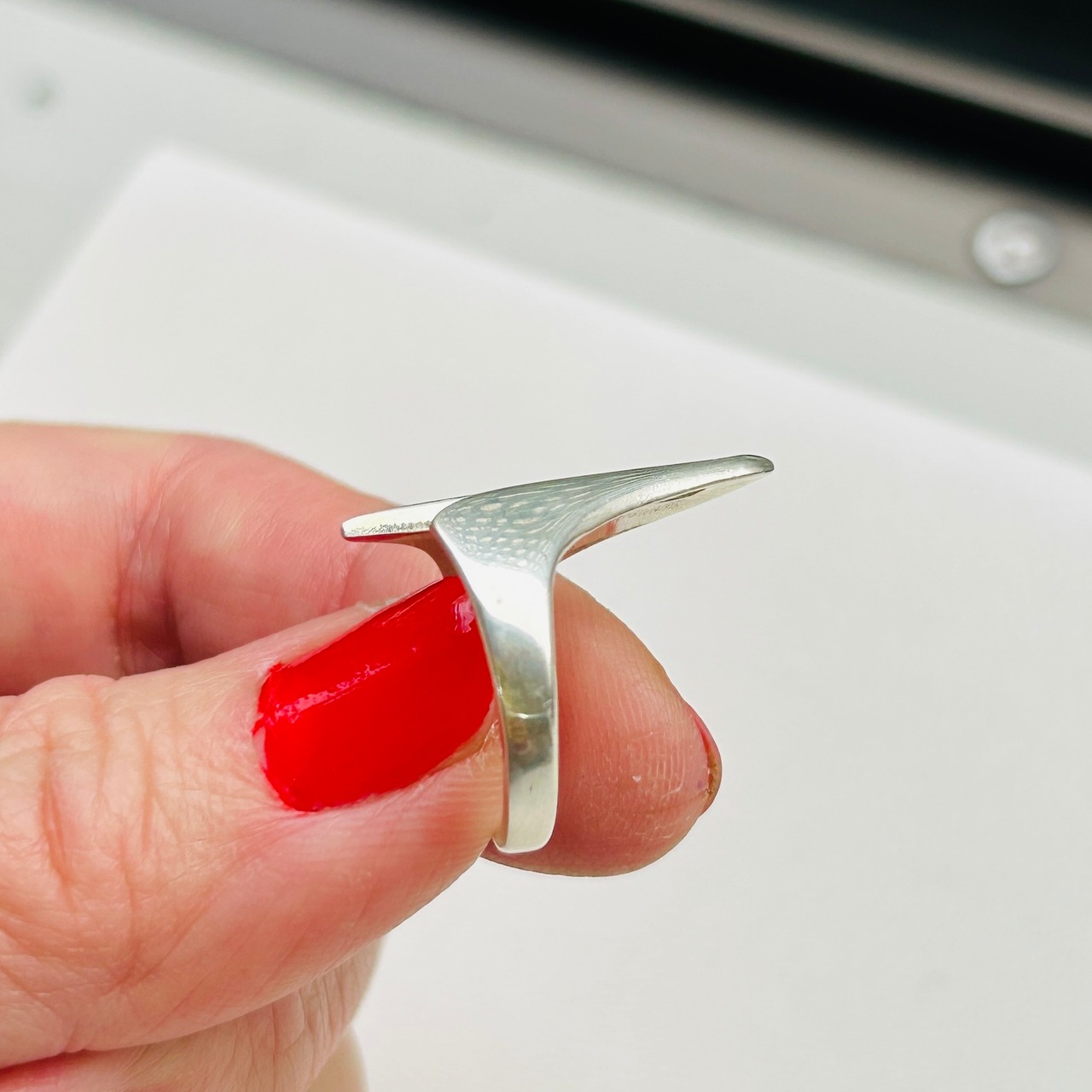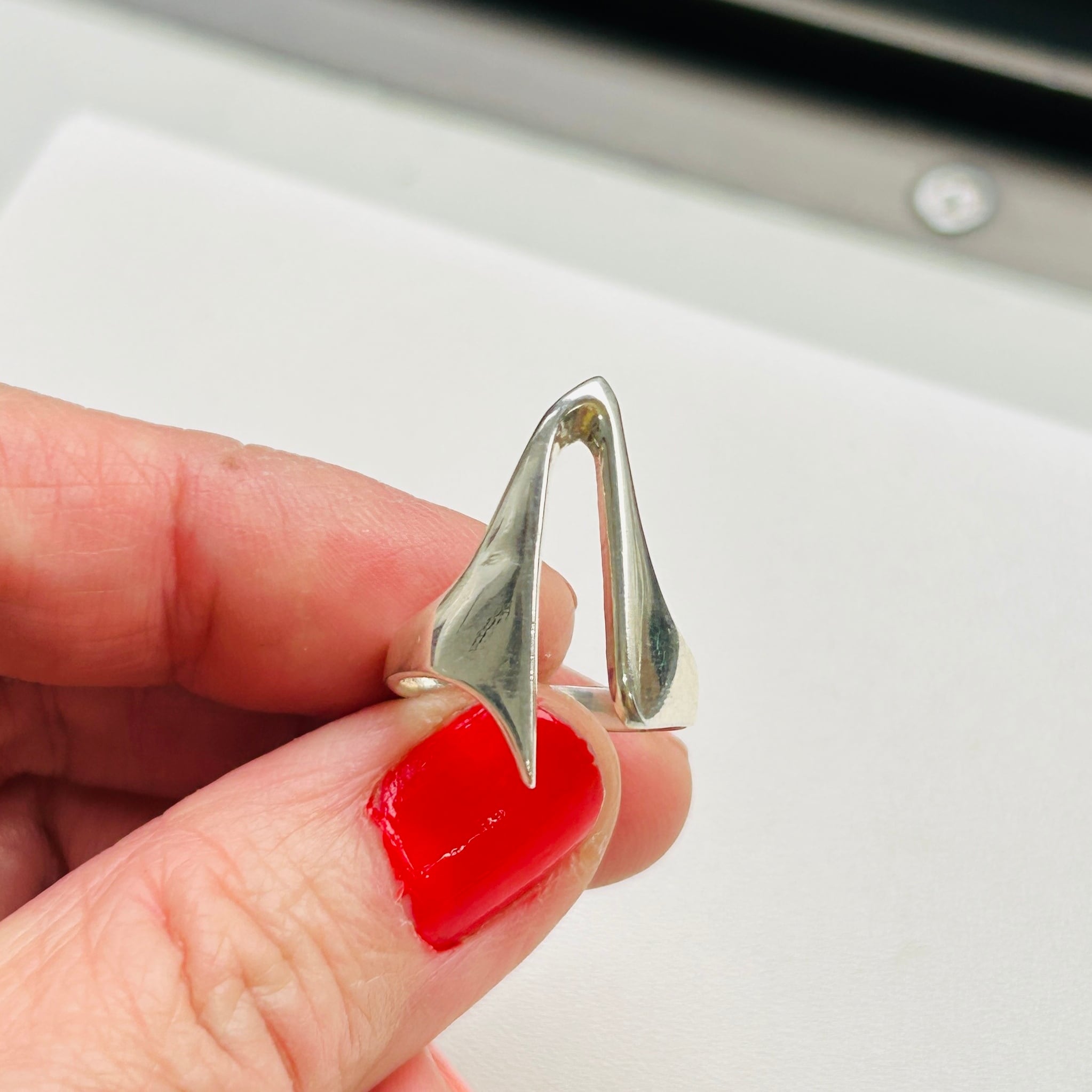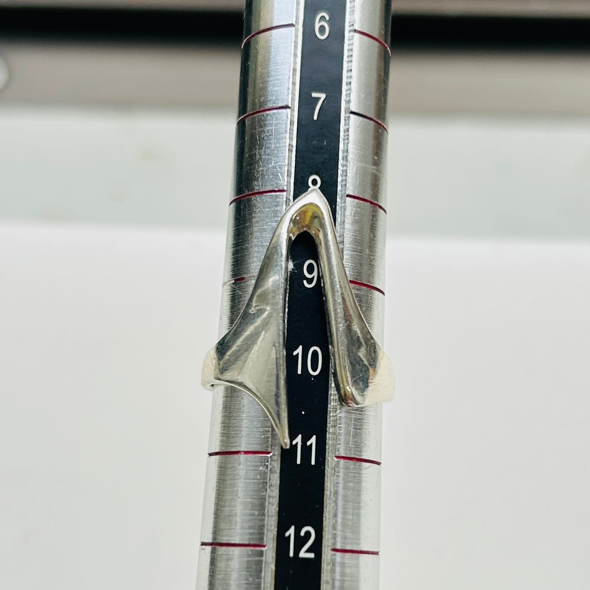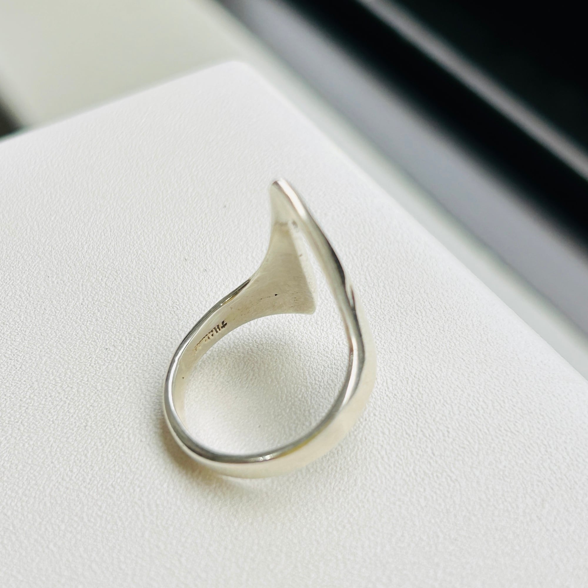 アブストラクトデザインリング。手元コーディネートに個性を出してくれそうなデザインです。どちらの向きに着けてもOKです。ツルっとしていて着脱しやすいリング。デザイン部分は指にキレイにフィットします。私の薬指にジャストフィット。12号中指には入りません。「925」刻印。Good Price!