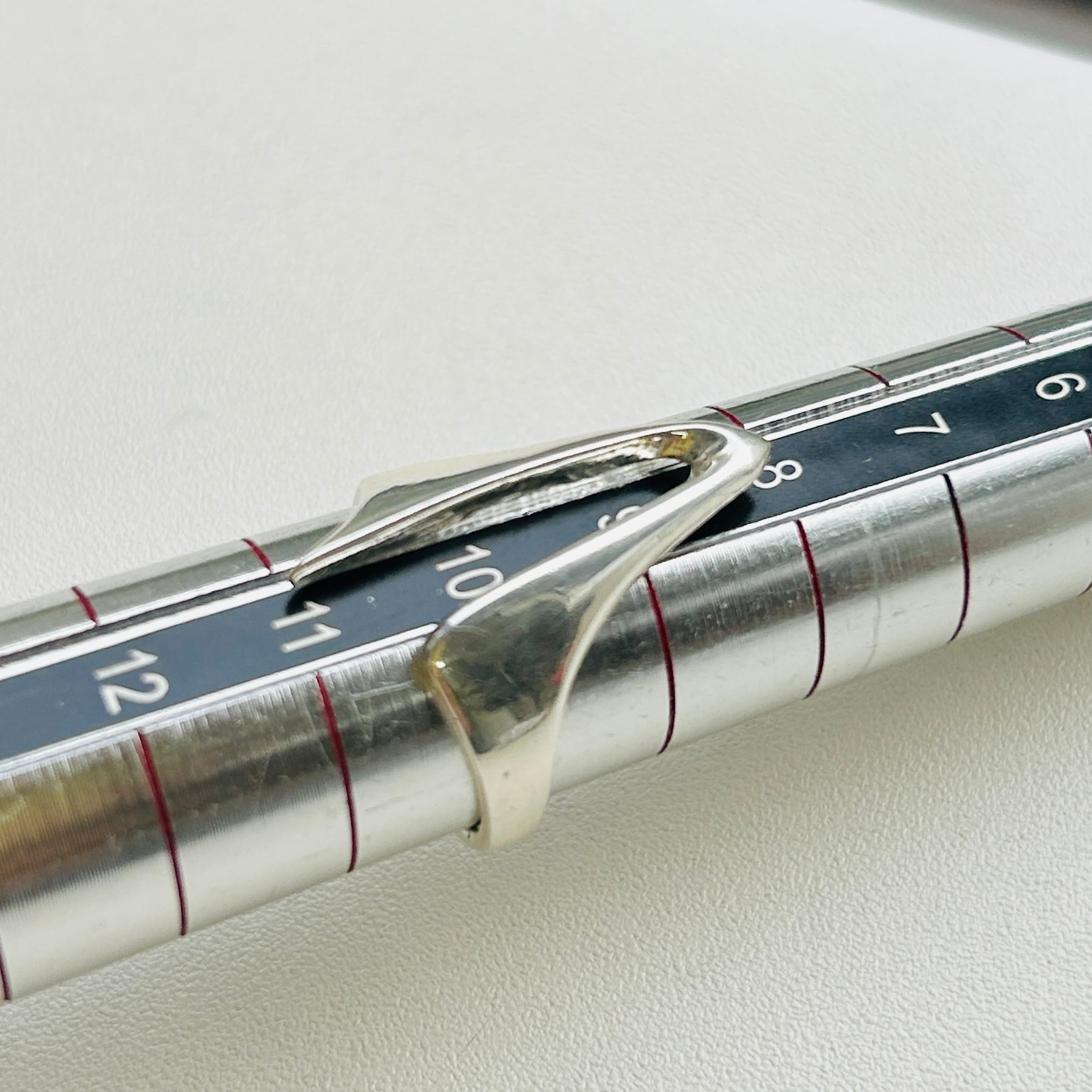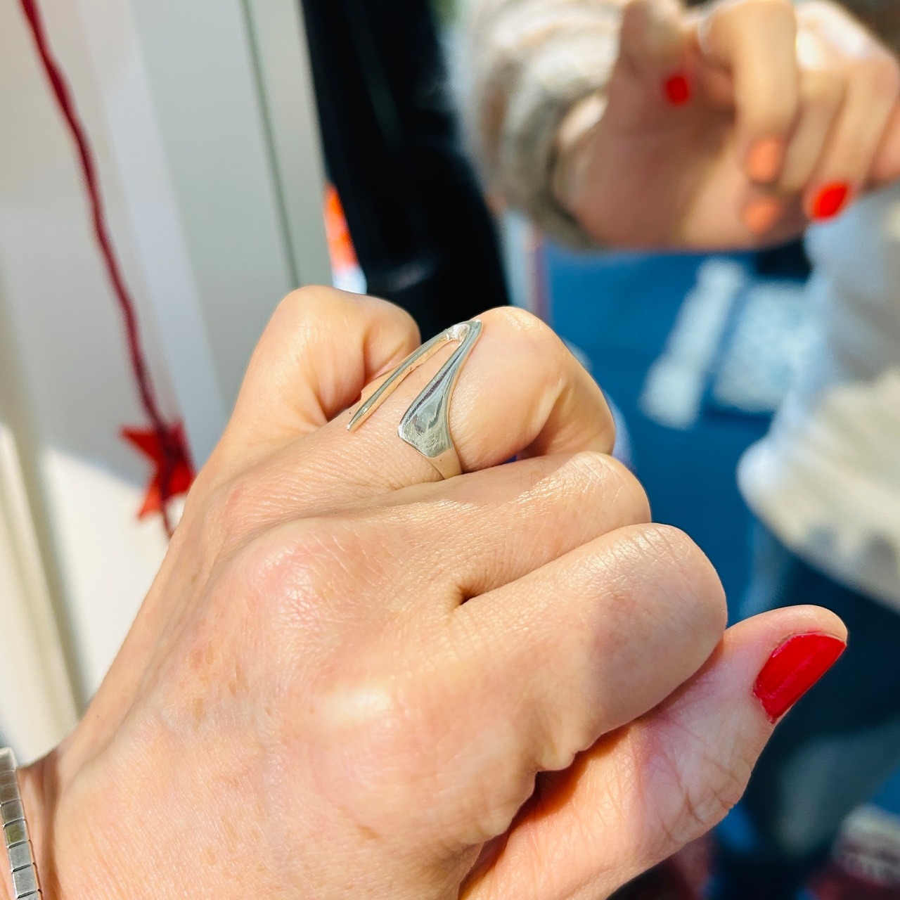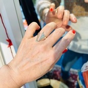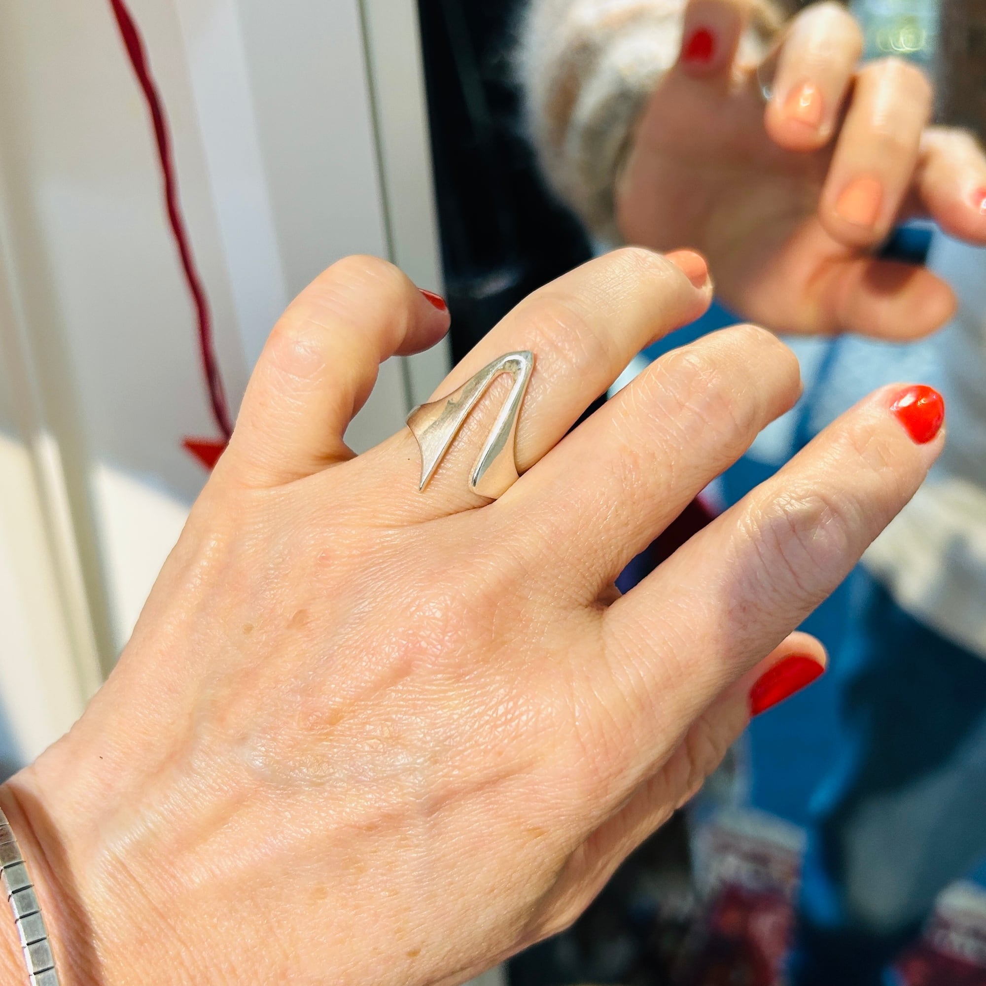 アブストラクトデザインリング。手元コーディネートに個性を出してくれそうなデザインです。どちらの向きに着けてもOKです。ツルっとしていて着脱しやすいリング。デザイン部分は指にキレイにフィットします。私の薬指にジャストフィット。12号中指には入りません。「925」刻印。Good Price!