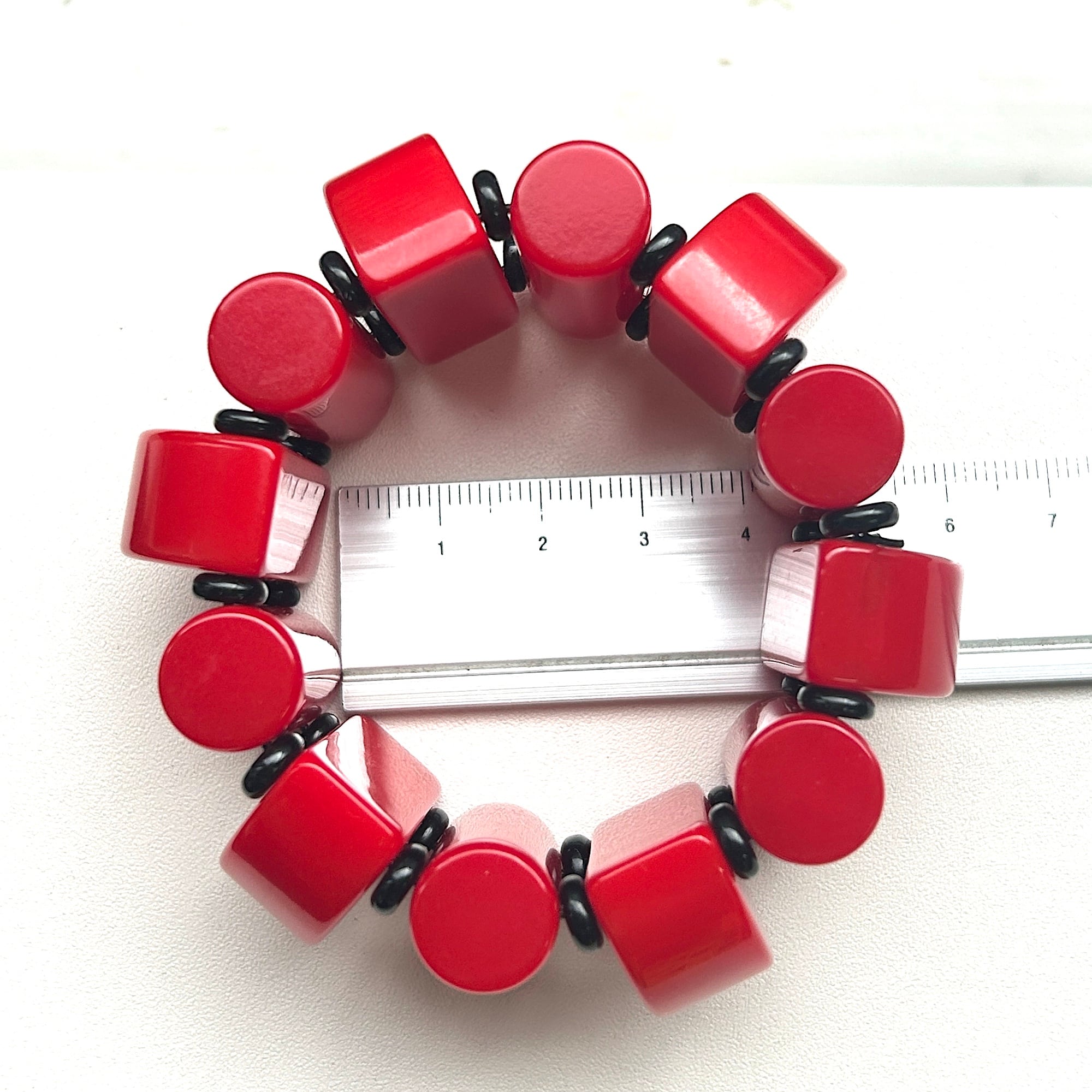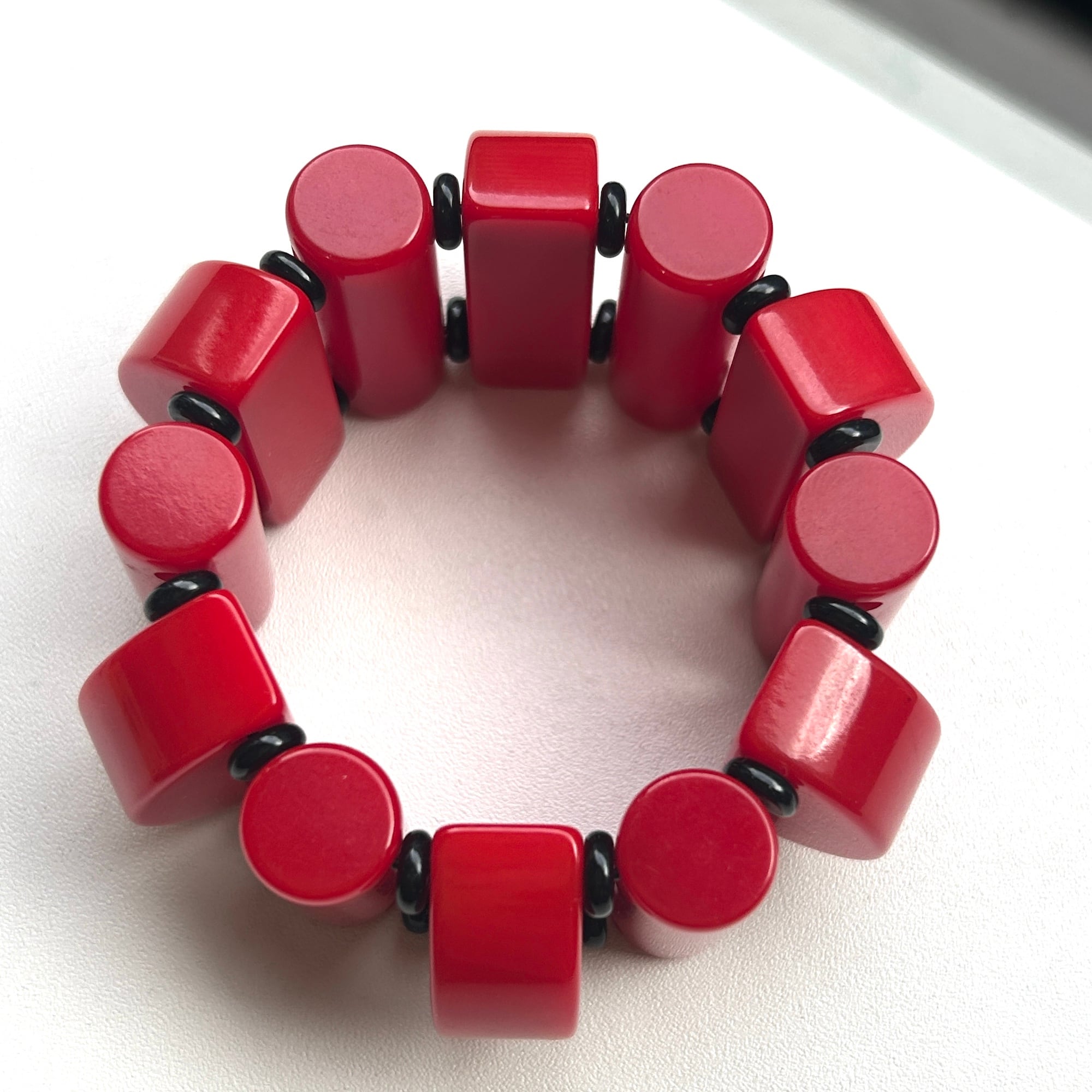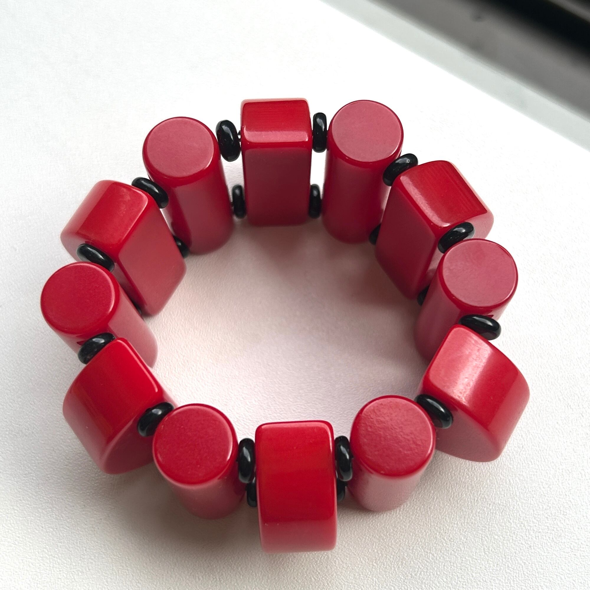 ビビッドなカラーとキュートなデザインが魅力のベークライトブレスレット。1940年頃のビーズで、チェリーレッドカラーも、このようなカタチのビーズも、どちらも大変希少です。黒いスペーサービーズはベークライトではありません。中のシリコンゴムは新調されたばかり。タイトでしっかりした作りです。アメリカンヴィンテージならではの大胆デザイン。手元に視線を集めるブレスレットです。ゴムの結び目はビーズ内に納めましたがまた出てくるかもしれません。私の手首は約14.5cm。ジャストフィットです。