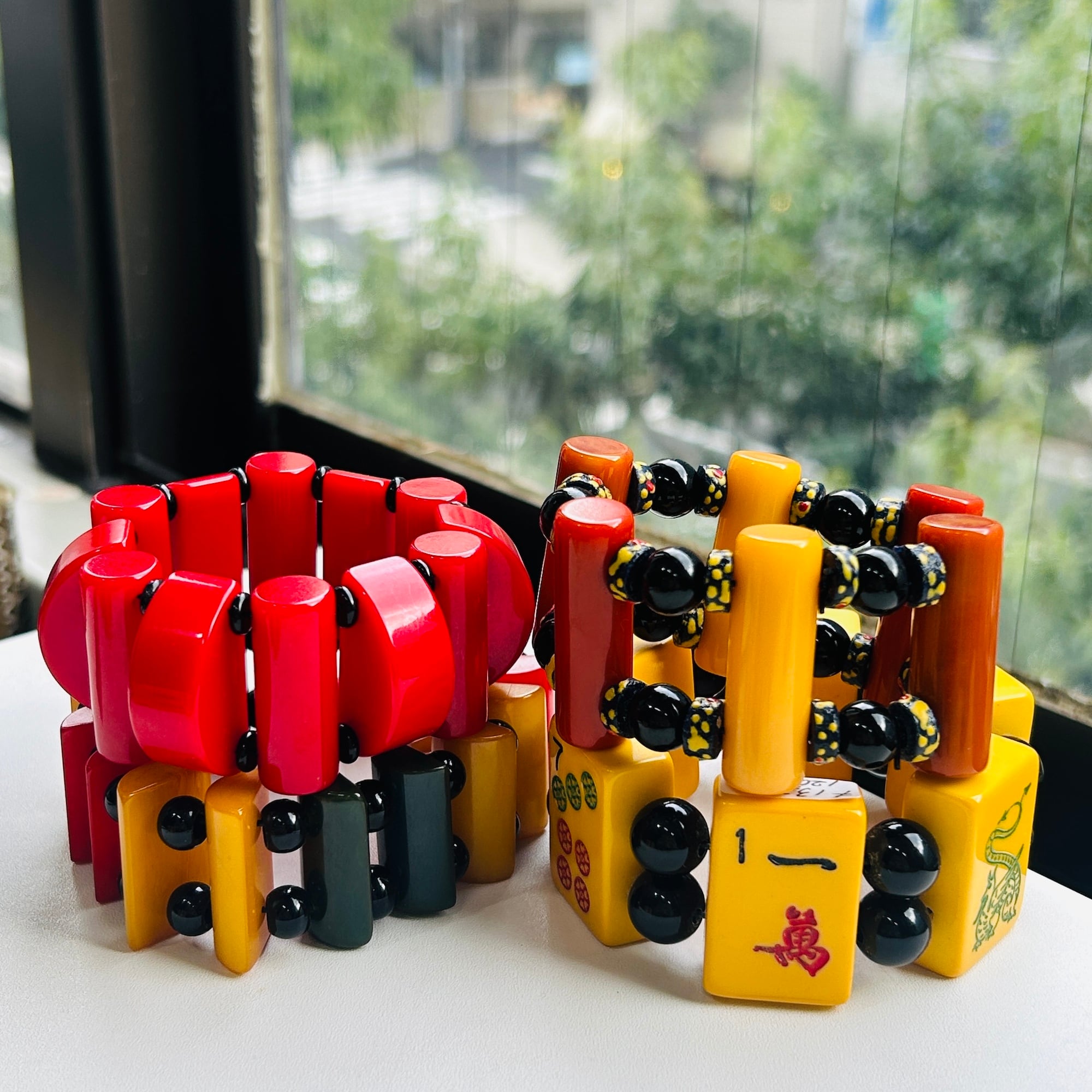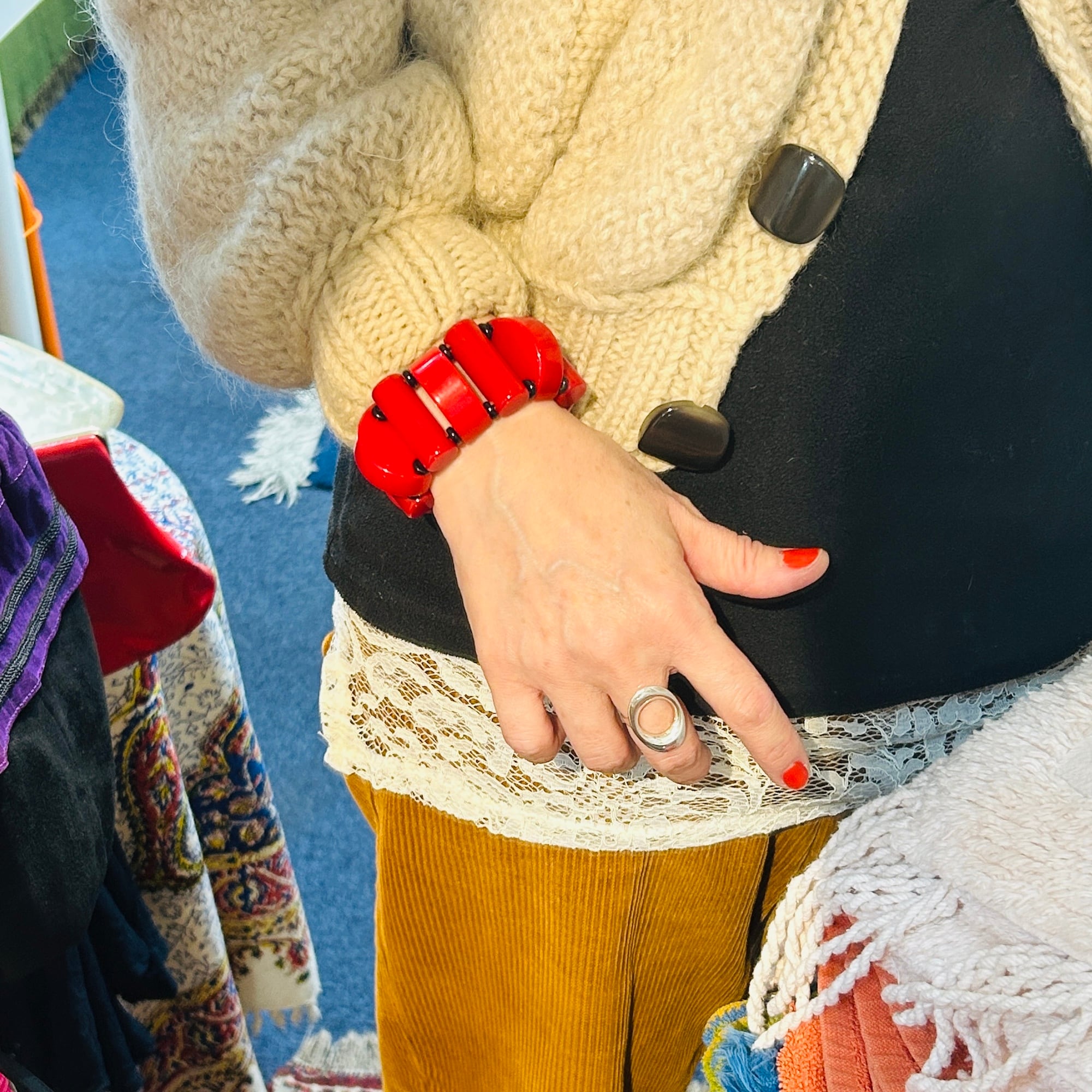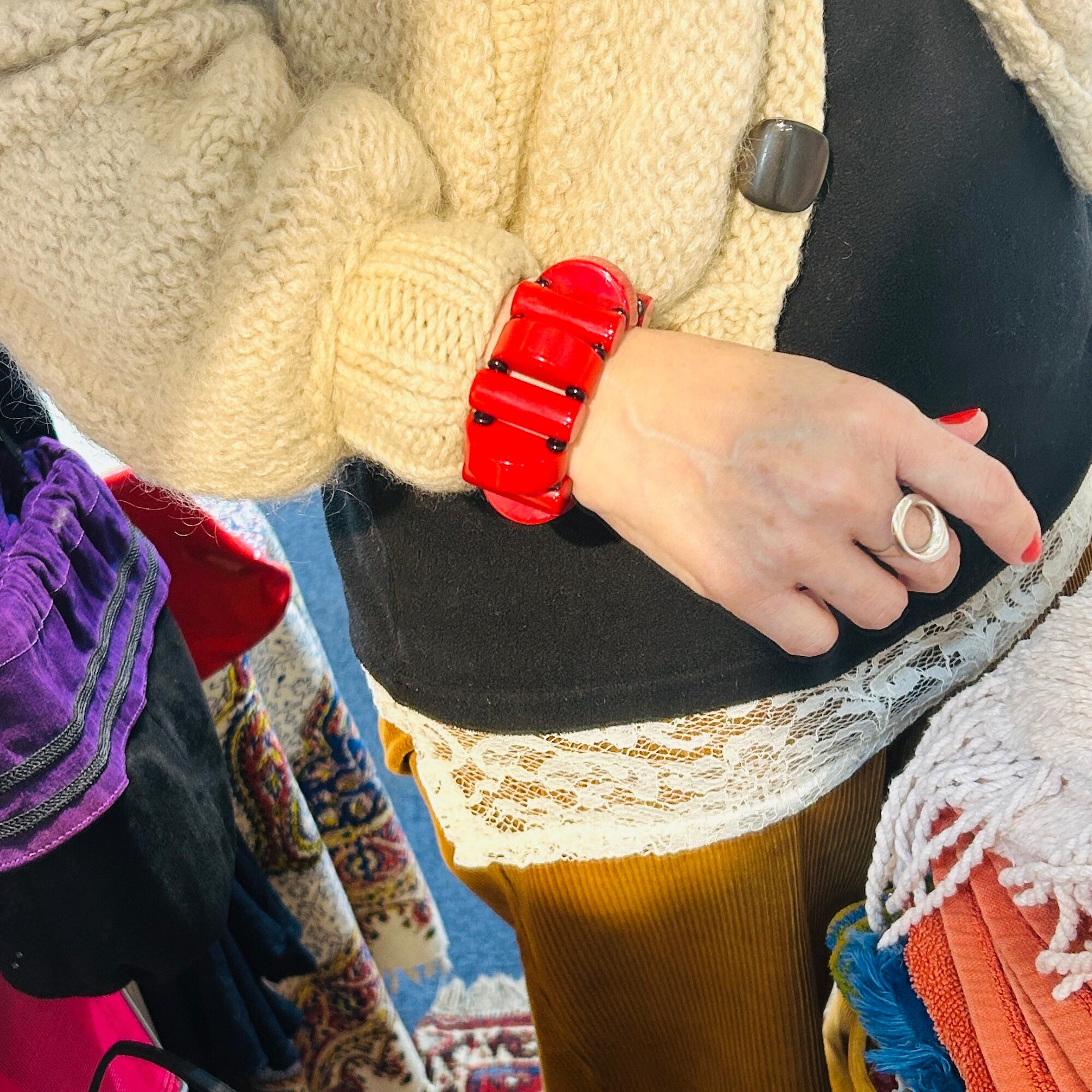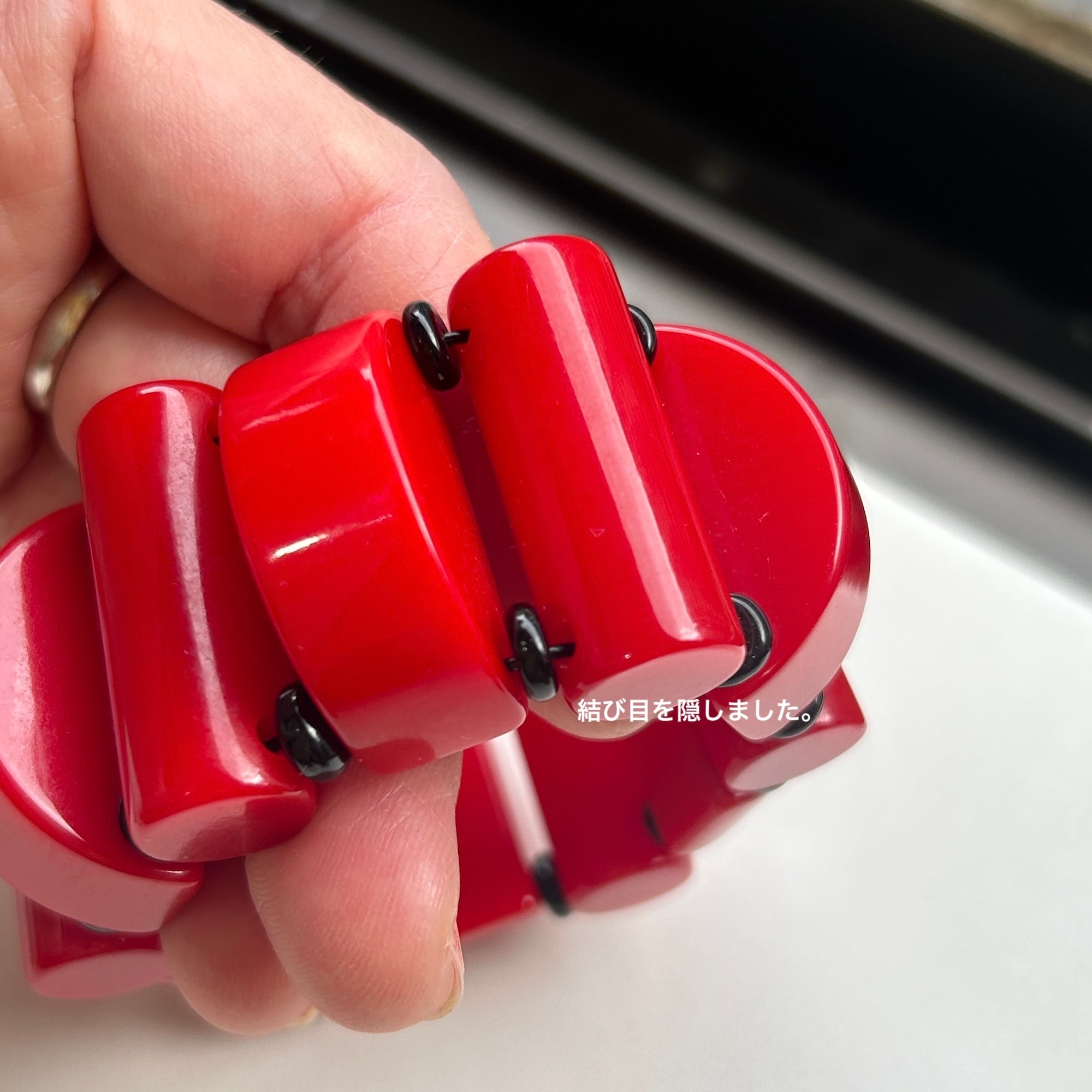ビビッドなカラーとキュートなデザインが魅力のベークライトブレスレット。1940年頃のビーズで、チェリーレッドカラーも、このようなカタチのビーズも、どちらも大変希少です。黒いスペーサービーズはベークライトではありません。中のシリコンゴムは新調されたばかり。タイトでしっかりした作りです。アメリカンヴィンテージならではの大胆デザイン。手元に視線を集めるブレスレットです。ゴムの結び目はビーズ内に納めましたがまた出てくるかもしれません。私の手首は約14.5cm。ジャストフィットです。