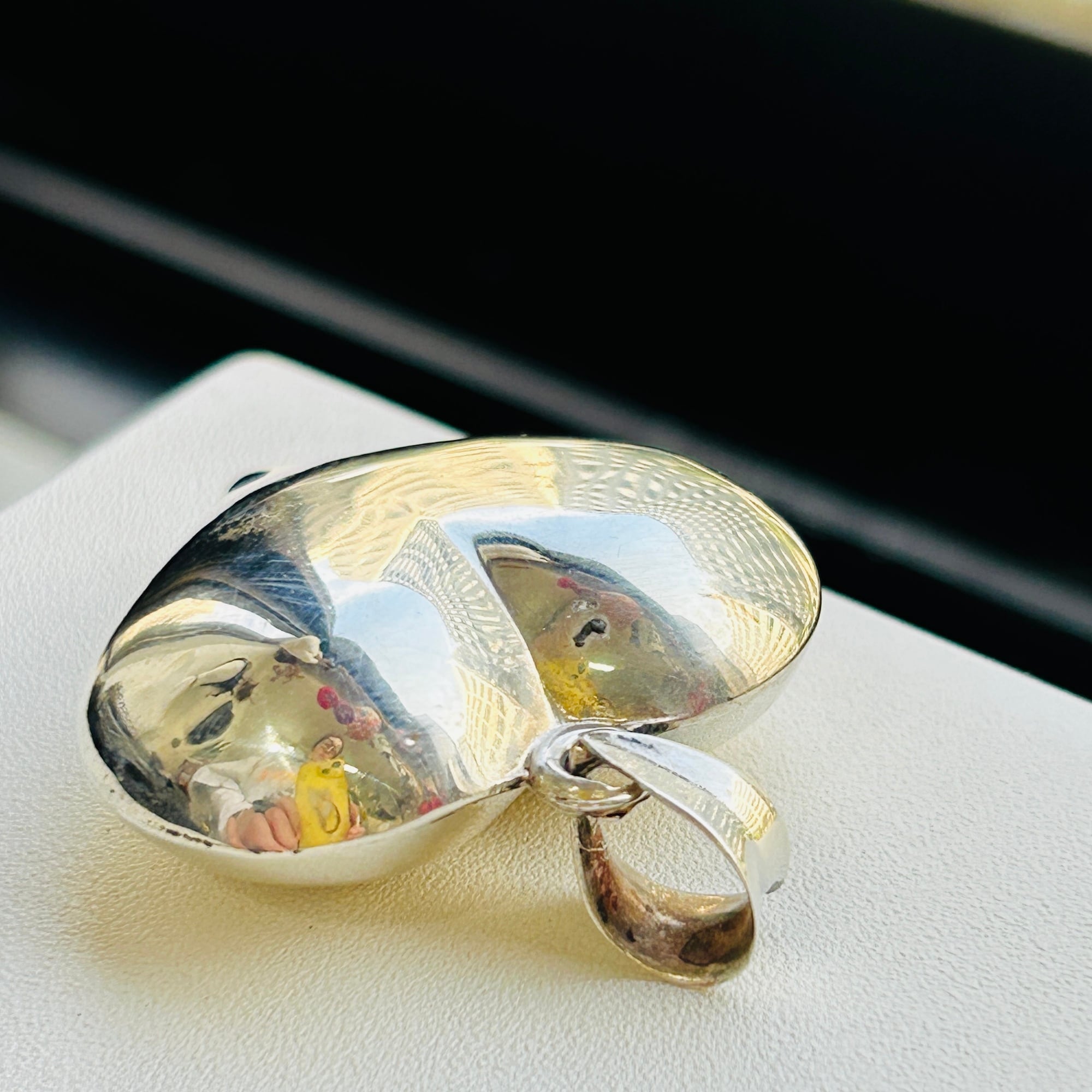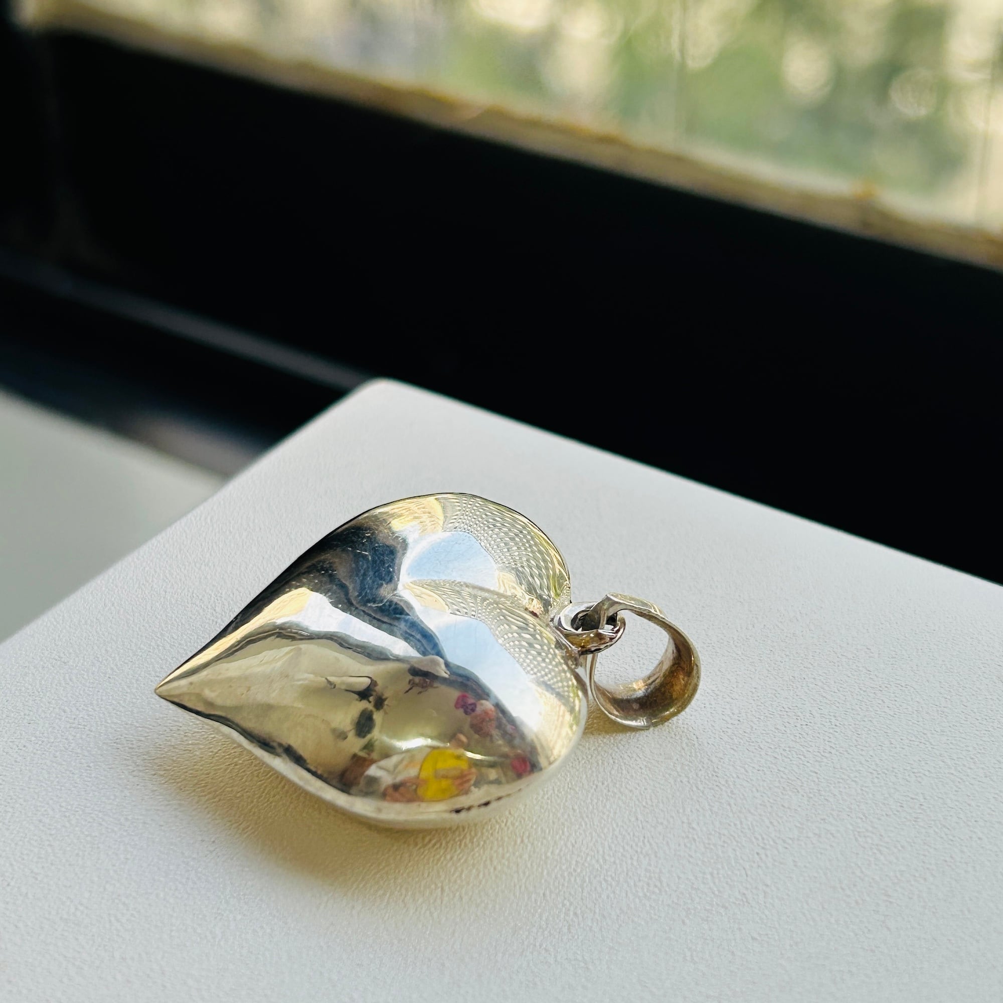 プレーンなパフィハート。ツルンとして可愛いです。光を受けてよく輝くので目を惹きます。お手持ちのチェーンやリボン、革紐と合わせてお楽しみください。ベイルに「925」刻印。