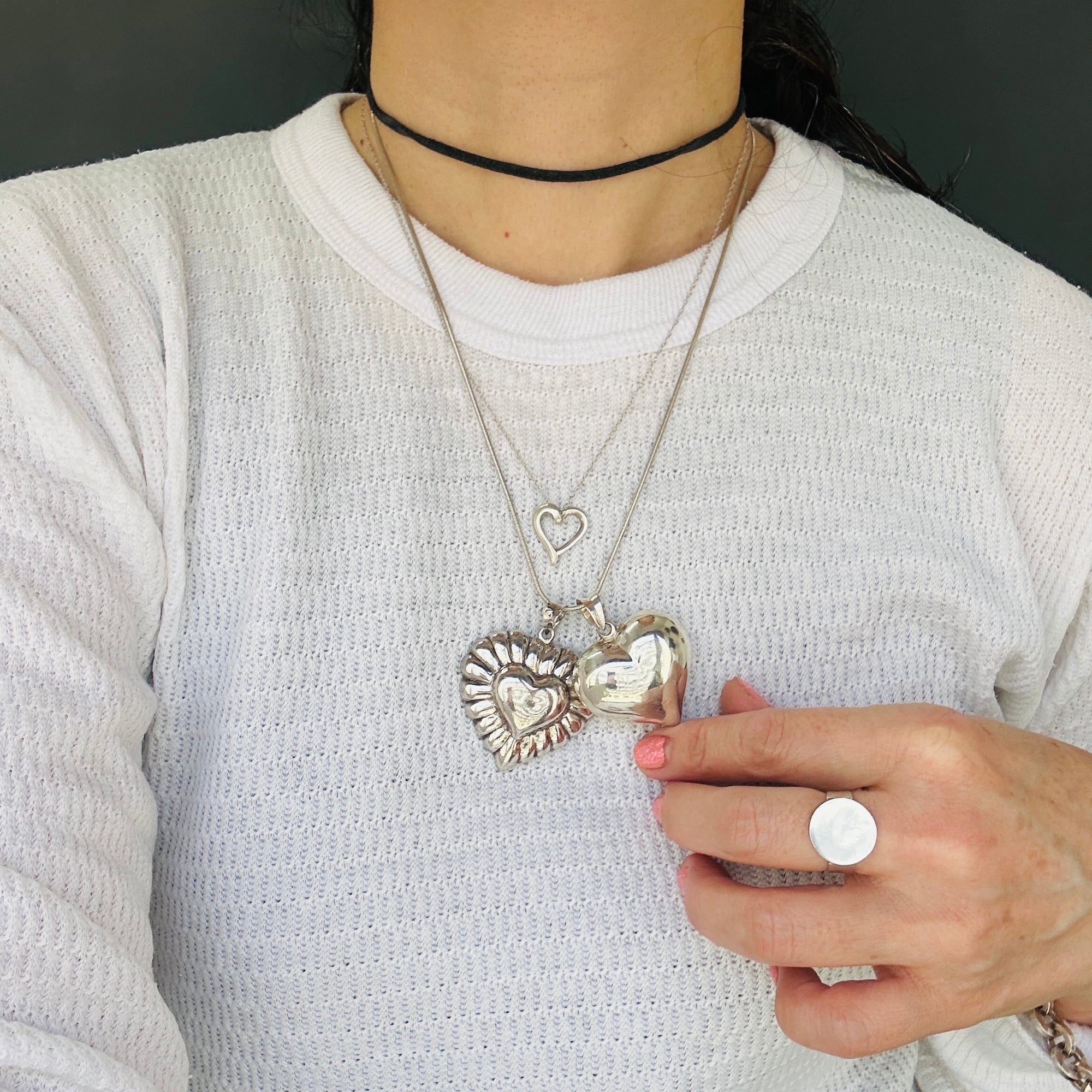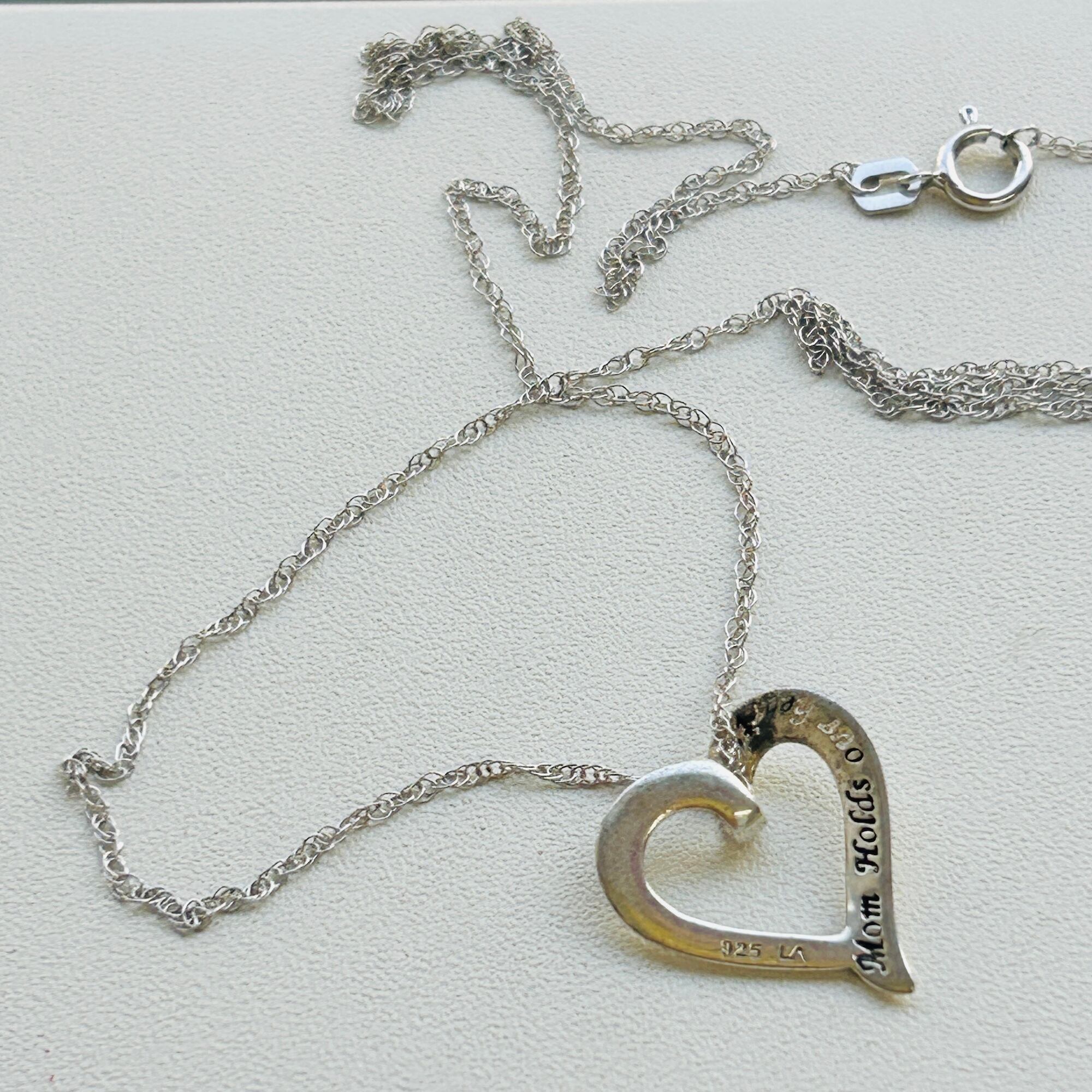 ガーリィなハートネックレス。筆描き風のアウトラインハートは上部がチェーンを通すベイルになっています。裏側には半分燻が取れた凹文字「Mom holds our hearts」。華奢なチェーンは細かい丸コマが重なり合ったチェーンです。引き輪を引っ掛けにくいので反対のエンドに丸カンを付けました。ハートに「LA」「925」、チェーンに「925」。Good Price!
