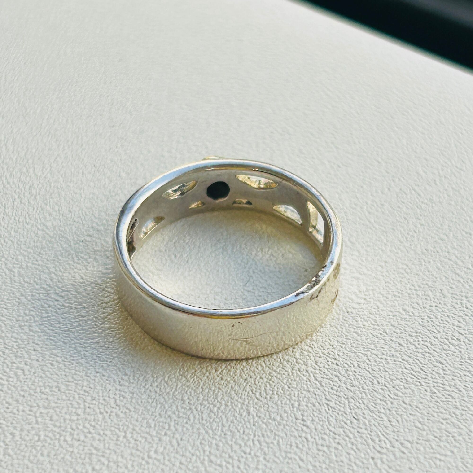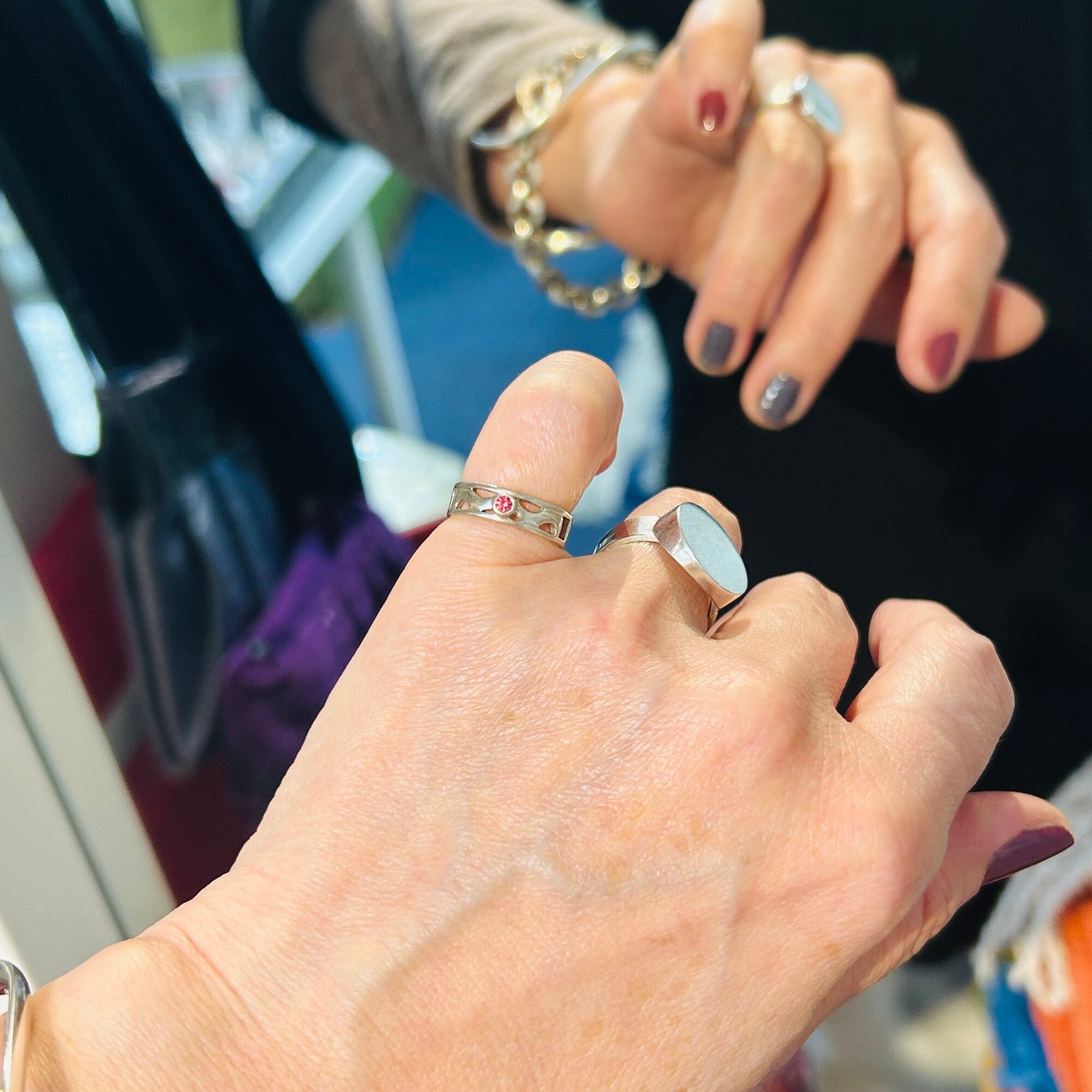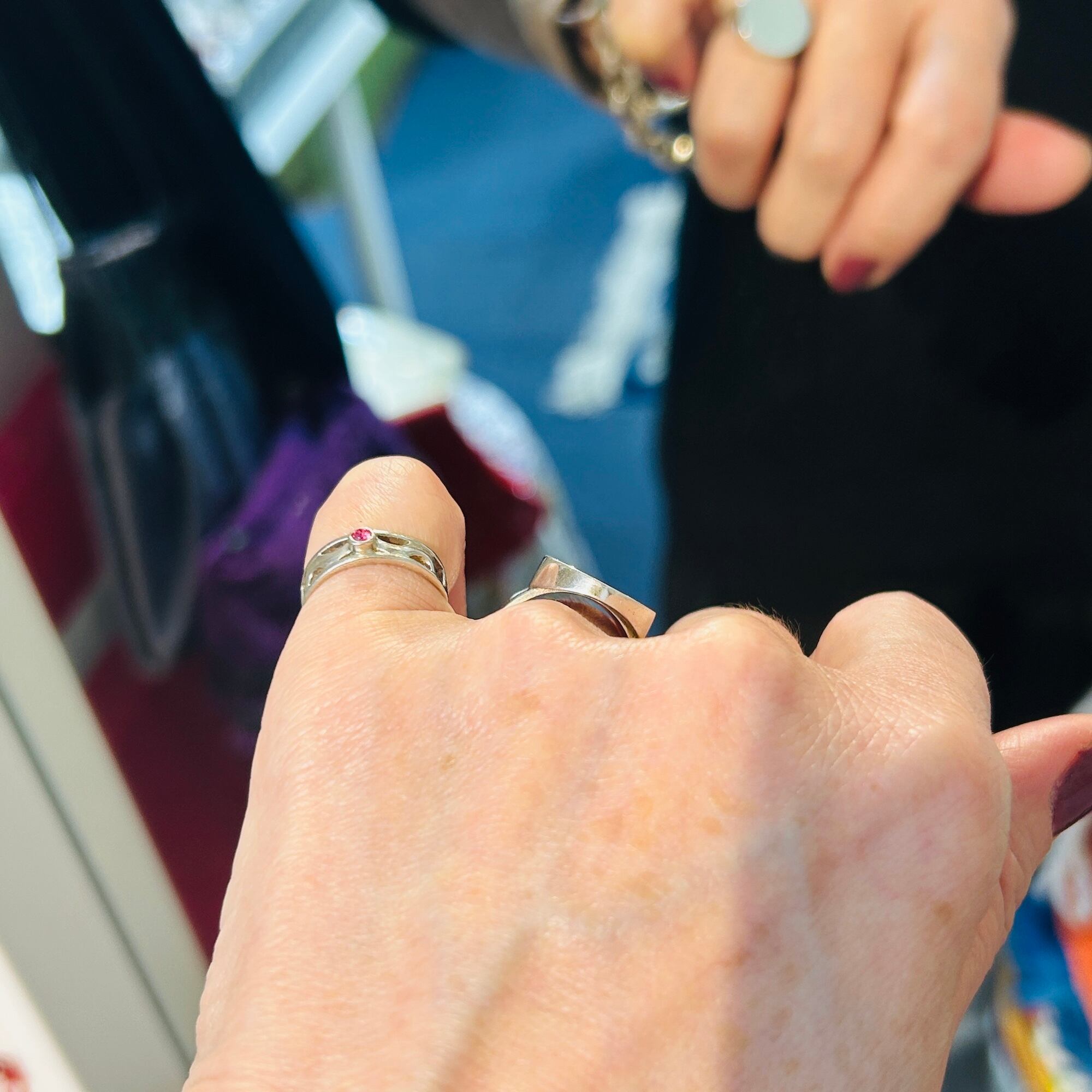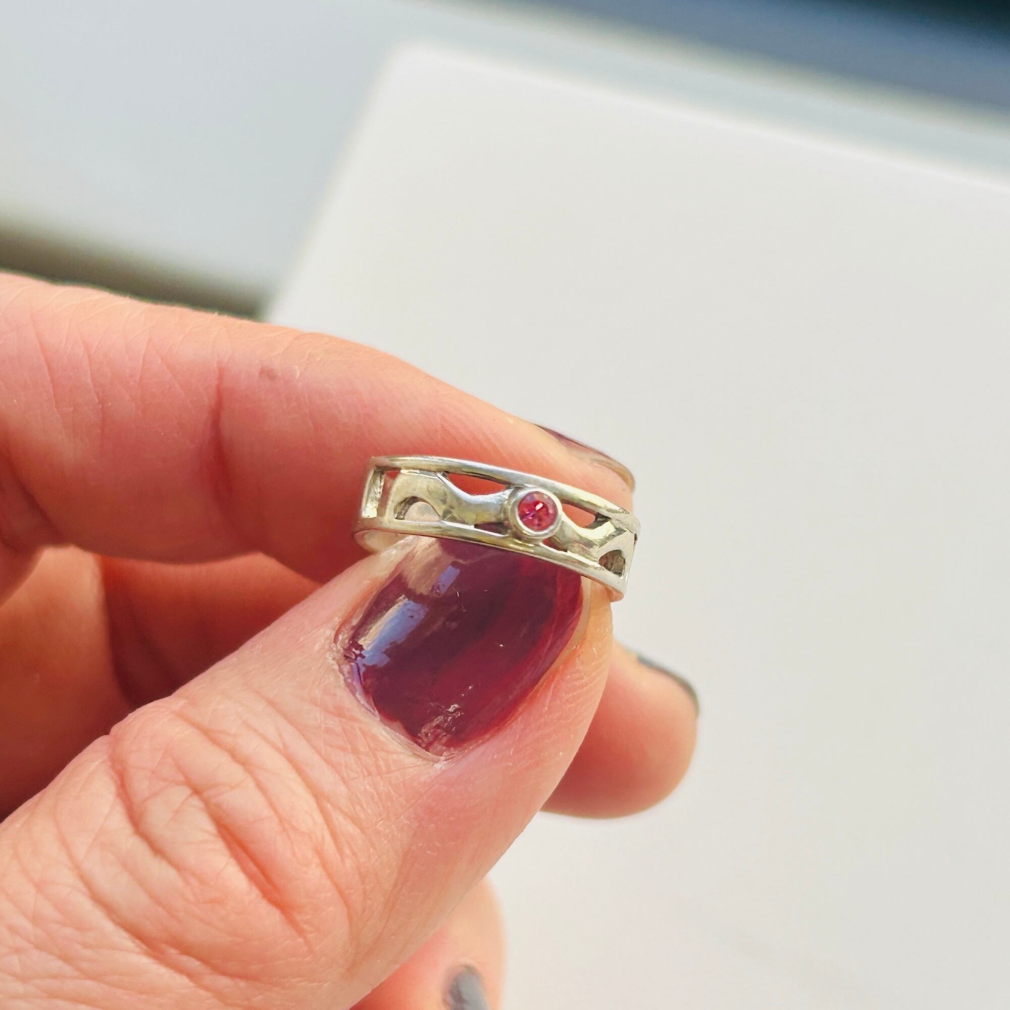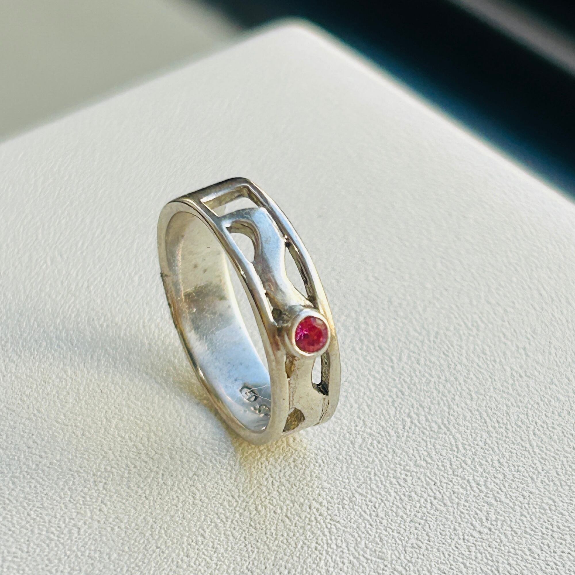 4号サイズのバンドリング。4mm幅のバンドリングにピンクCZがキュート。透かし模様もいい感じです。普通サイズのリングをサイズダウンしたような全体的にしっかりした作りです。私は小指にジャストフィット。内側に「925」とメーカーマーク。
