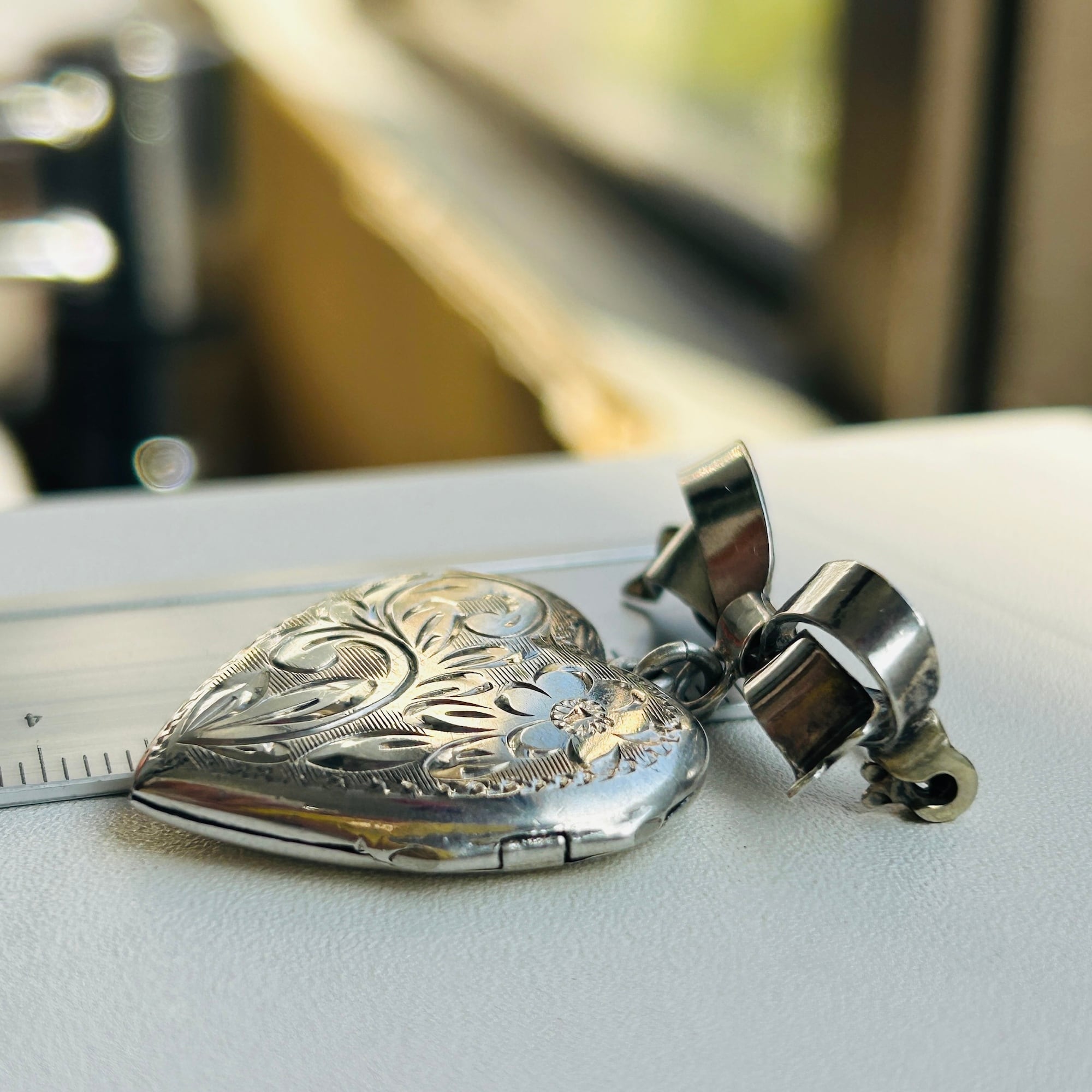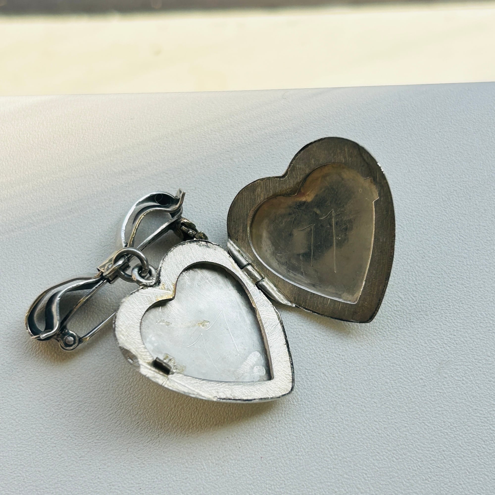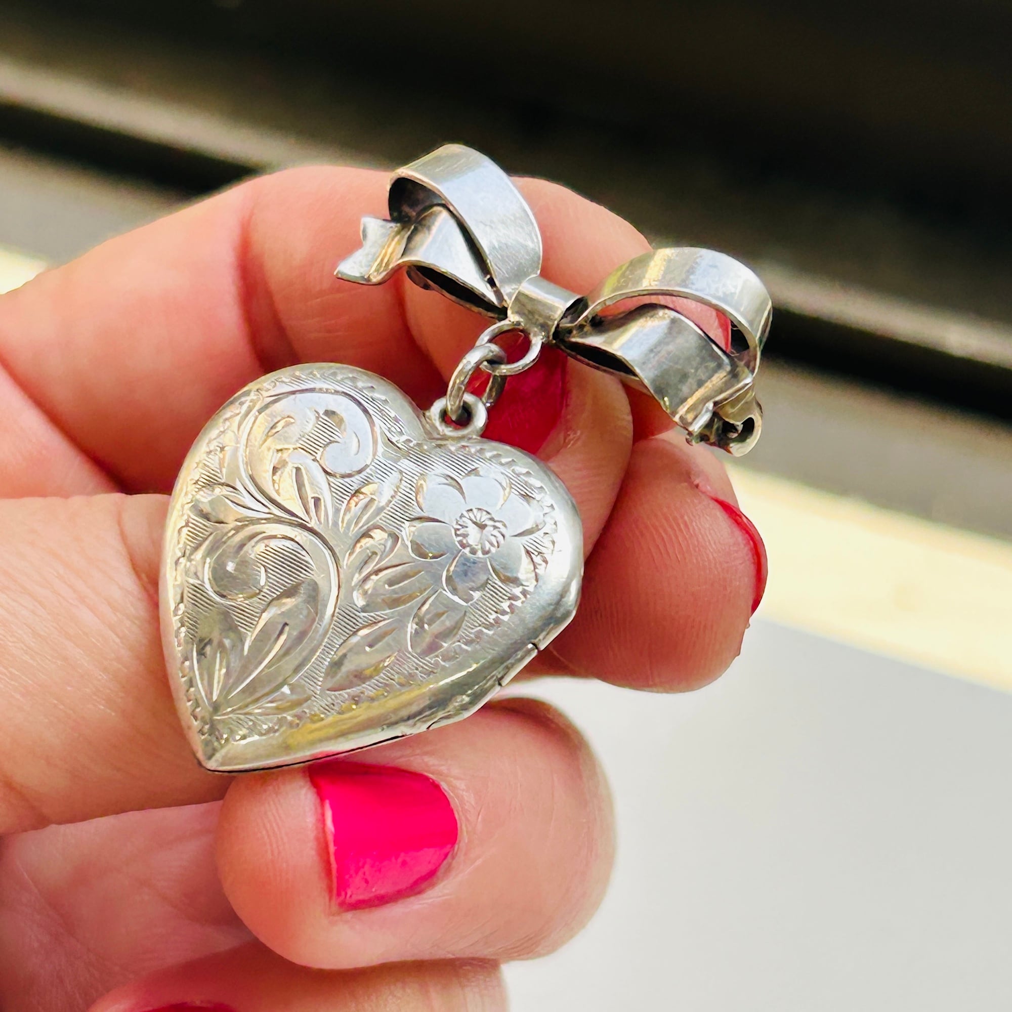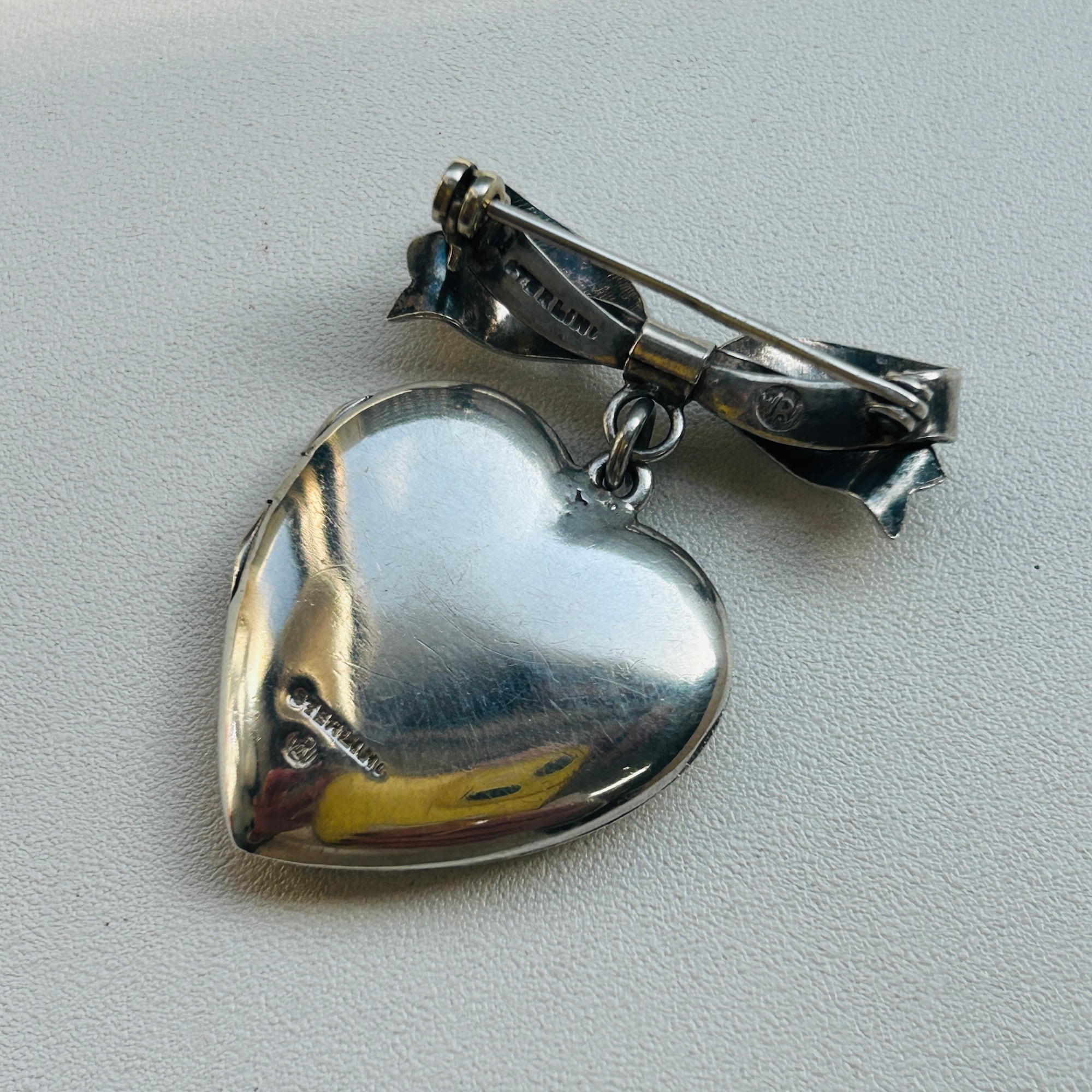 リボンにハートロケットがぶら下がった超ラブリーブローチ。カナダ・トロント拠点のジュエリーメーカー「W.R. Johnson Jewelry Company」のアイテム。スウィートハートジュエリーと呼ばれる第二次世界大戦頃のメモリアルなジュエリーでロケットの中にモノクロ写真が入っていました。リボンとハートの裏に「STERLING」とメーカーロゴ。針の動きに問題ありません。