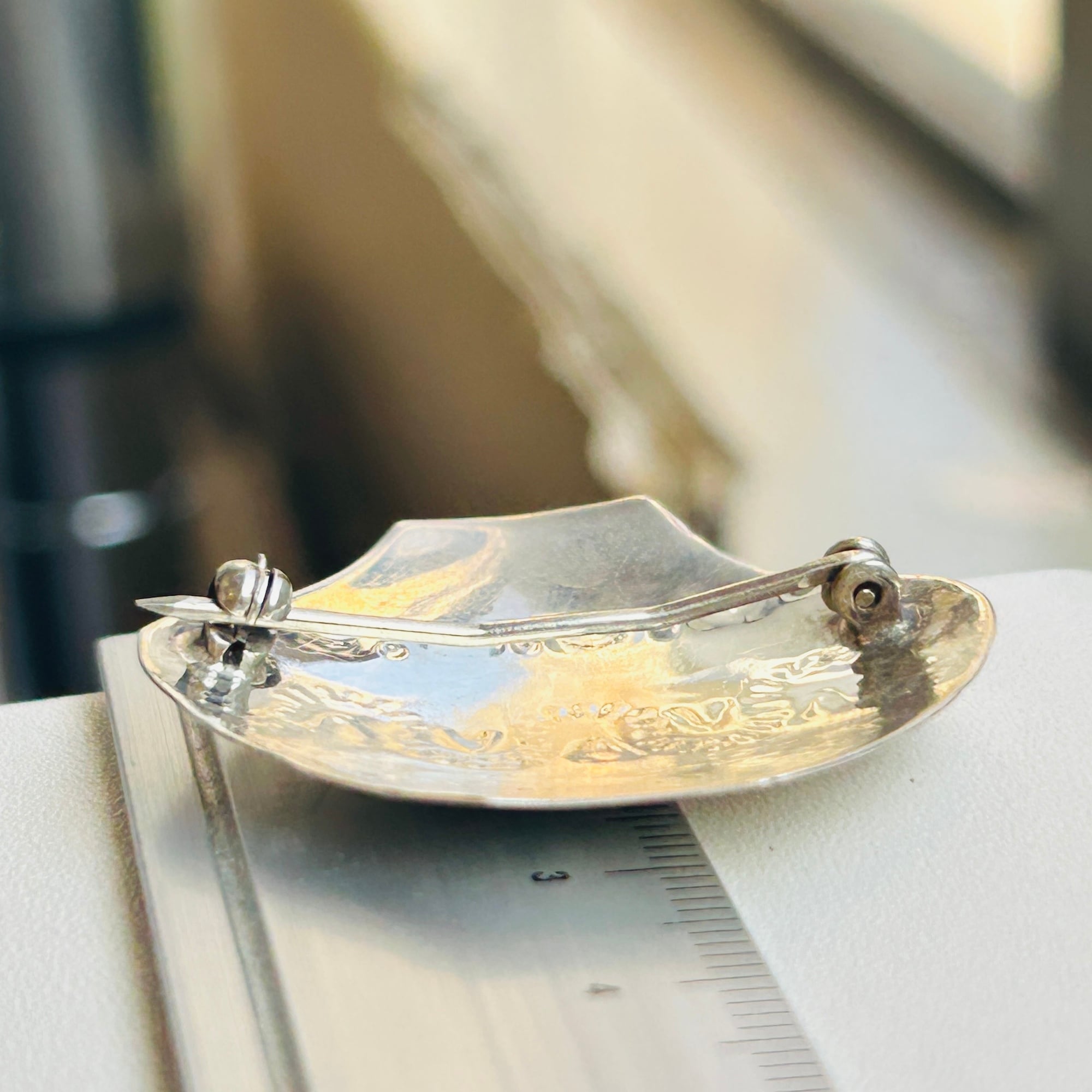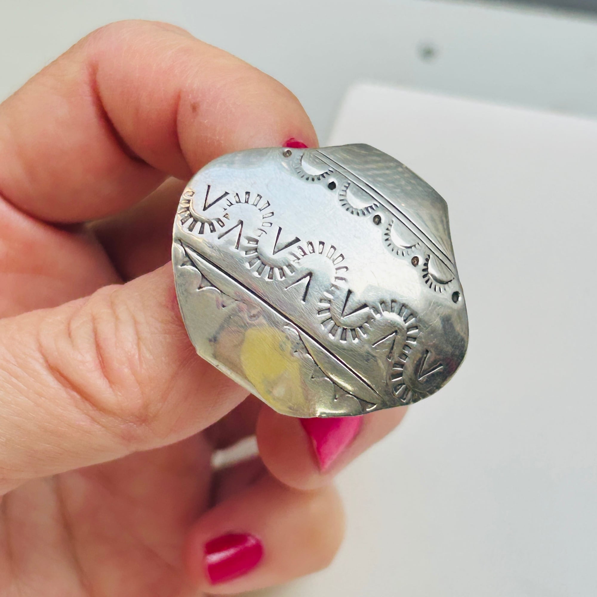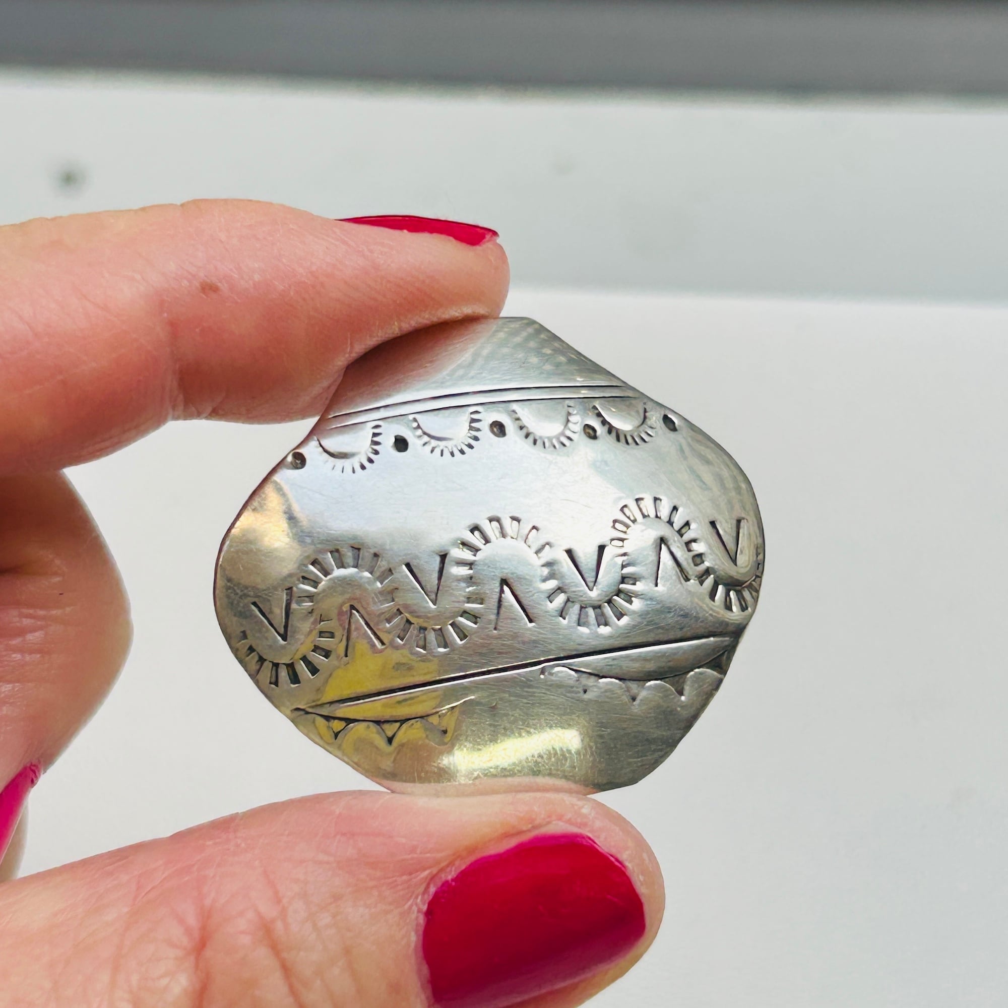 昔っぽい壺モチーフにキュートなスタンプワークが施されたシルバーブローチ。ハンドメイドのあたたかみを感じるネイティブ・アメリカンジュエリーです。針が少し曲がっていますが使用に問題ありません。STERLING刻印。