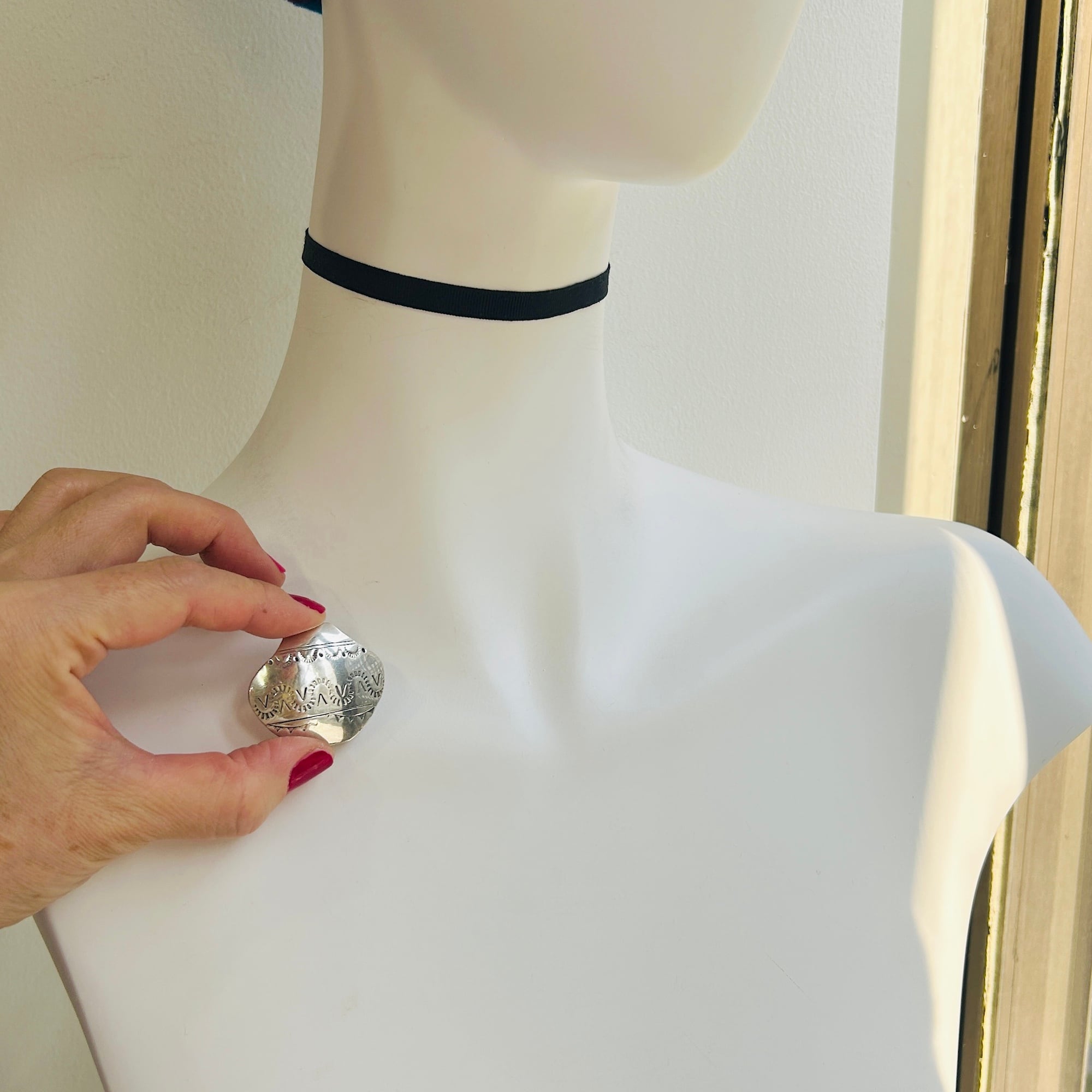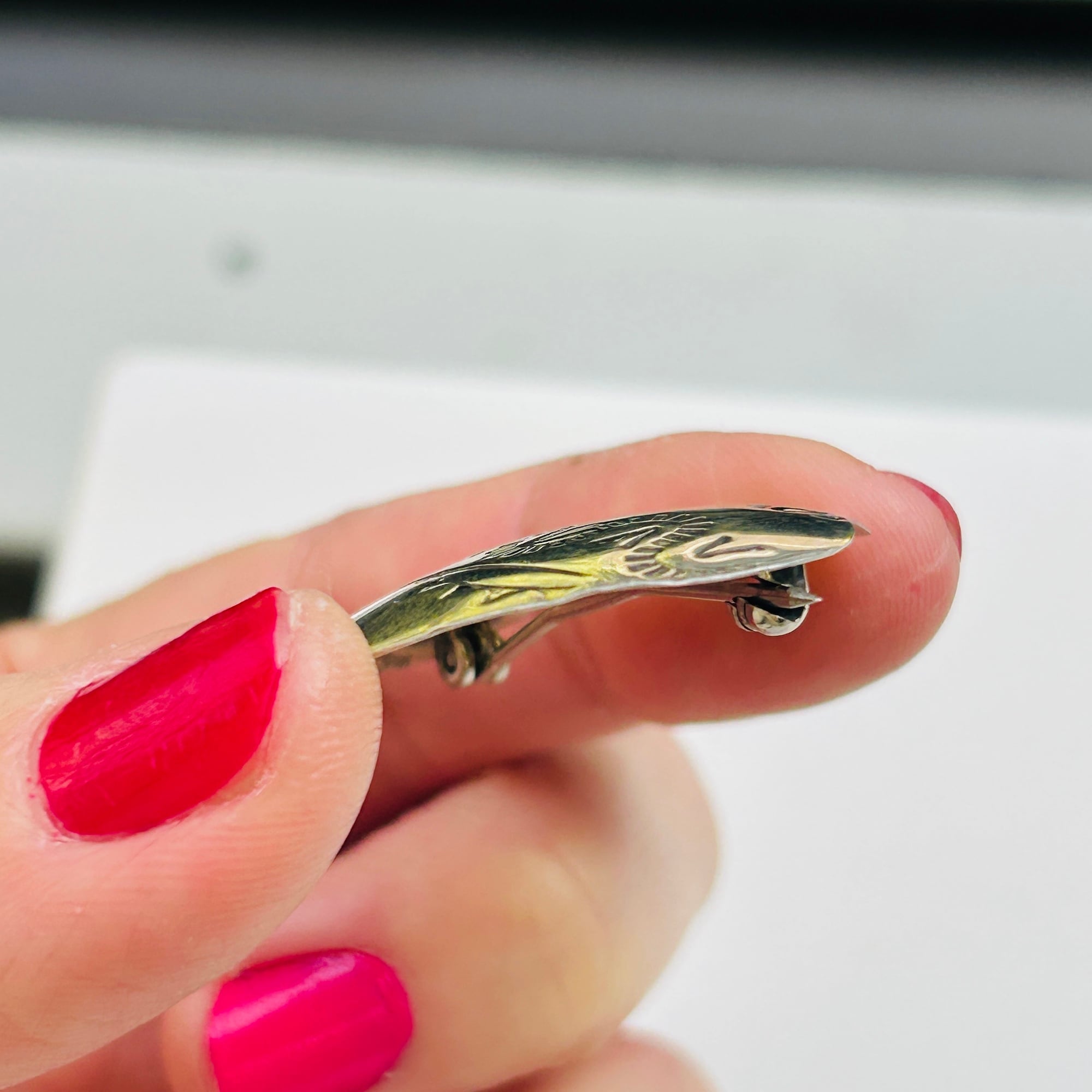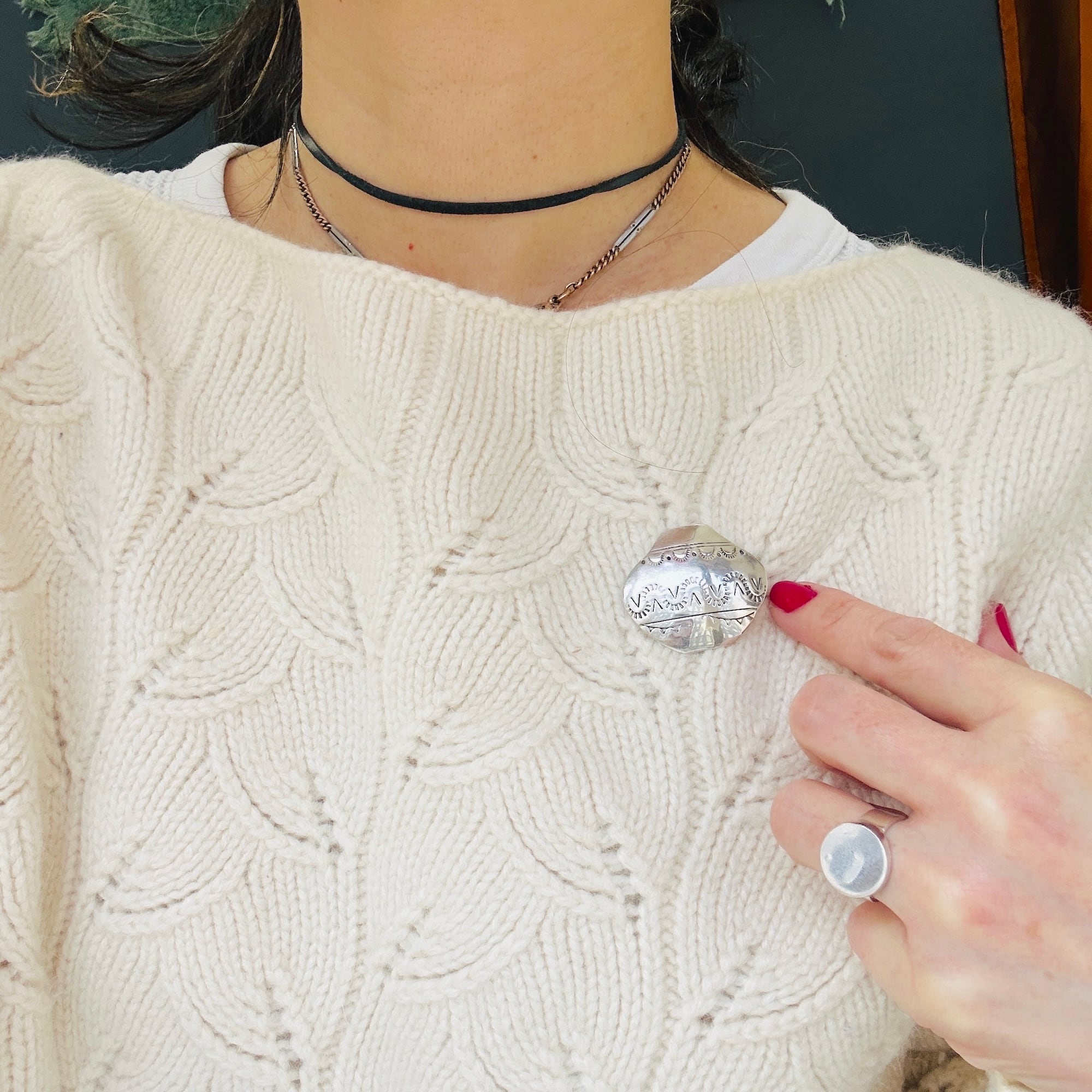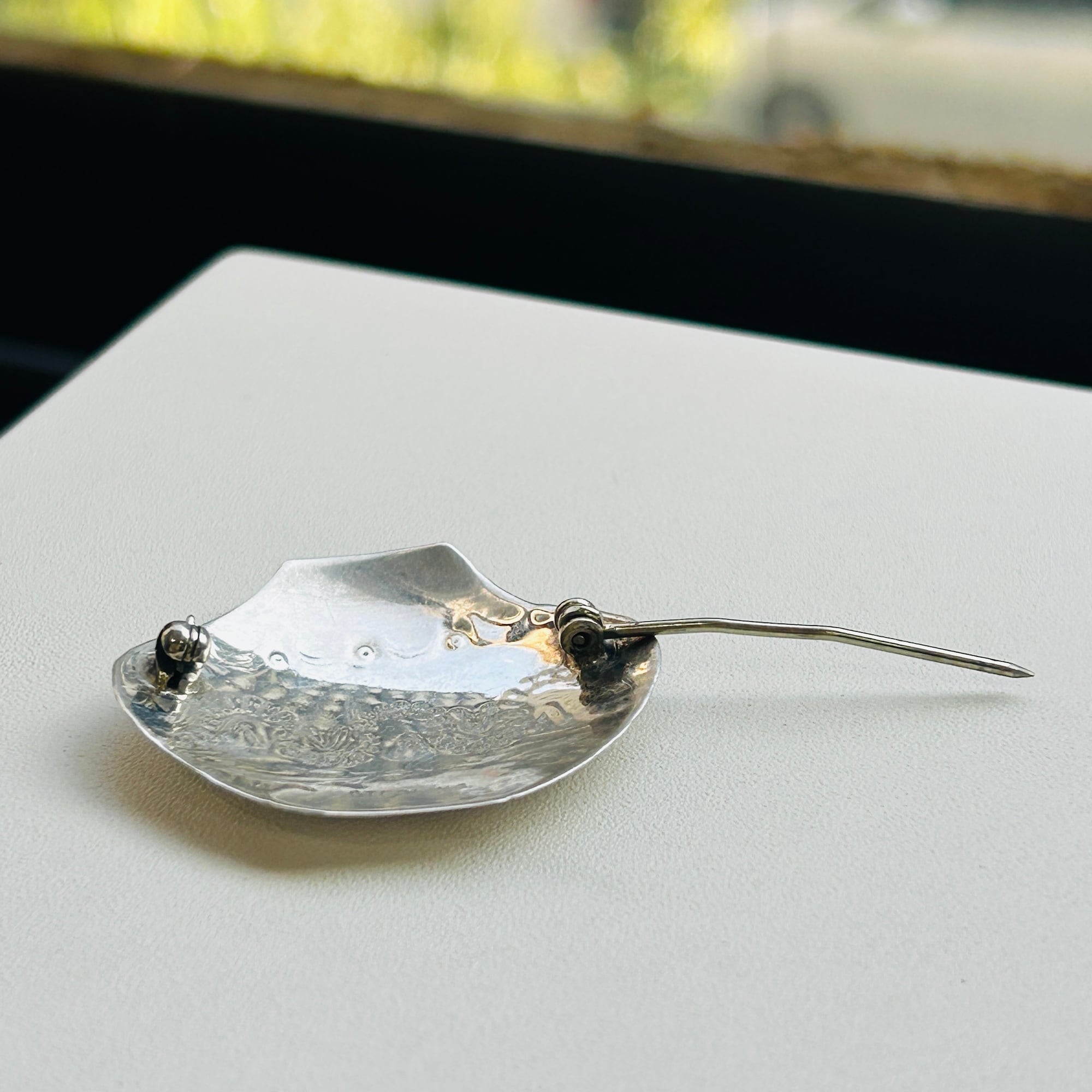 昔っぽい壺モチーフにキュートなスタンプワークが施されたシルバーブローチ。ハンドメイドのあたたかみを感じるネイティブ・アメリカンジュエリーです。針が少し曲がっていますが使用に問題ありません。STERLING刻印。