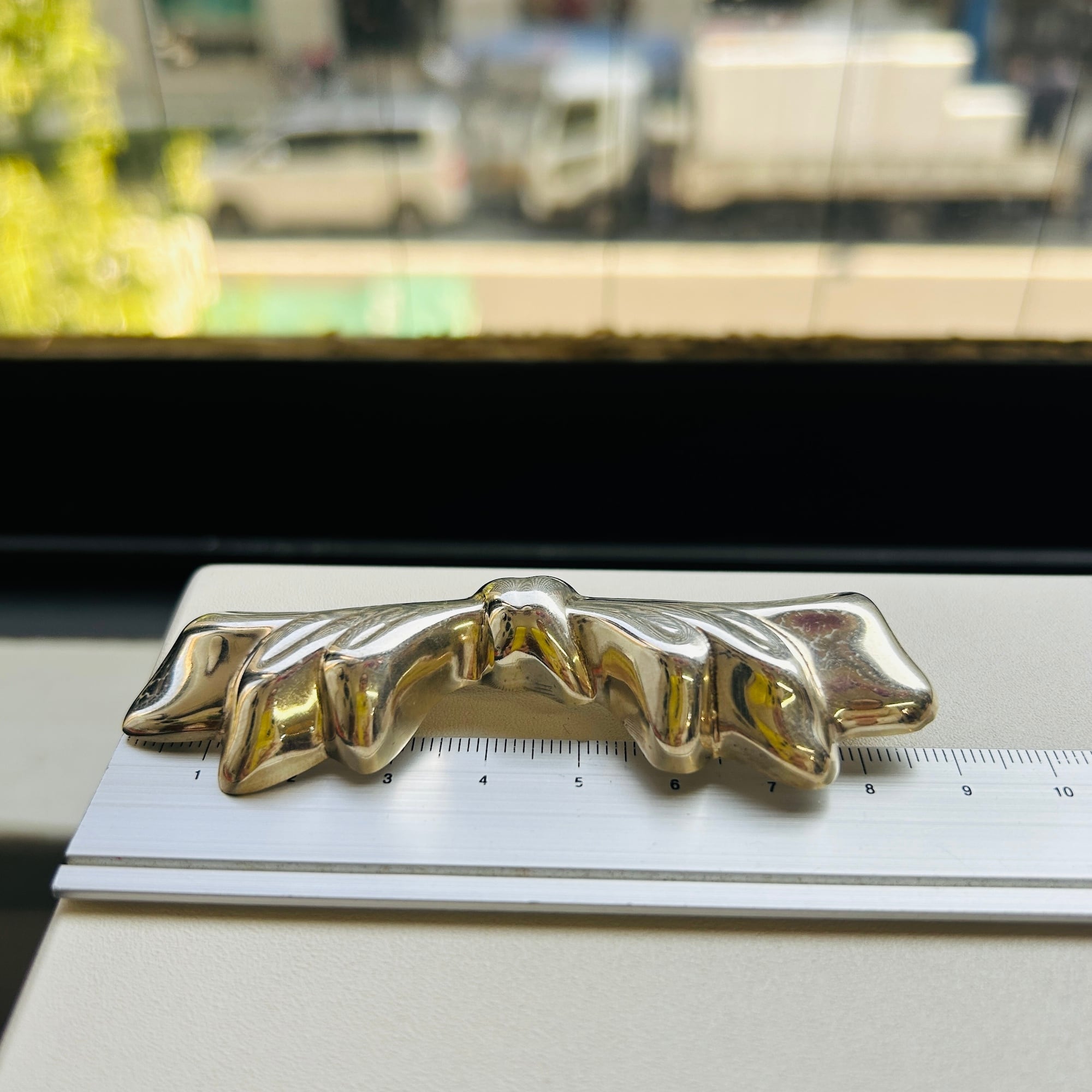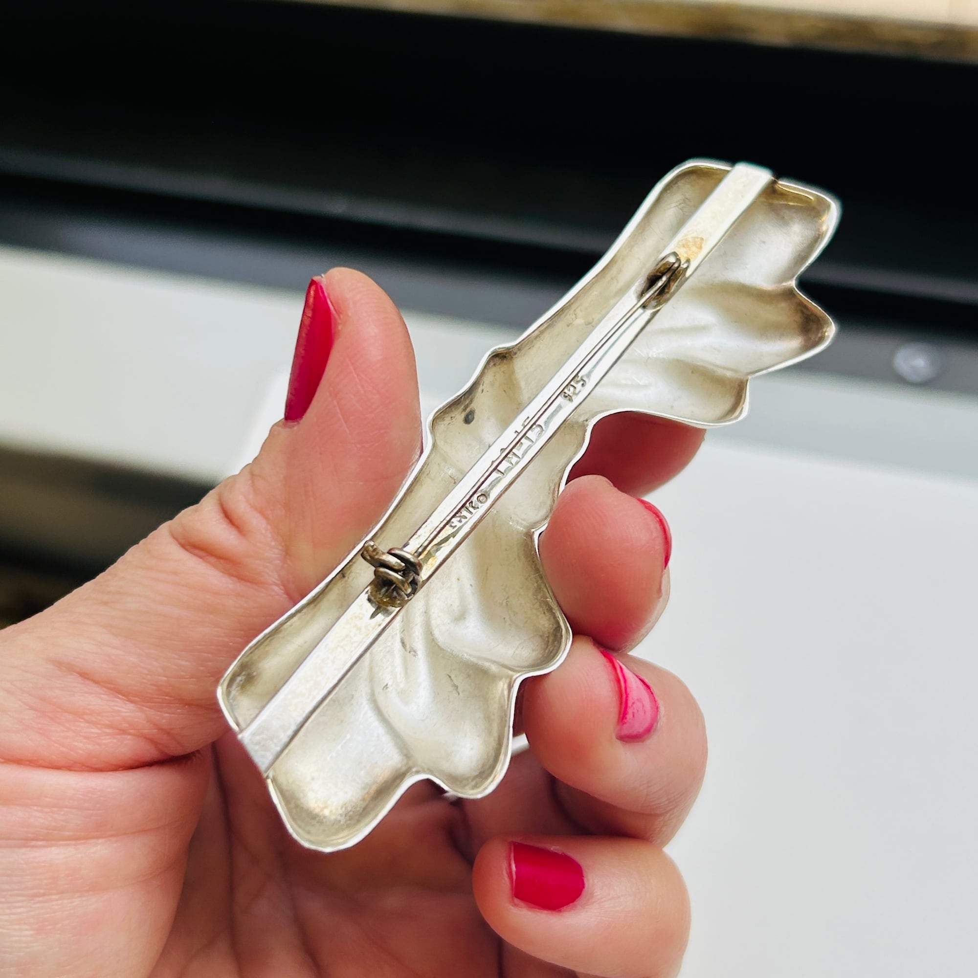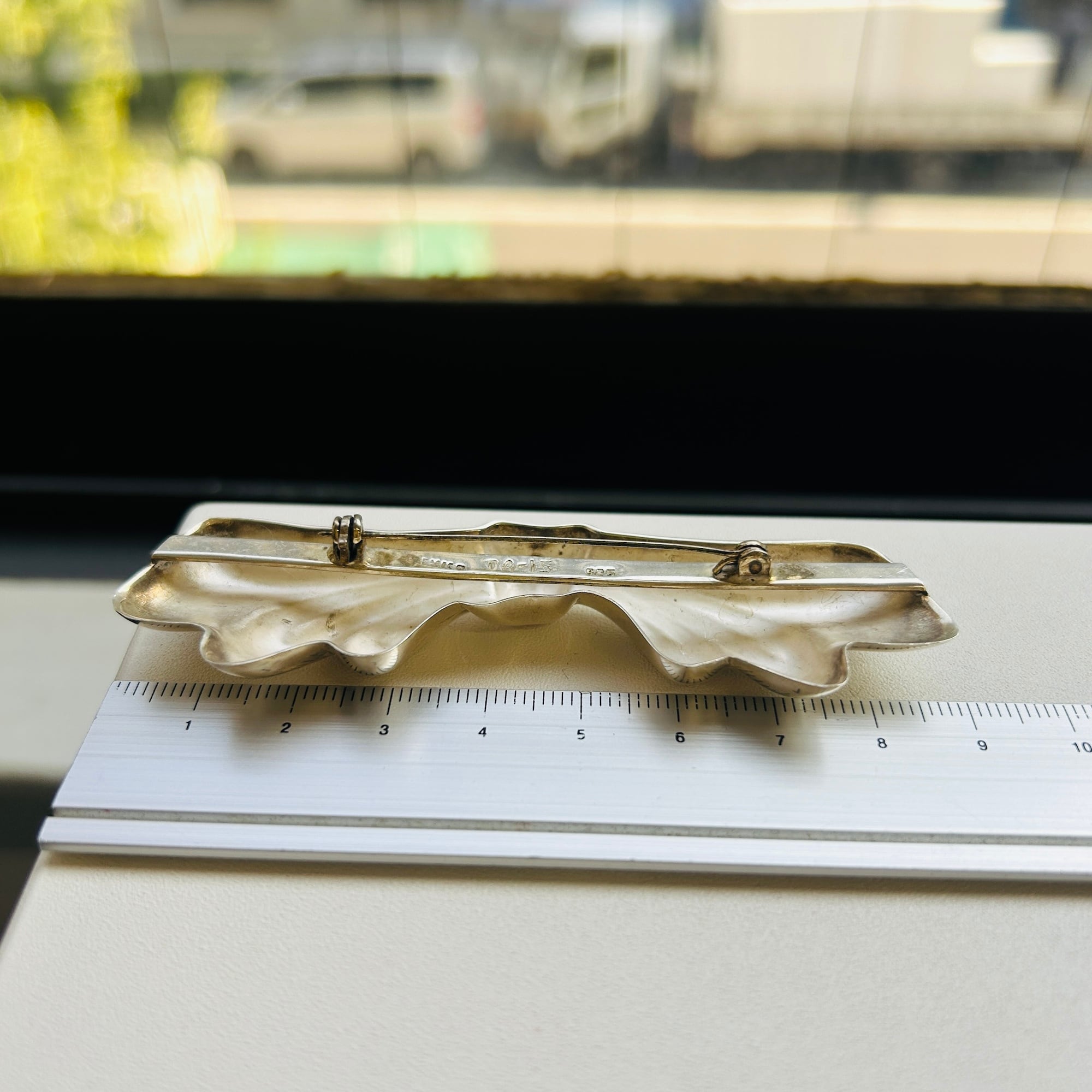スリムで横に長いビッグリボンブローチ。幾何学的な雰囲気もありスタイリッシュです。裏側が凹んだ作りですが作りは重厚です。お上品なイメージのリボン。ヴィンテージシルバーだとカッコ良さが加わり甘すぎずGOOD。貫禄あります。裏にメキシカンシルバー925刻印。