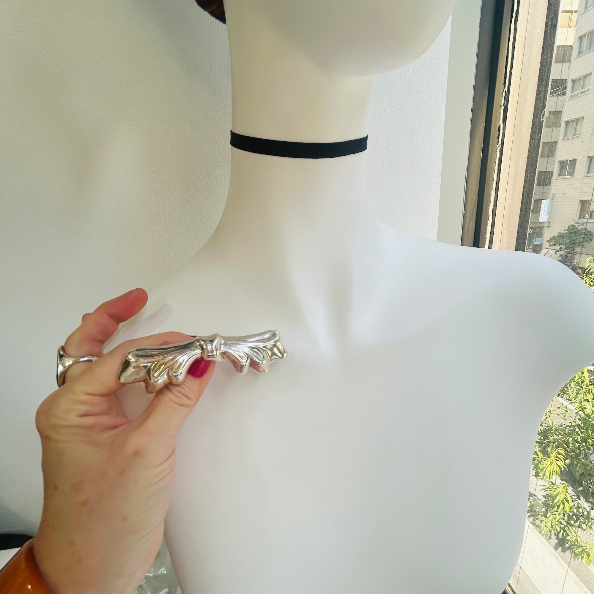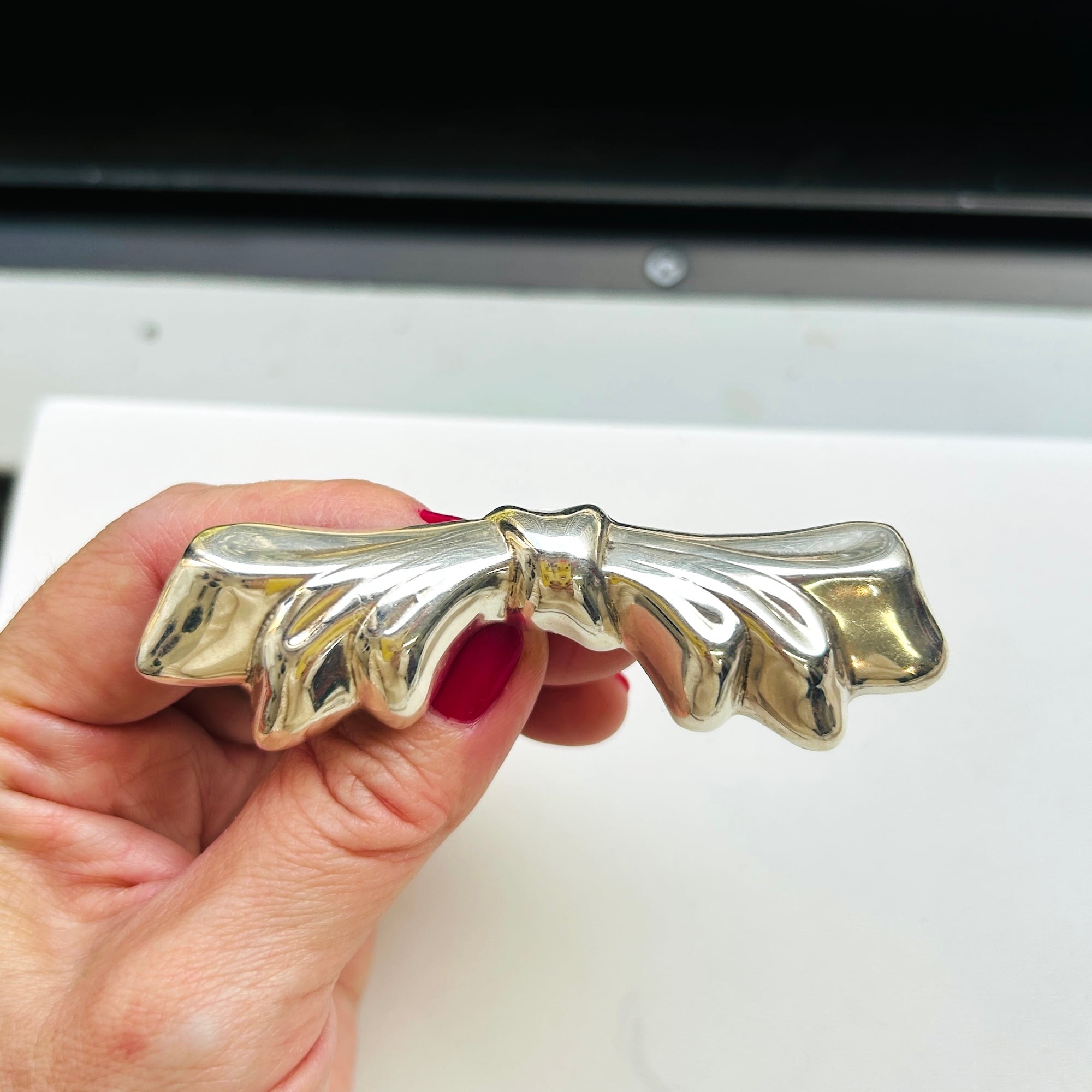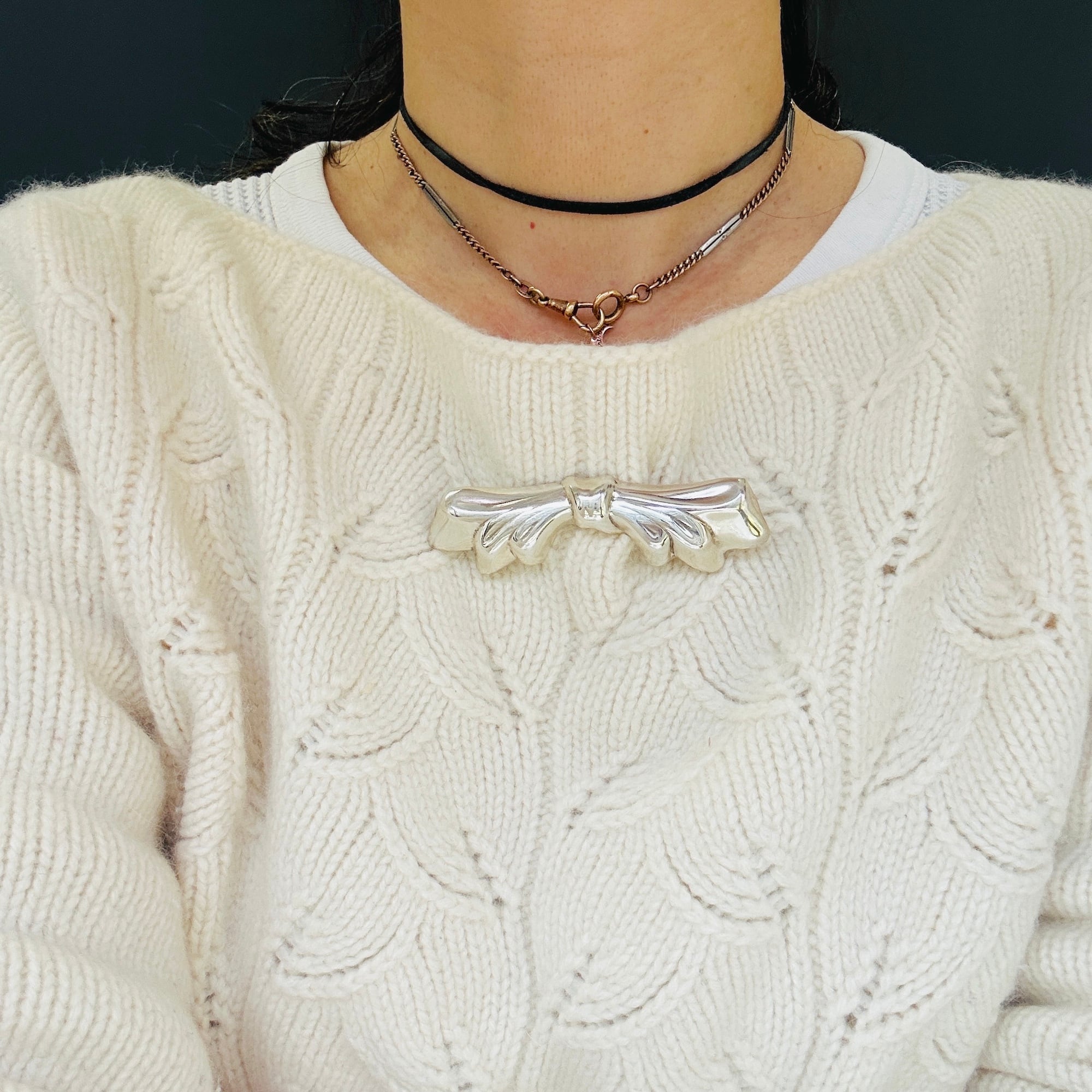 スリムで横に長いビッグリボンブローチ。幾何学的な雰囲気もありスタイリッシュです。裏側が凹んだ作りですが作りは重厚です。お上品なイメージのリボン。ヴィンテージシルバーだとカッコ良さが加わり甘すぎずGOOD。貫禄あります。裏にメキシカンシルバー925刻印。
