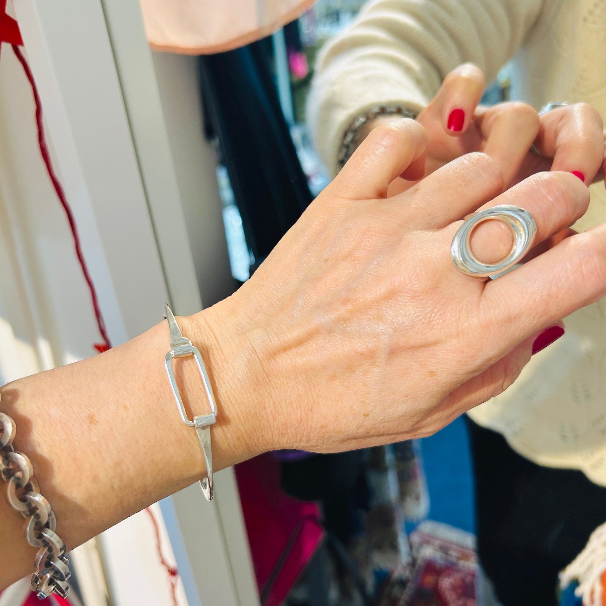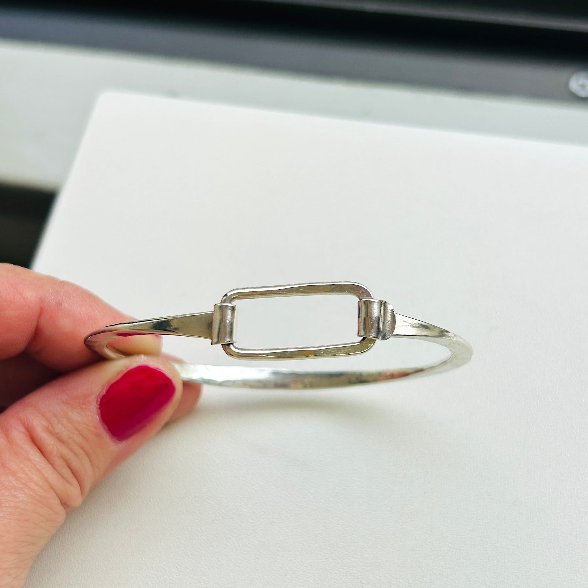 スリムな長方形がアクセントの引っ掛けバングル。長方形が留め具にもなっています。手首周りの輪に強弱がある一捻りあるデザインです。もたつきのないフィット感もGOOD。最初は片手で引っ掛け金具を扱うことに手こずるかもしれませんが、すぐコツを掴んで慣れます。チャームを付けたりしても可愛いと思います。チェーンブレスレットとの相性もいいです。