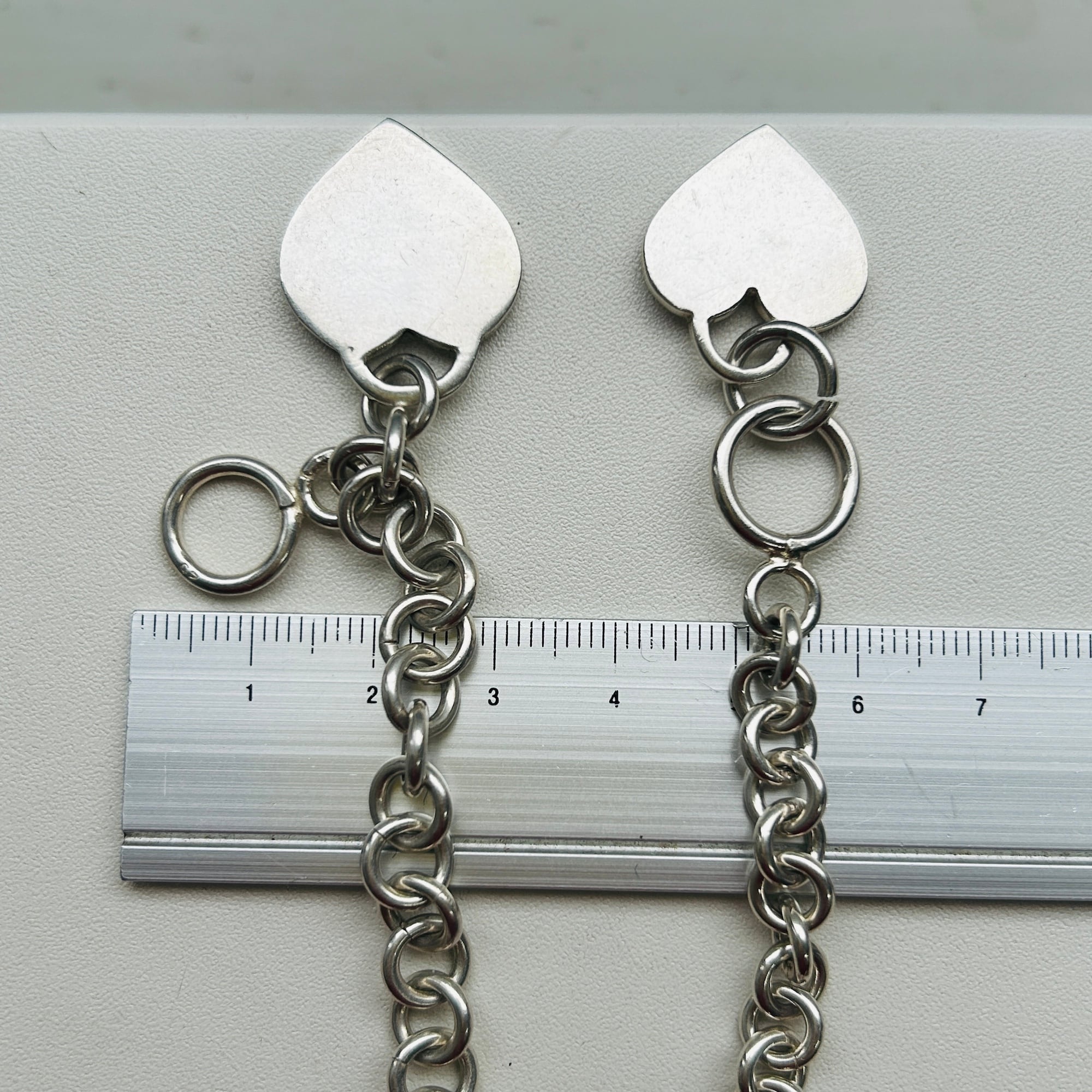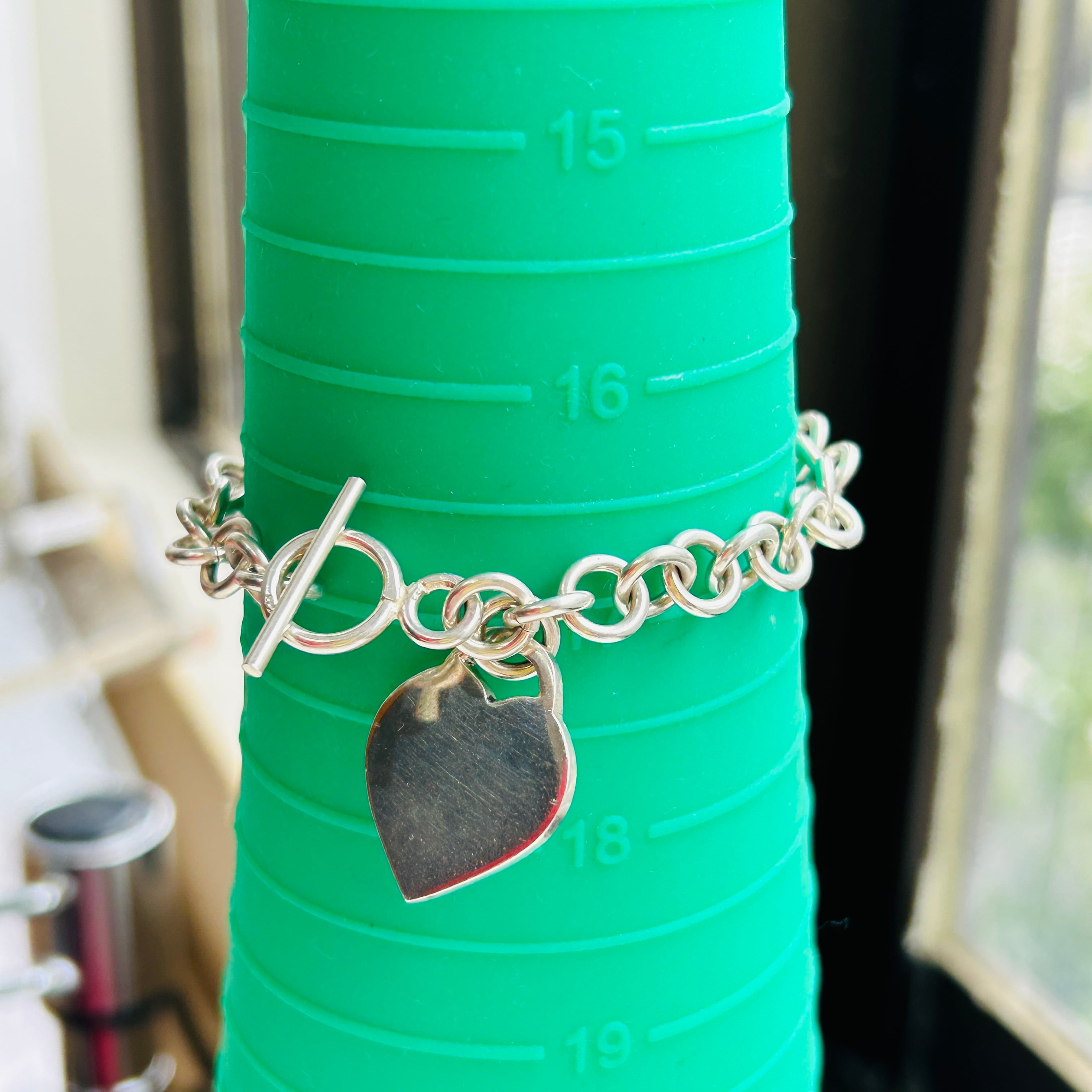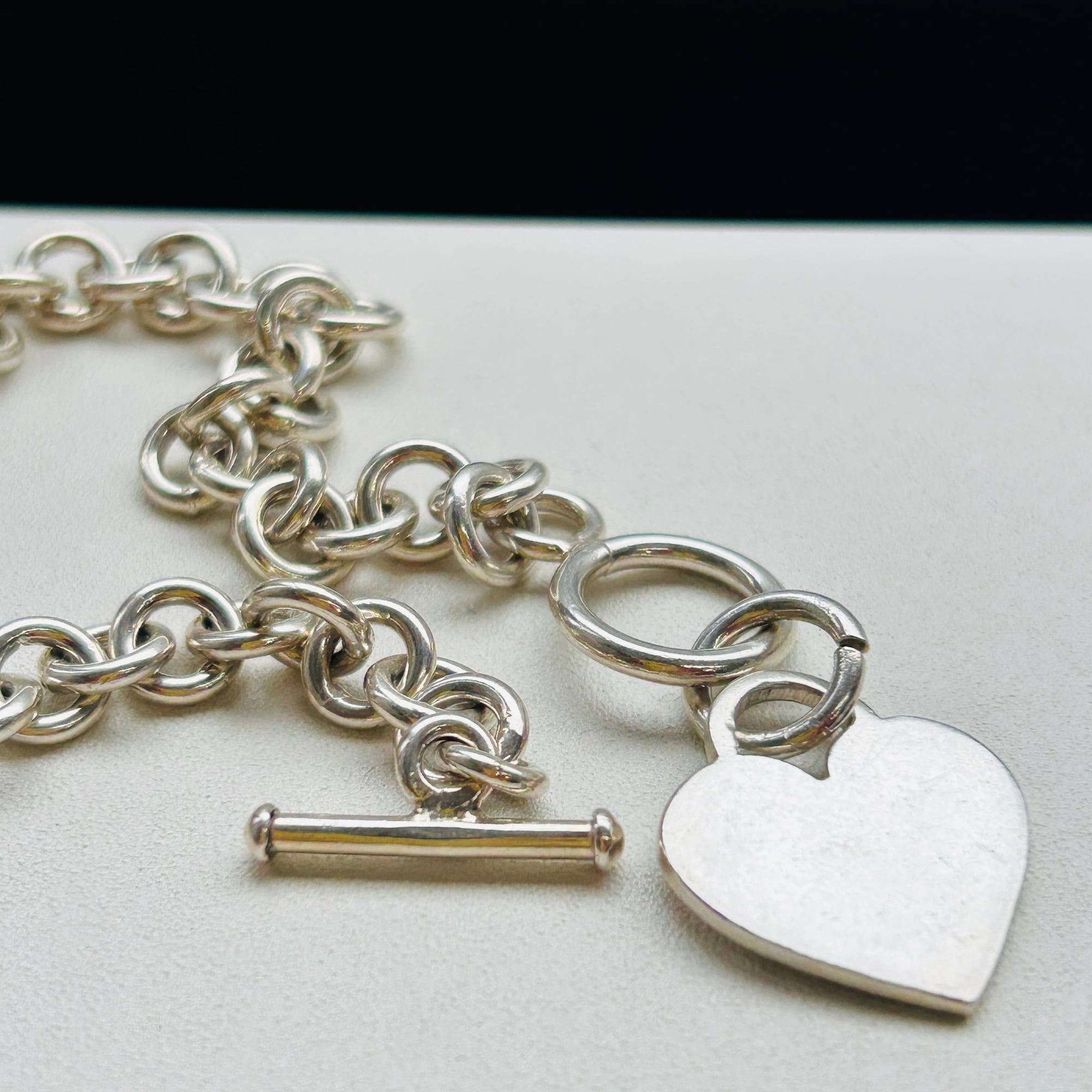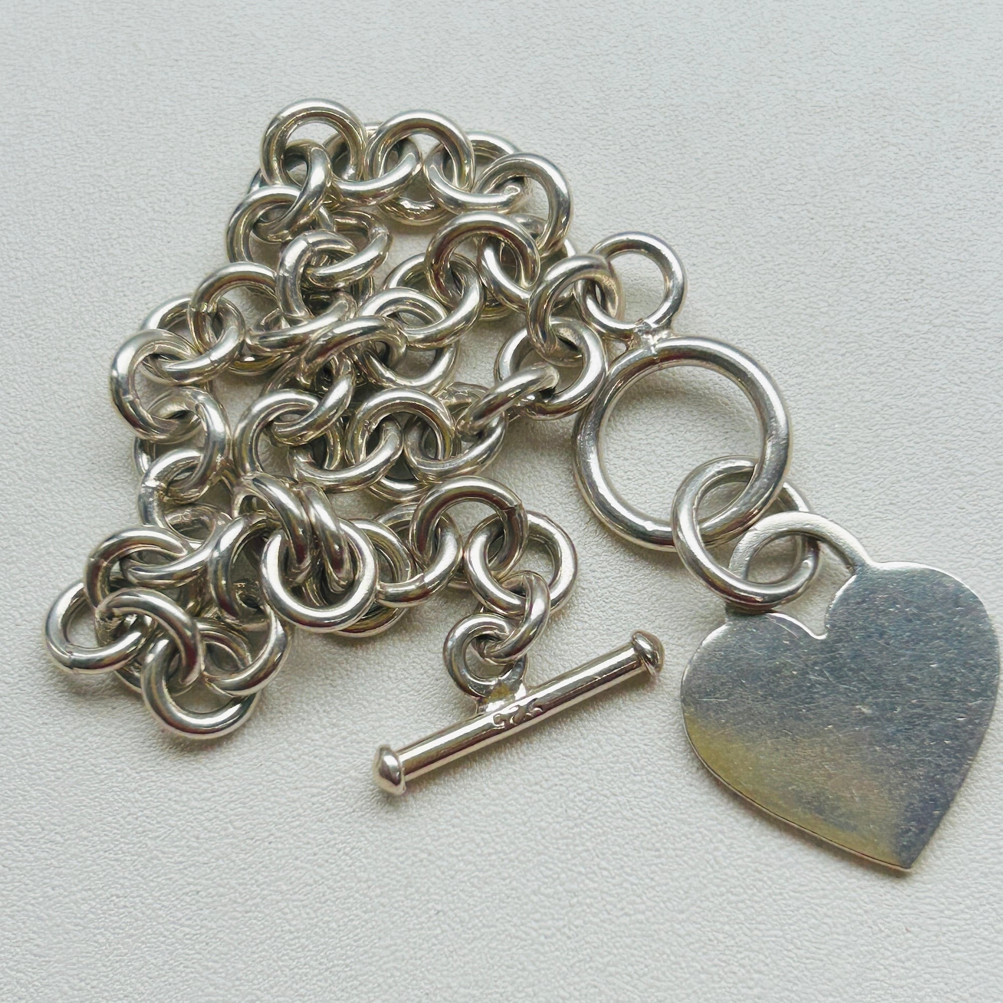 ハートタグとトグル留め具がアクセントのロロチェーンブレスレット。ピカっと輝く明るいシルバーです。類似品2点同時にアップしてますが、こちらはエンドの輪っかにハートタグが付いています。輪っかが太くて大きいのも可愛いです。ハートはペンチで輪を広げルト取り外しできます。ハートタグ全体に薄いスレあり。Tバーに「925」刻印。