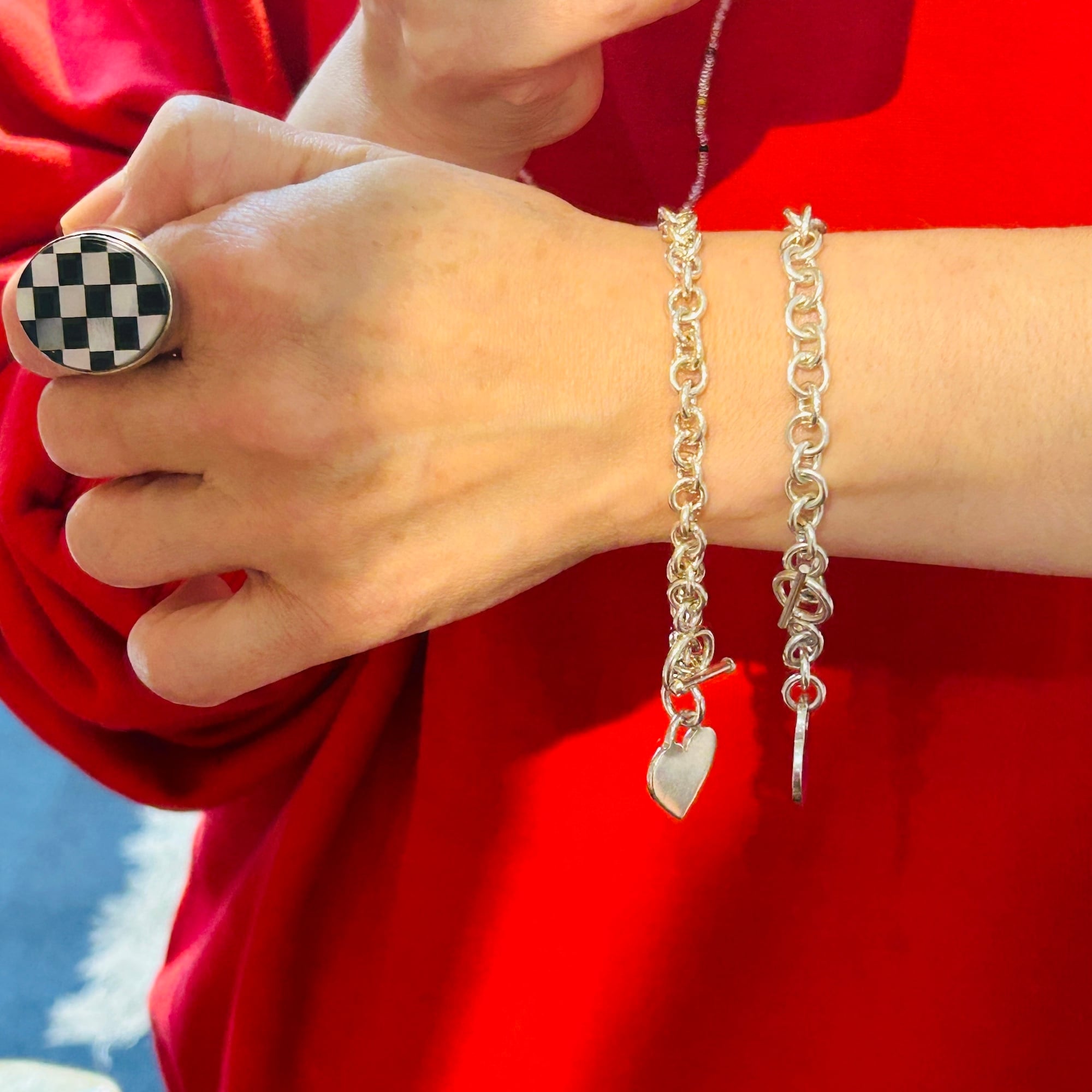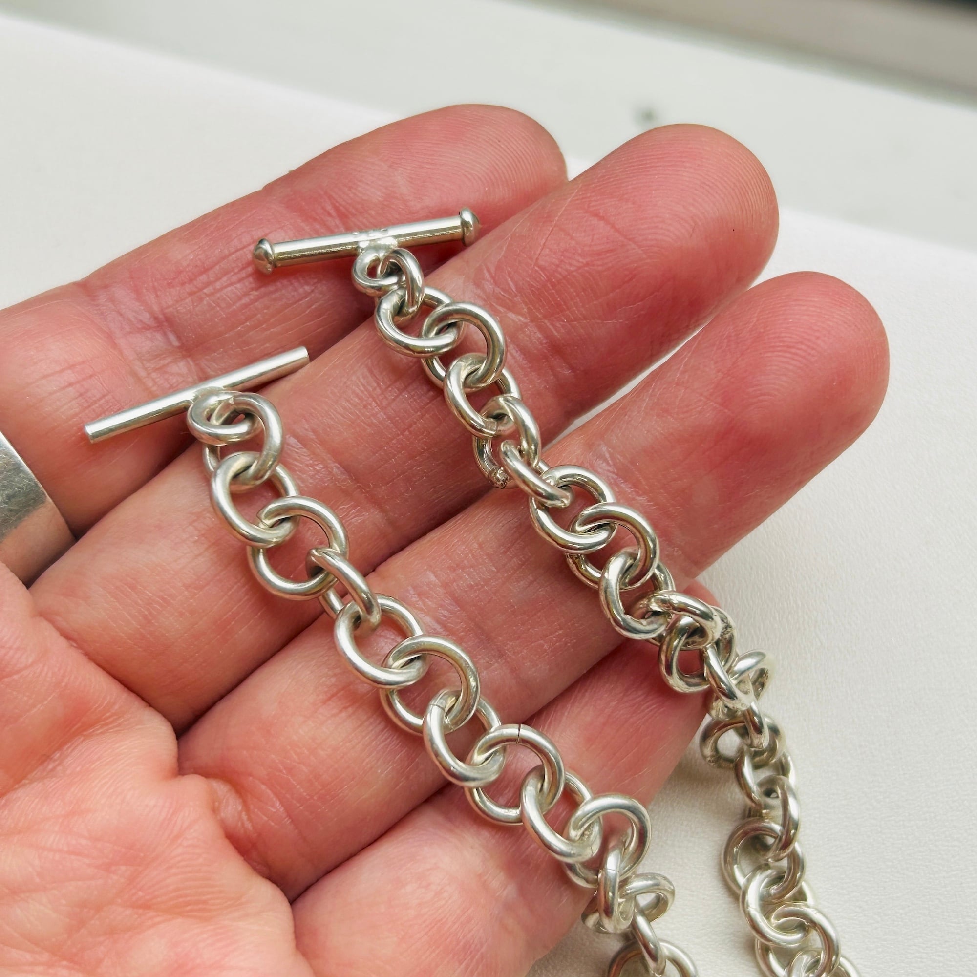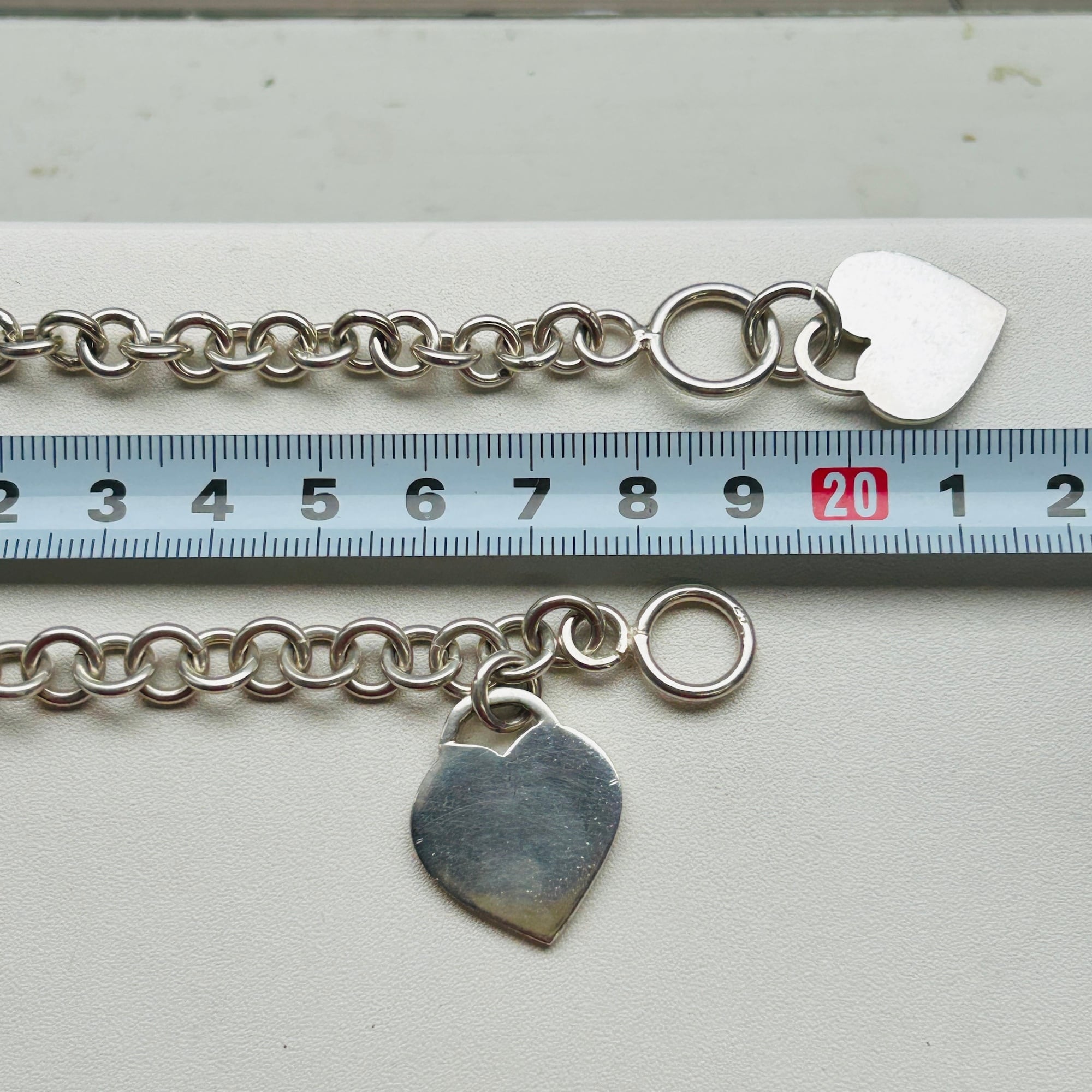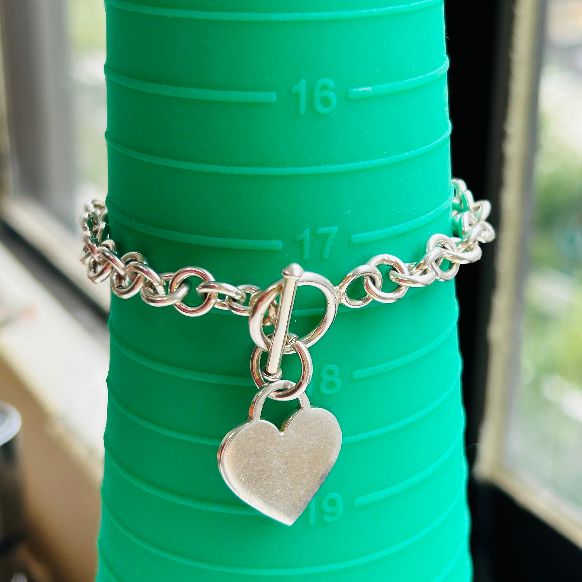 ハートタグとトグル留め具がアクセントのロロチェーンブレスレット。ピカっと輝く明るいシルバーです。類似品2点同時にアップしてますが、こちらはエンドの輪っかにハートタグが付いています。輪っかが太くて大きいのも可愛いです。ハートはペンチで輪を広げルト取り外しできます。ハートタグ全体に薄いスレあり。Tバーに「925」刻印。