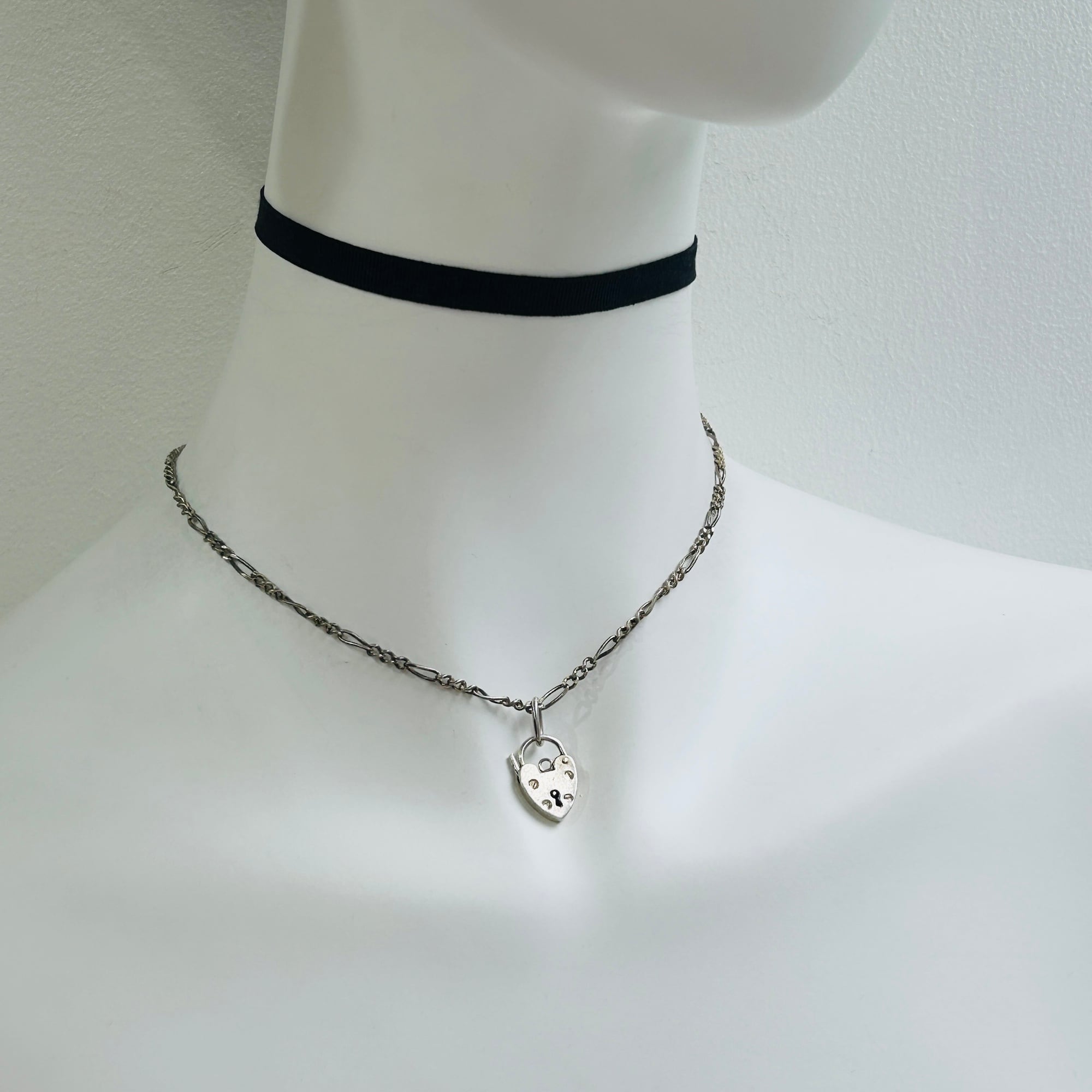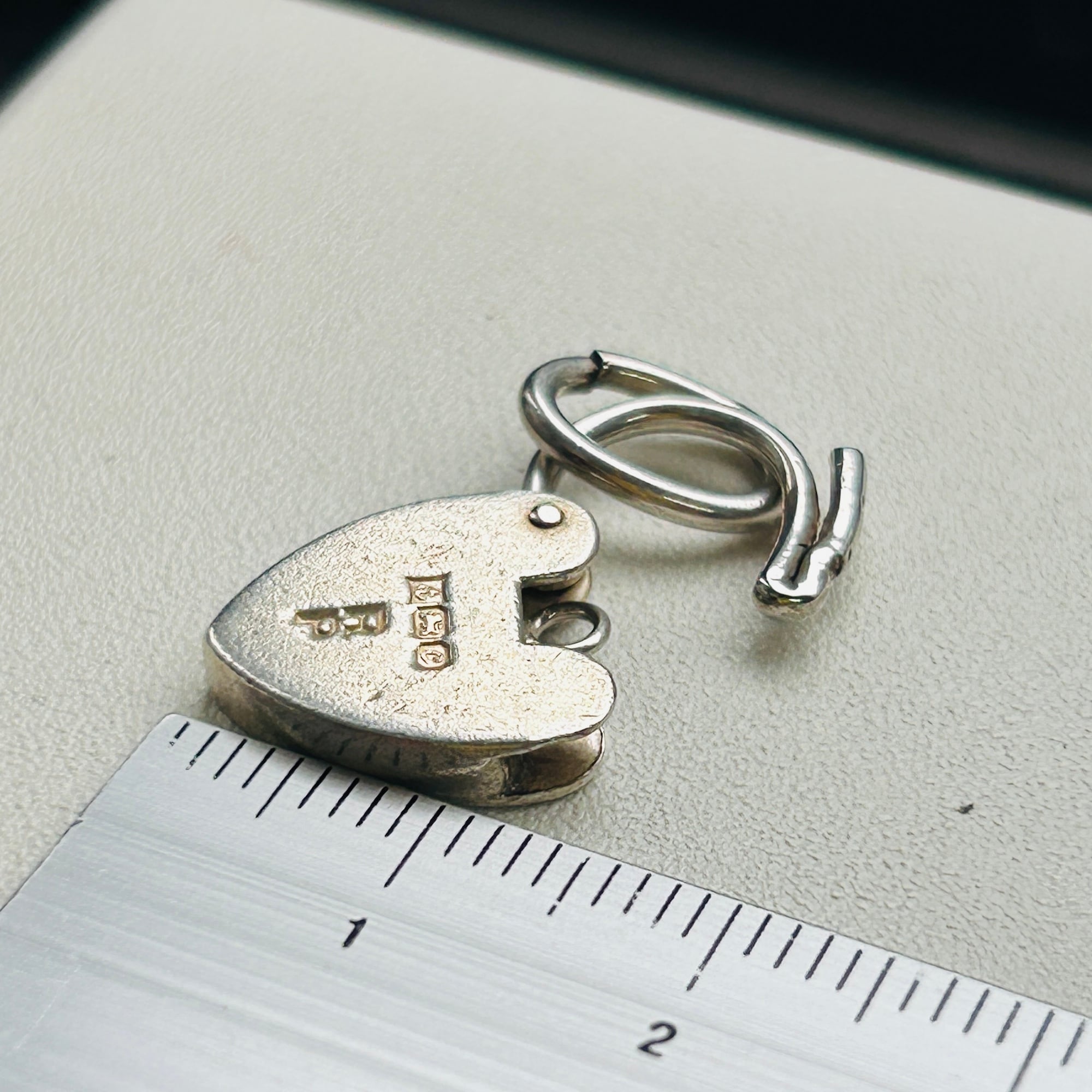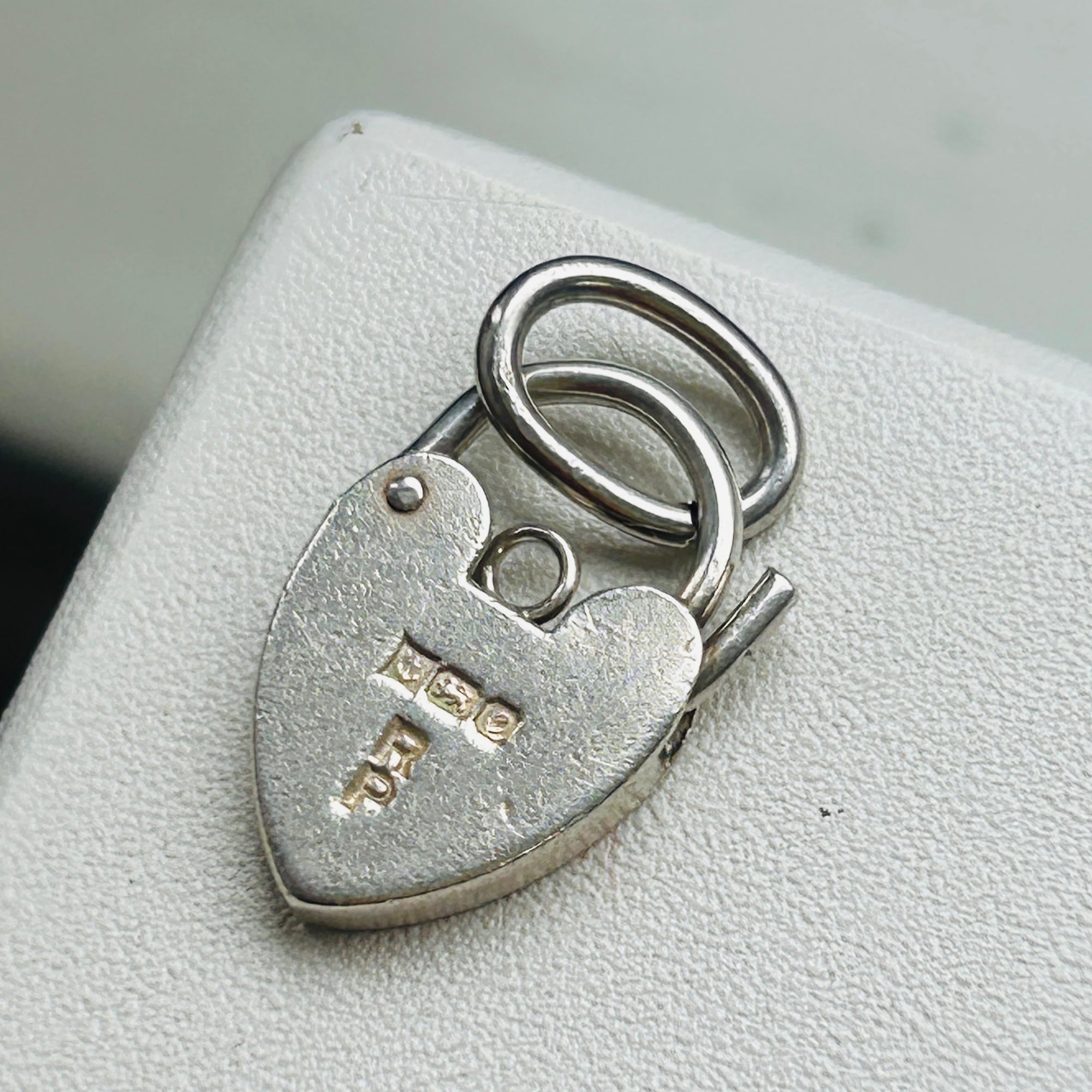 イギリス・スターリングシルバー(シルバー925)ハート型南京錠(heart padlock)を入荷しました。裏の刻印から1977年バーミンガム製。ロック開閉はハート左側の突起を内側に向けて軽く押すと開きます。楕円コマはこちらの在庫、切れ端です。コマにチェーンを通したり、コマを外して直接チェーンに付けたり、色々な使い方ができます:)