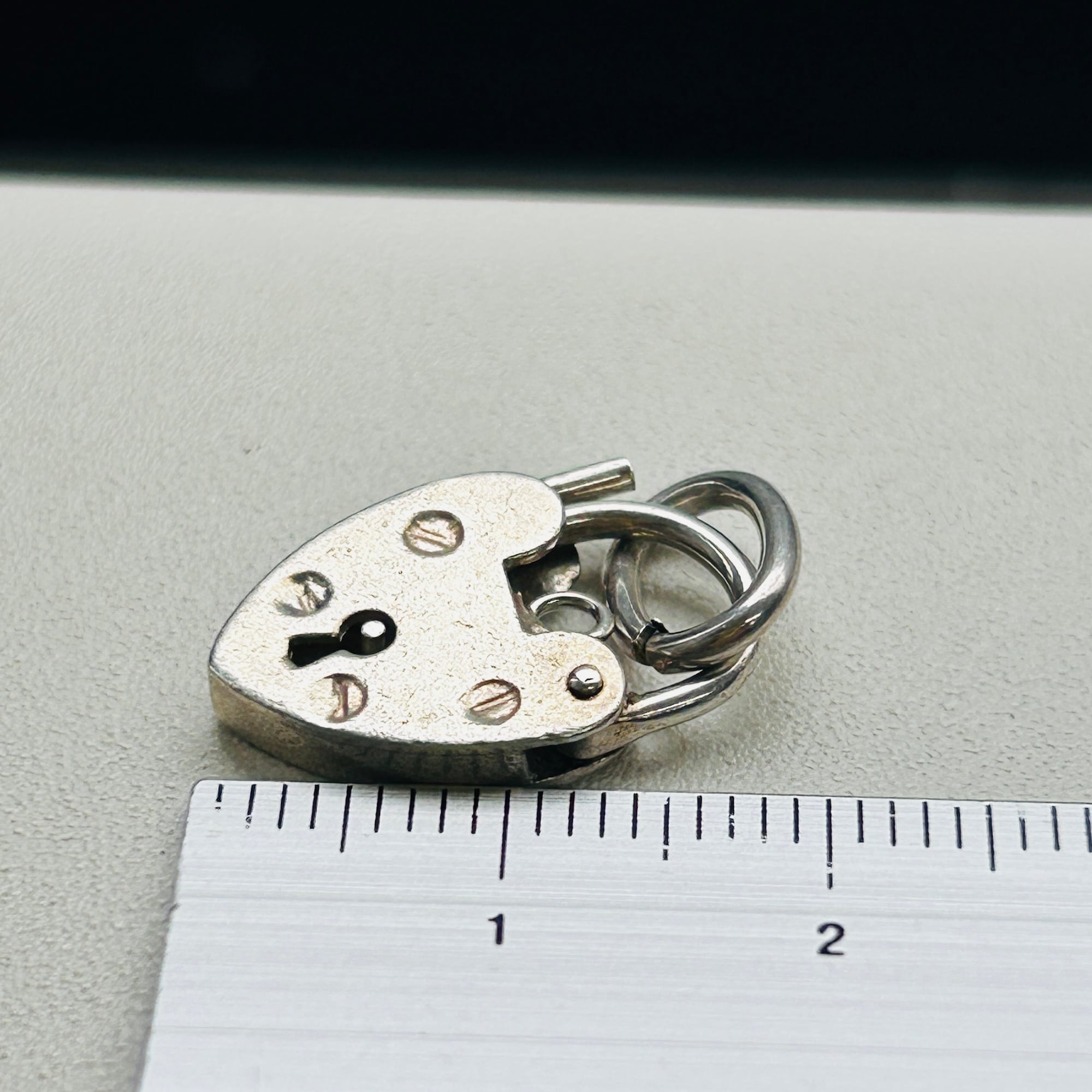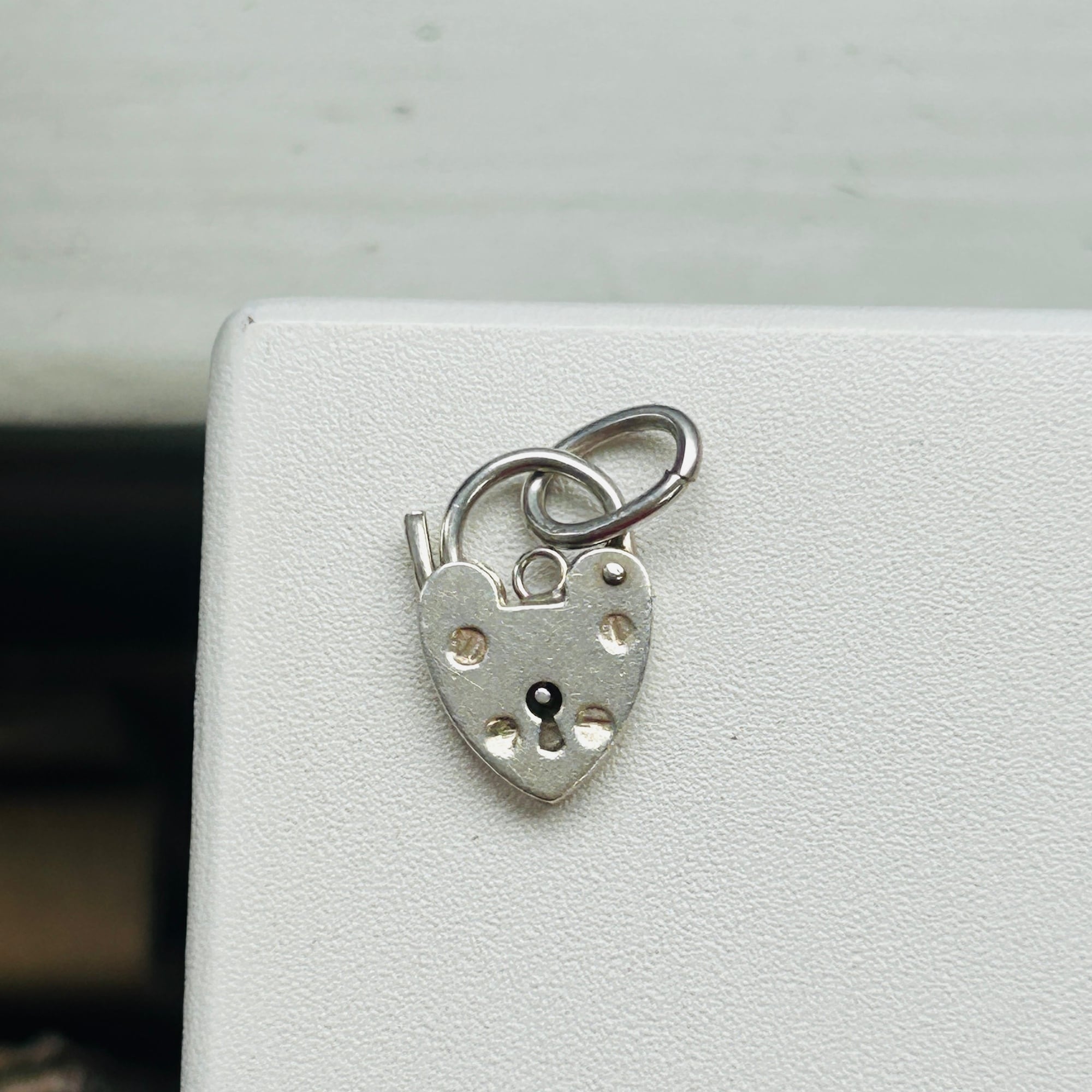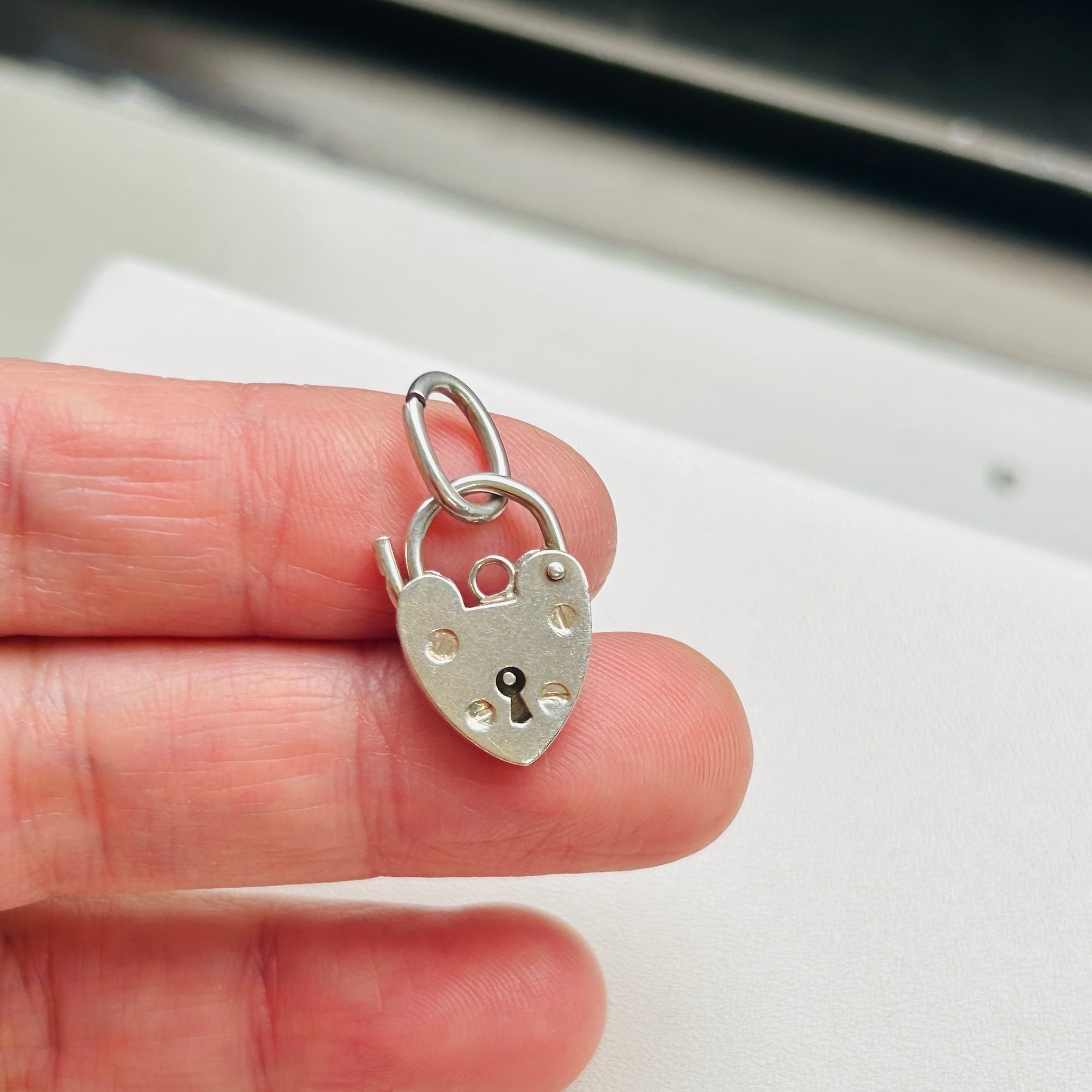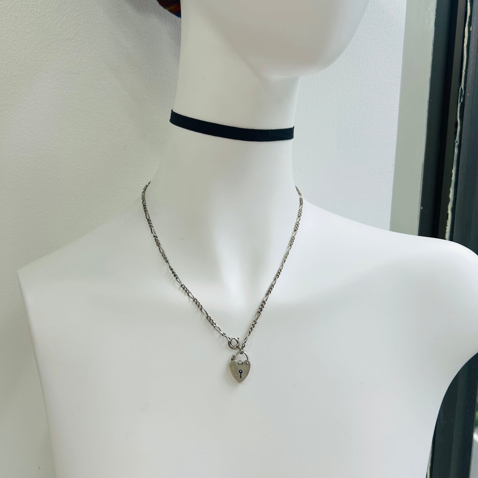 イギリス・スターリングシルバー(シルバー925)ハート型南京錠(heart padlock)を入荷しました。裏の刻印から1977年バーミンガム製。ロック開閉はハート左側の突起を内側に向けて軽く押すと開きます。楕円コマはこちらの在庫、切れ端です。コマにチェーンを通したり、コマを外して直接チェーンに付けたり、色々な使い方ができます:)
