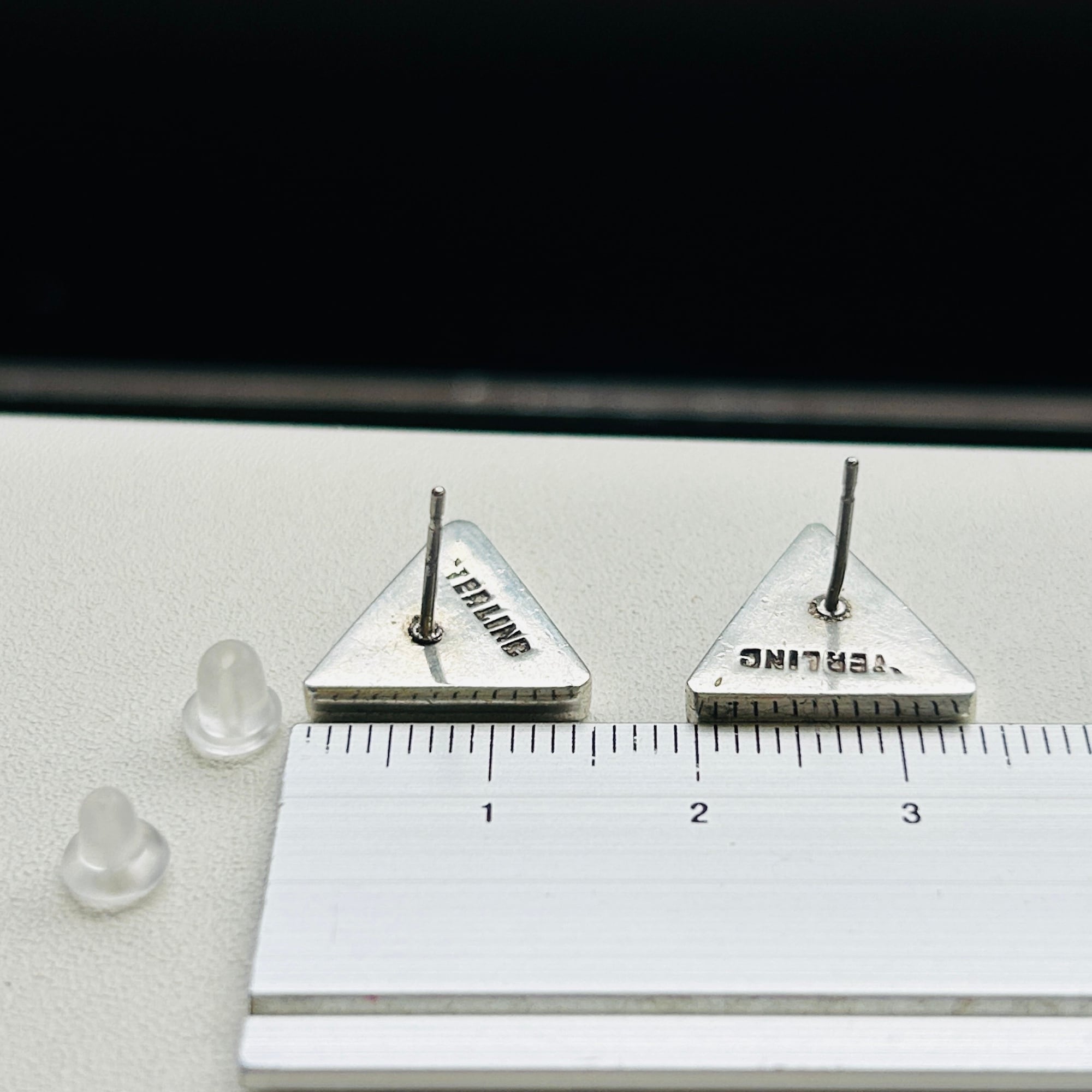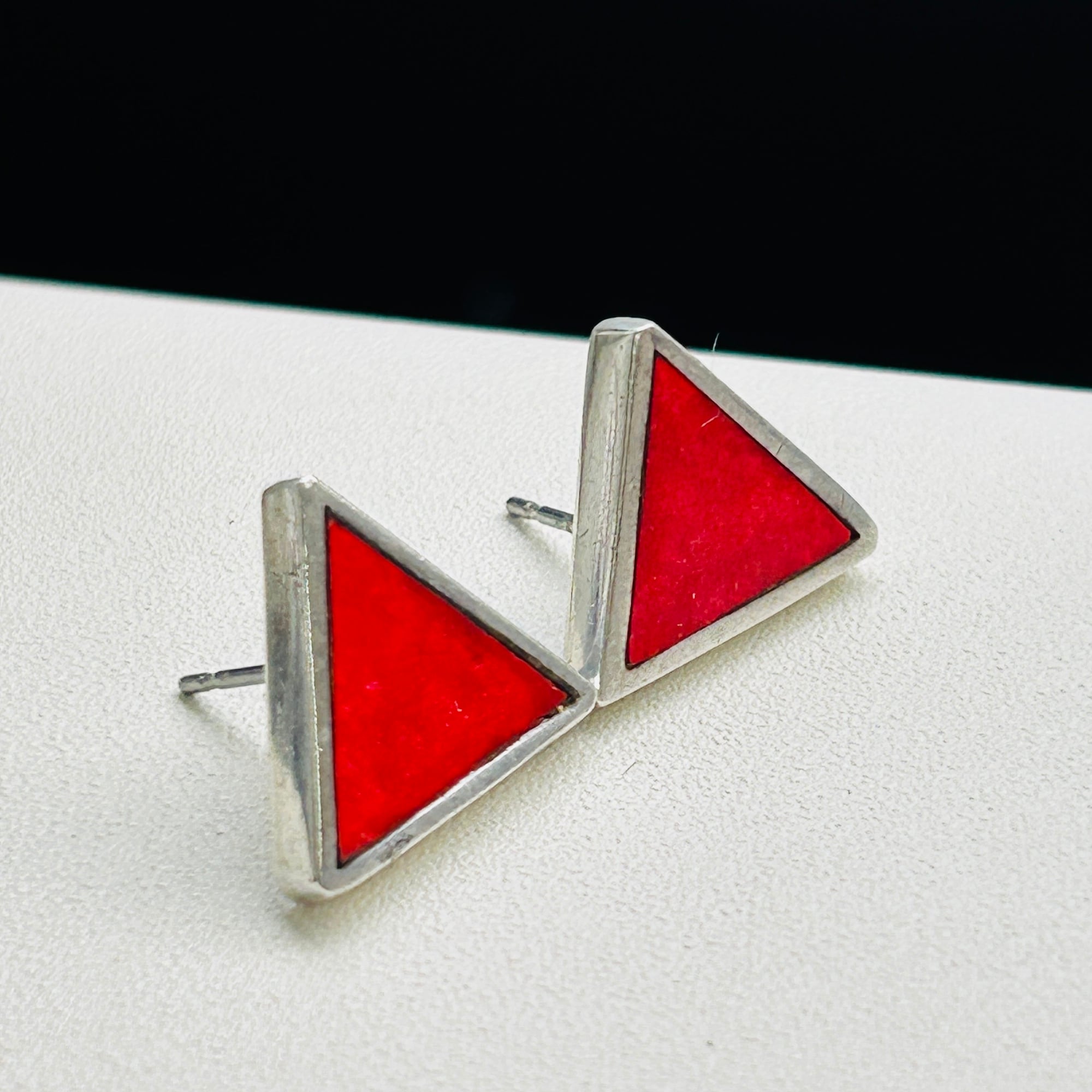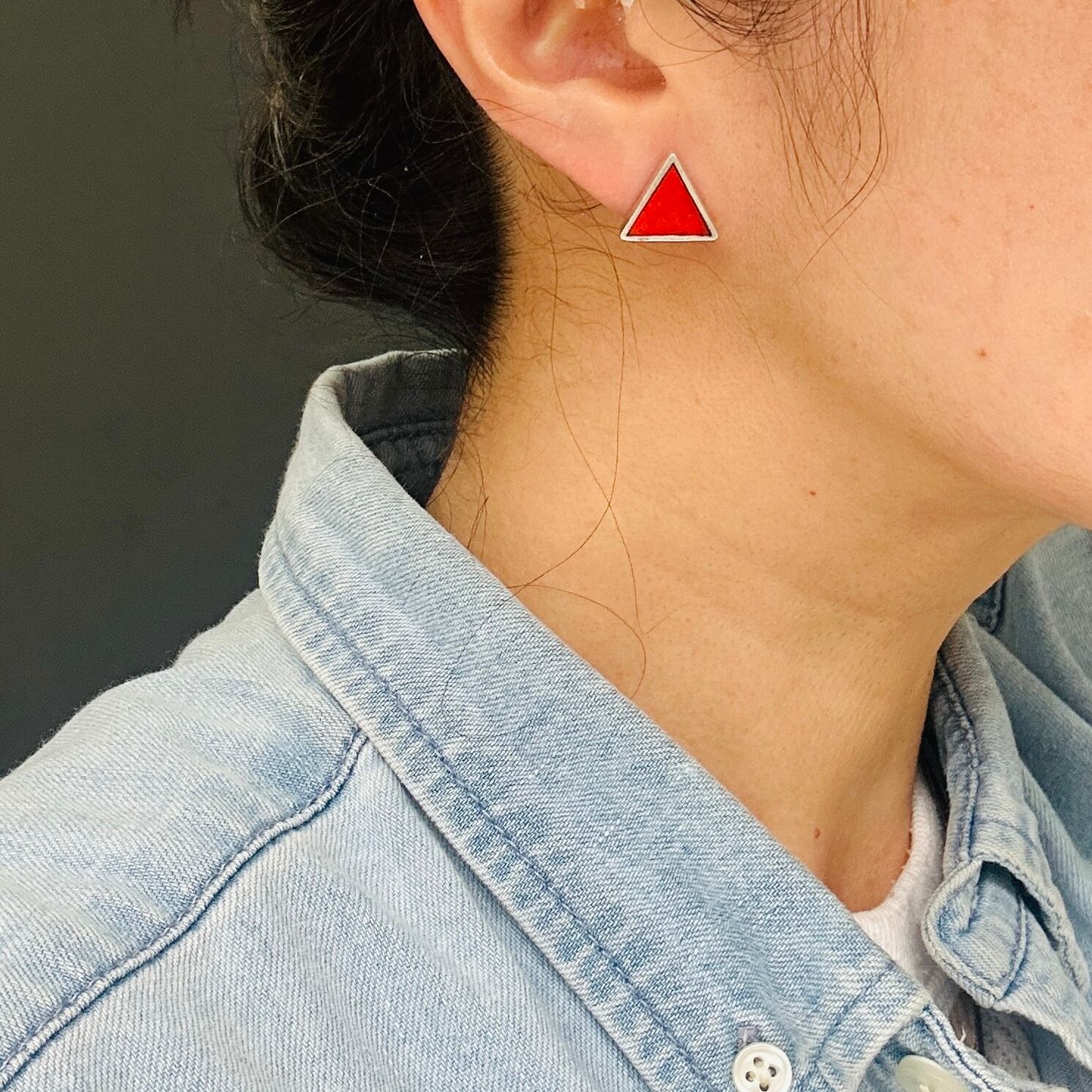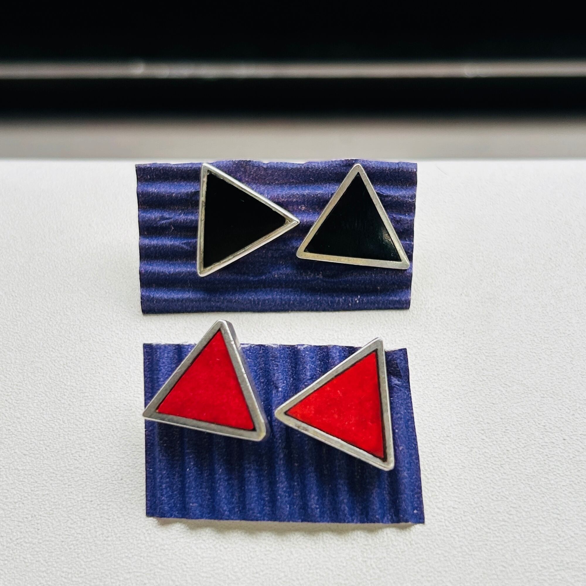 シンプル&キュートな三角ピアス。オニキスと赤いストーンの色違いピアスを各1ペア入荷しました。厚み3mmの三角。着けるとシャープな赤三角がバシっと視線をひくクールなピアスです。写真・手元では赤いストーンが薄暗く黒ずんでいるように見えますが、着けちゃうと気にならない程度です。赤いピアスってあまり見かけないので新鮮だと思います。裏に「STERLING」。キャッチが欠損していますのでシリコンキャッチをお付けしてお届けします。