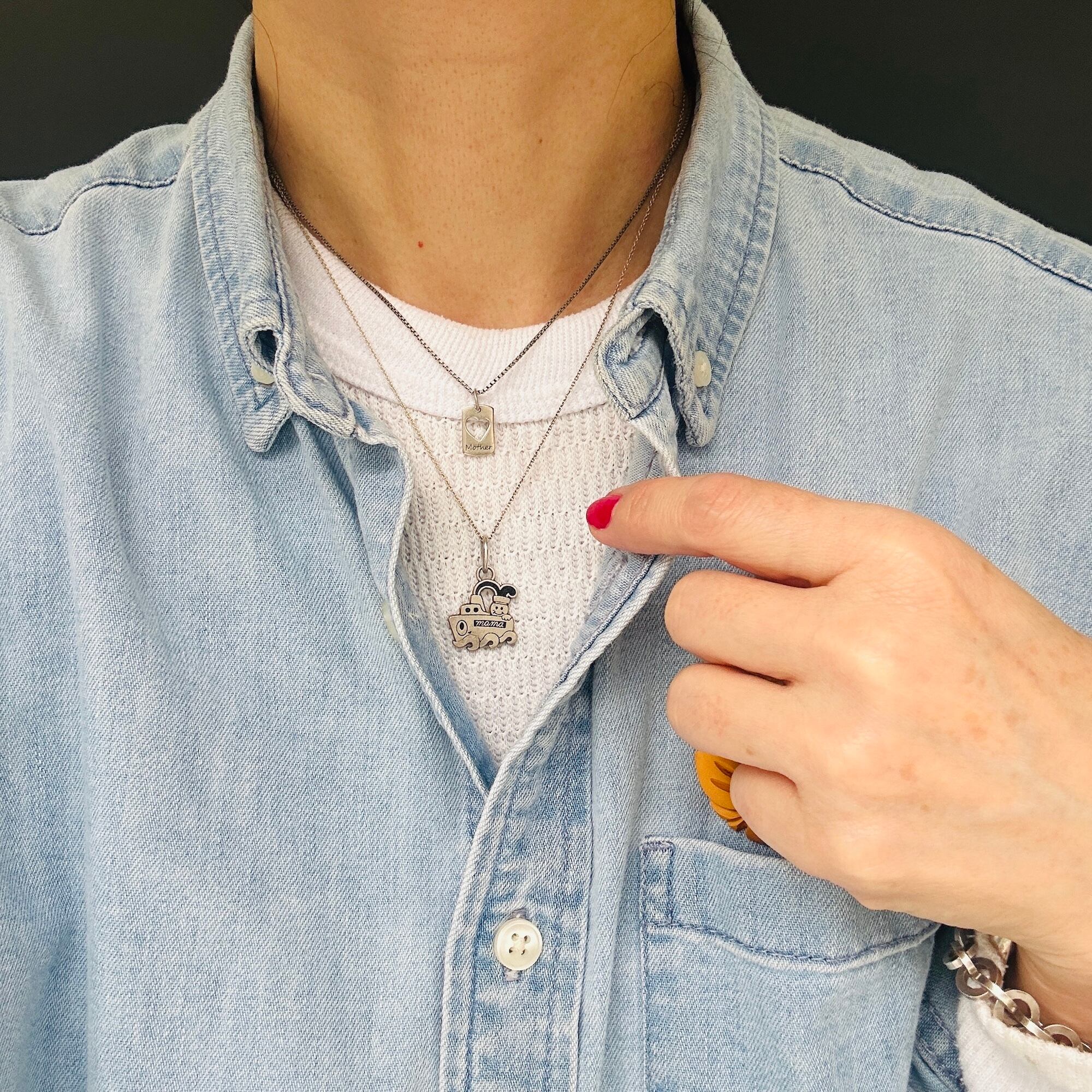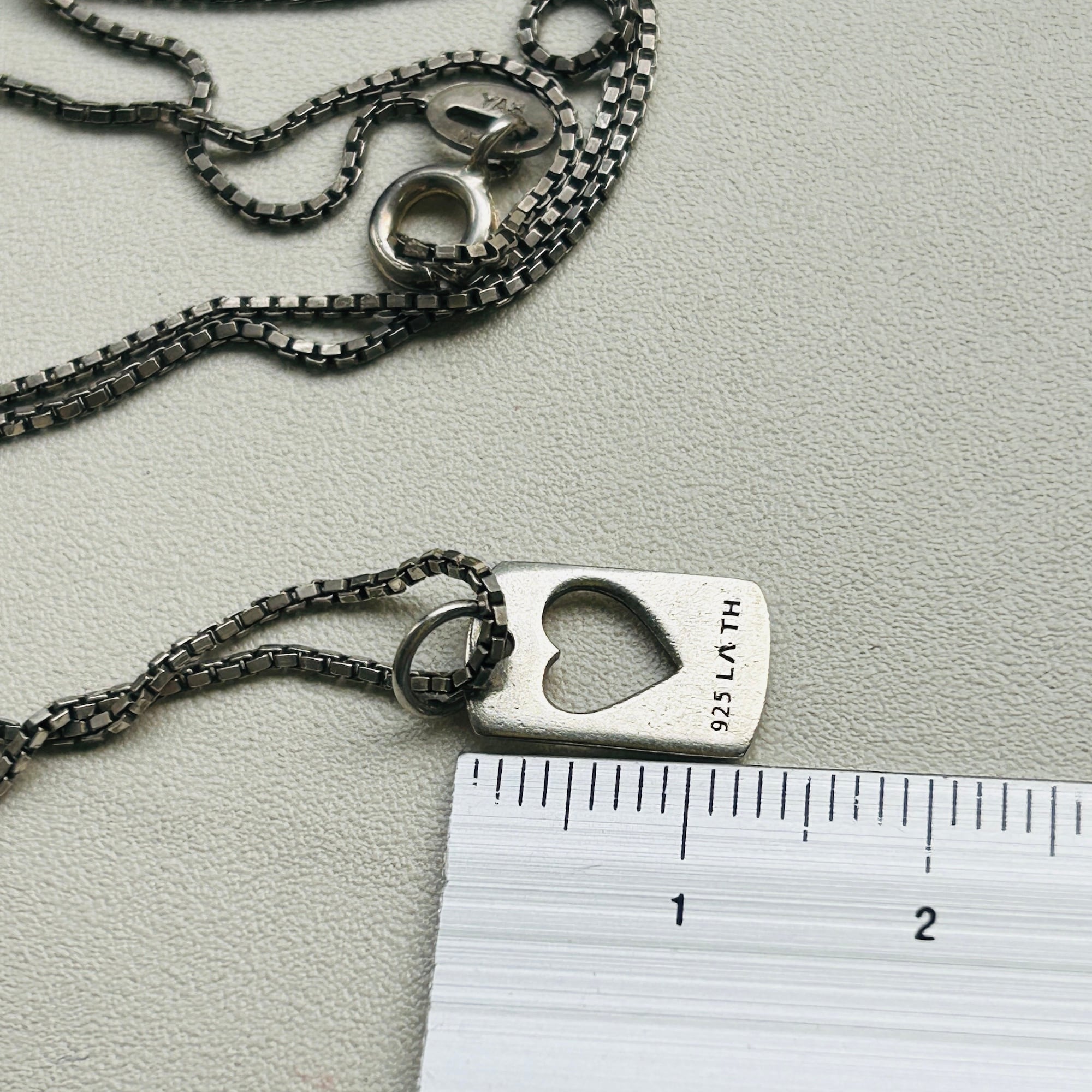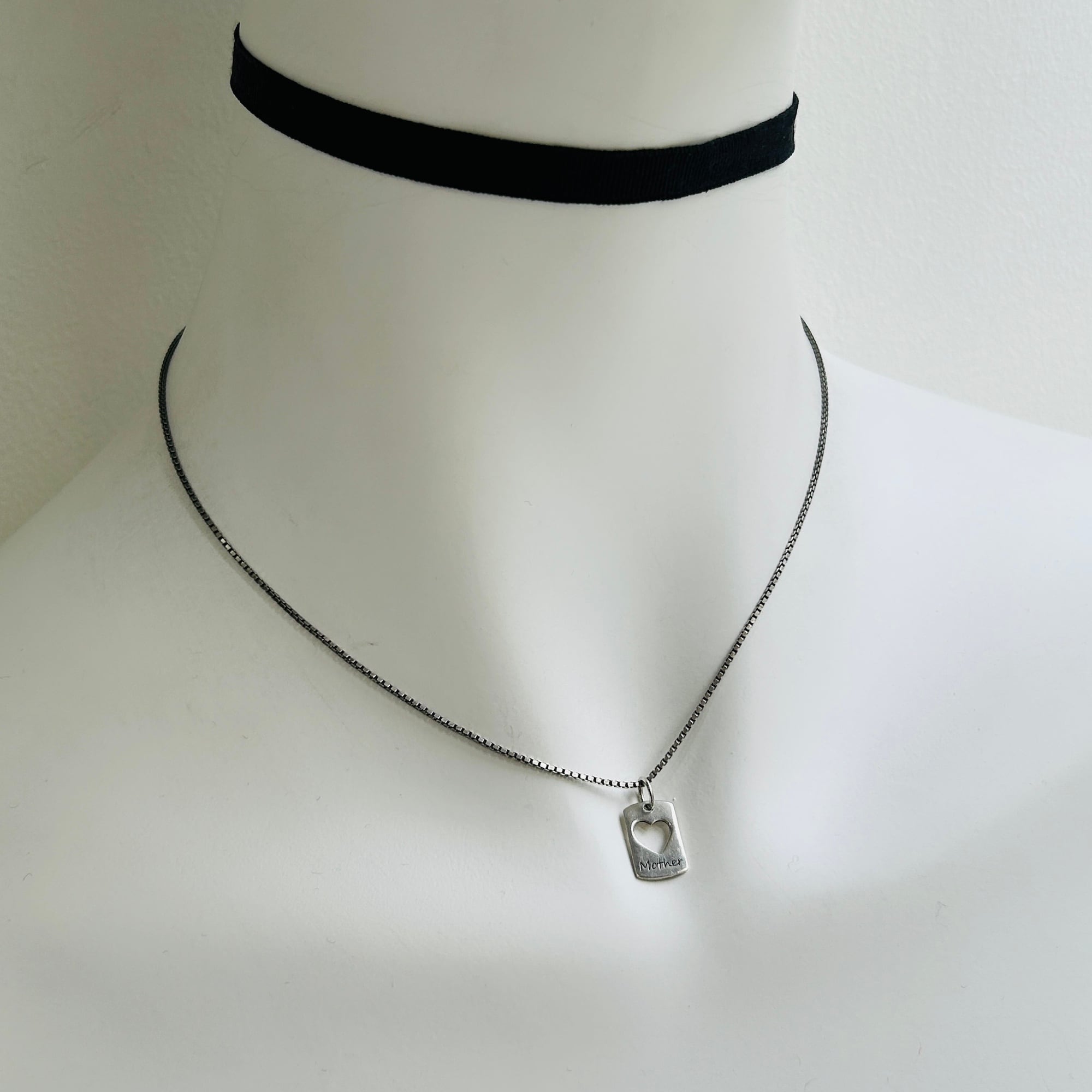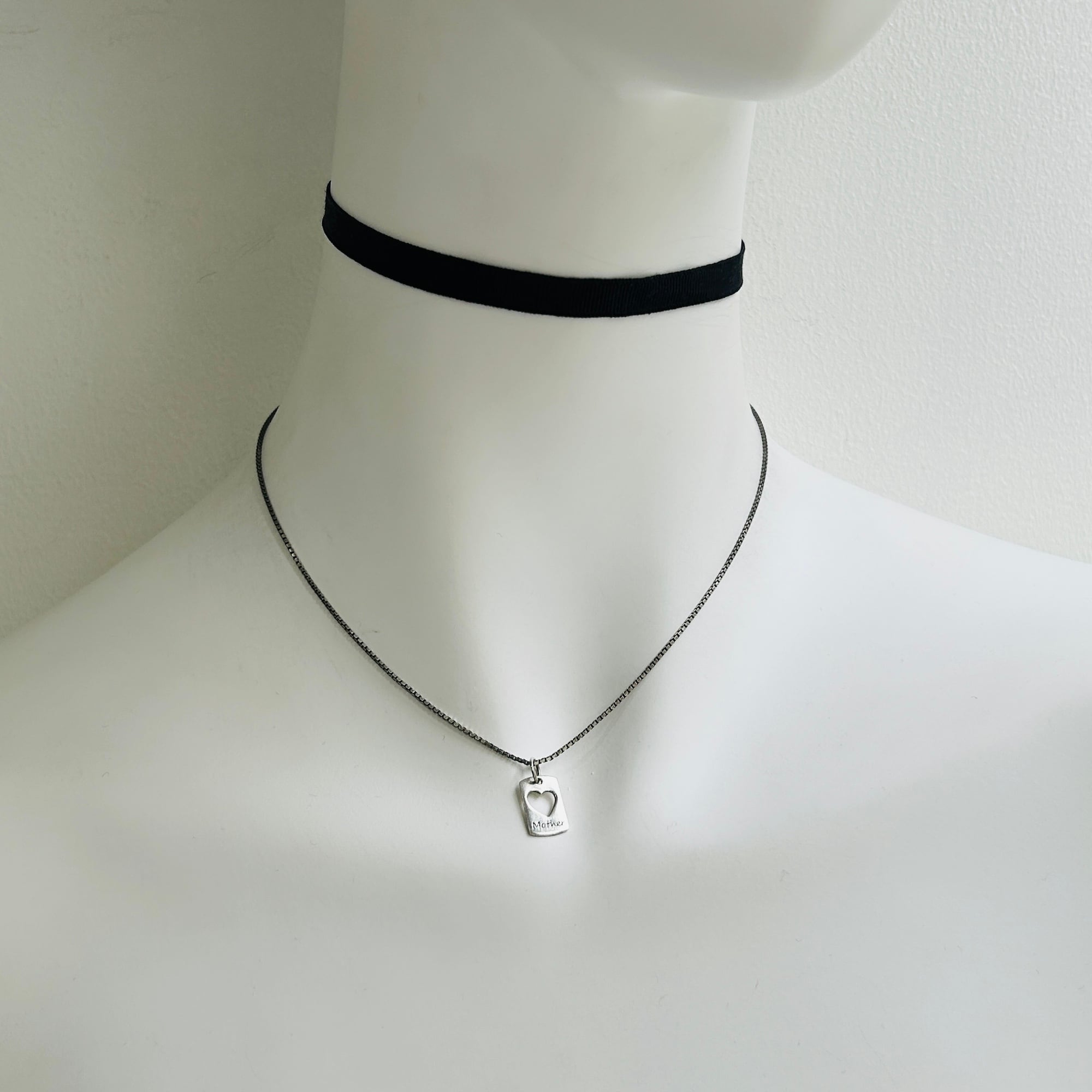 40cmBOXチェーンとクリ抜きハートタグチャームを合わせてネックレスにしました。小さなチャームをジャラジャラ着ける海外っぽい雰囲気がただいまお気に入りです。セミマットなグレーシルバーで大人可愛い雰囲気もGOOD。チェーンに「925」、チャームに「Mother」「925」「LA」。