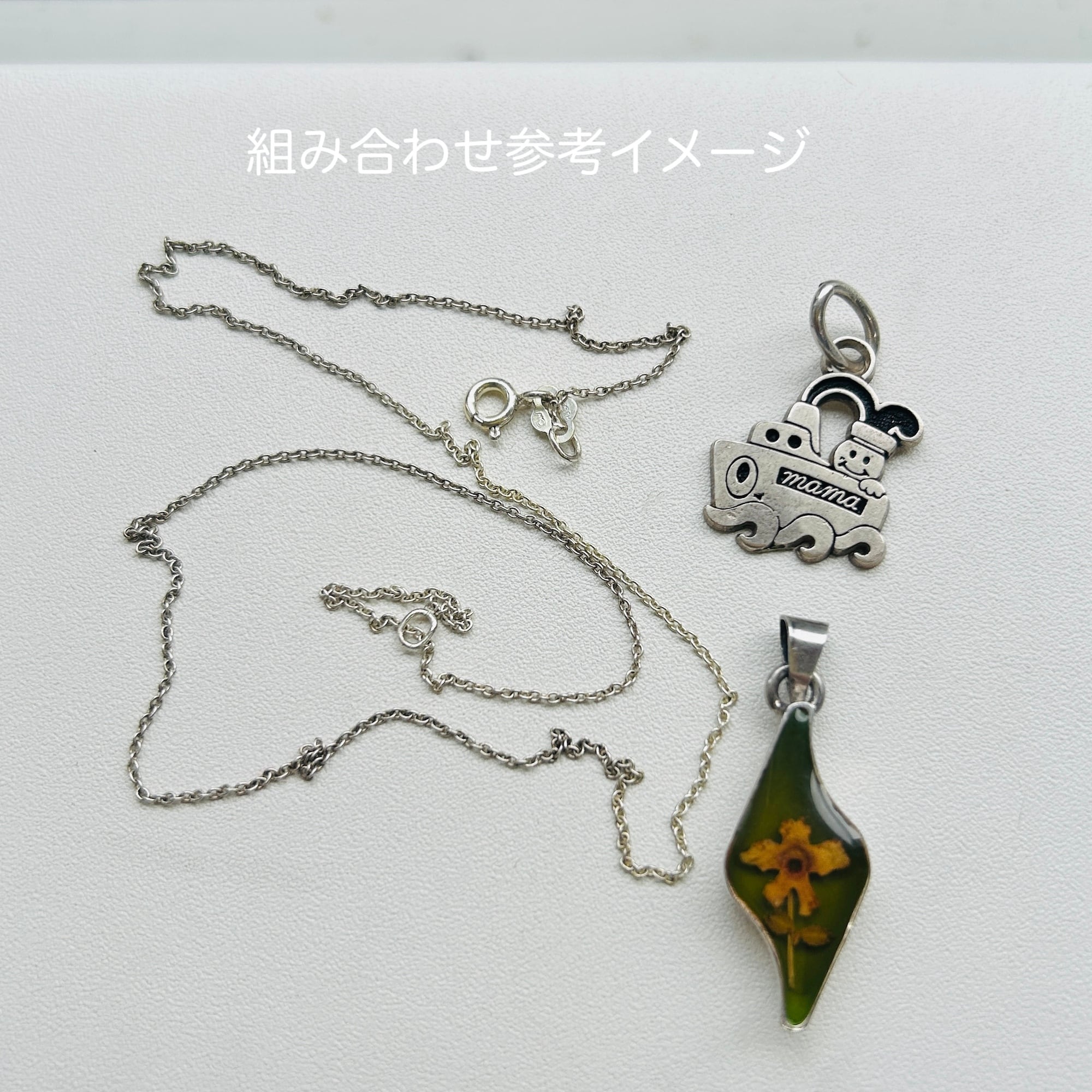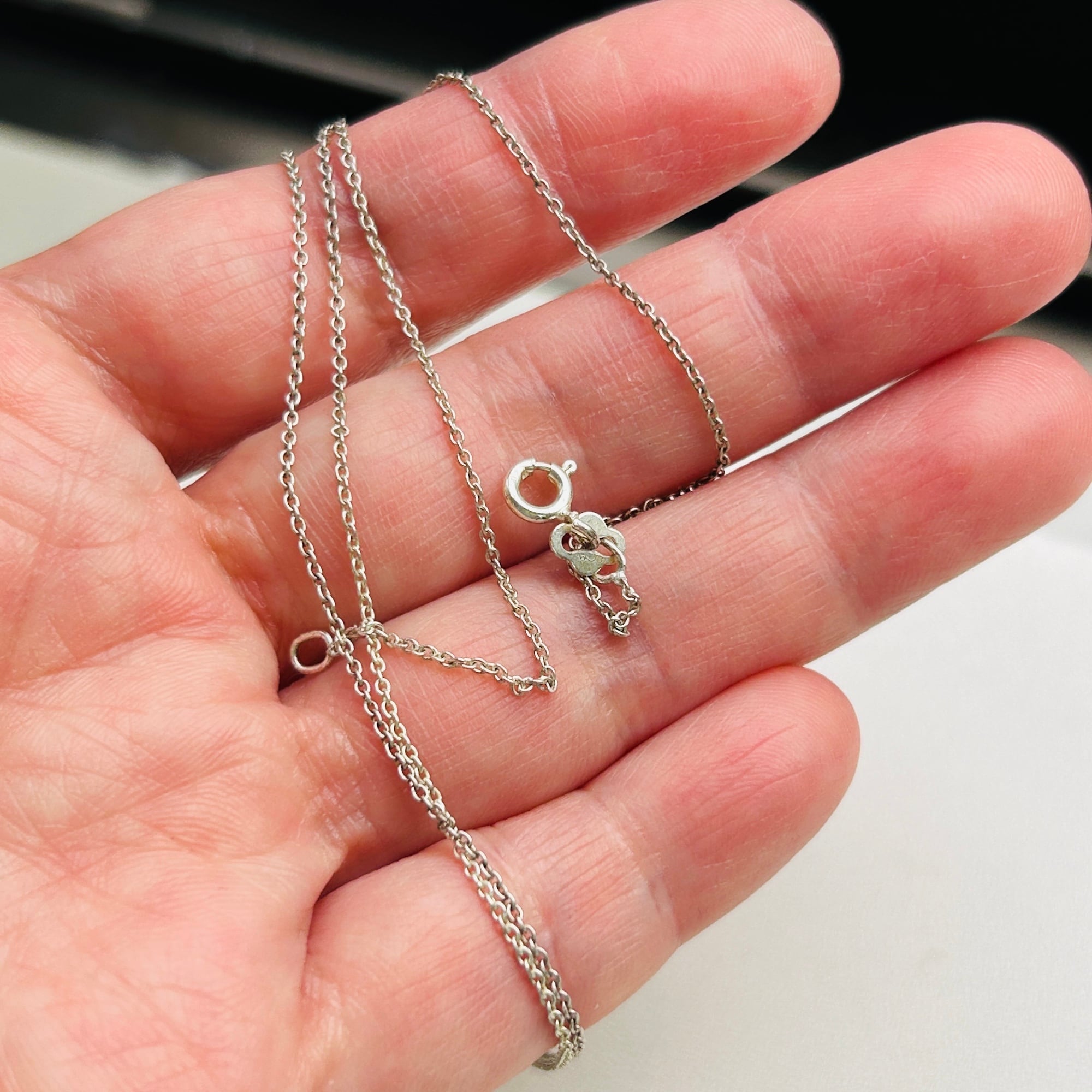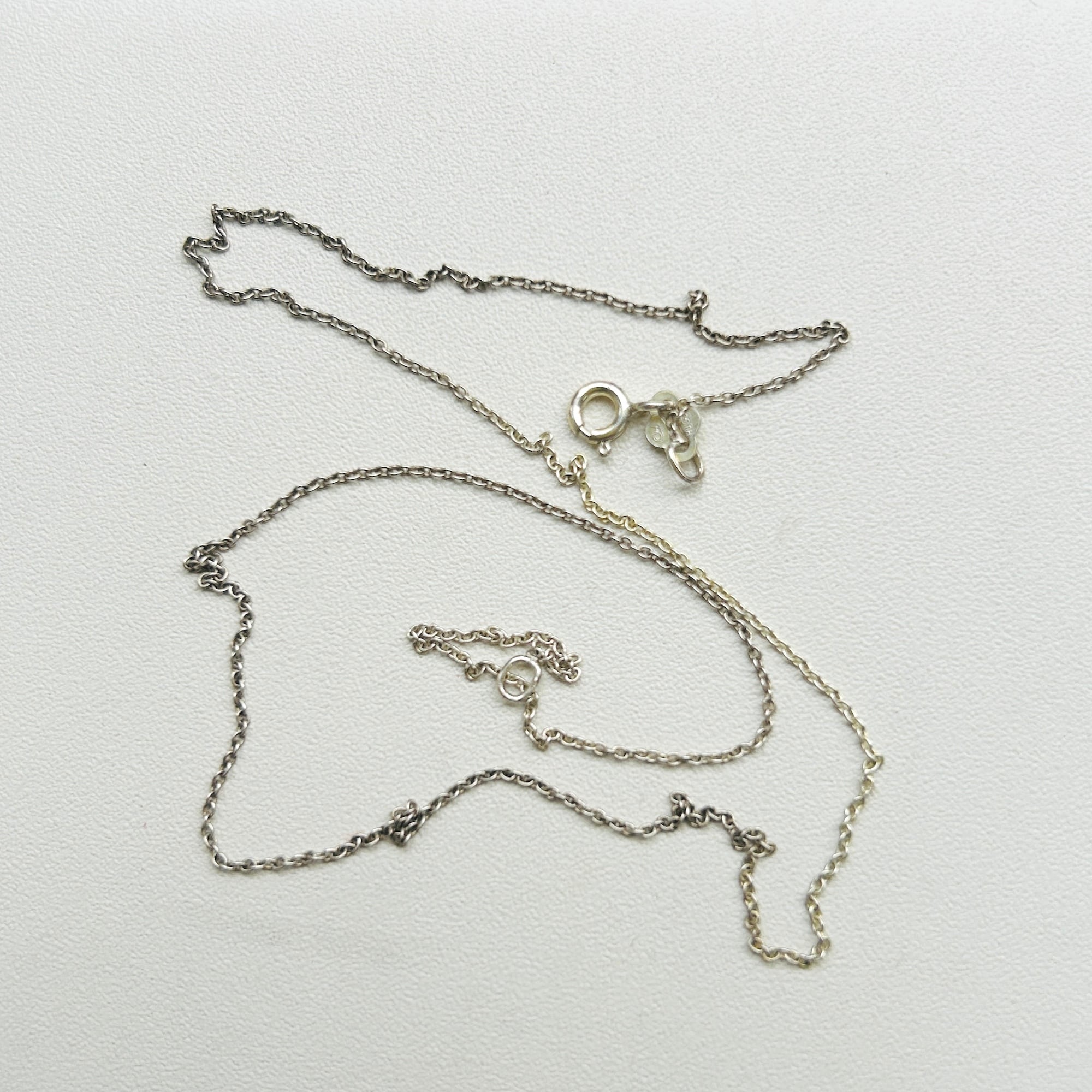 シンプルなアズキチェーン。トップを選ばない使いやすいチェーンです。写真ではチェーンが黒ずんでいる部分とそうでない部分があるように見えます。手元では分からないレベルでしたが写真で色の違いに気づきました。撮影後クリーニングしましたら均一の明るいシルバートーンになりましたのでご心配不要です。扱いやすい留め具で使いやすいです。「925」刻印。