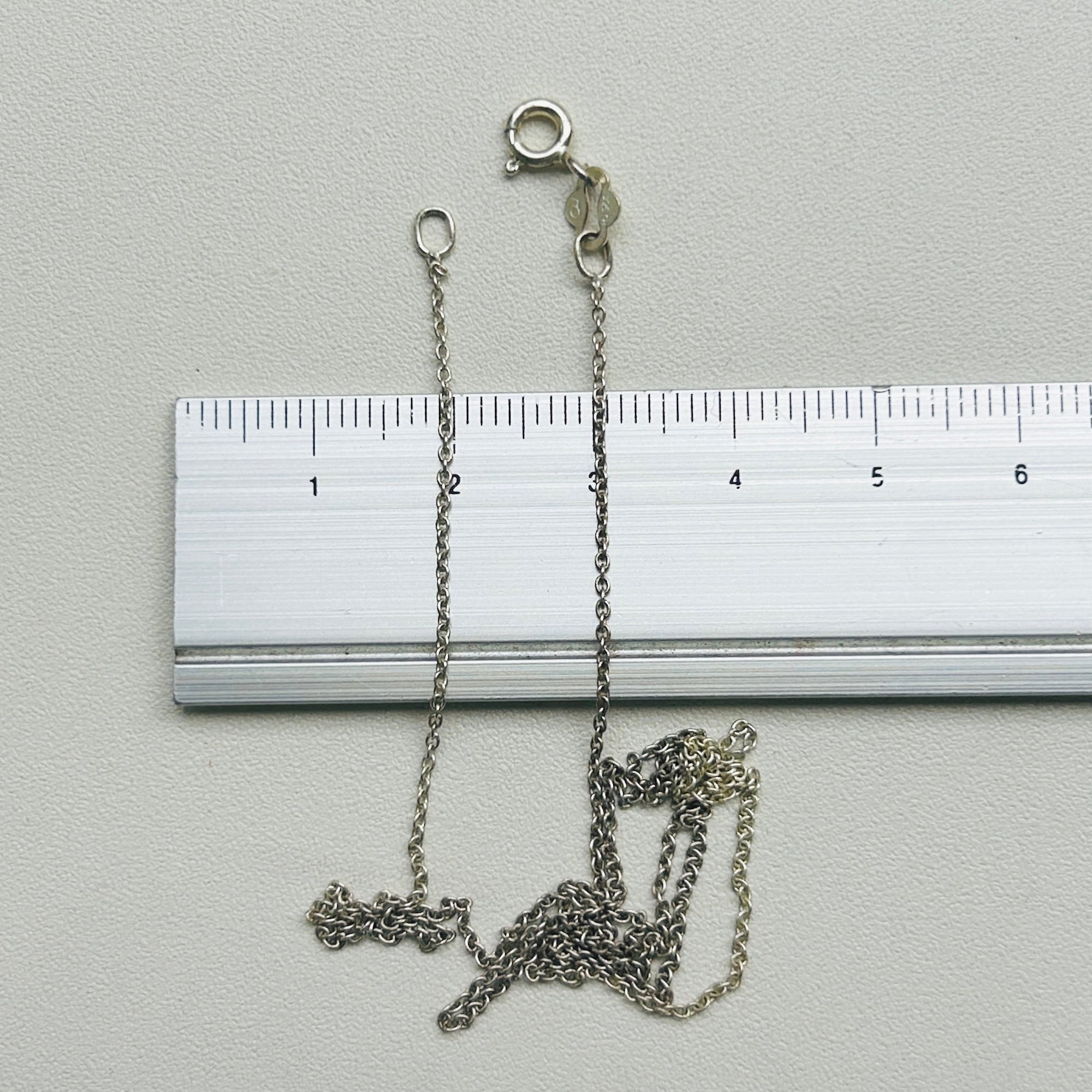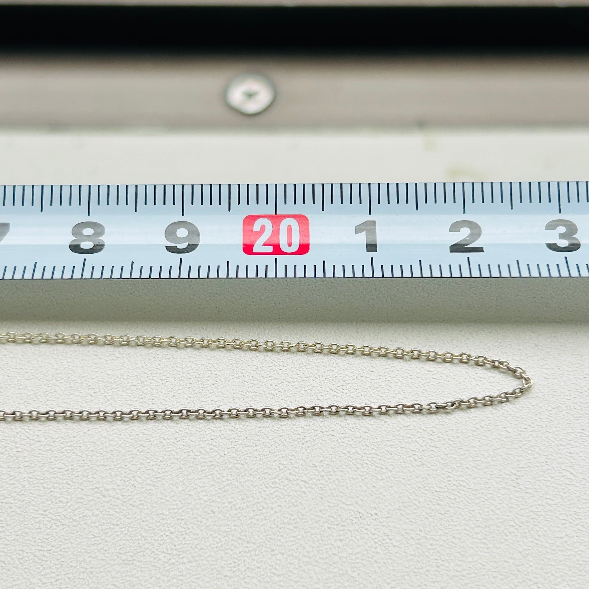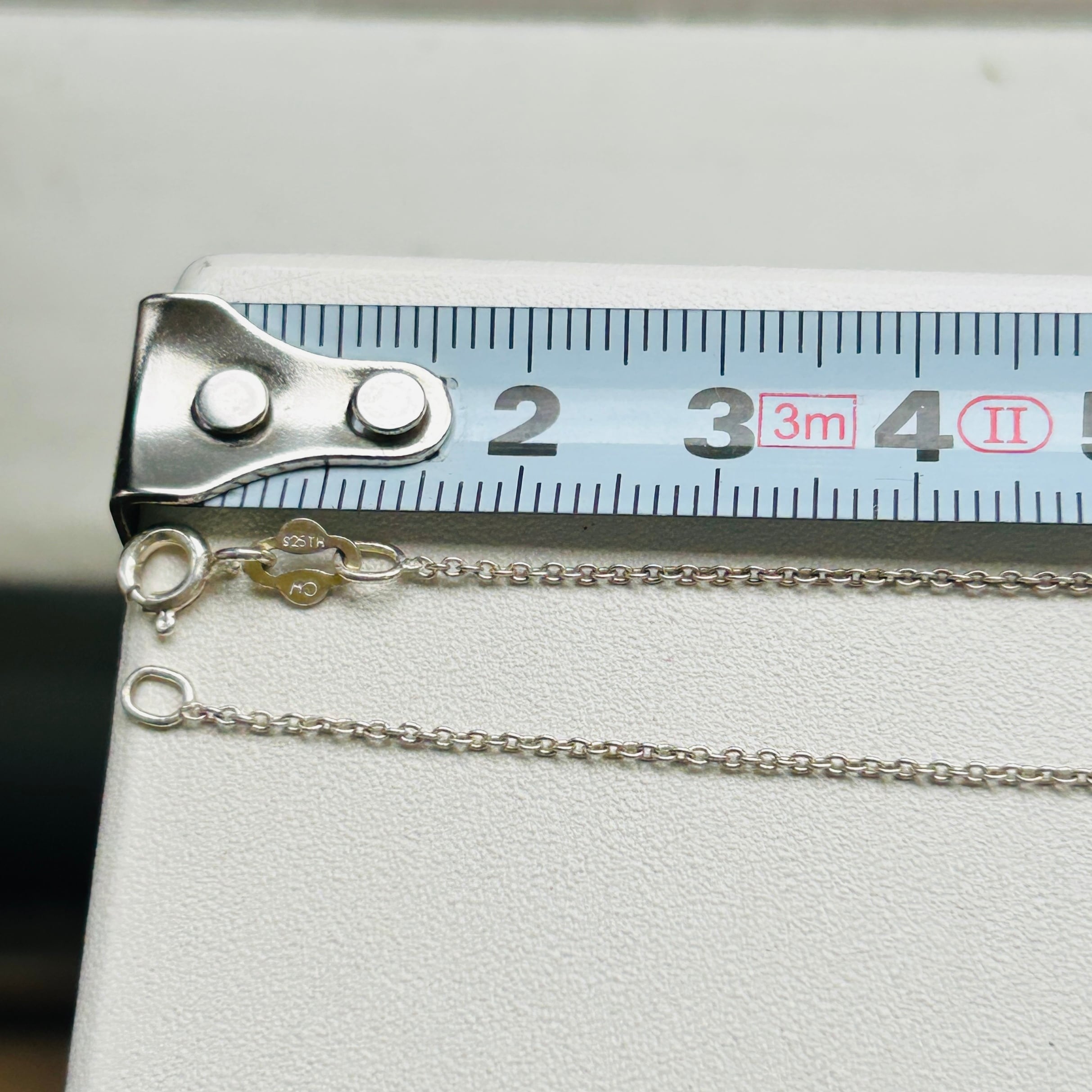 シンプルなアズキチェーン。トップを選ばない使いやすいチェーンです。写真ではチェーンが黒ずんでいる部分とそうでない部分があるように見えます。手元では分からないレベルでしたが写真で色の違いに気づきました。撮影後クリーニングしましたら均一の明るいシルバートーンになりましたのでご心配不要です。扱いやすい留め具で使いやすいです。「925」刻印。