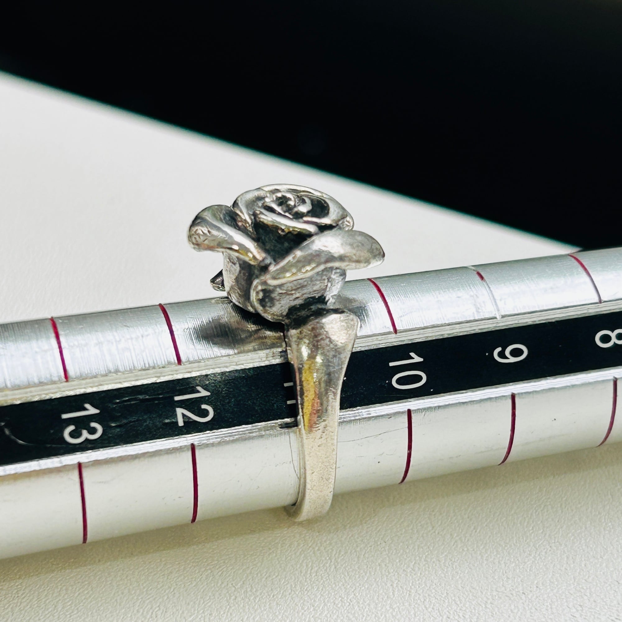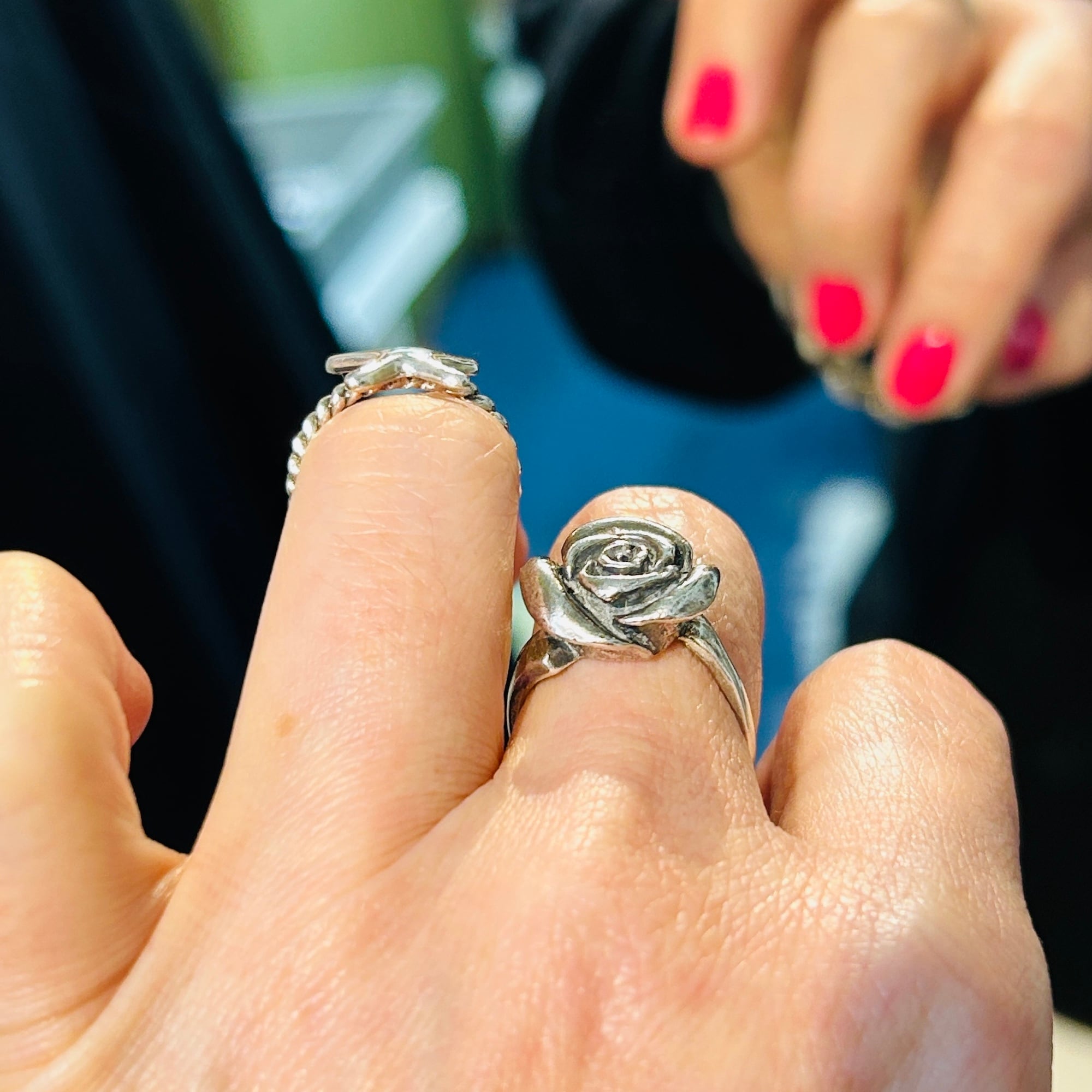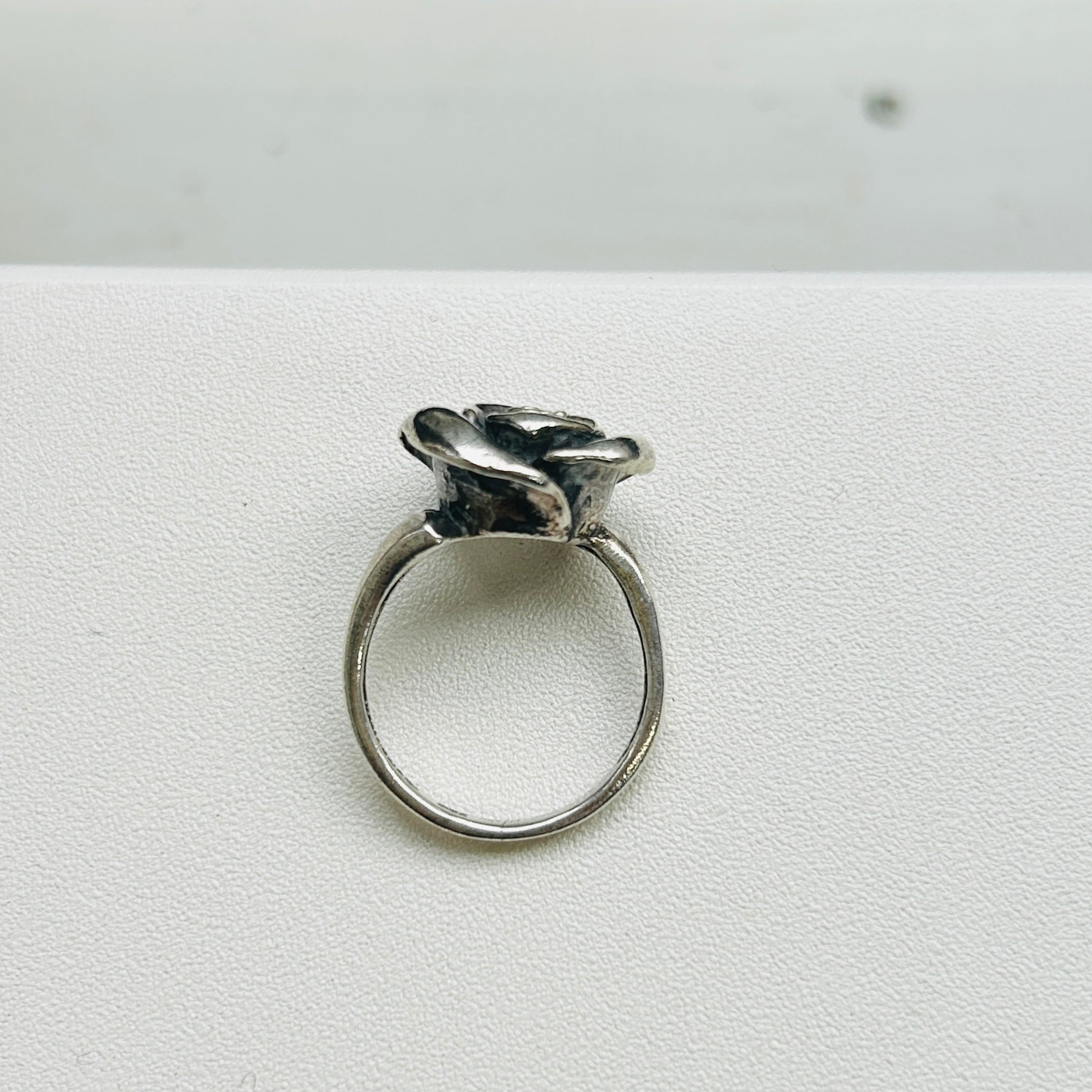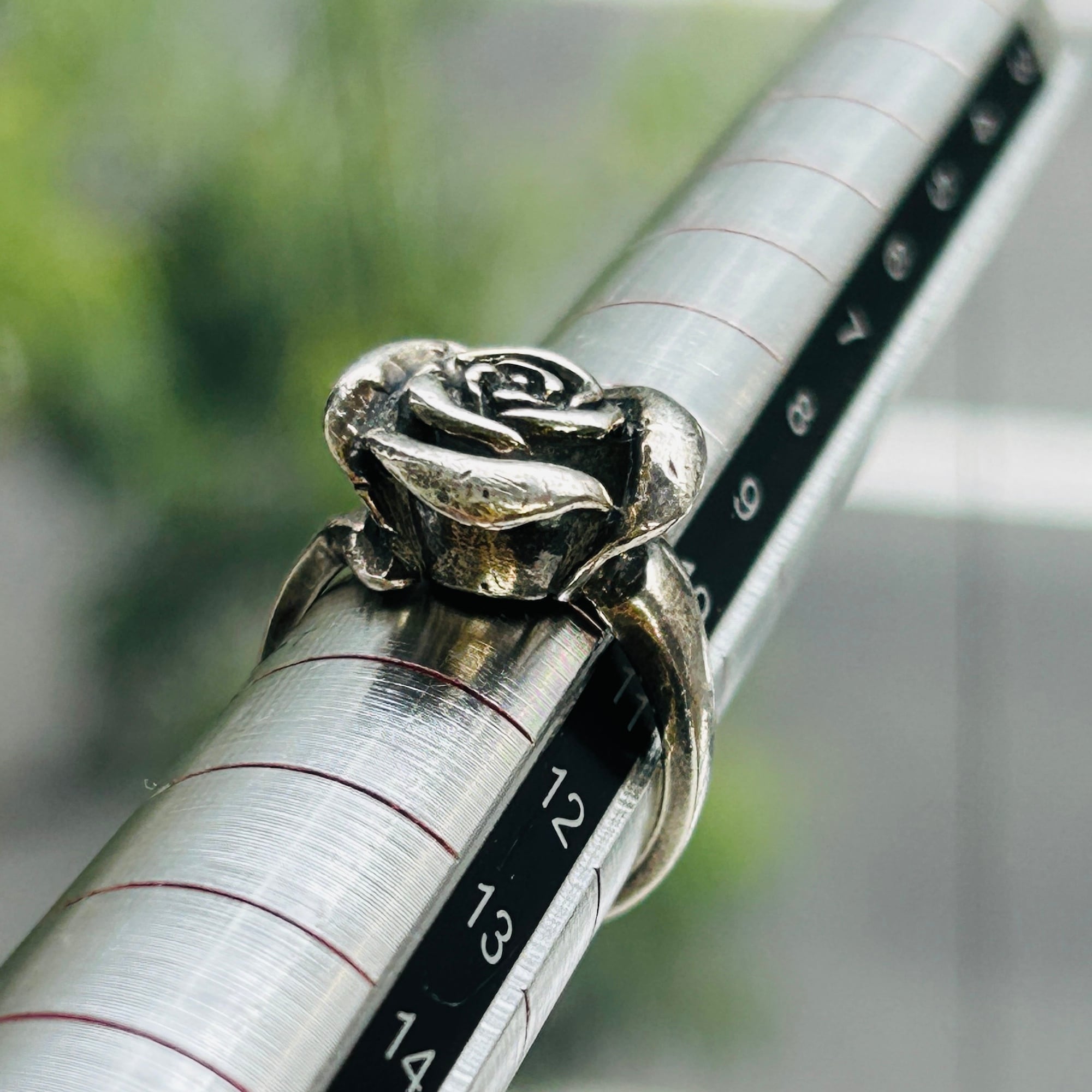 薔薇リング。高さのあるデザインです。燻し銀がたっぷり使われた渋いロースです。液体クリーナーは使わないのがいいと思います。バンドが細く着脱しやすいです。バラの裏側にスペースがあるので着用感は実寸よりも大きめ。サイズ棒で11号ですが、私の12号中指に入ります。14号の指にも入りますがきついです。内側に「925」刻印。