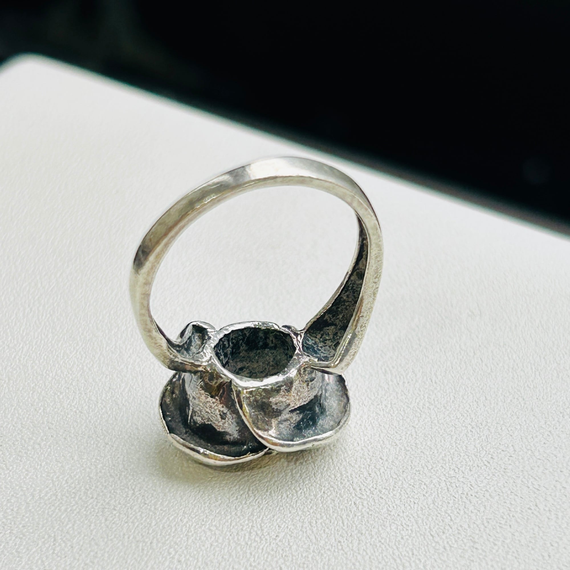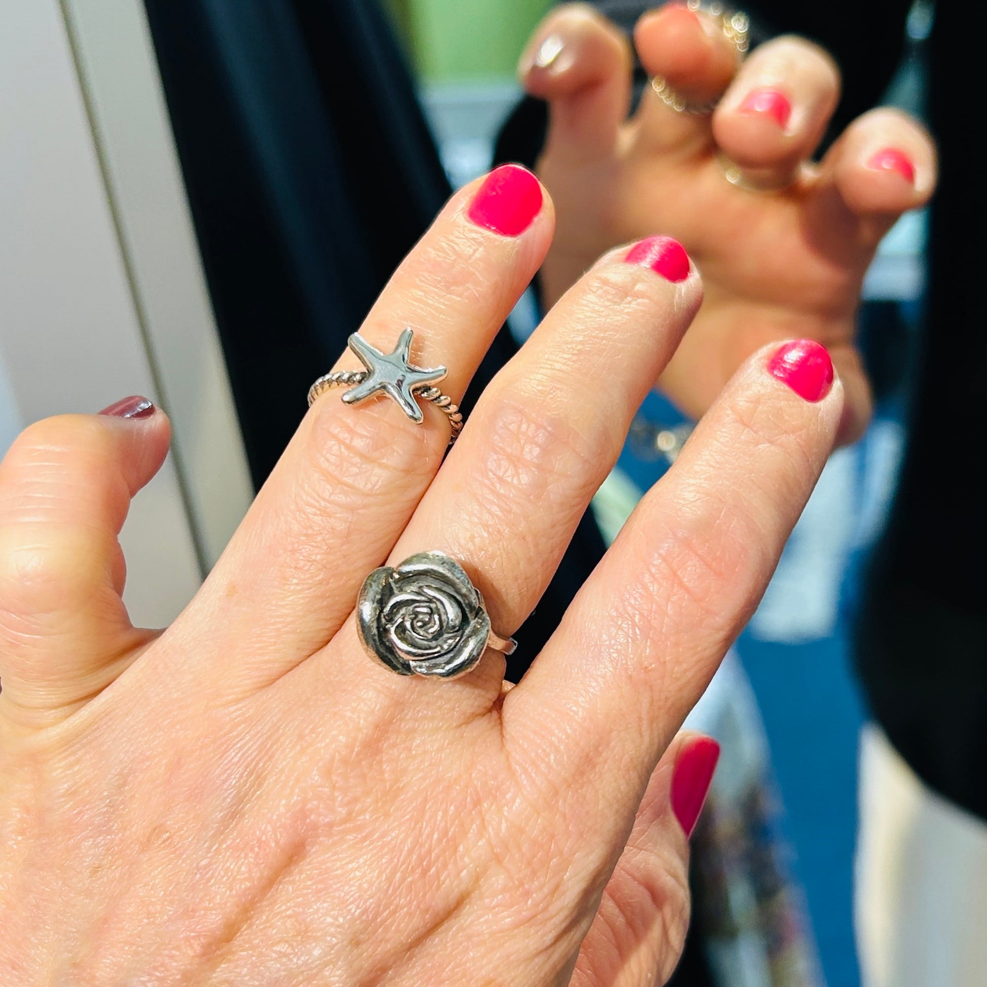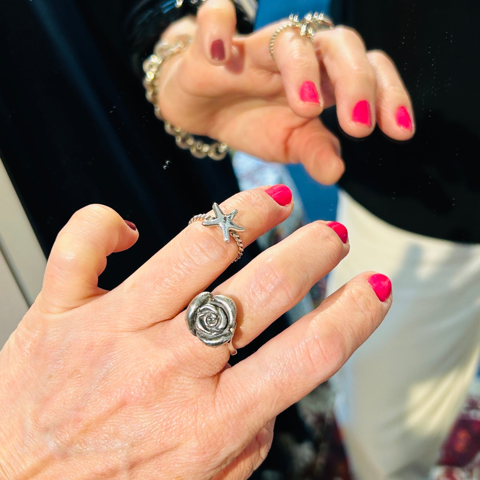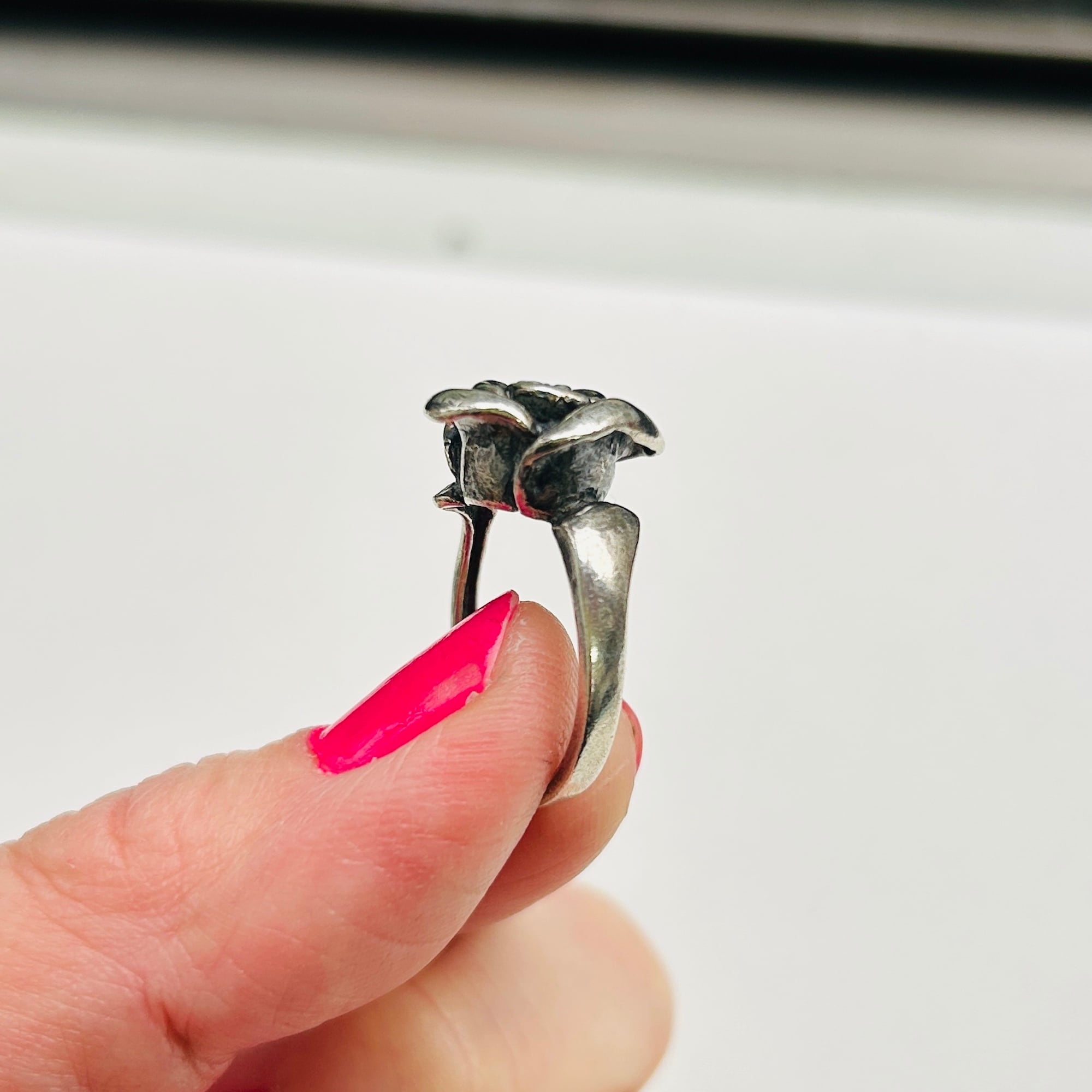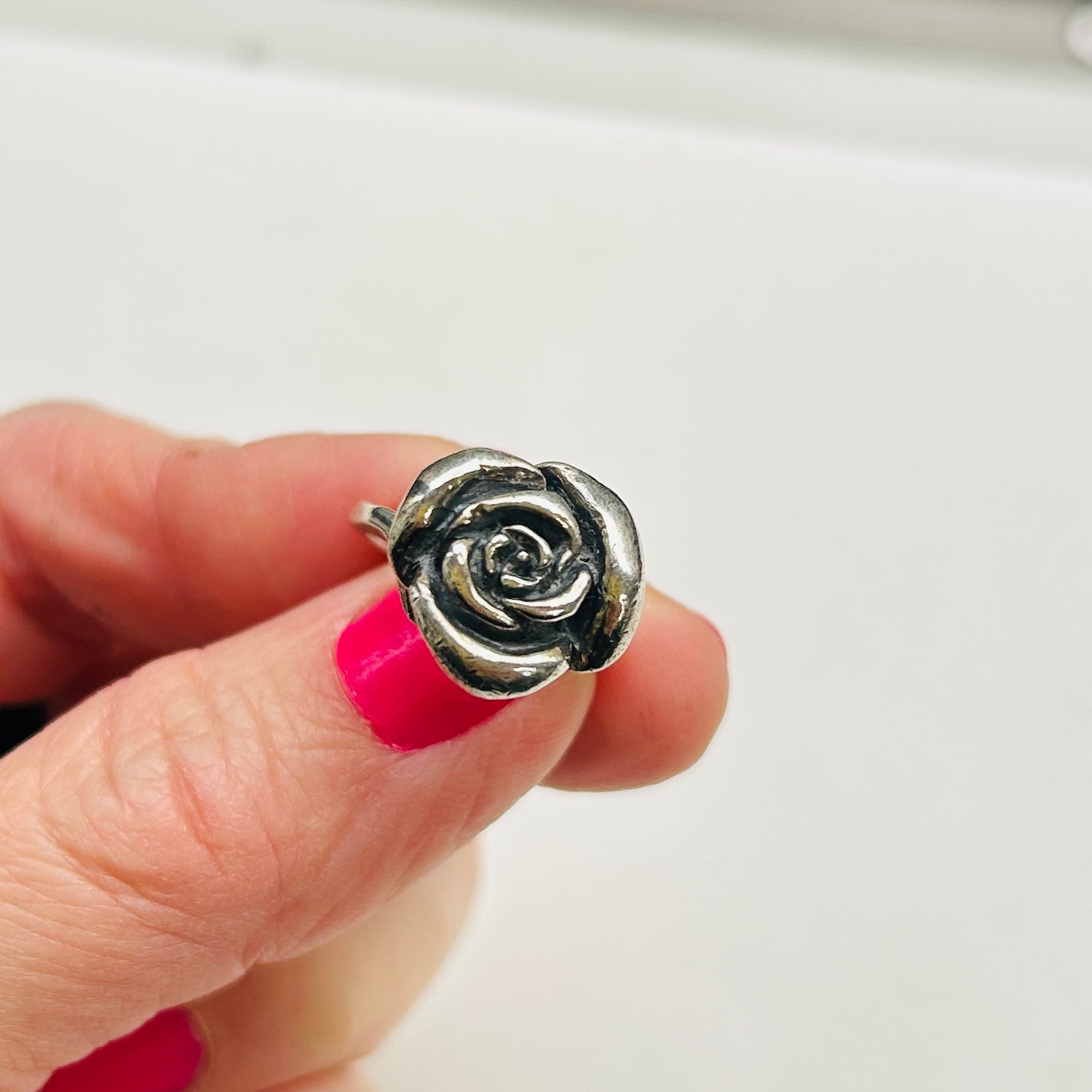薔薇リング。高さのあるデザインです。燻し銀がたっぷり使われた渋いロースです。液体クリーナーは使わないのがいいと思います。バンドが細く着脱しやすいです。バラの裏側にスペースがあるので着用感は実寸よりも大きめ。サイズ棒で11号ですが、私の12号中指に入ります。14号の指にも入りますがきついです。内側に「925」刻印。