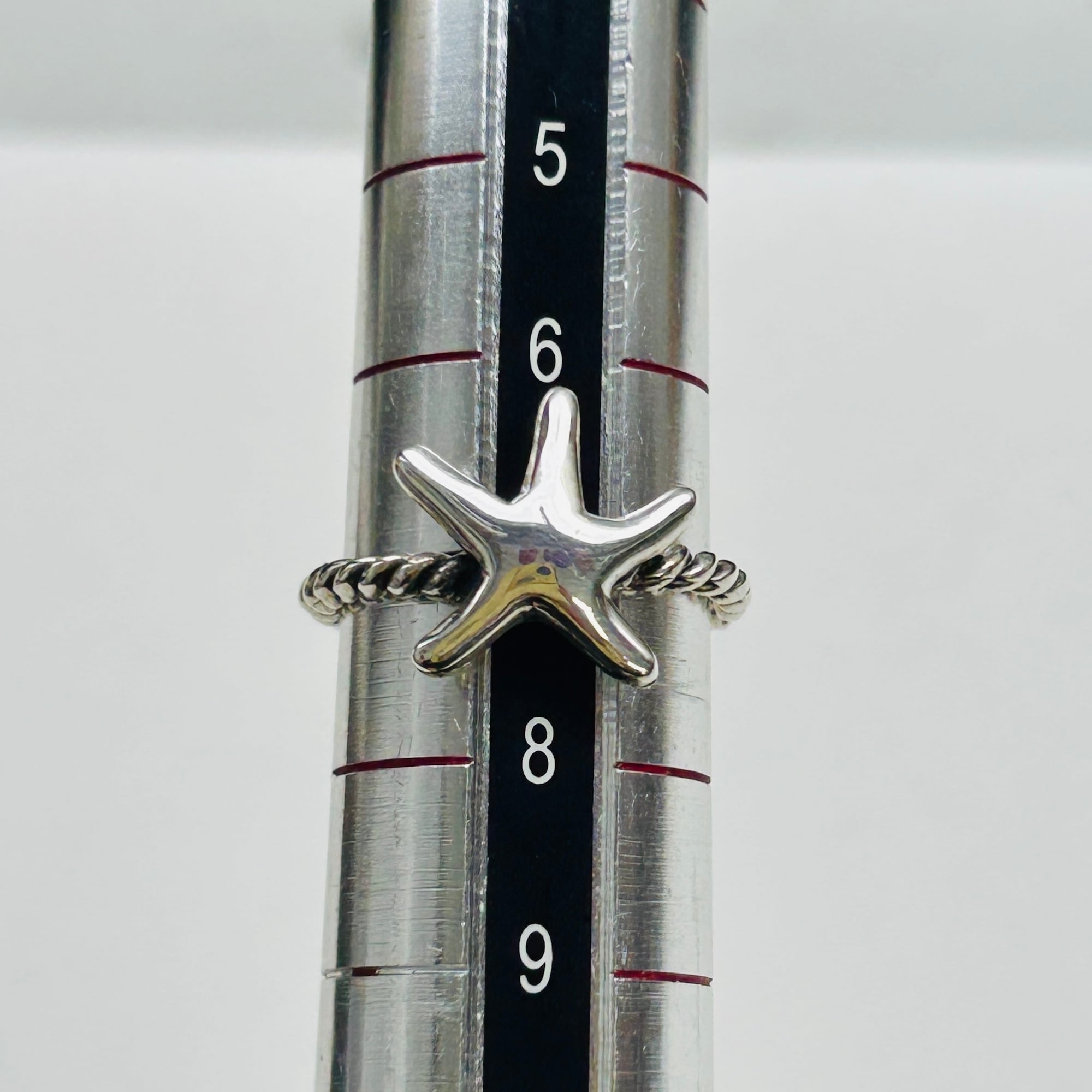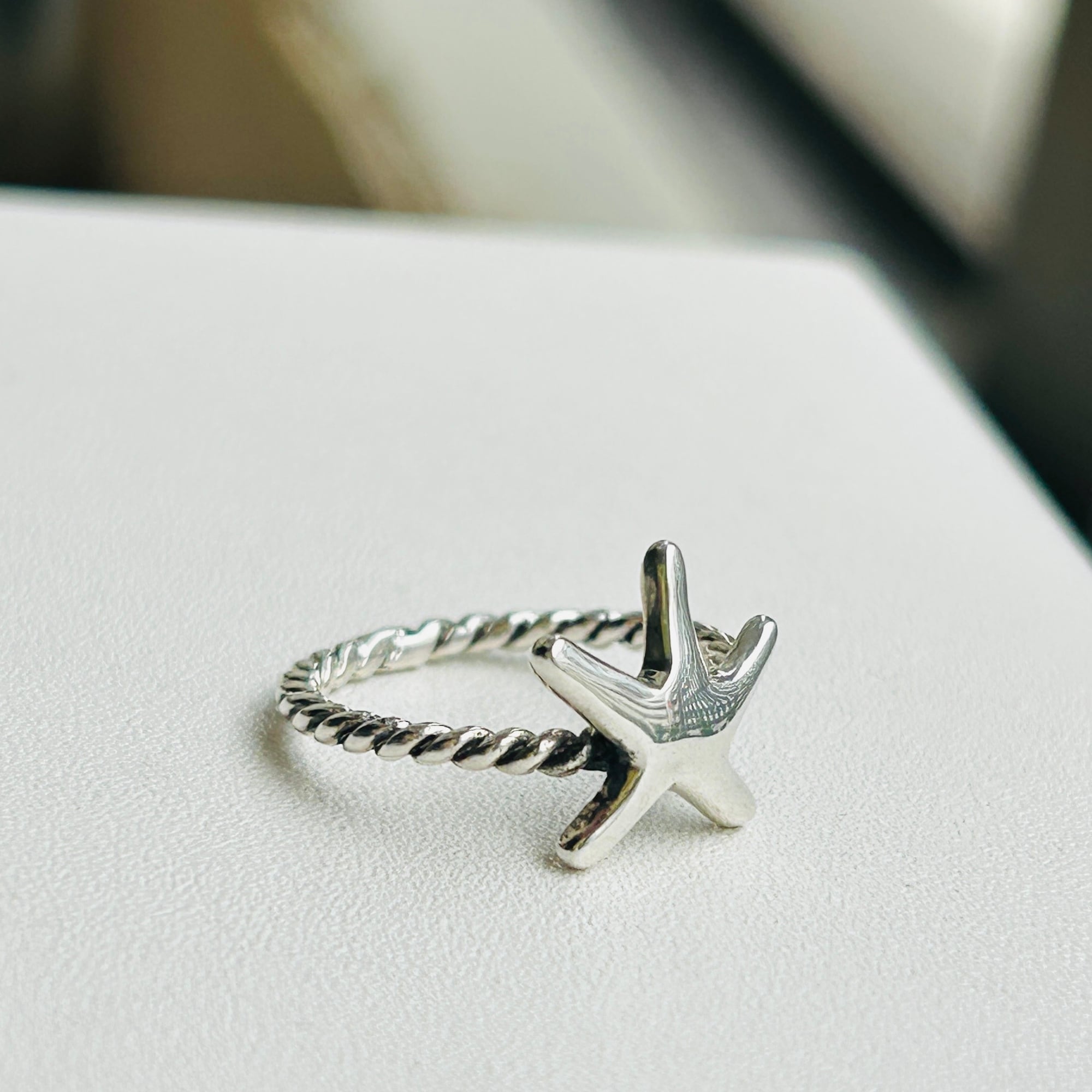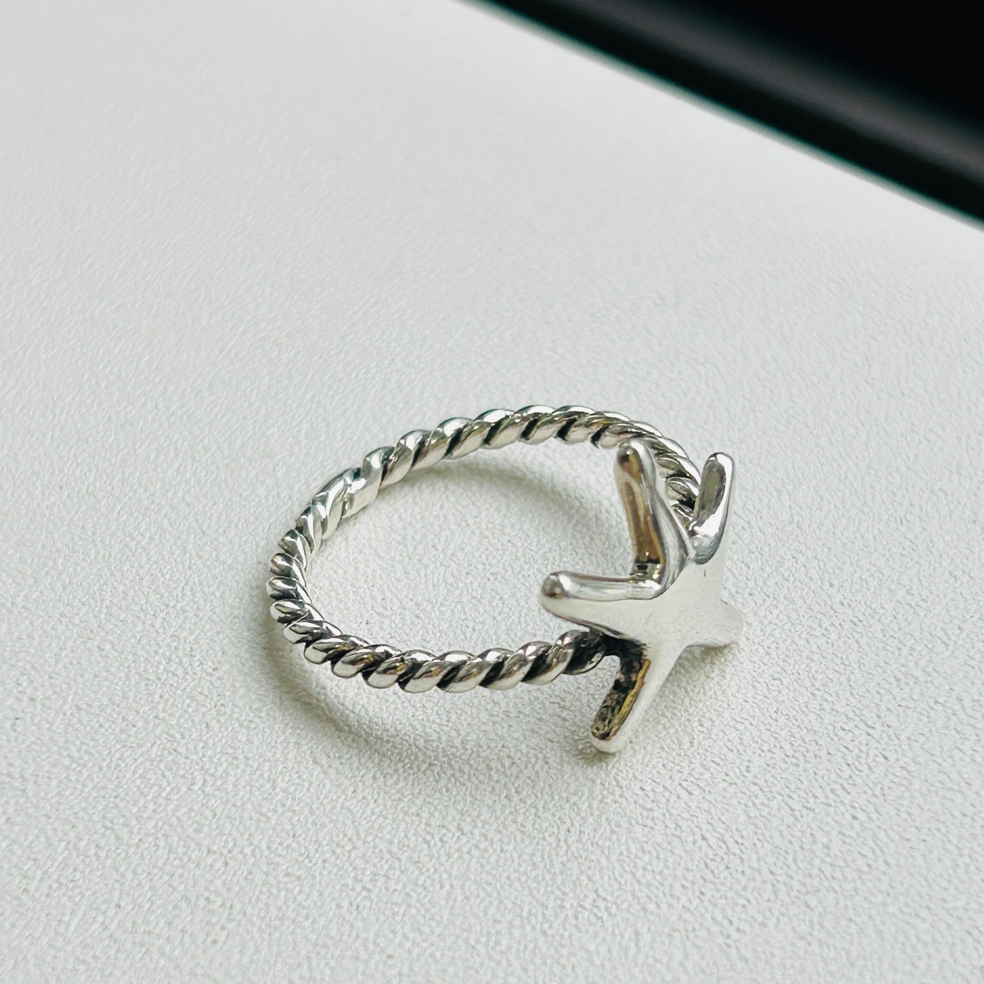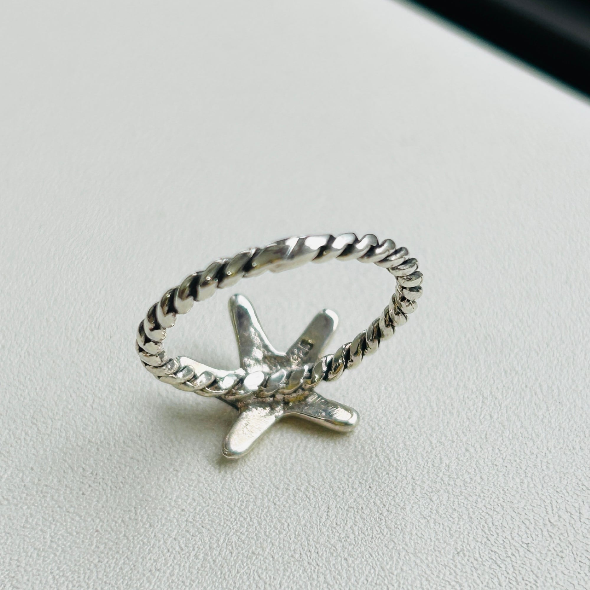 80sっぽい爽やかマリンモチーフリング。ネジネジバンドとツルンとしたヒトデの対照的なテクスチャーが目を惹きます。7号サイズは私のどの指にも入りません。ヒトデの裏に「925」。