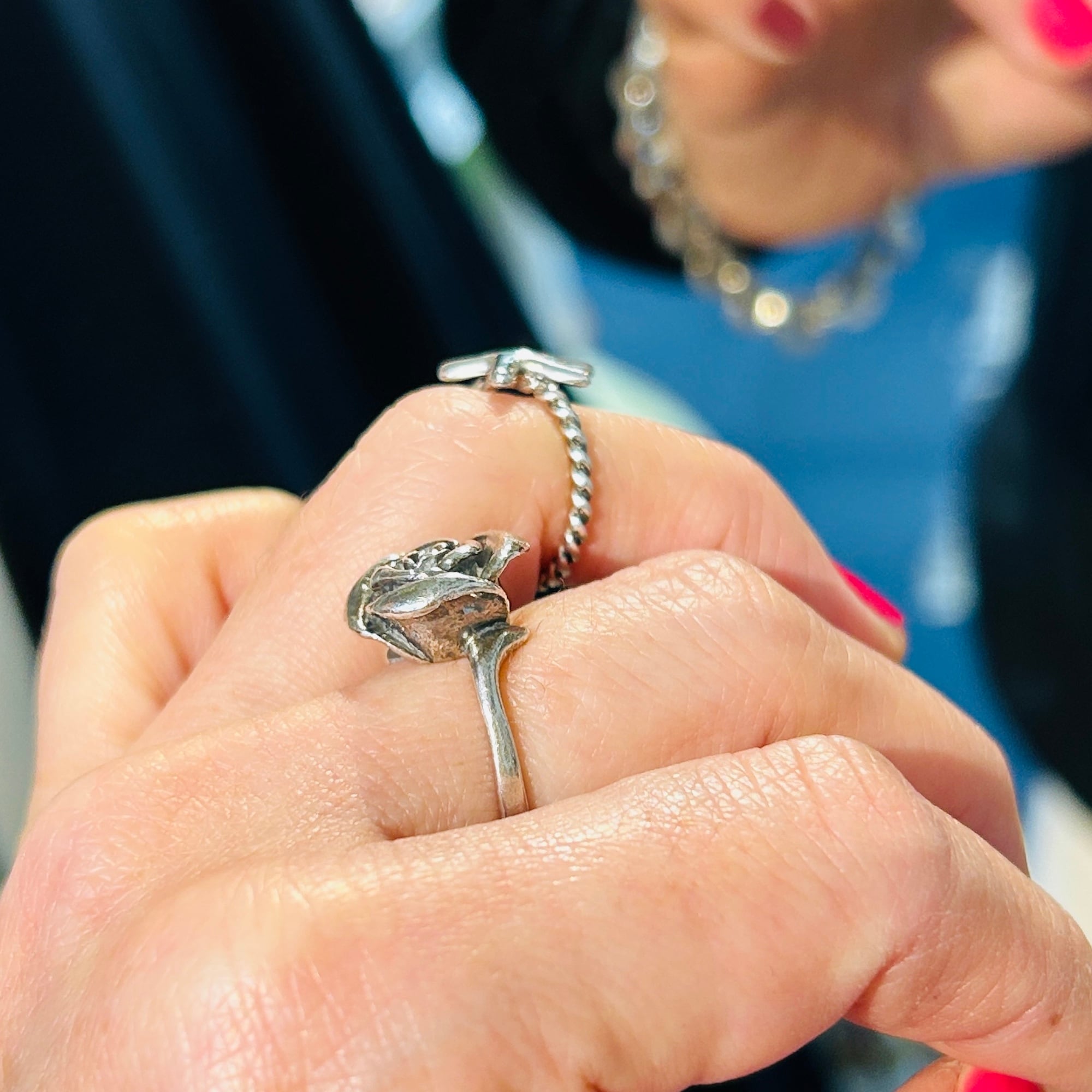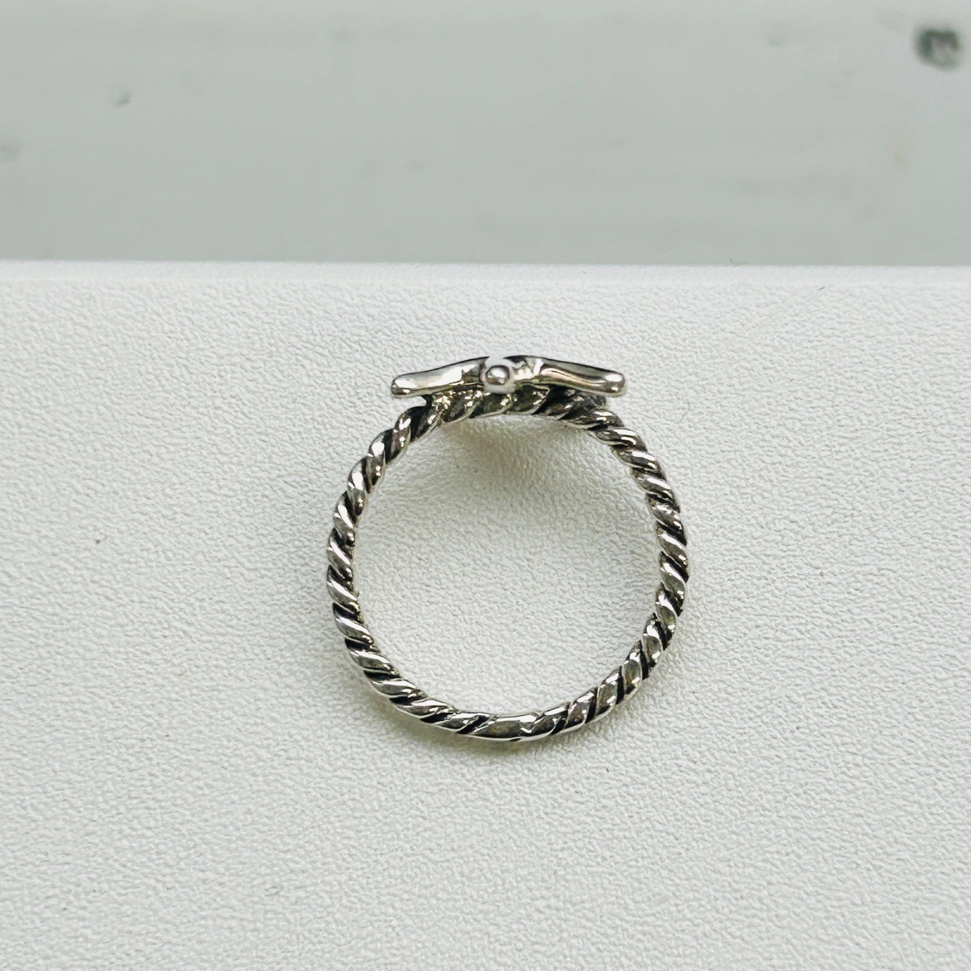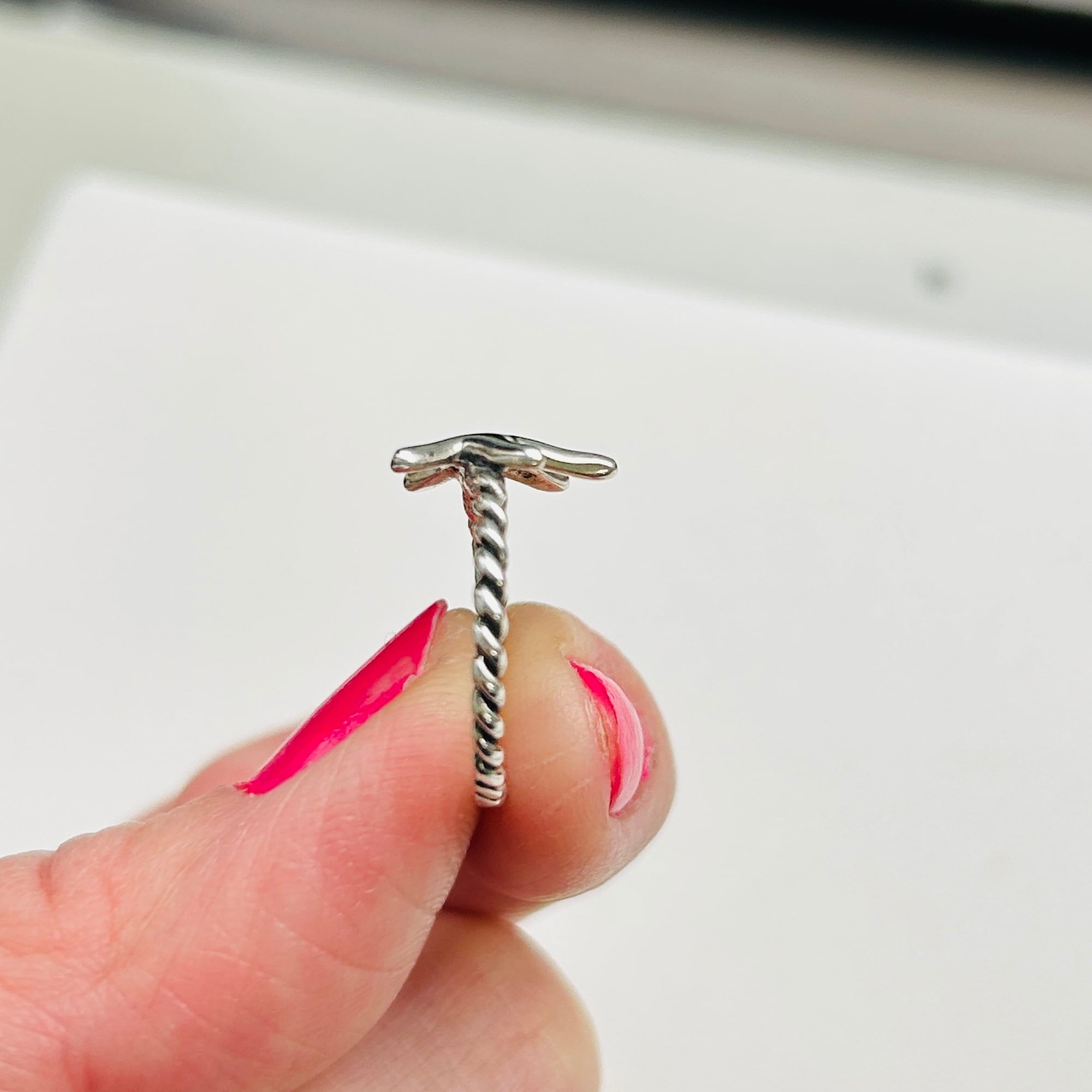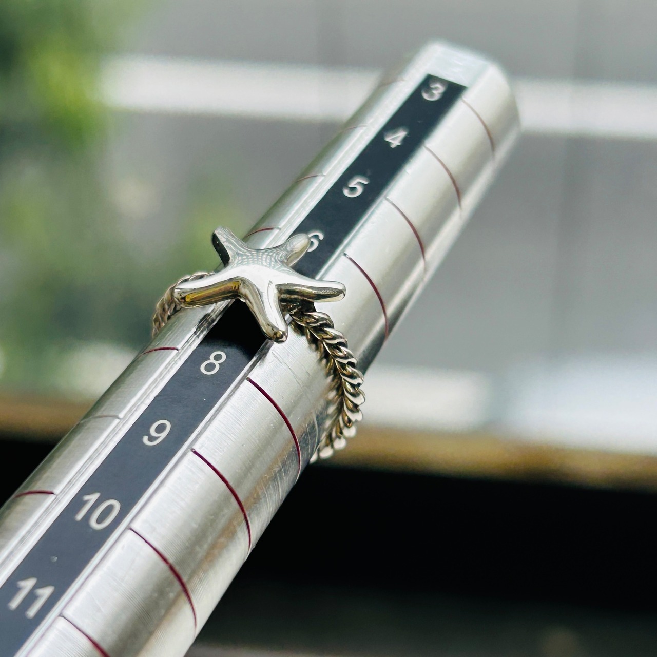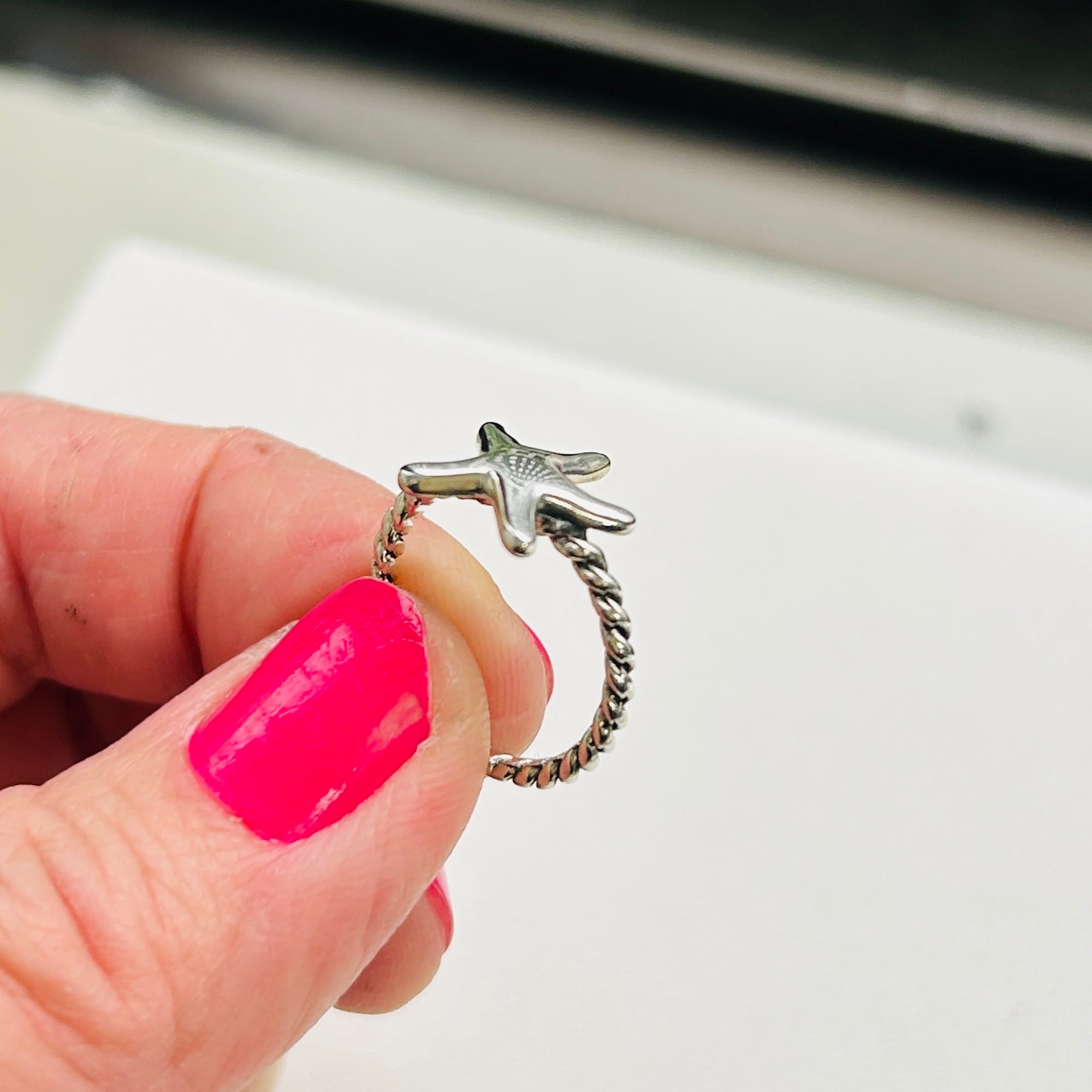 80sっぽい爽やかマリンモチーフリング。ネジネジバンドとツルンとしたヒトデの対照的なテクスチャーが目を惹きます。7号サイズは私のどの指にも入りません。ヒトデの裏に「925」。