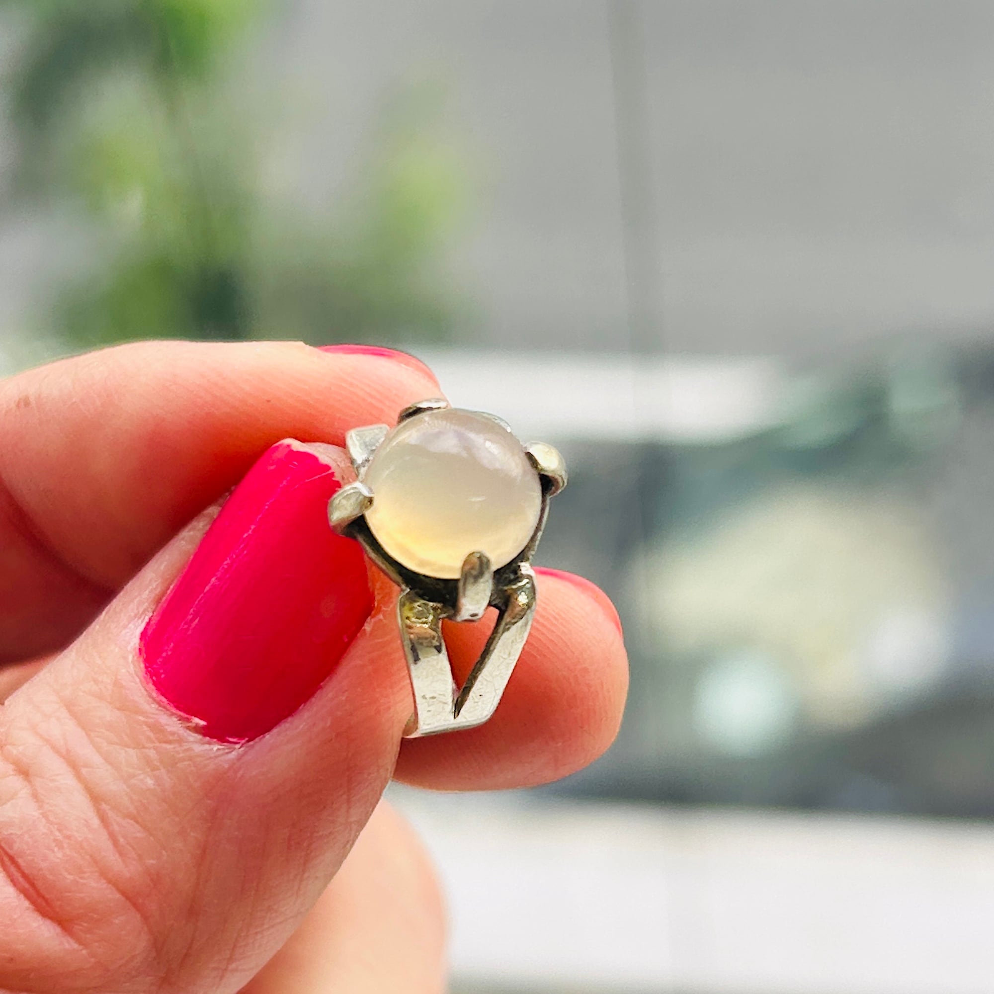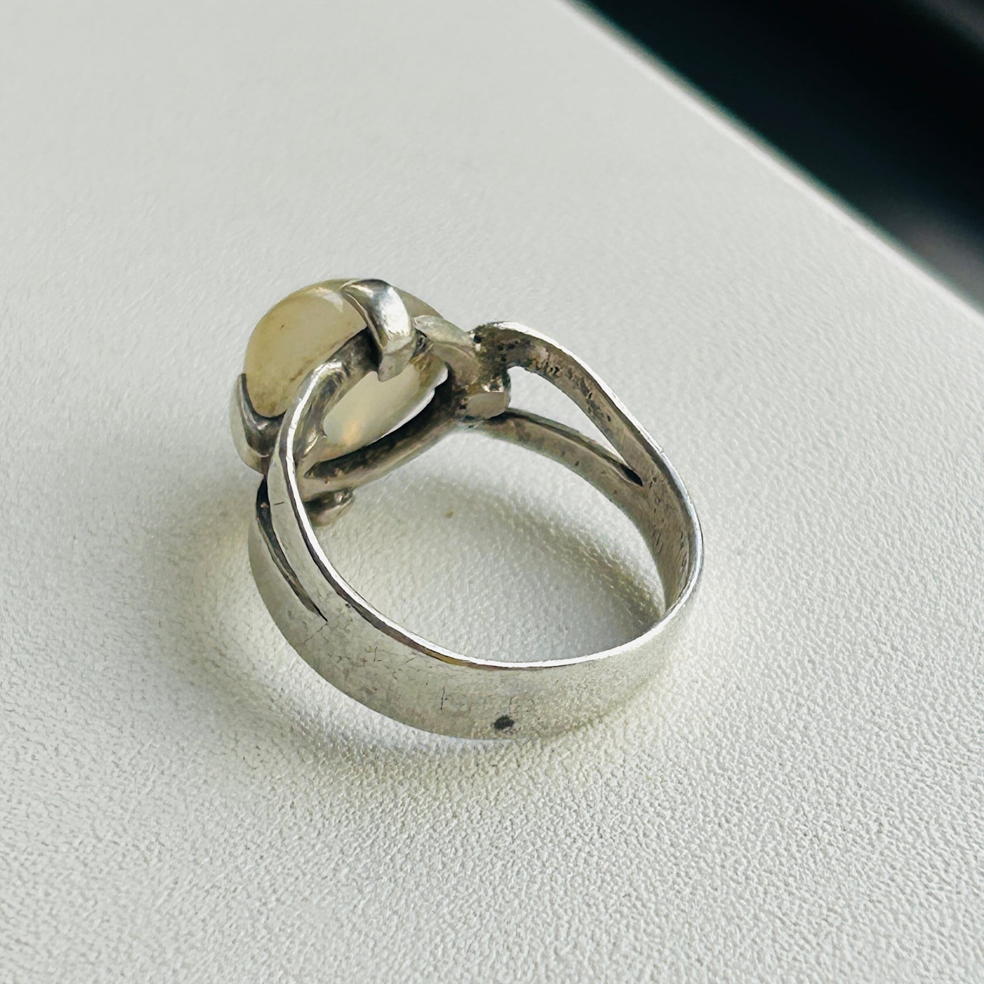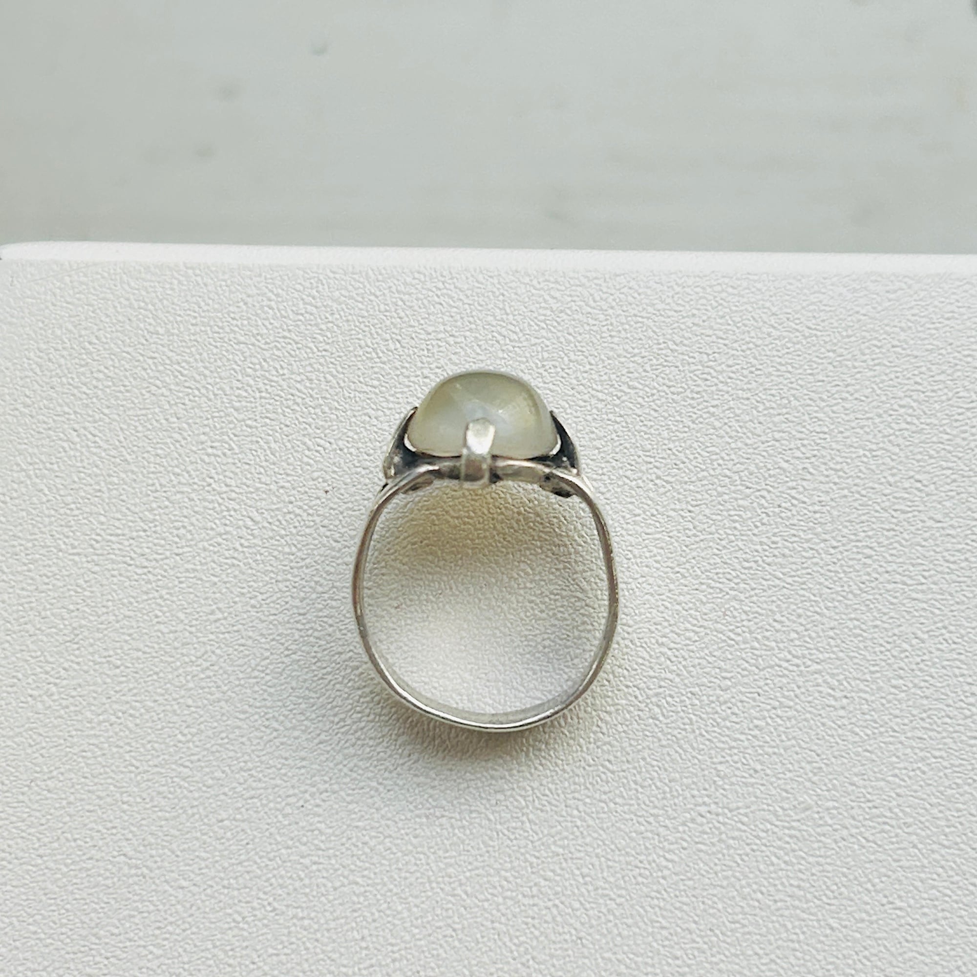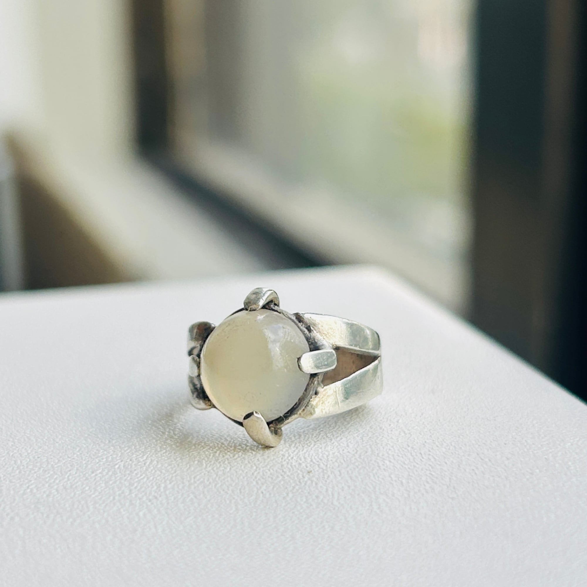 ピンキーサイズのムーンストーンリング。月の光のようなホンワリ光彩が魅力。太めの4点爪どめ。ハンドメイドな素朴な作りで可愛らしいリングです。刻印なしシルバーです。ストーンにグラつき欠けはありません。幅広で安定感ある着け心地です。