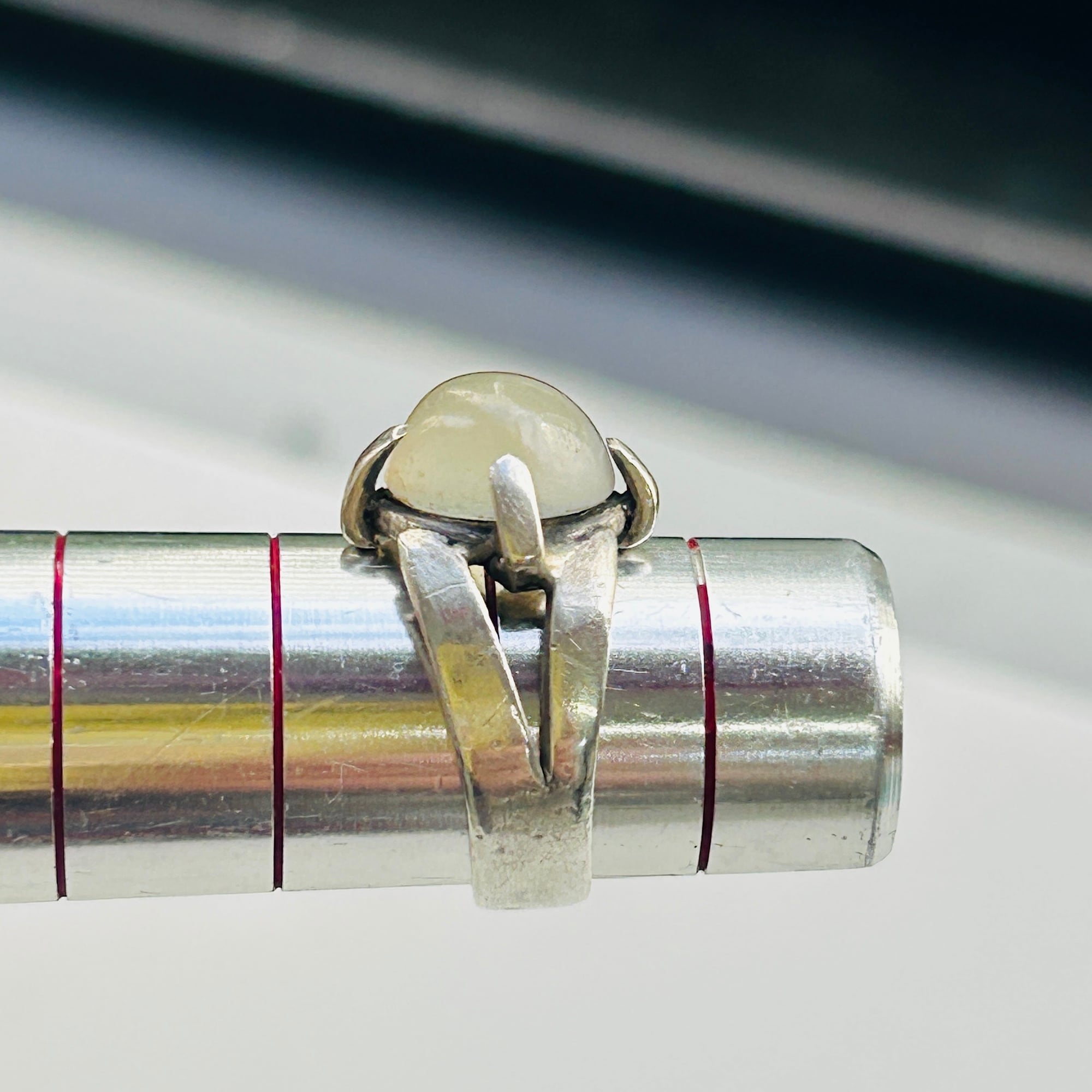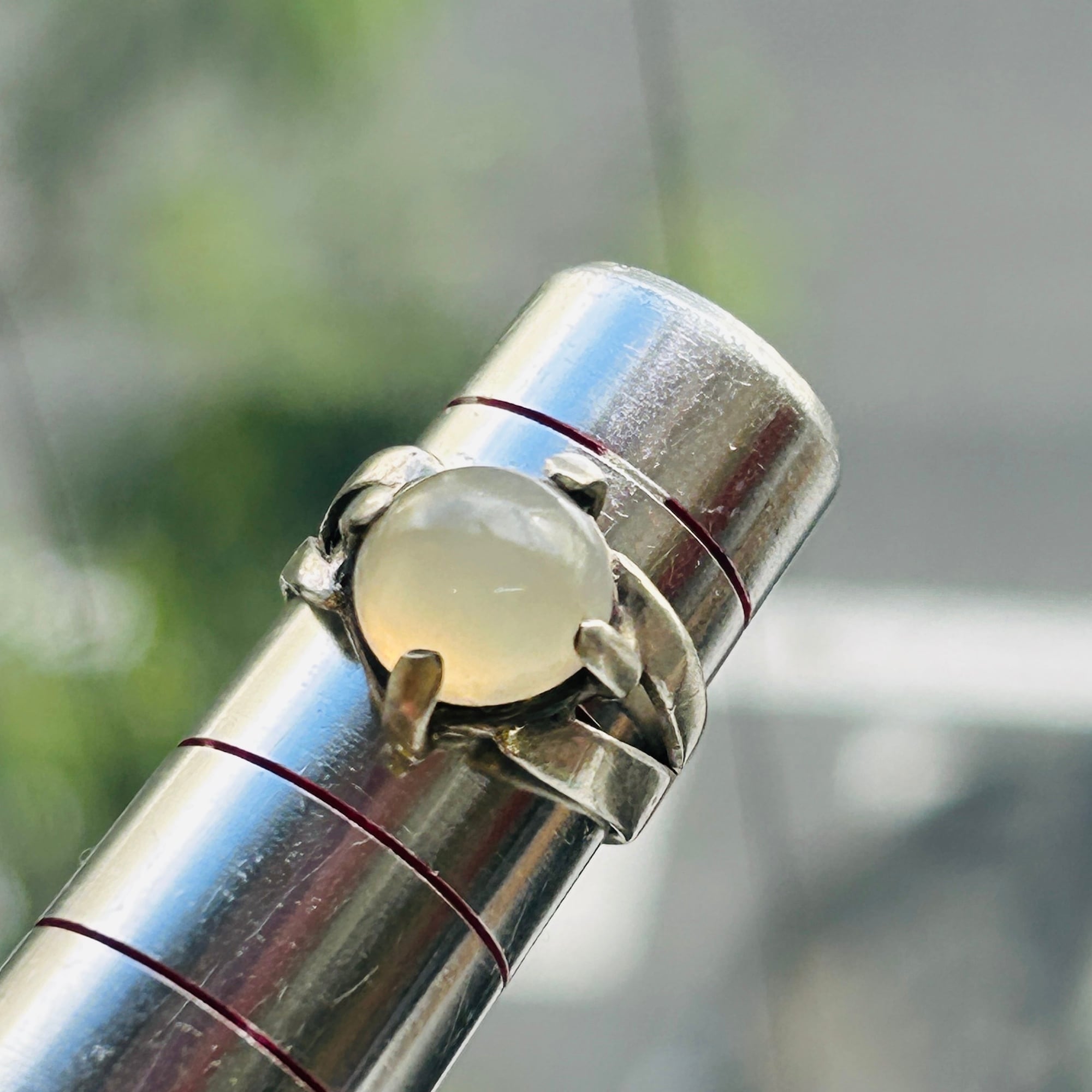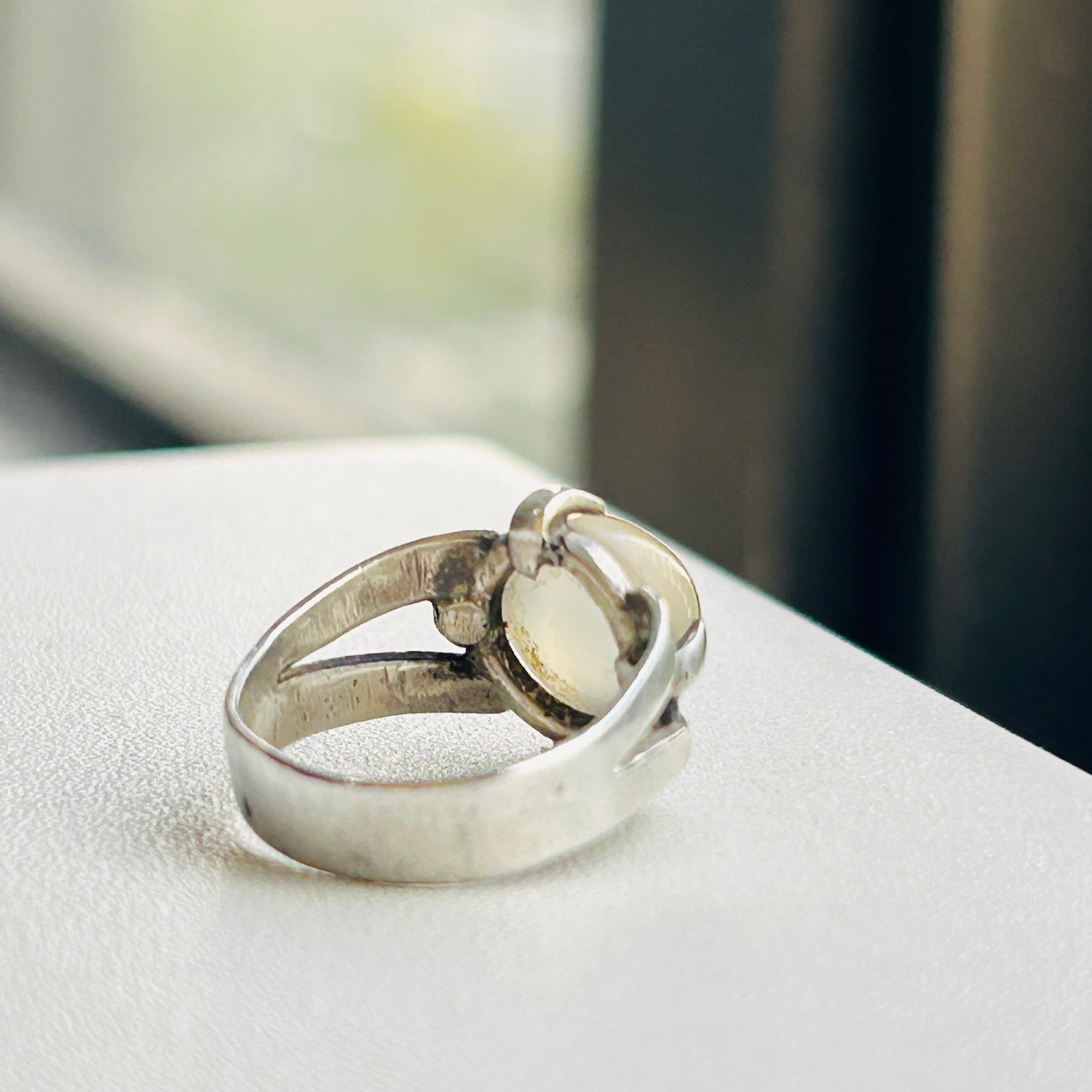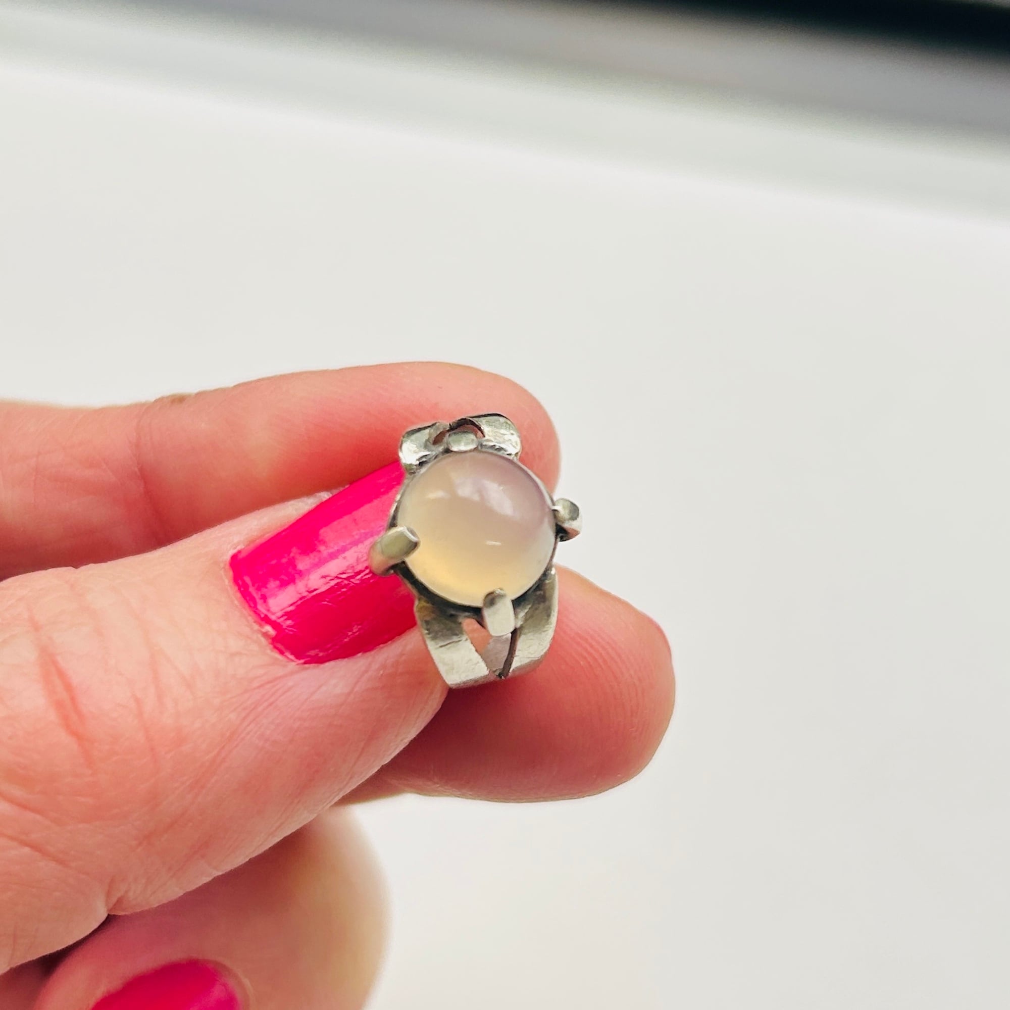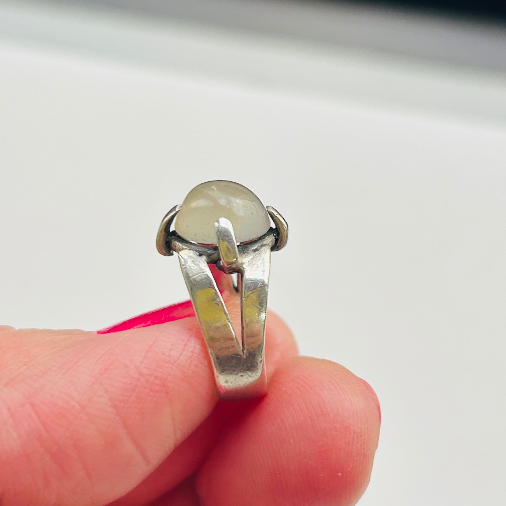 ピンキーサイズのムーンストーンリング。月の光のようなホンワリ光彩が魅力。太めの4点爪どめ。ハンドメイドな素朴な作りで可愛らしいリングです。刻印なしシルバーです。ストーンにグラつき欠けはありません。幅広で安定感ある着け心地です。
