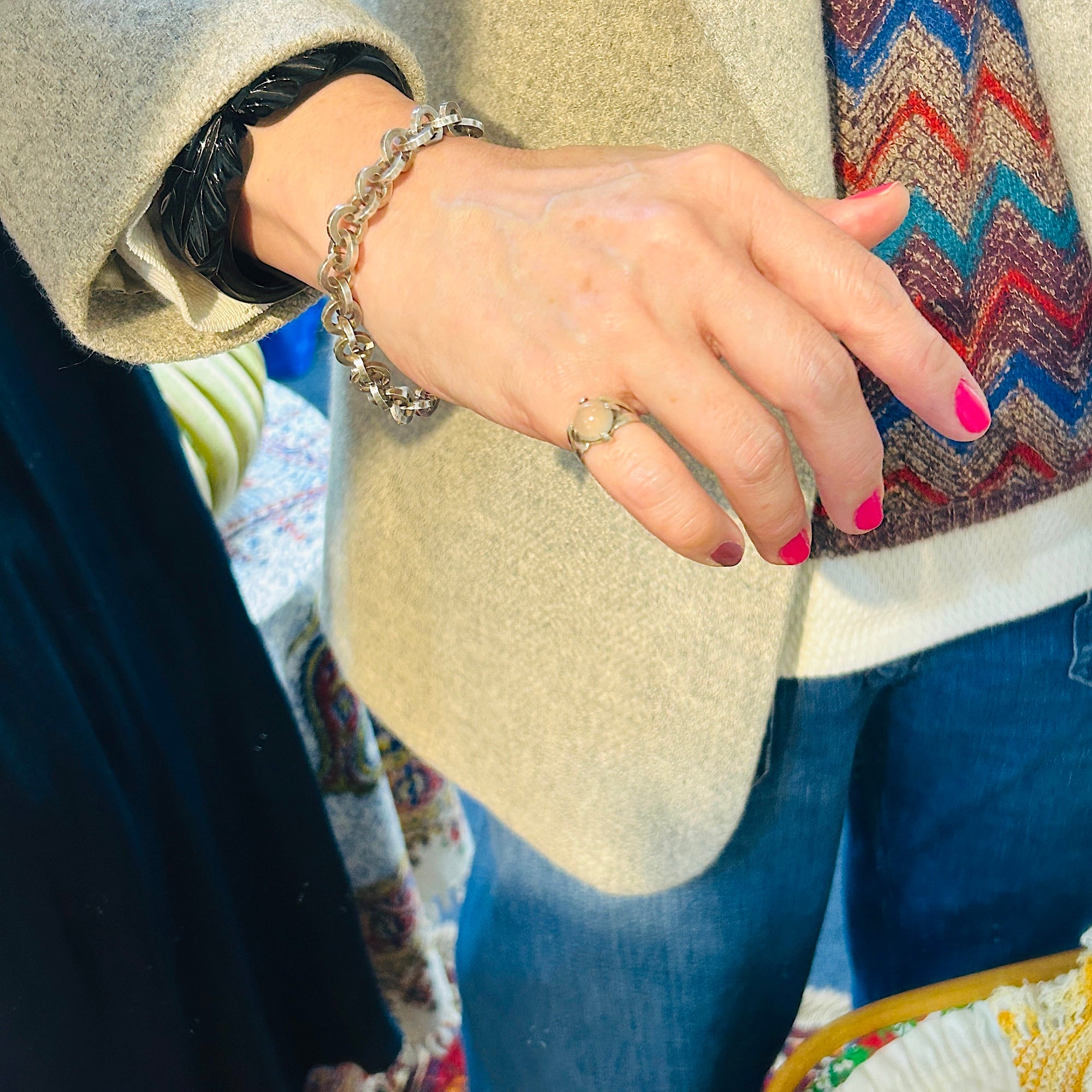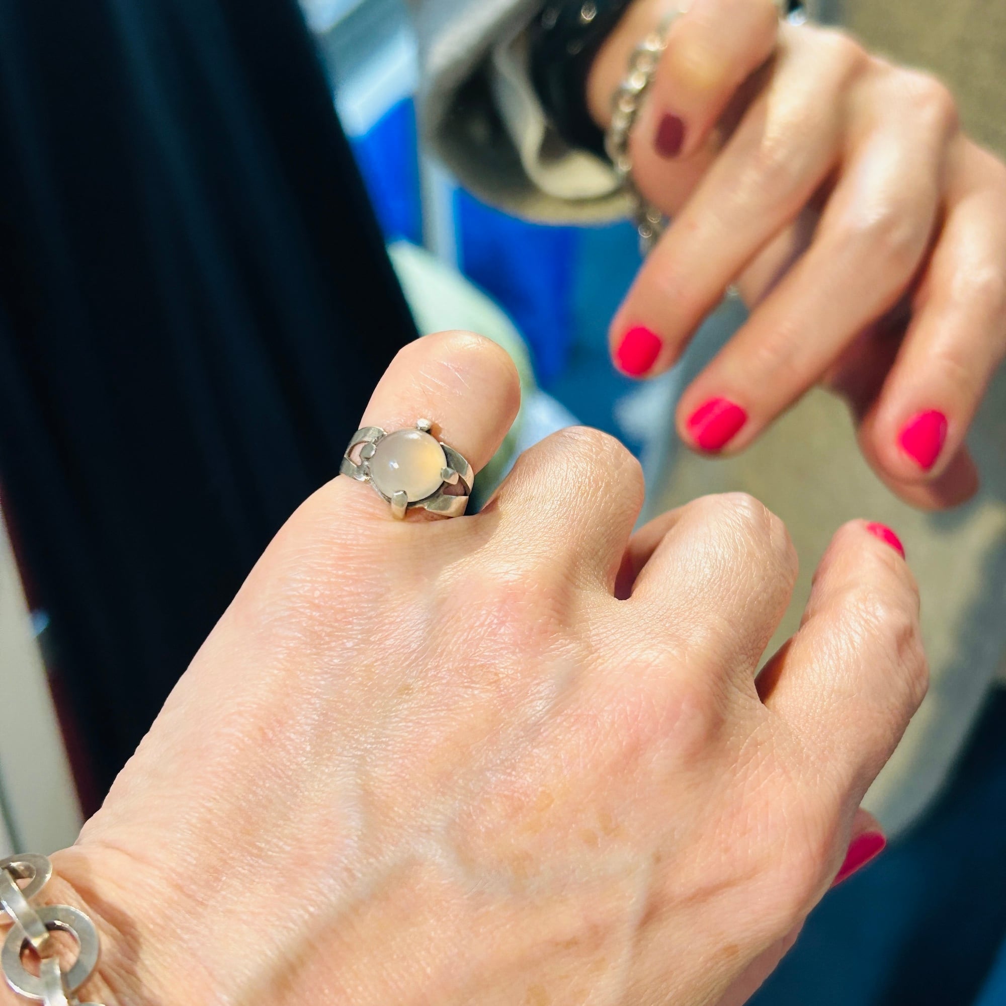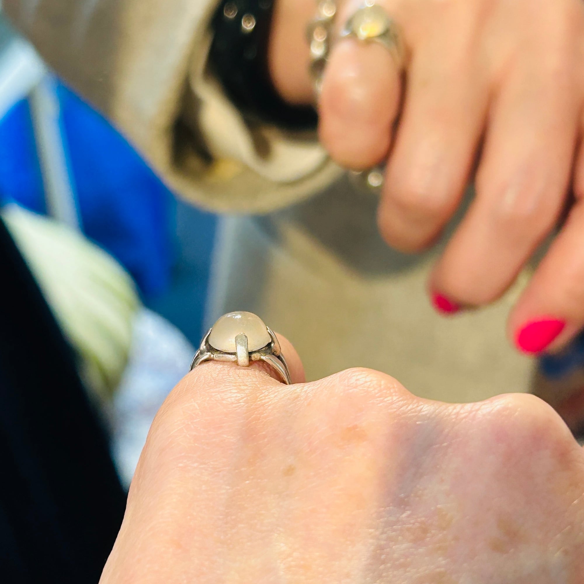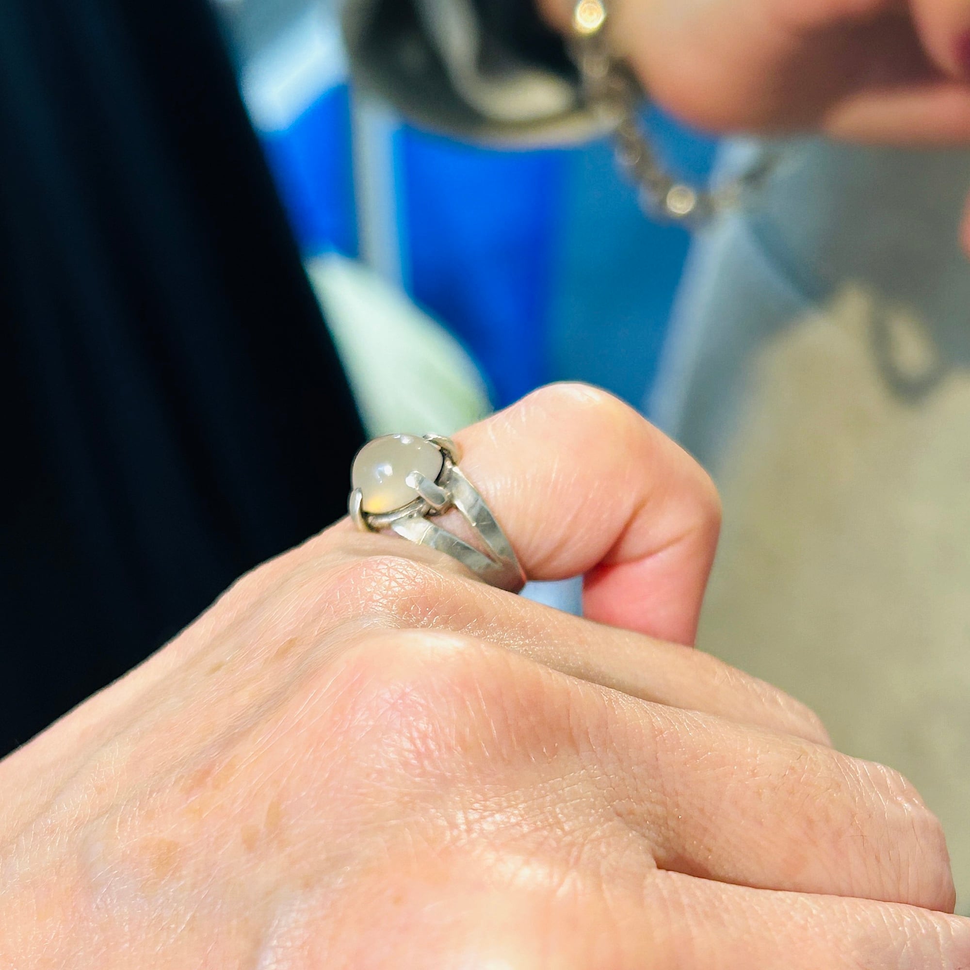 ピンキーサイズのムーンストーンリング。月の光のようなホンワリ光彩が魅力。太めの4点爪どめ。ハンドメイドな素朴な作りで可愛らしいリングです。刻印なしシルバーです。ストーンにグラつき欠けはありません。幅広で安定感ある着け心地です。