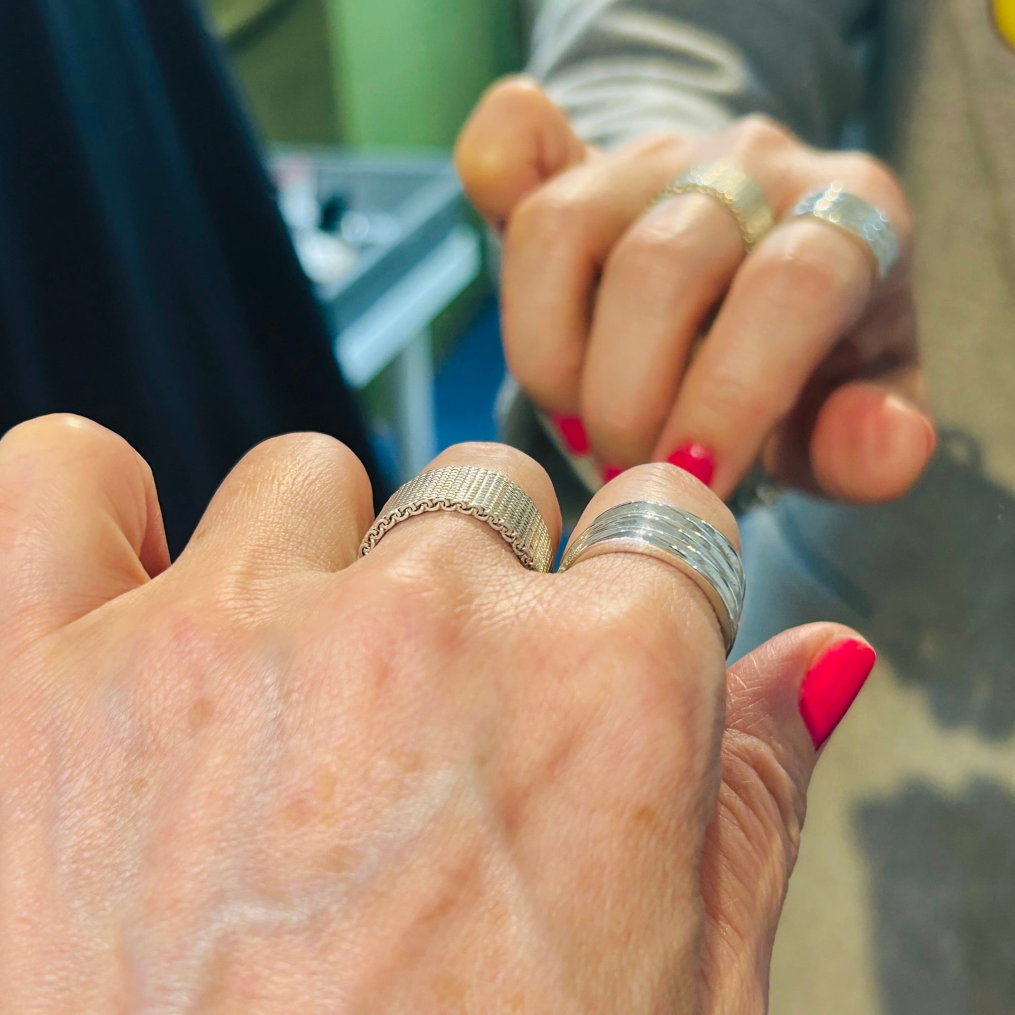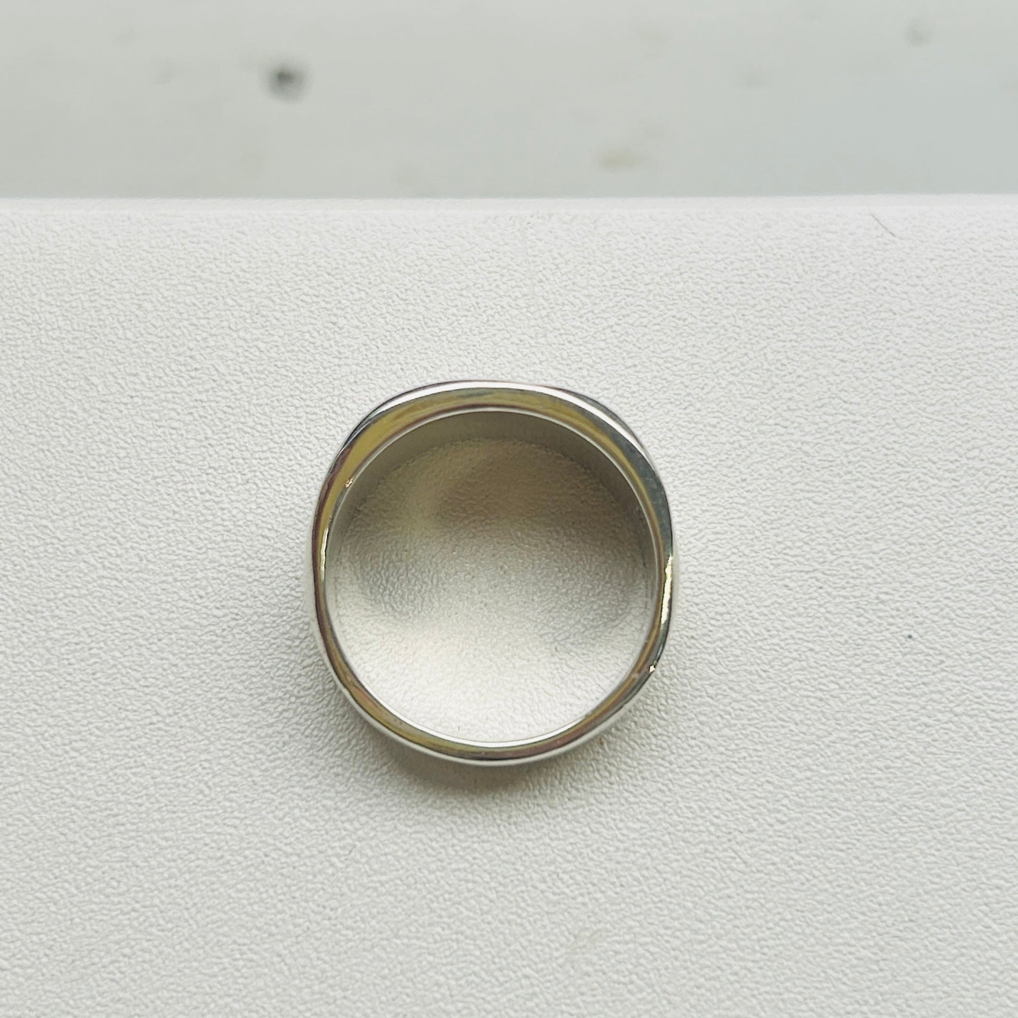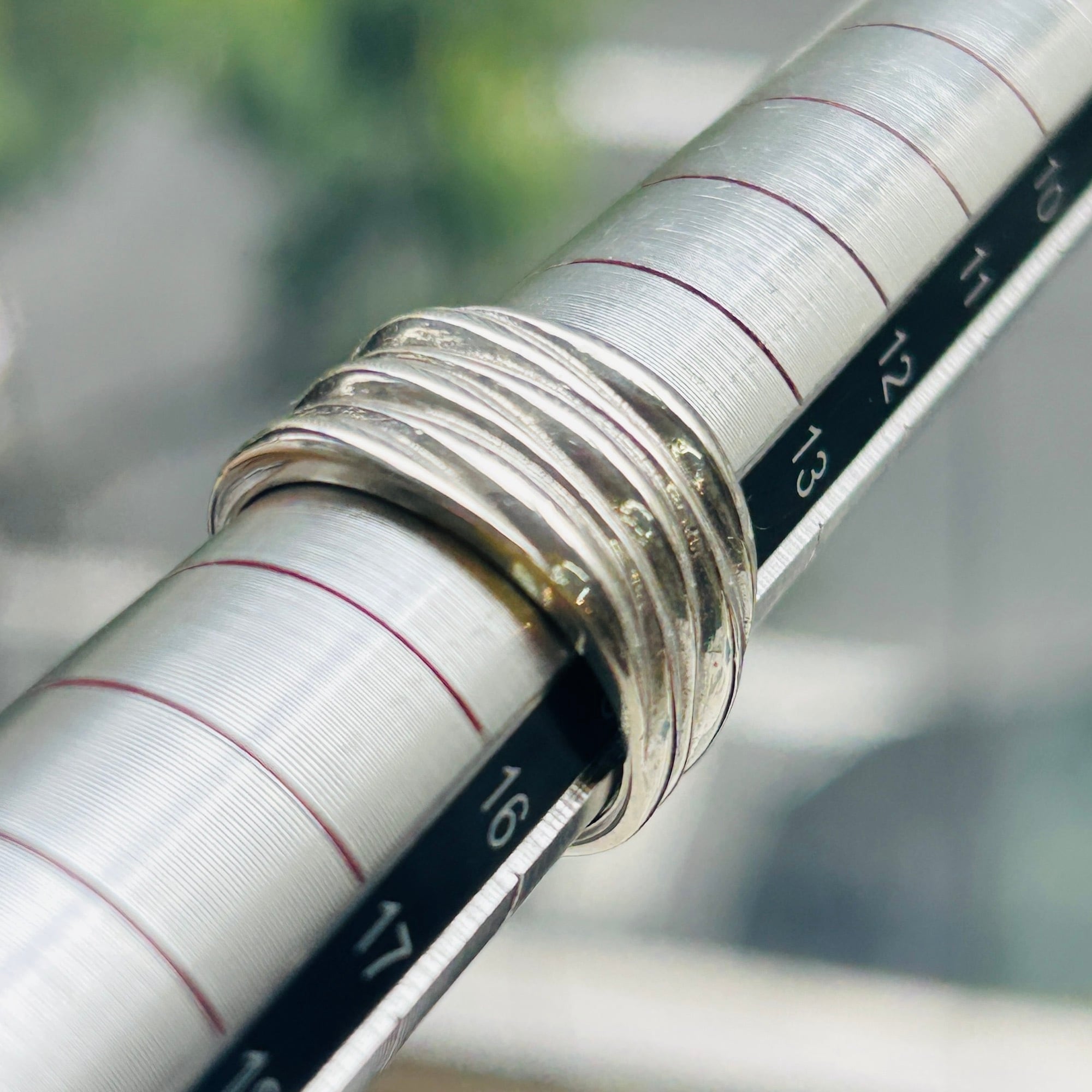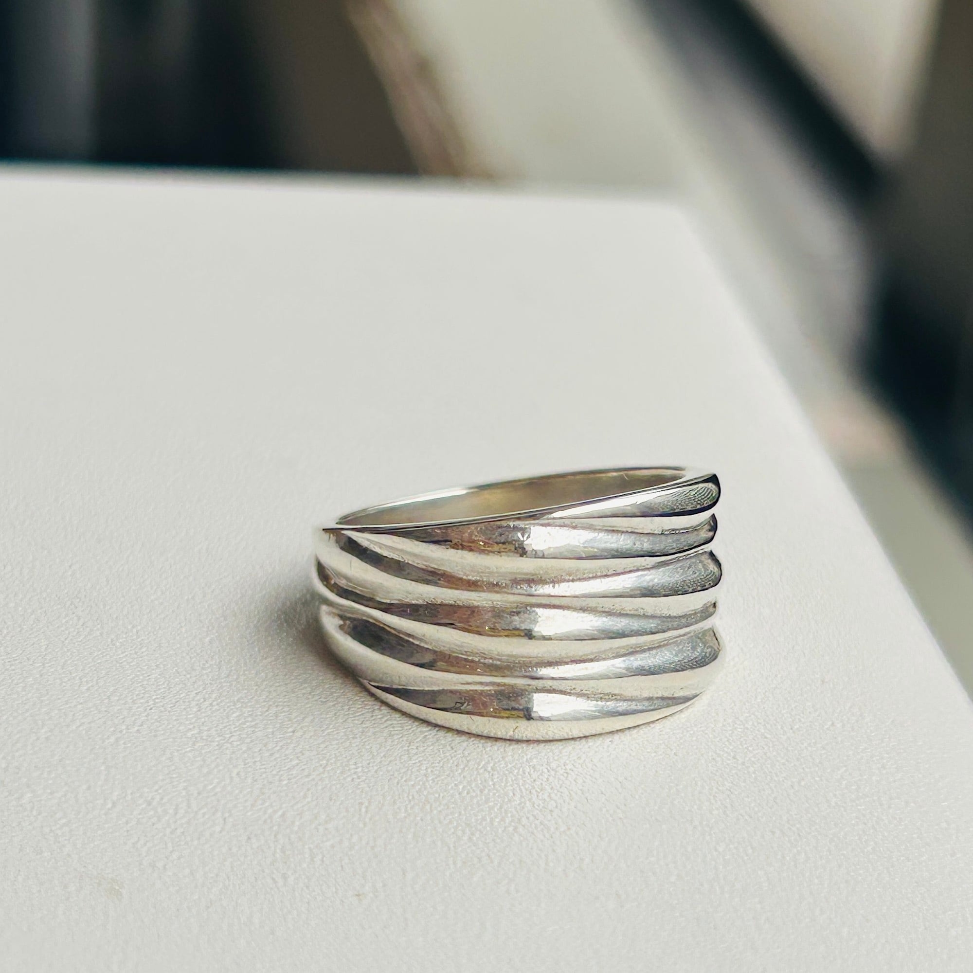 幅広リブ模様リング。ラインがユニークなリブ模様、シンプルですがデザイン性のあるリングです。程よいボリュームで手元コーデに取り入れやすいデザインです。明るく輝くツヤのあるシルバーでややスクエア調のキレイに整ったカタチをしています。幅広バンドが指を包む安定感ある着け心地。着用感は14号くらいに感じます。こちらはアメリカドメスティックブランド「James Avery・ジェームス・エイブリー」、1954年創業で現在もテキサスで製造しているMade in USAジュエリー。品質の良さを実感できるお品物です。内側にメーカー刻印と「STER.」刻印