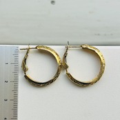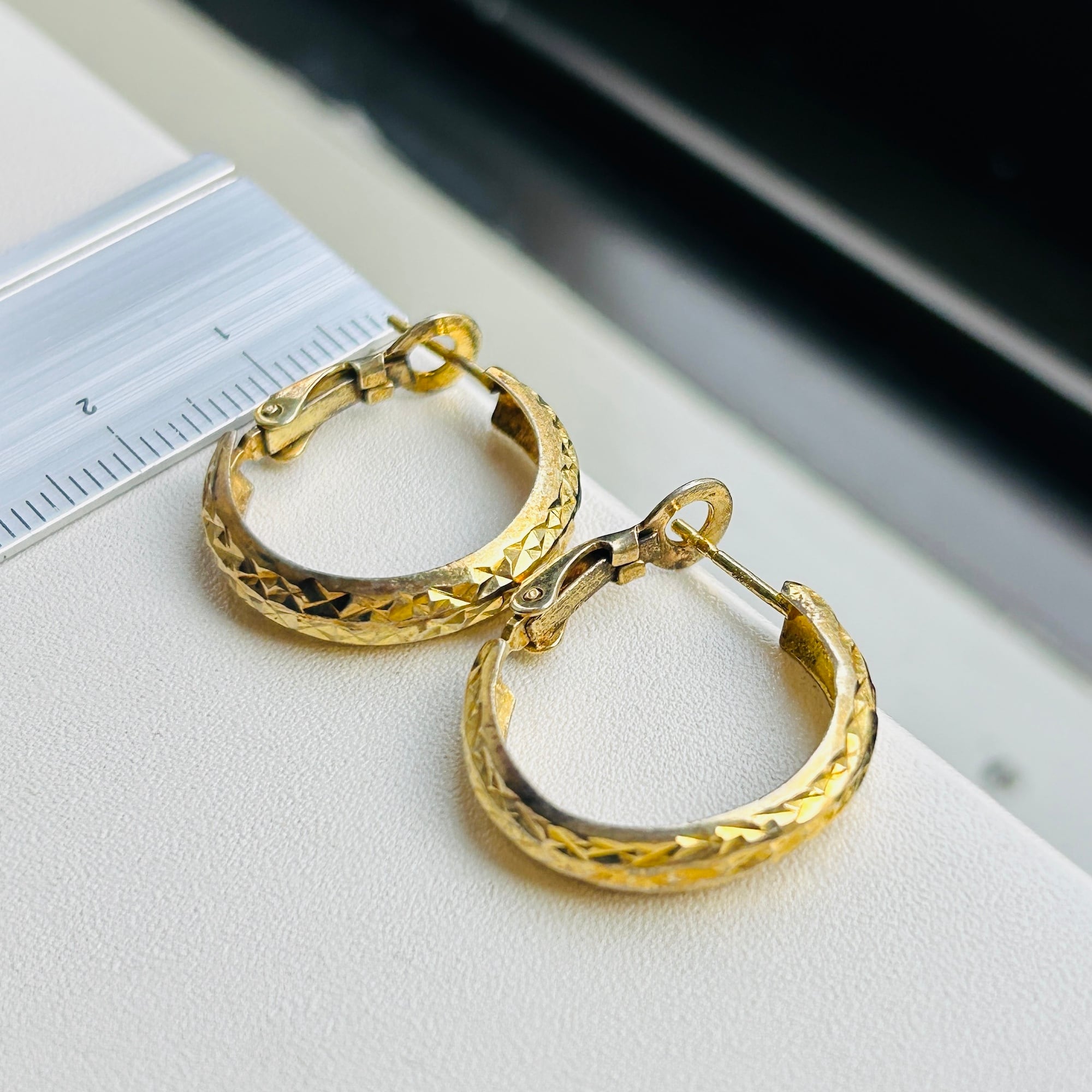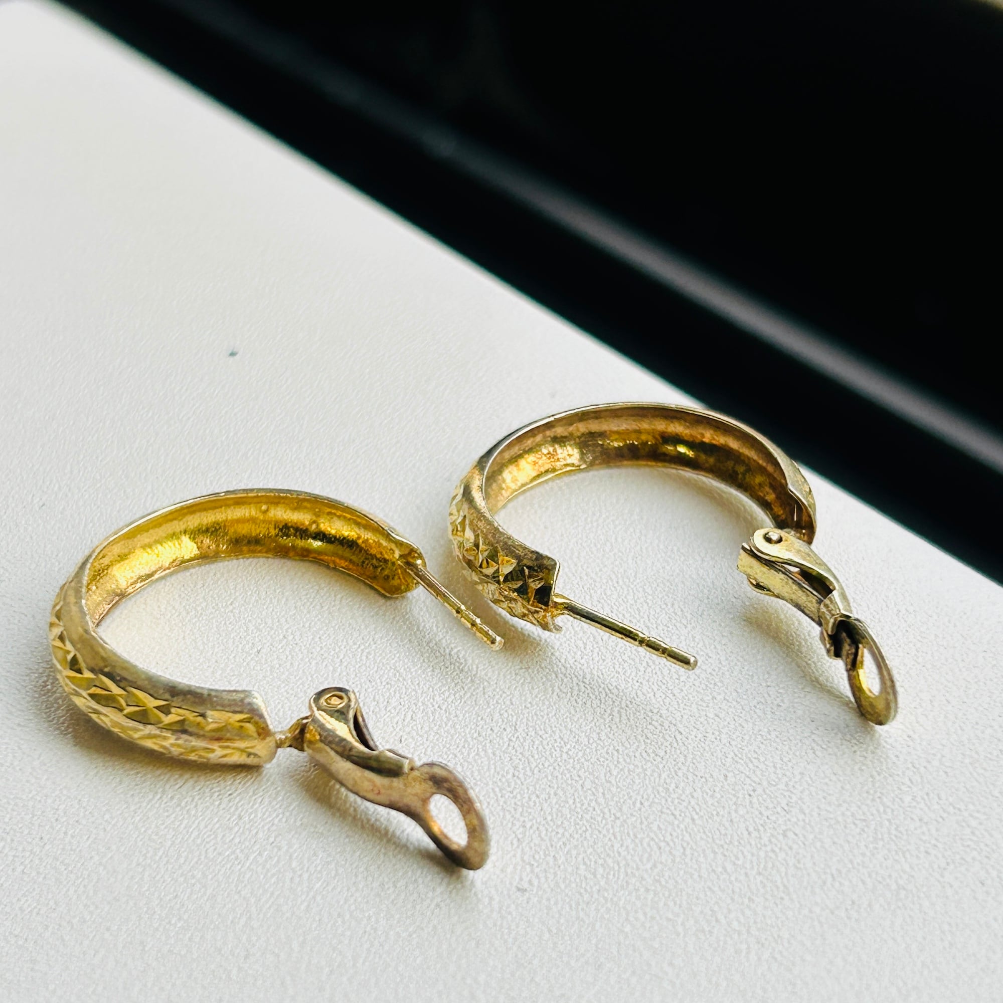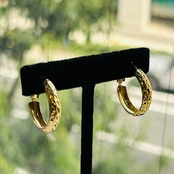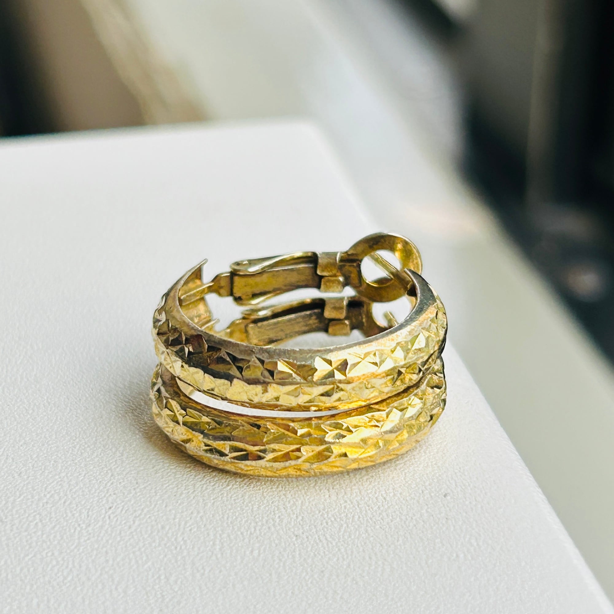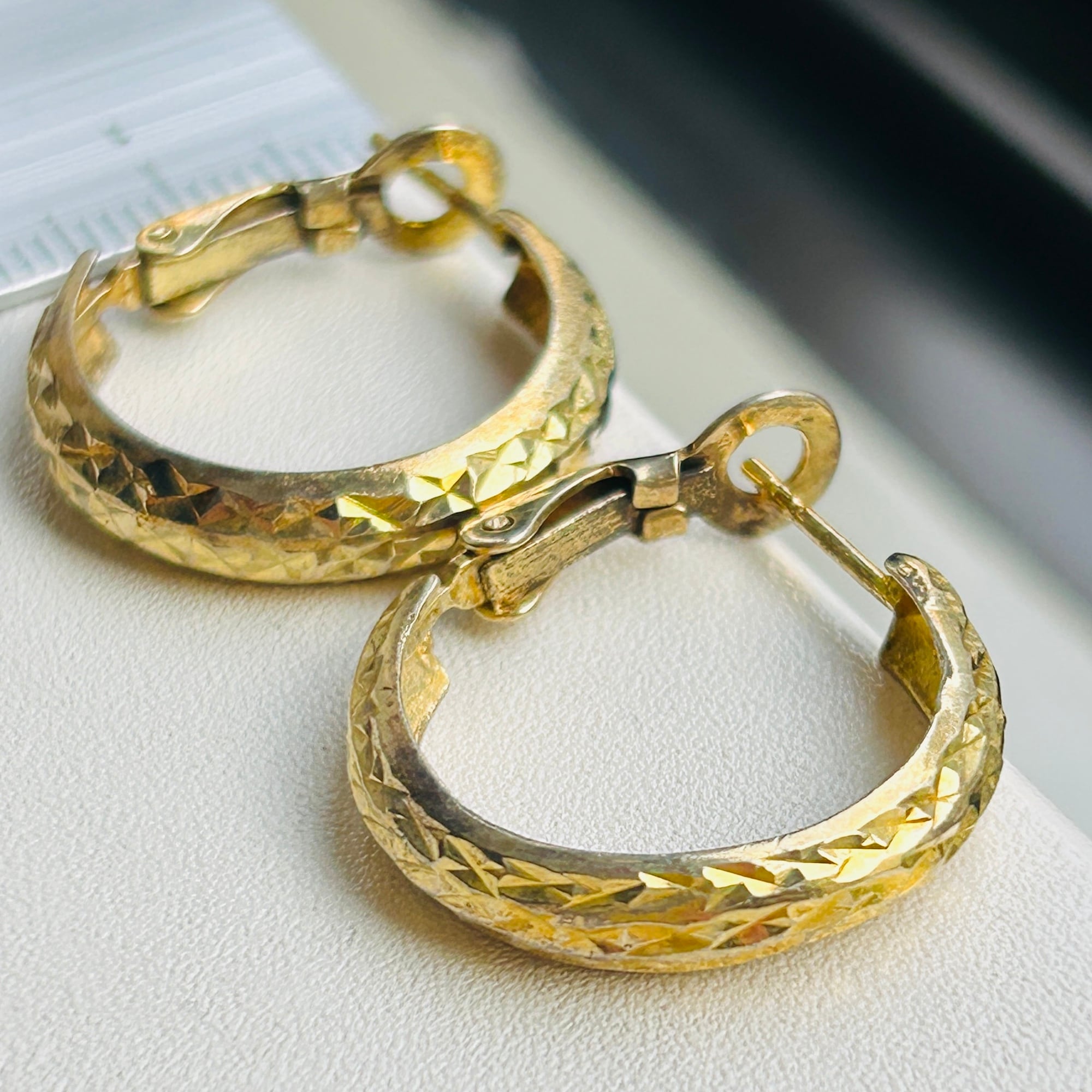 カット模様が除どこされた金メッキフープ。カットによる眩い大人なキラキラが素敵です。キャッチ不要のクリップバック。圧がかからずとても着け心地が良いです。現状いい感じの金古美です。研磨剤の入っていないクロスまたはウェットティッシュでのお手入れでいいと思います。ぬるま湯に洗剤や石鹸で洗いと濯ぎもできます。針に「925S」刻印。