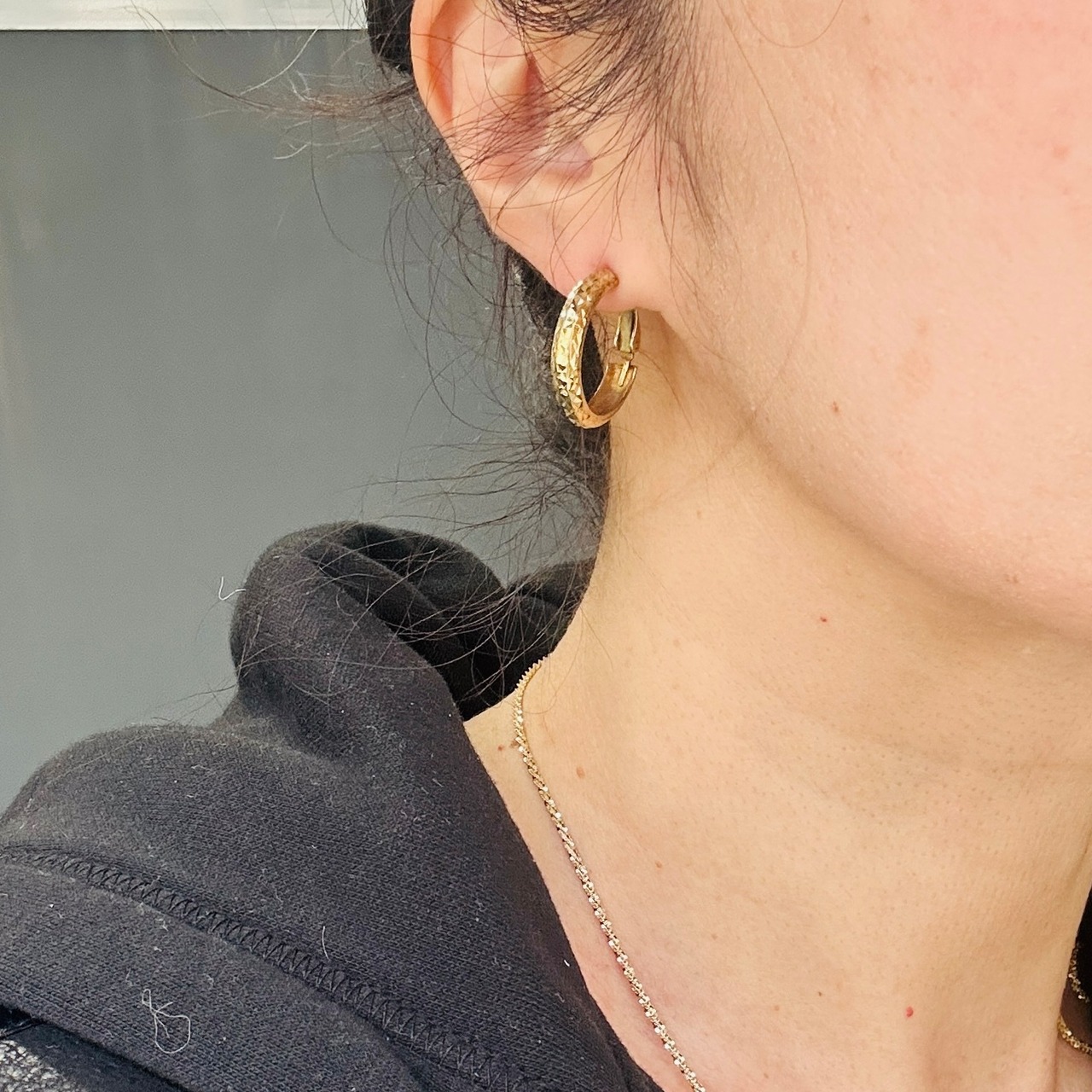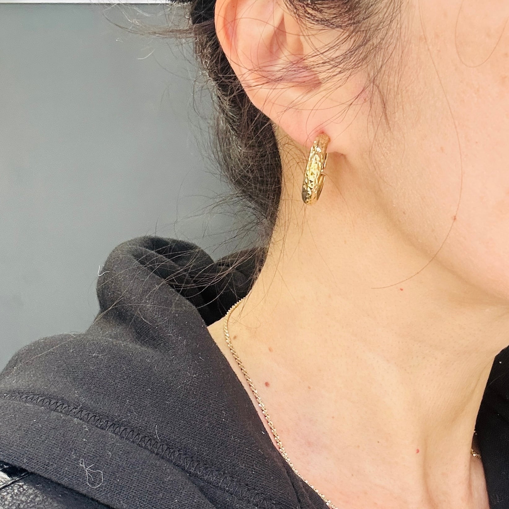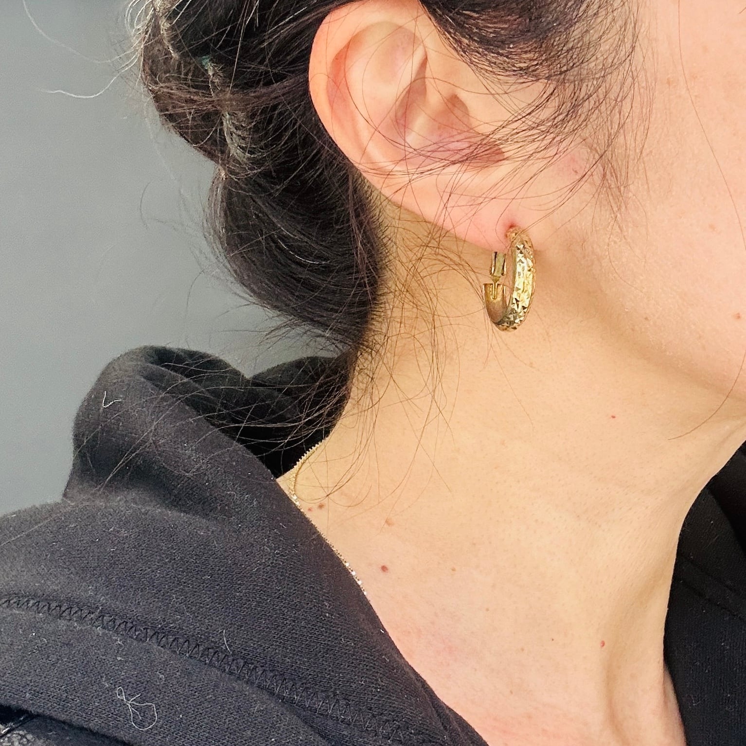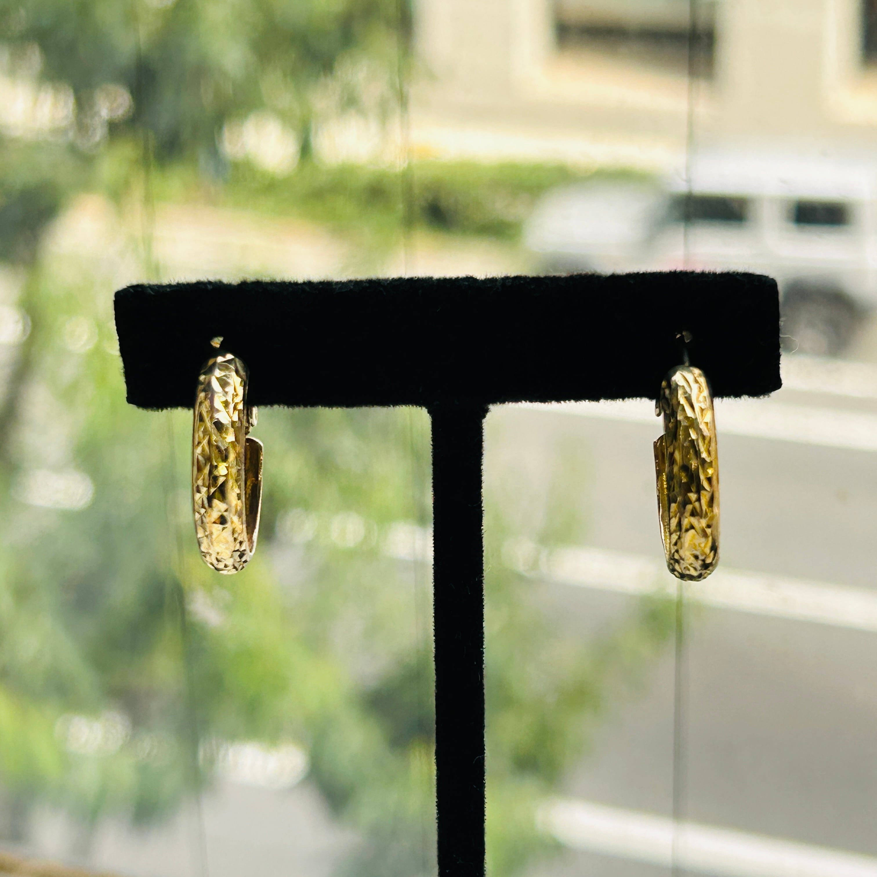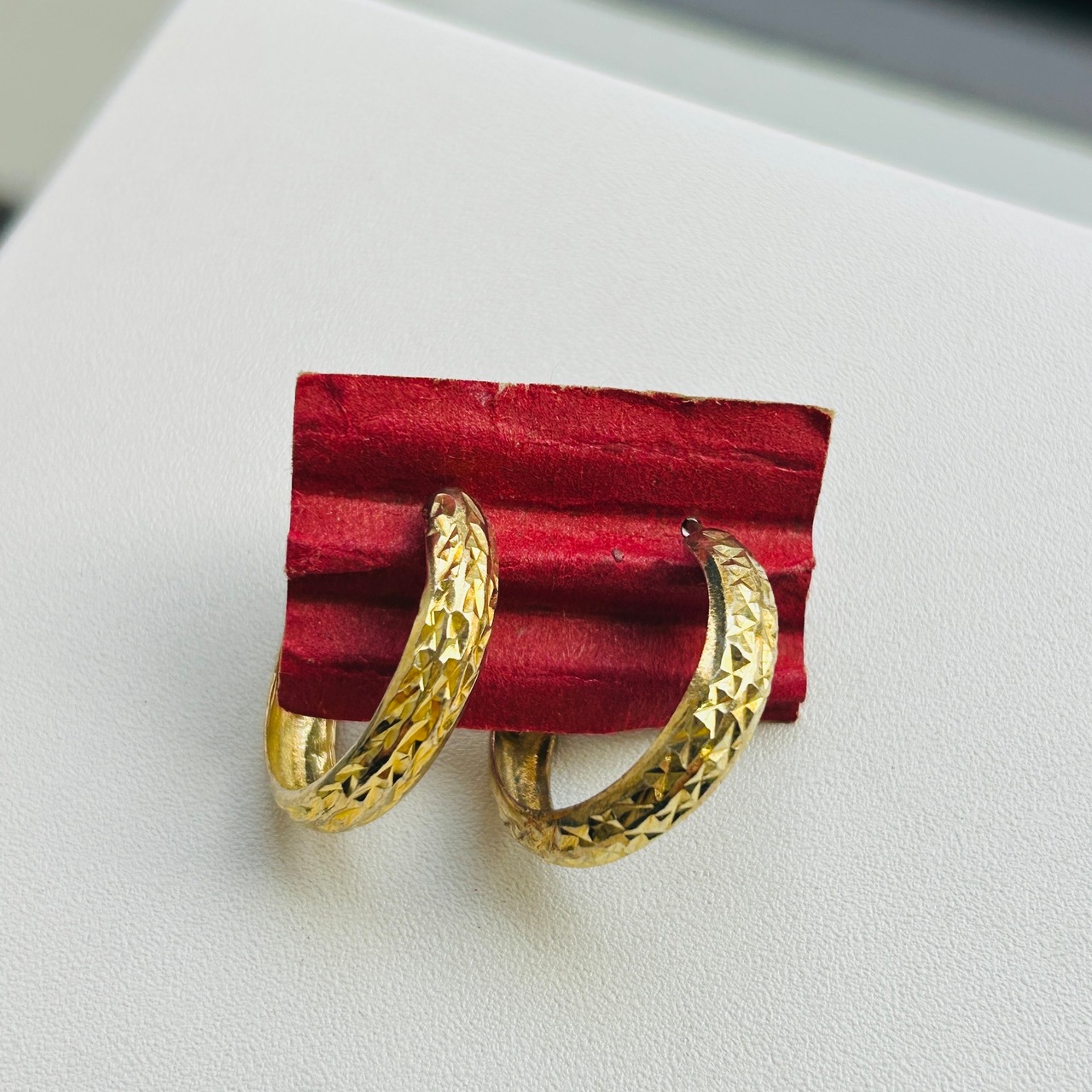 カット模様が除どこされた金メッキフープ。カットによる眩い大人なキラキラが素敵です。キャッチ不要のクリップバック。圧がかからずとても着け心地が良いです。現状いい感じの金古美です。研磨剤の入っていないクロスまたはウェットティッシュでのお手入れでいいと思います。ぬるま湯に洗剤や石鹸で洗いと濯ぎもできます。針に「925S」刻印。