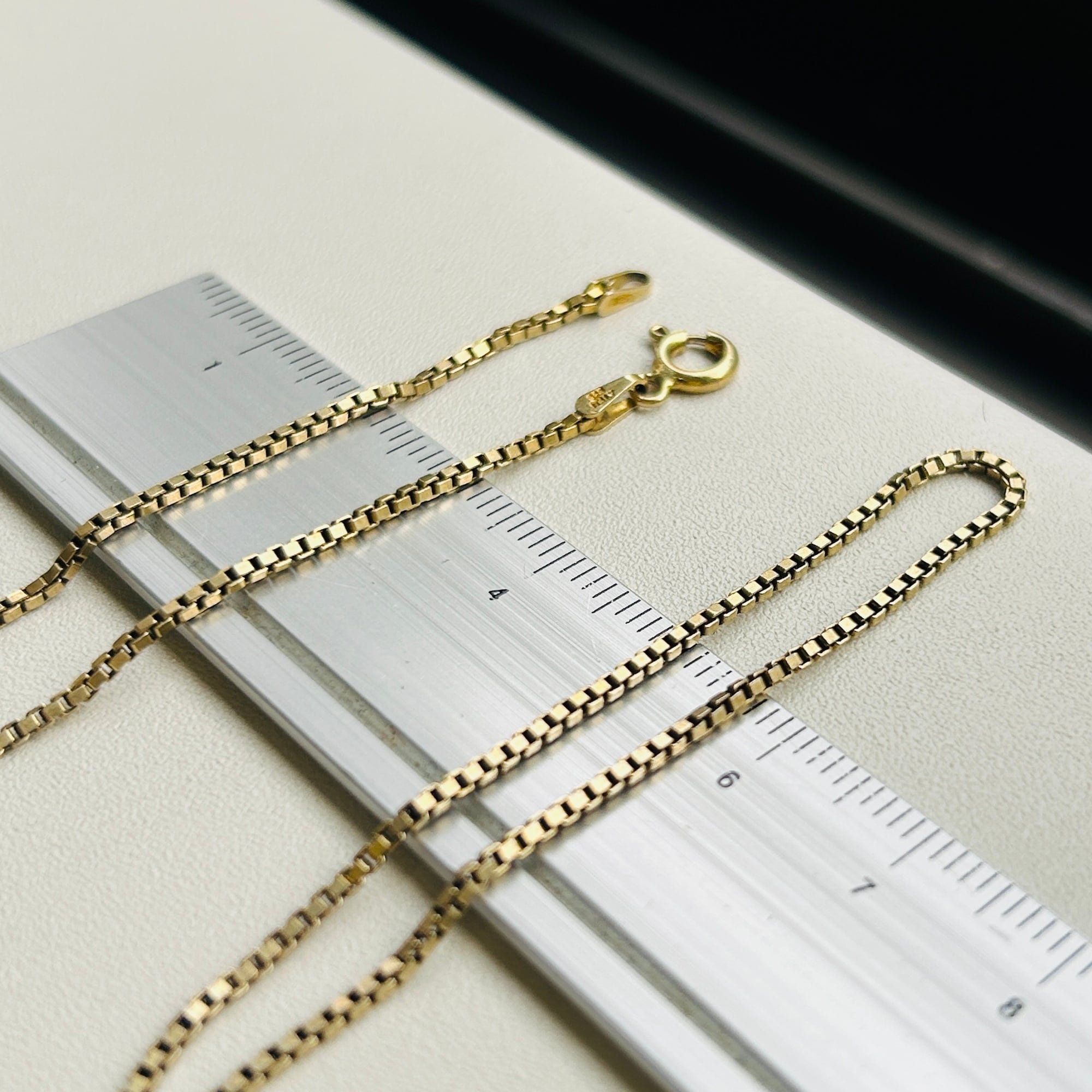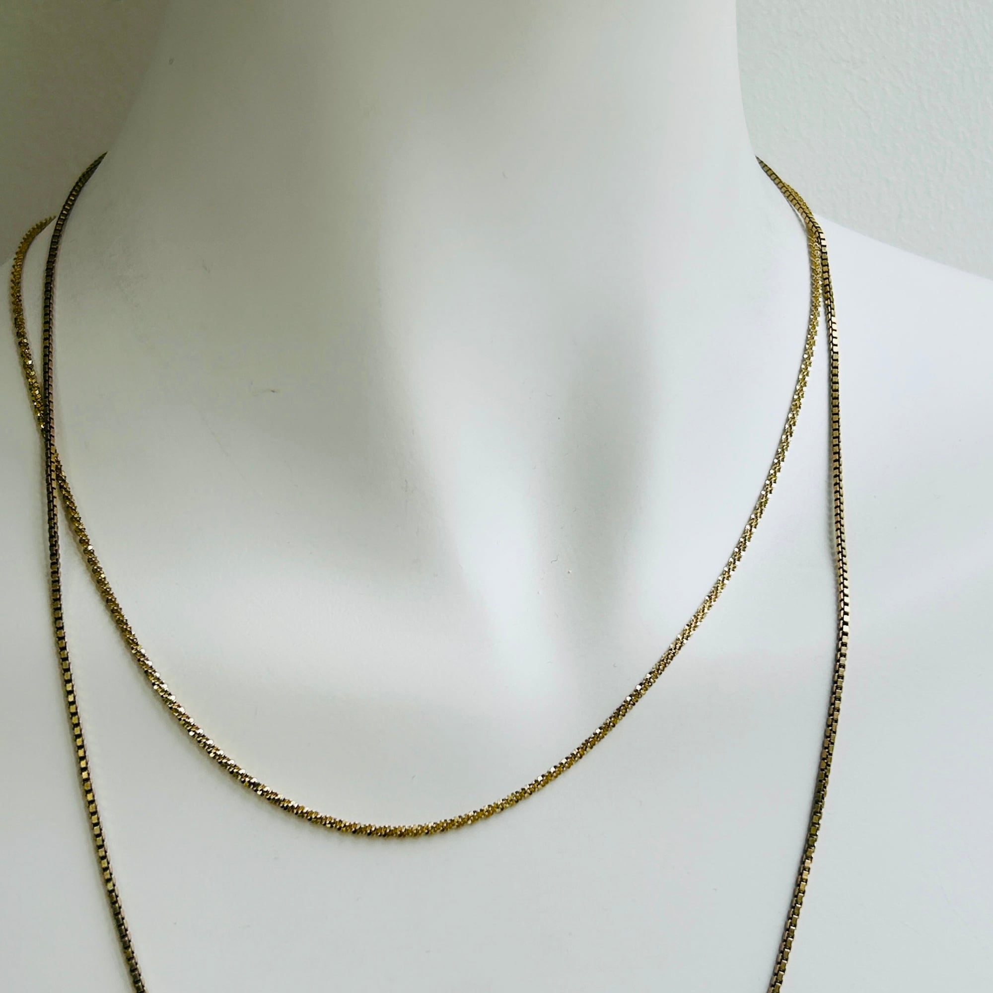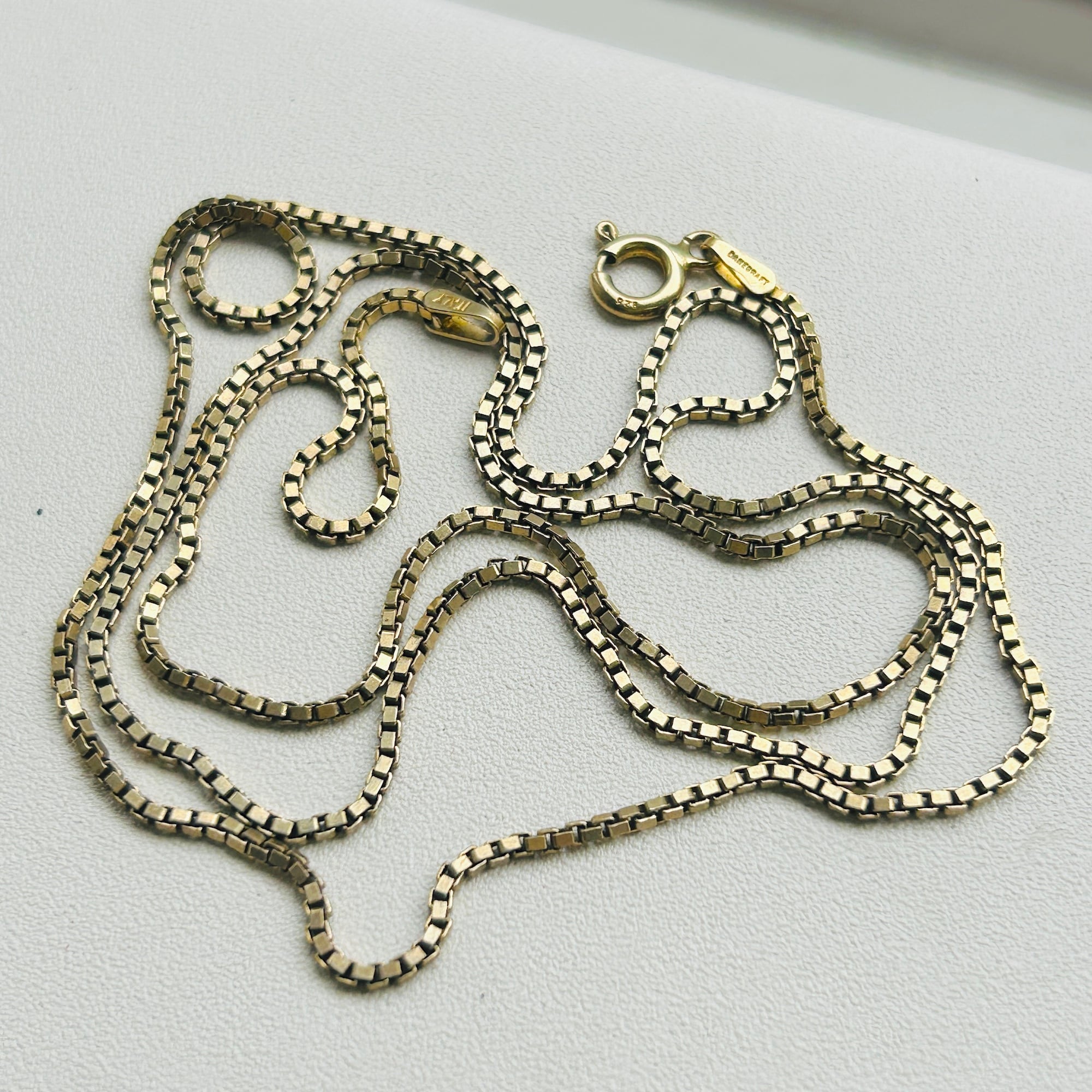 セミマットゴールドカラーボックスチェーン。シルバー925に金メッキが施されたチェーンです。径約1.5mm、しっかりしたボックスチェーンでラインがクッキリしています。単体やチャームと合わせて楽しんで頂けます。ピカピカすぎないのでシルバーとも馴染みやすいです。お手入れは研磨剤の含まれていないクロスで拭き取り、ぬるま湯に洗剤や石鹸で洗いと濯ぎがオススメです。