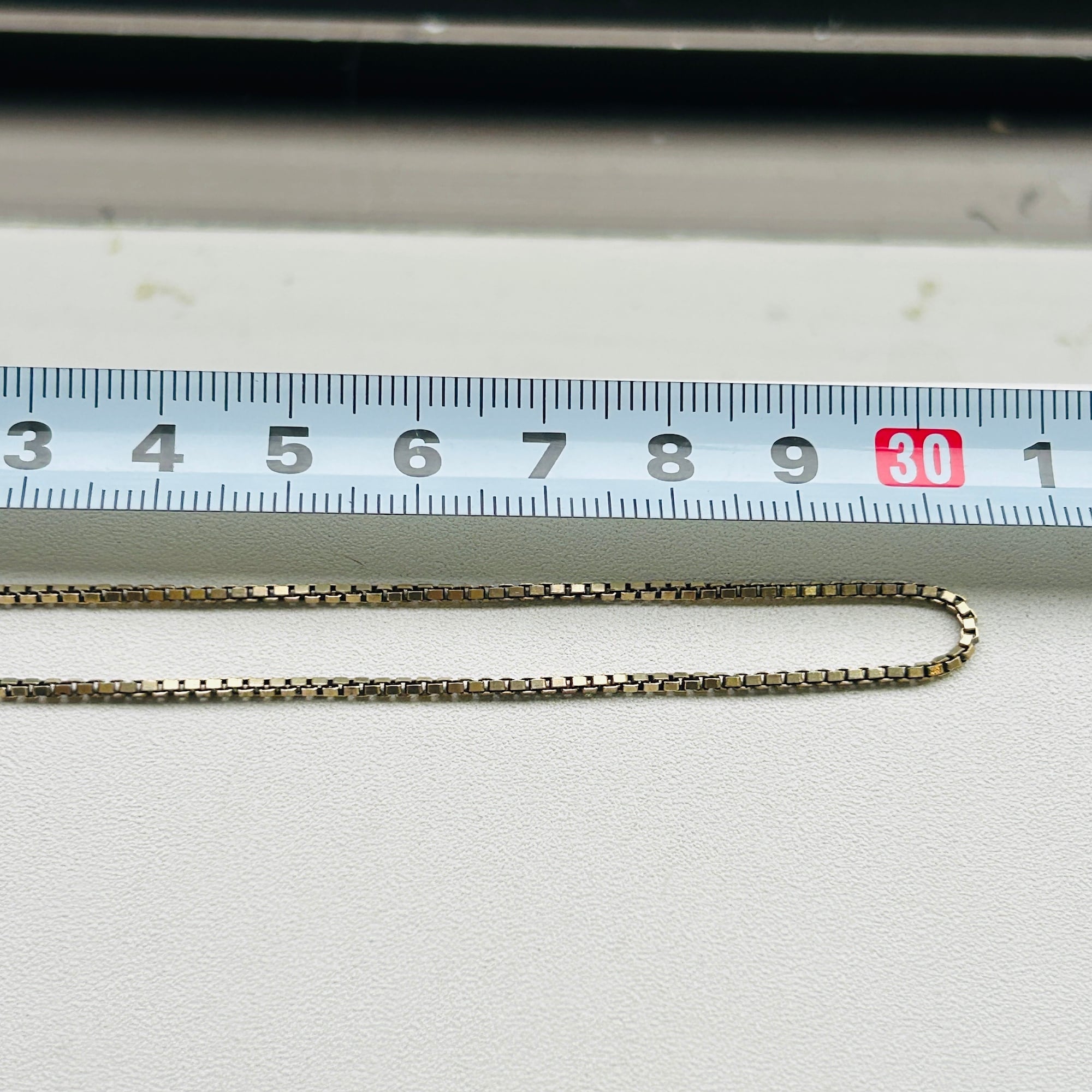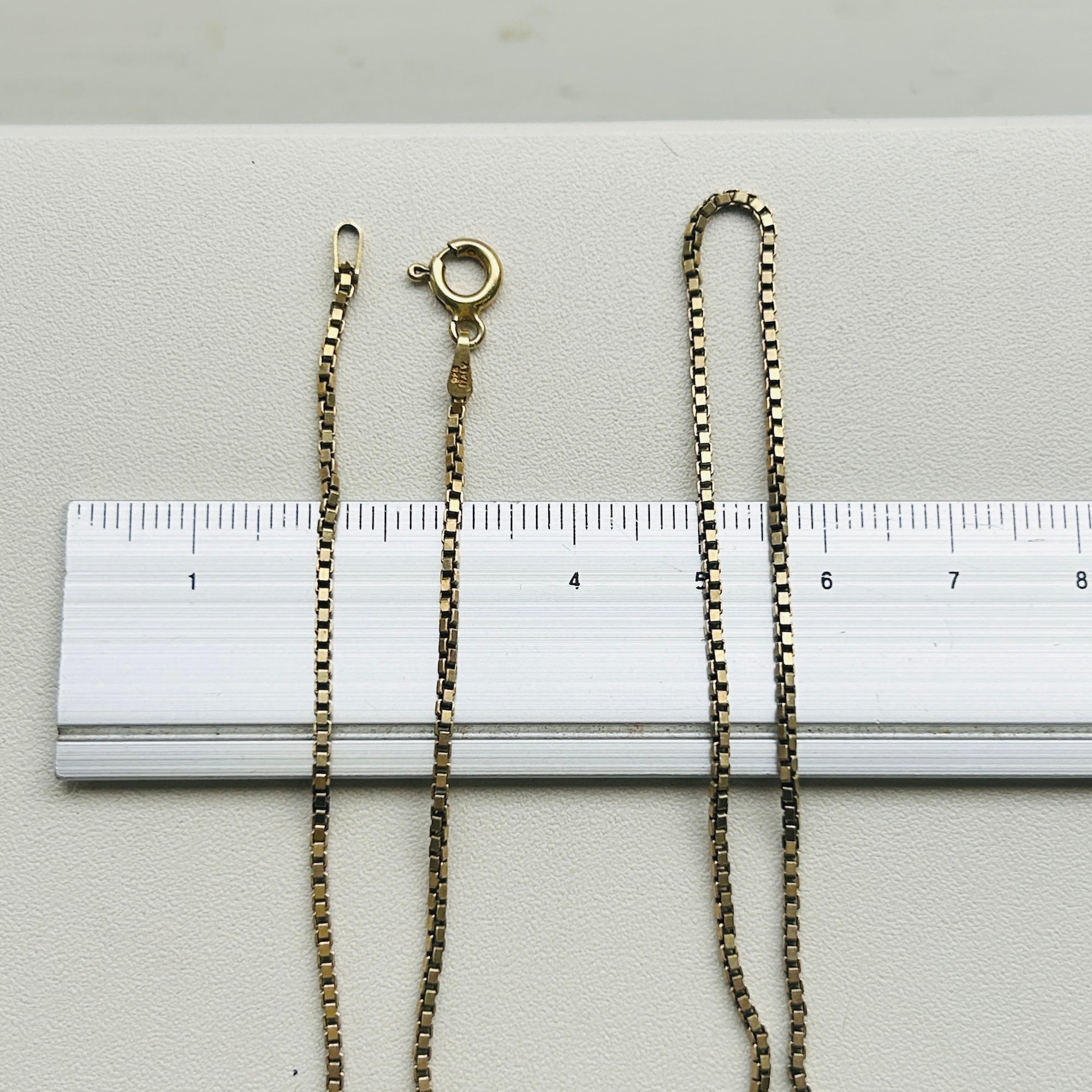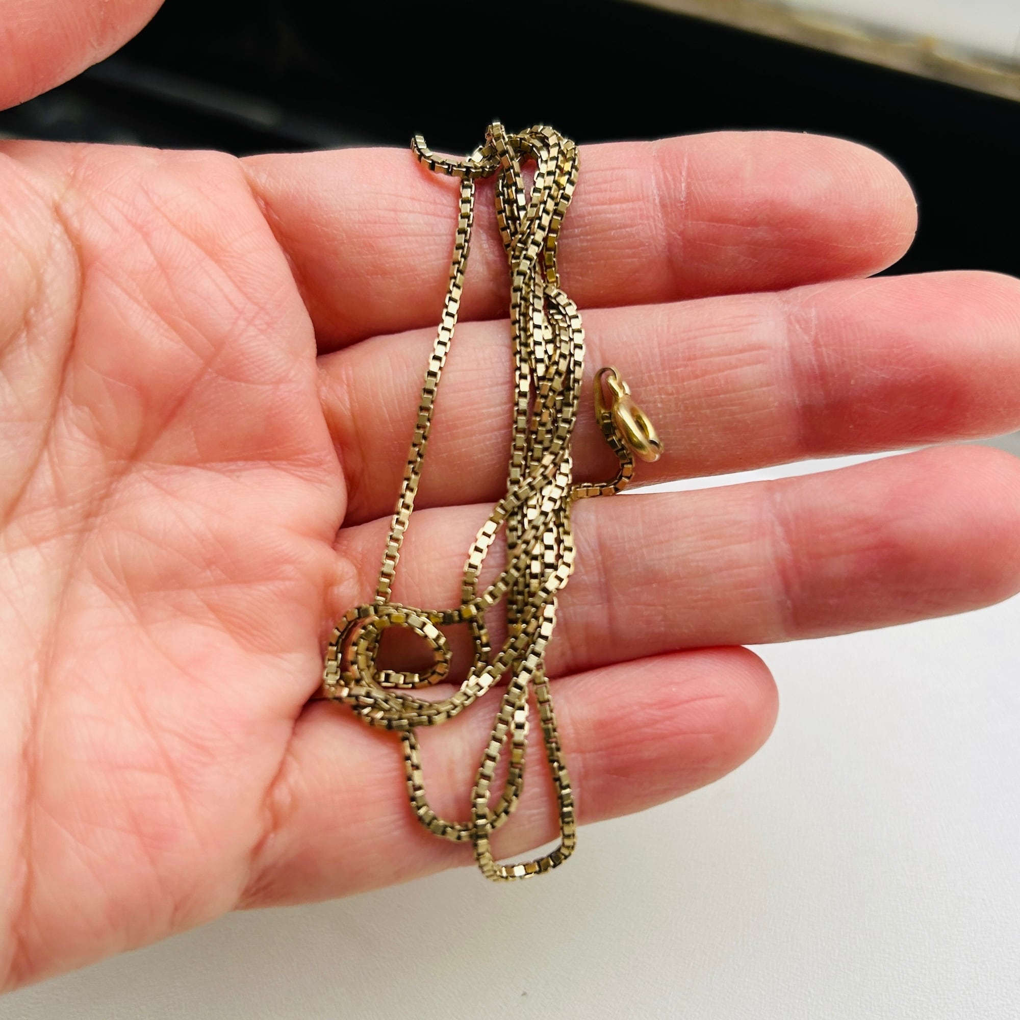 セミマットゴールドカラーボックスチェーン。シルバー925に金メッキが施されたチェーンです。径約1.5mm、しっかりしたボックスチェーンでラインがクッキリしています。単体やチャームと合わせて楽しんで頂けます。ピカピカすぎないのでシルバーとも馴染みやすいです。お手入れは研磨剤の含まれていないクロスで拭き取り、ぬるま湯に洗剤や石鹸で洗いと濯ぎがオススメです。
