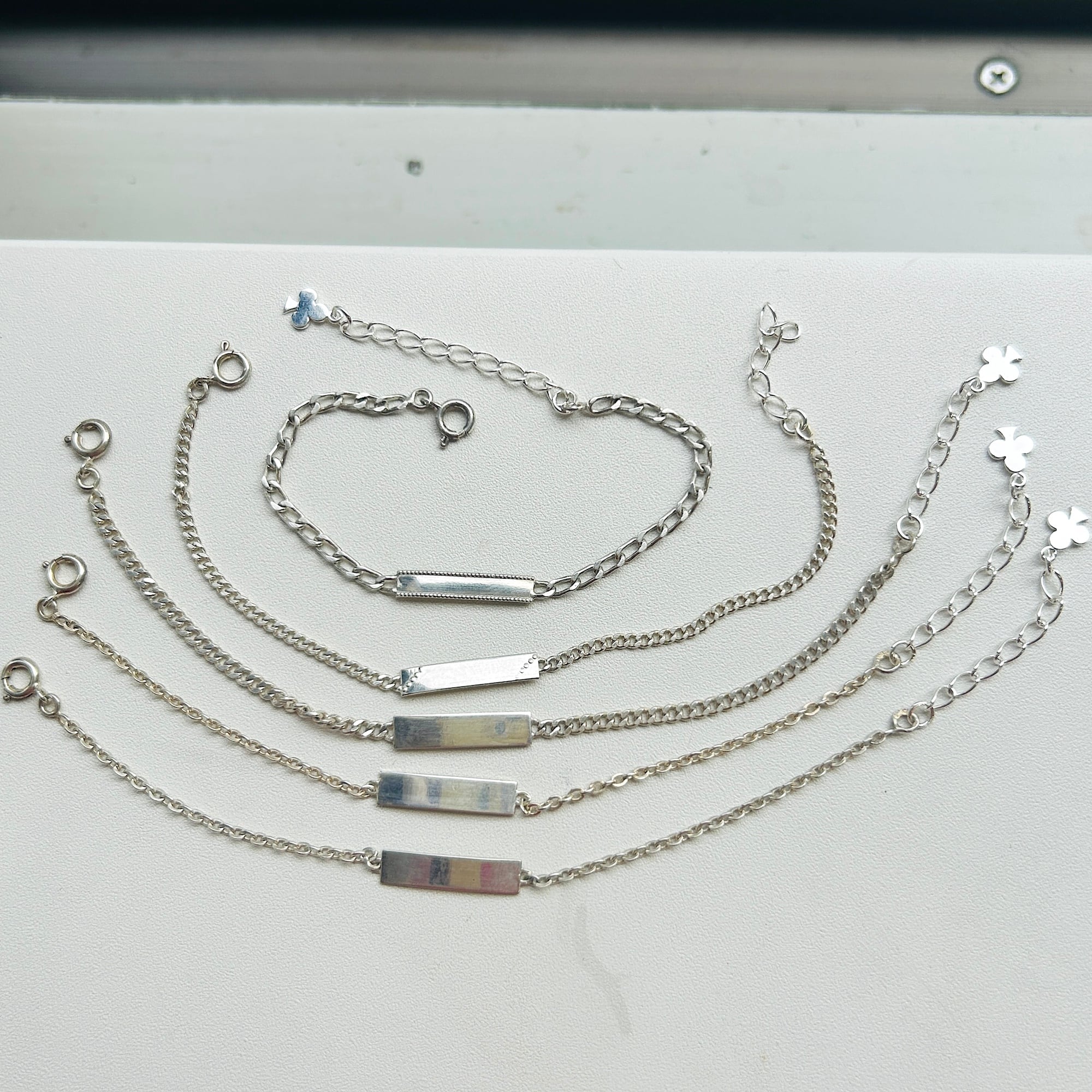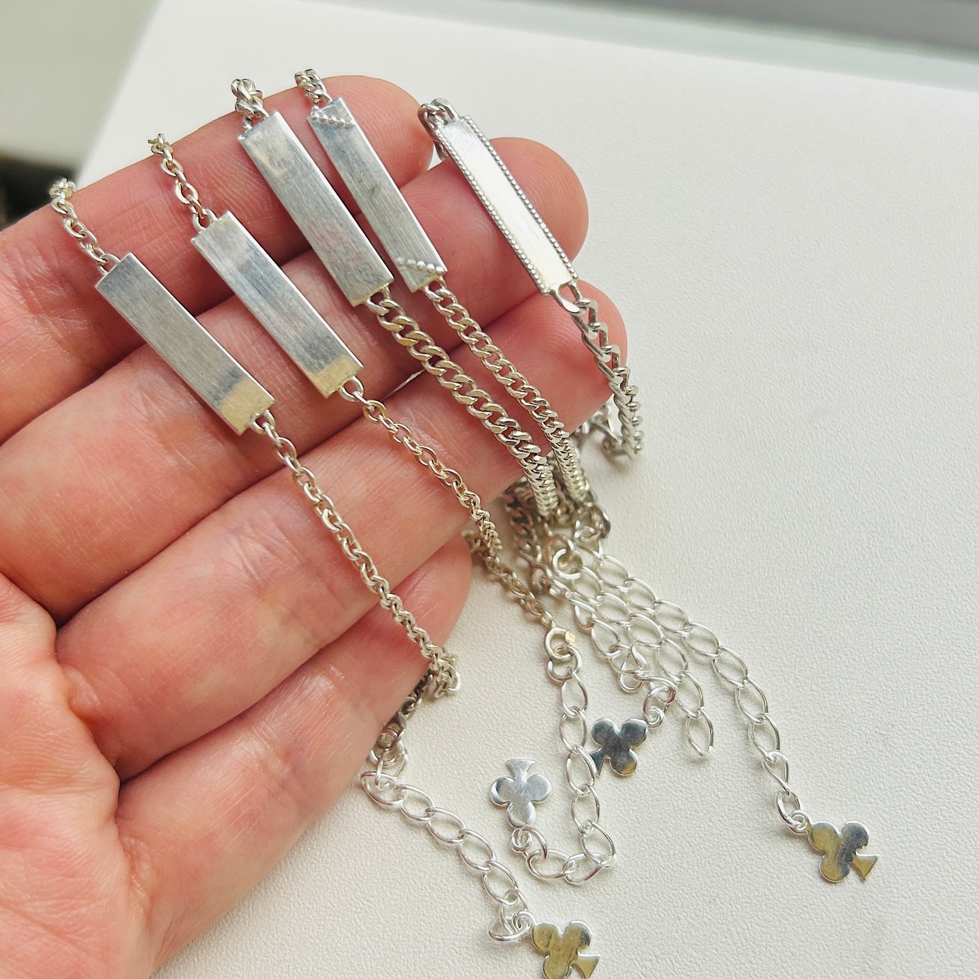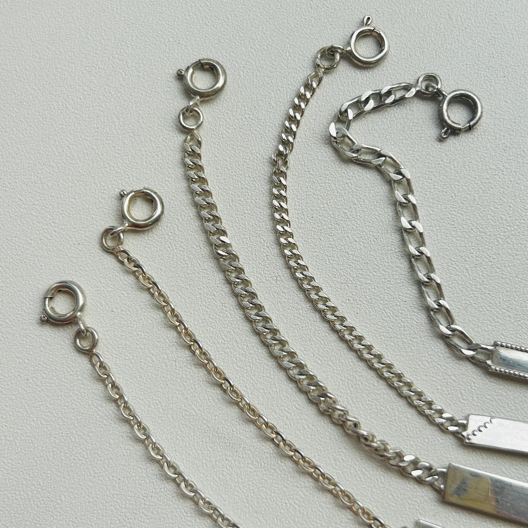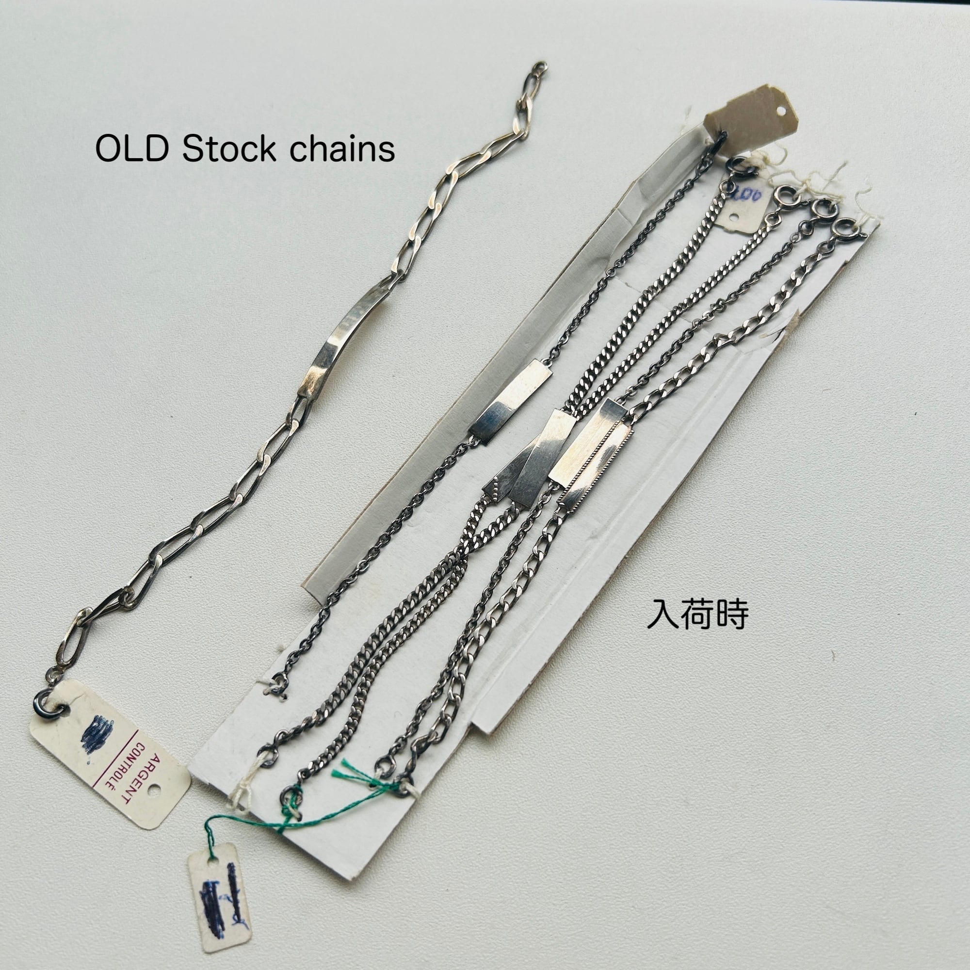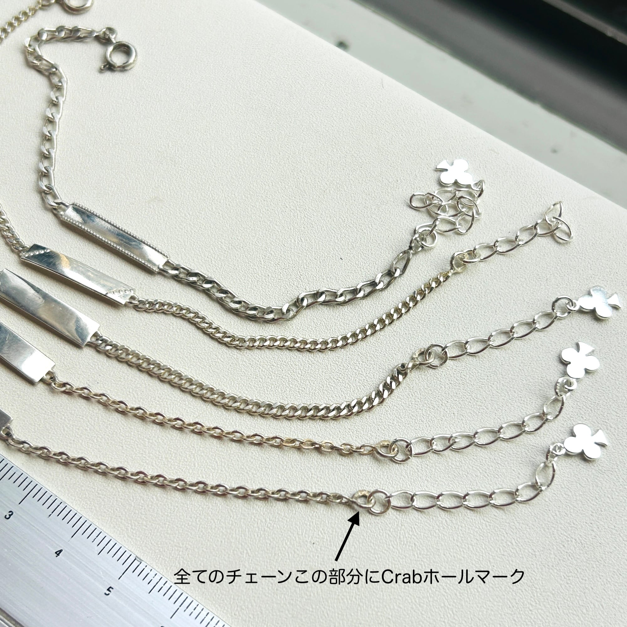 子供サイズの短いシルバーブレスレットを厚紙に結び付けられた未使用状態で入荷しました。短くて需要の少なそうなブレスレットに市販アジャスターチェーン(シルバー925製)を付けてアップサイクルしました。全て長さ17cmくらいに仕上げています。引き輪を引っ掛けるドーナツ型の輪にはcrab刻印がそれぞれ2つずつ押されています。crabマークはフランス製シルバー800を保証、1838〜1984年まで使用されたマークです。