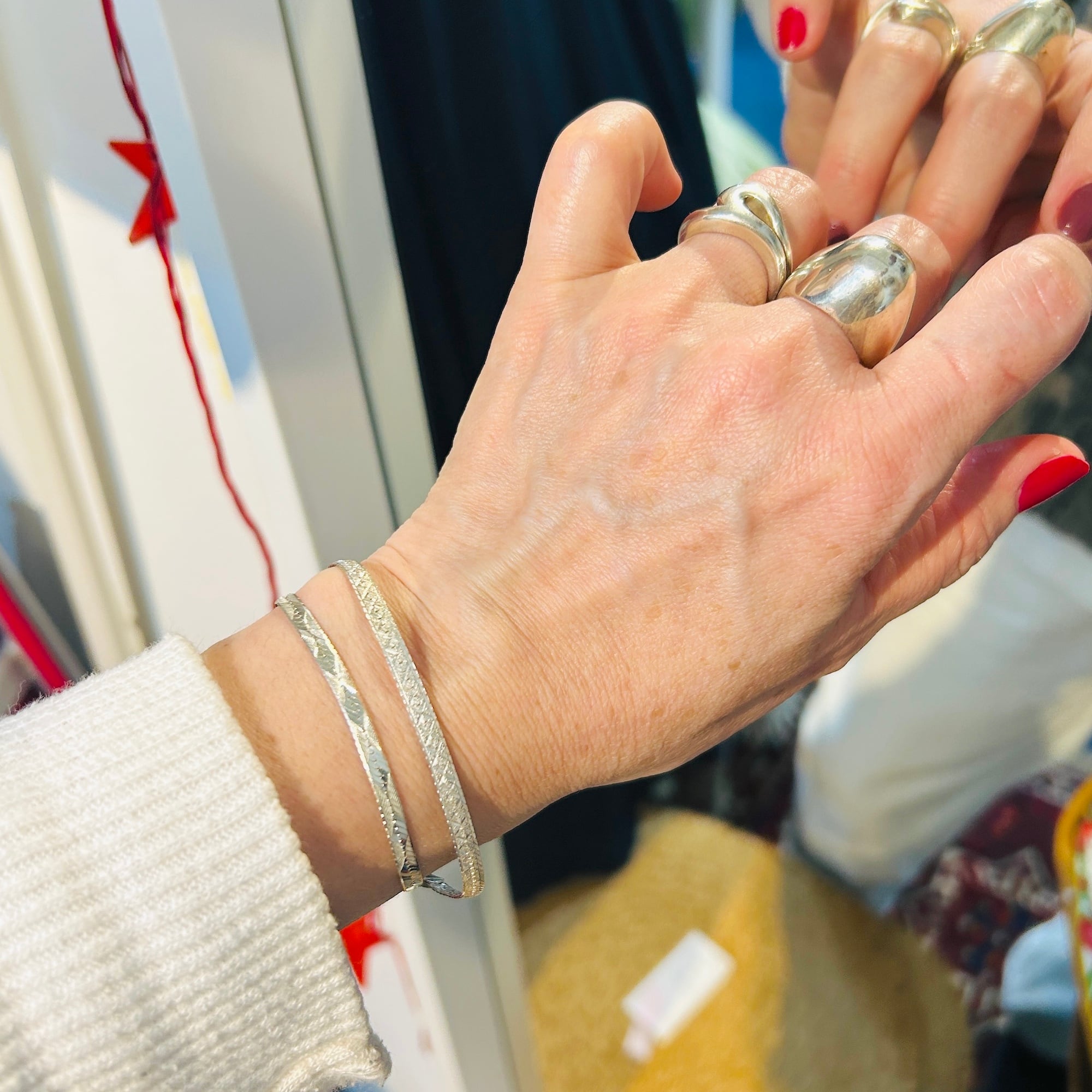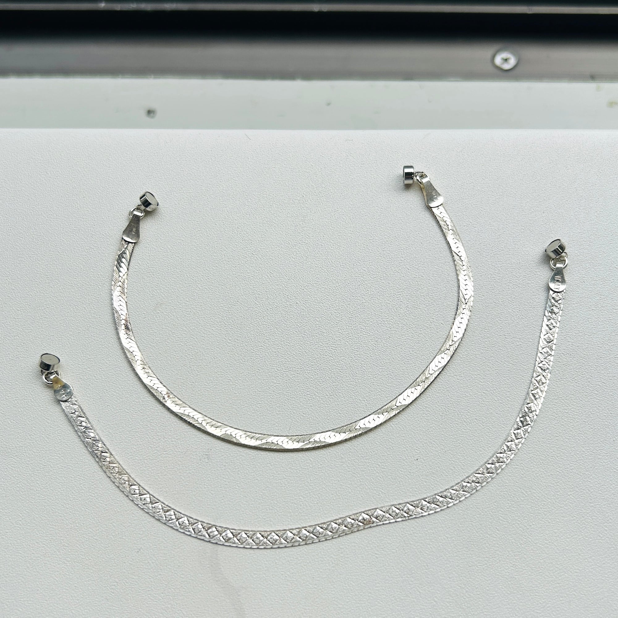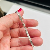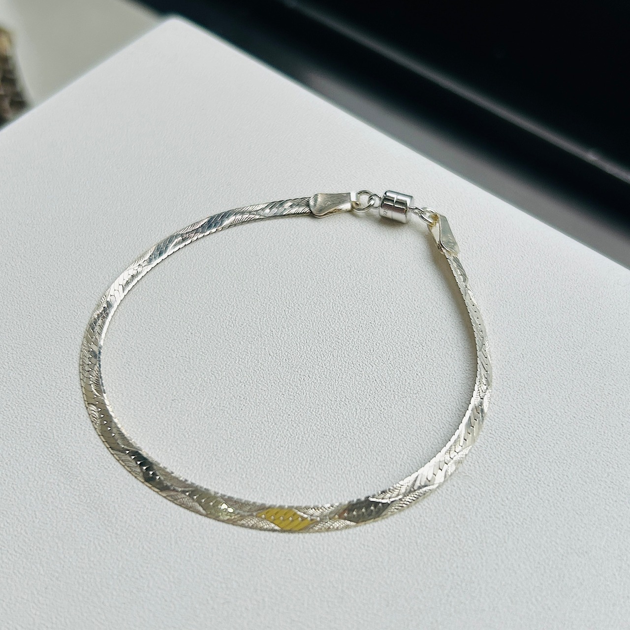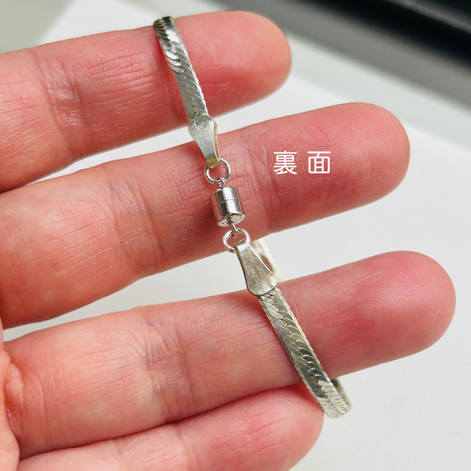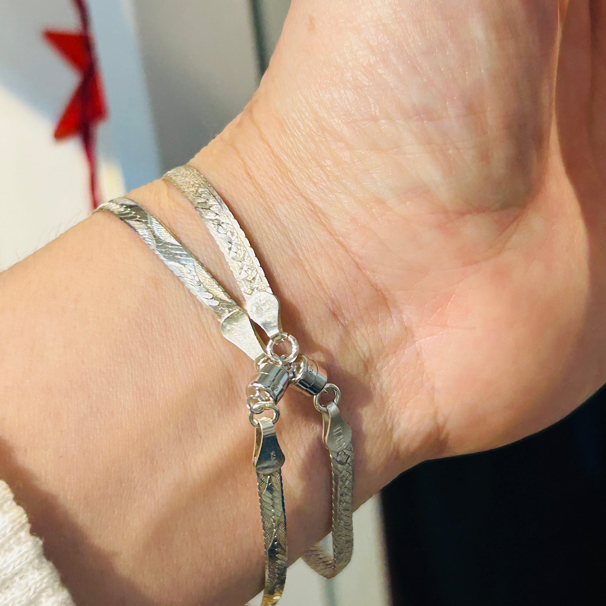 片手で着脱が難しかったブレスレットをマグネット金具に交換しました。素敵な模様入りヘリンボーンです。キラキラとキレイな輝きです。もう1つマグネット金具に交換したブレスレットと重ね着けもオススメです。マグネット金具同士がくっついてしまいますが強度が増すような感じもします。マグネット金具もシルバ925製です。Great Price❤︎