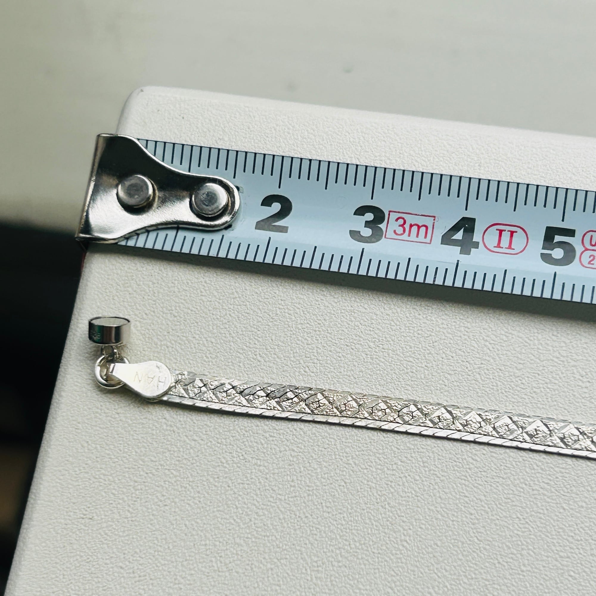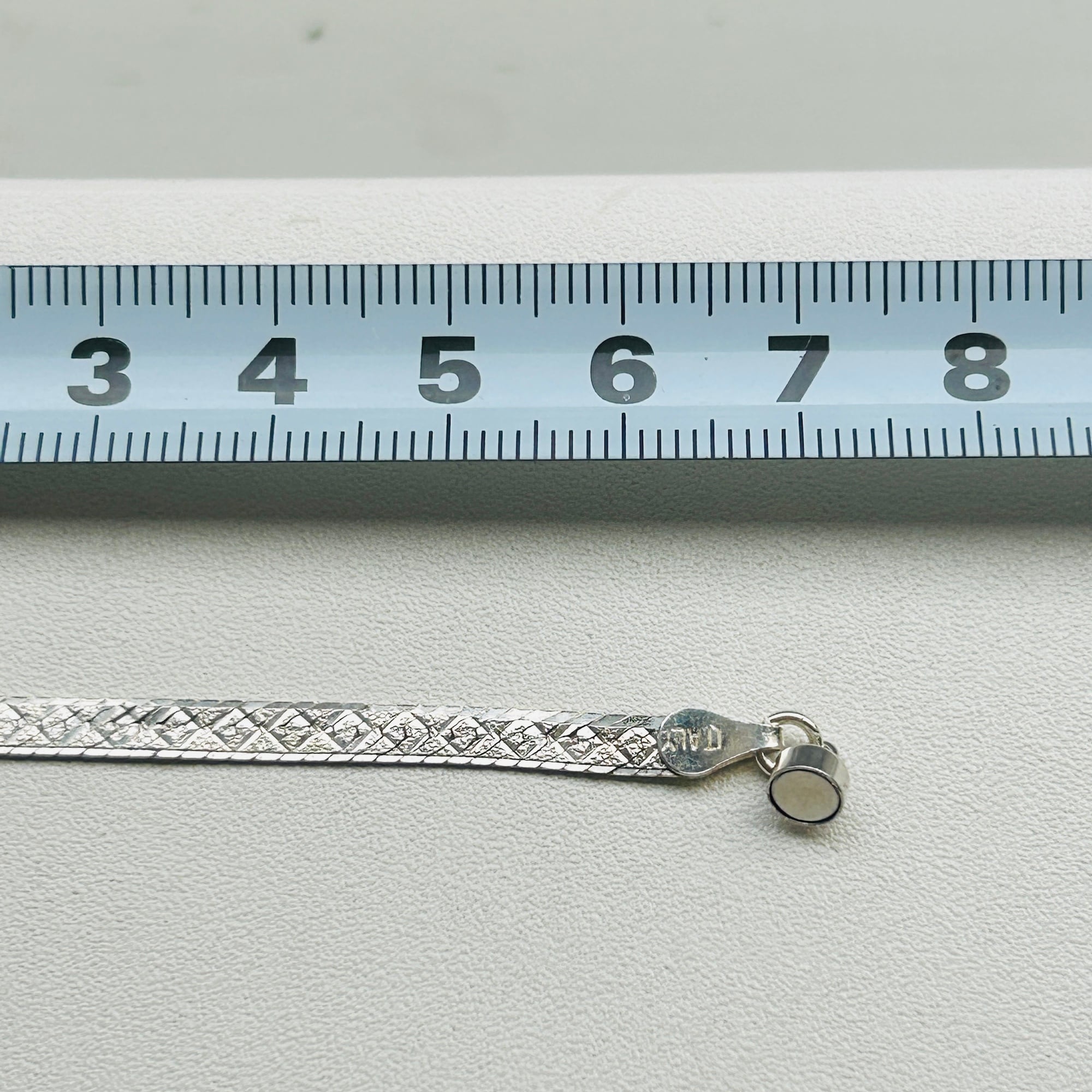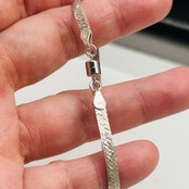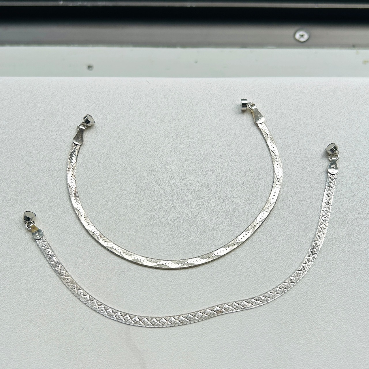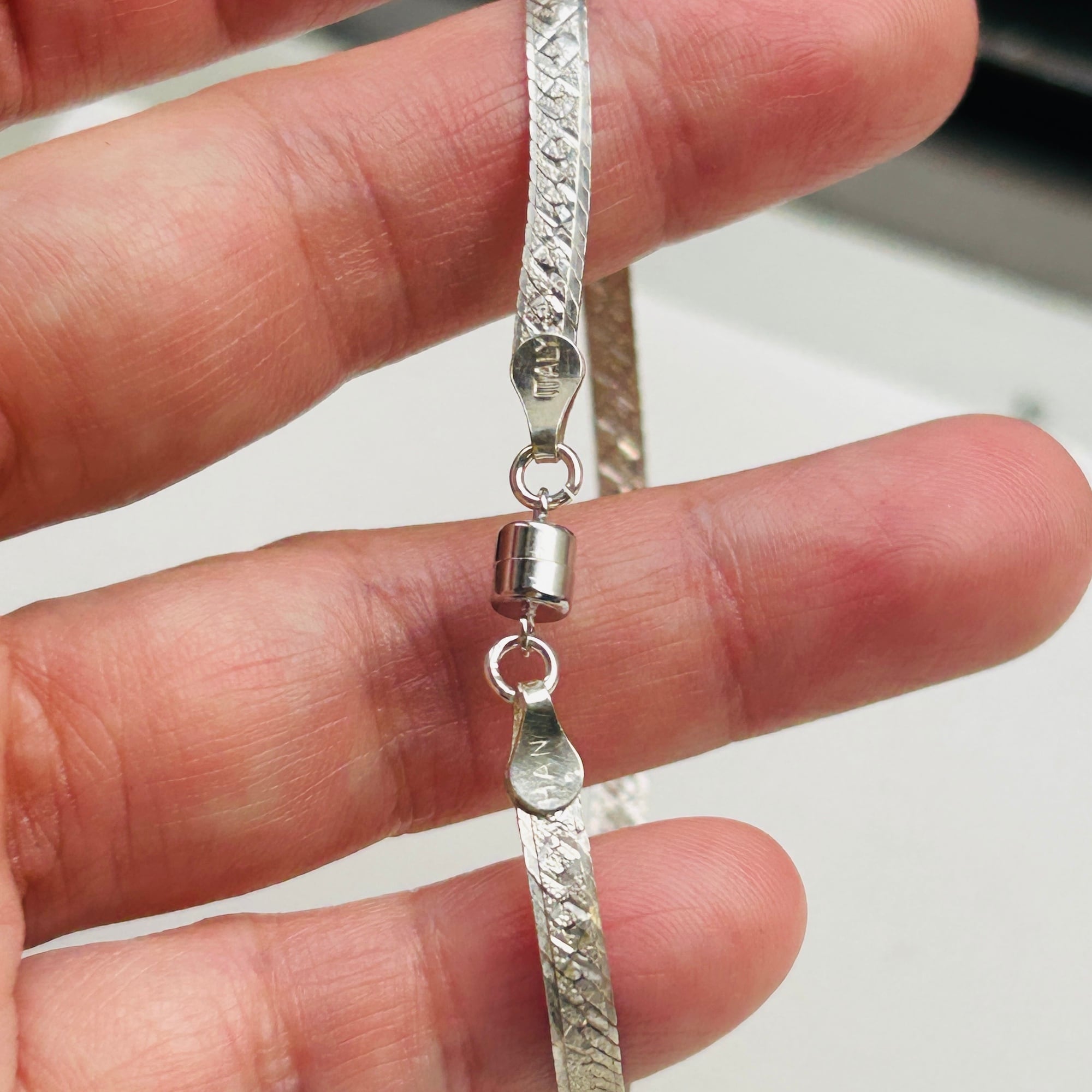 片手で着脱が難しかったブレスレットをマグネット金具に交換しました。両面同じ模様が施されたアルミ調のセミマットなヘリンボーンシルバーです。もう1つマグネット金具に交換したブレスレットと重ね着けもオススメです。マグネット金具同士がくっついてしまいますが強度が増すような感じもします。マグネット金具もシルバ925製です。Great Price❤︎