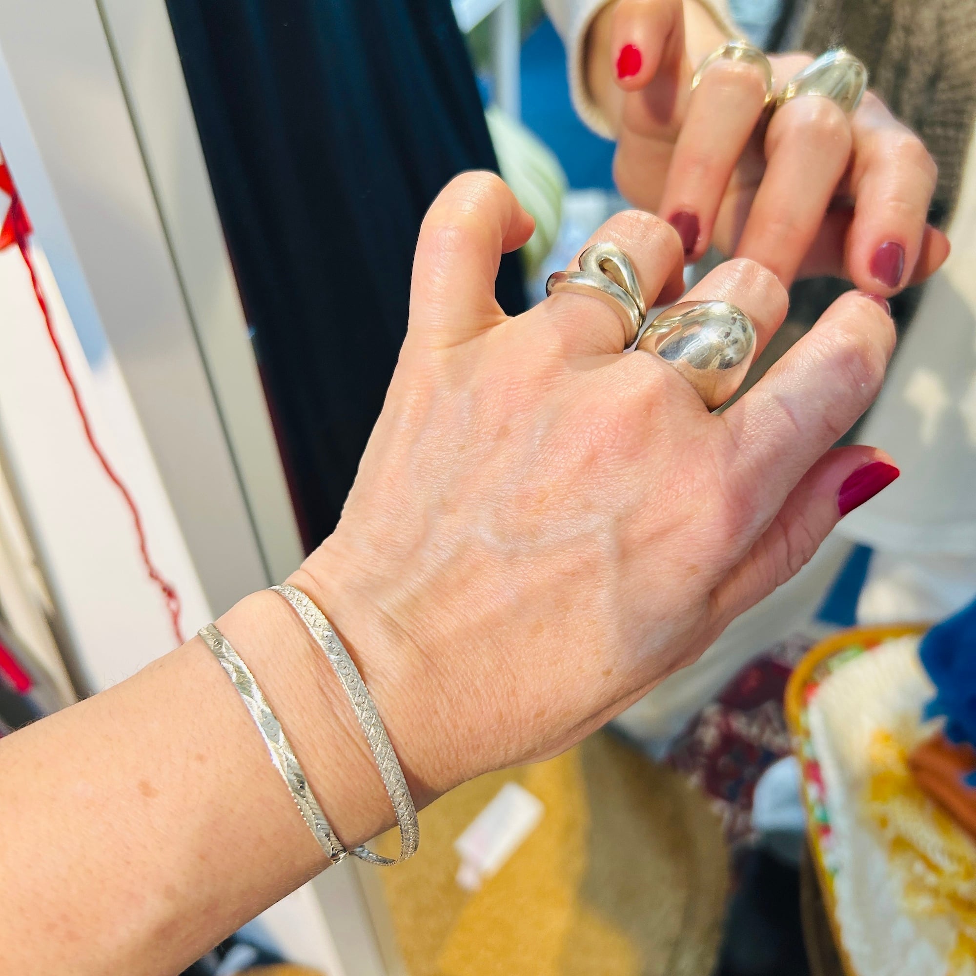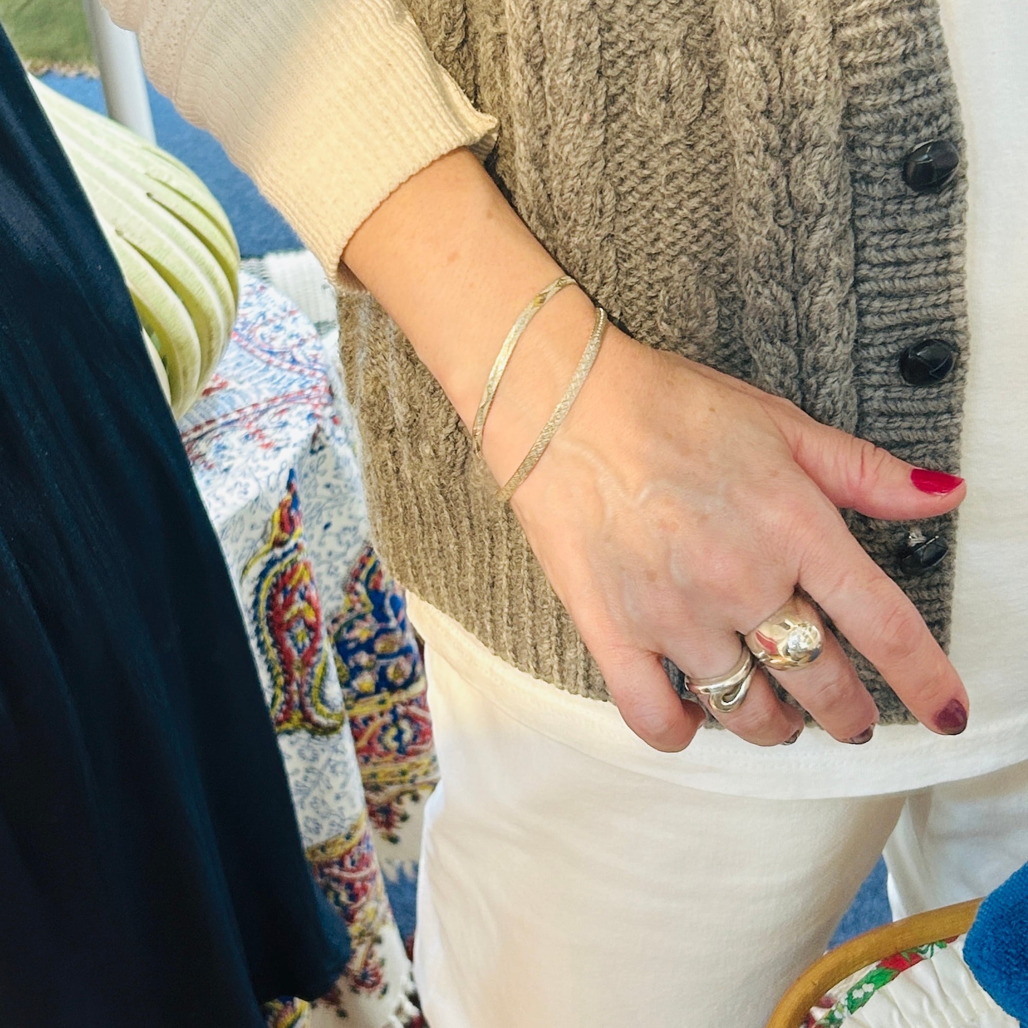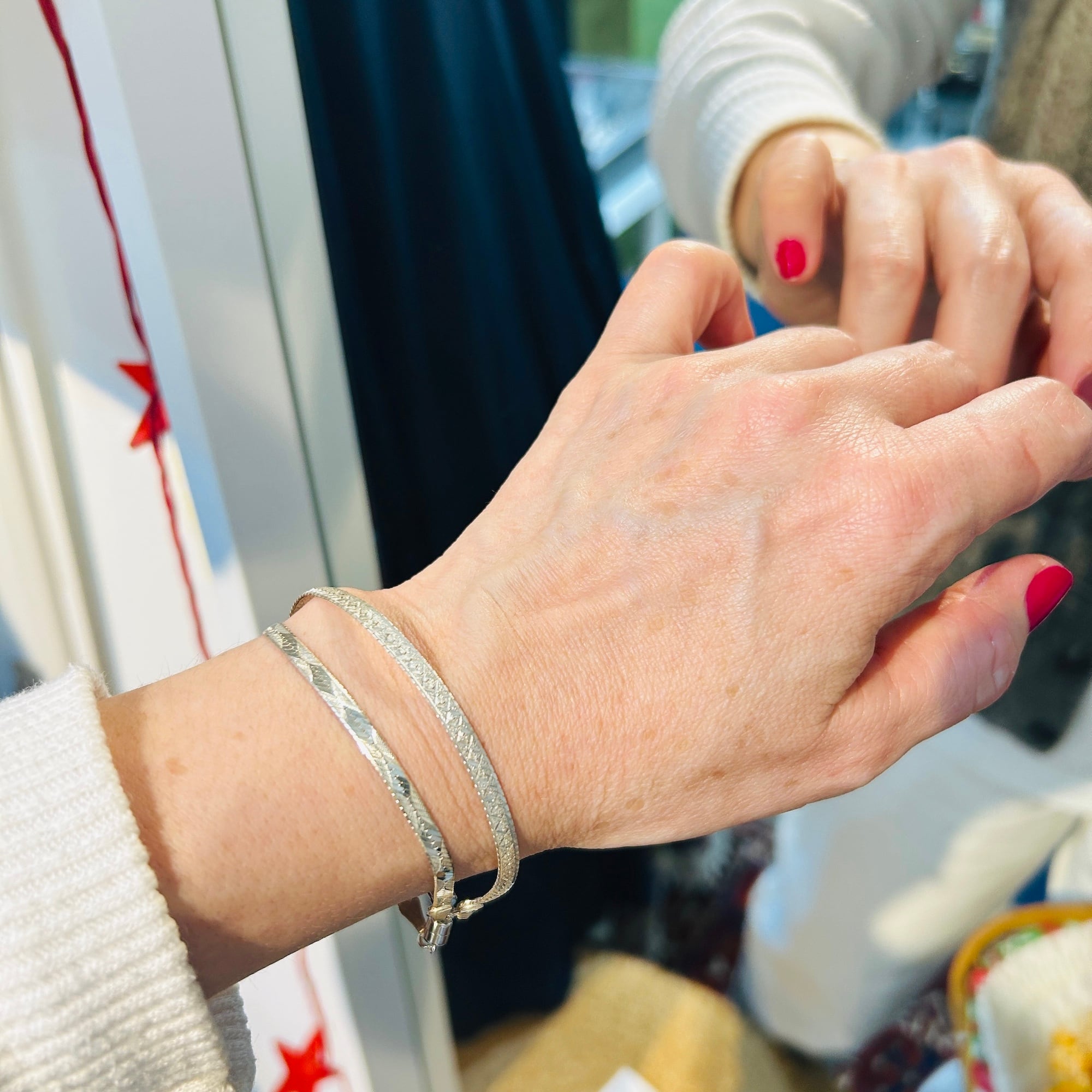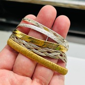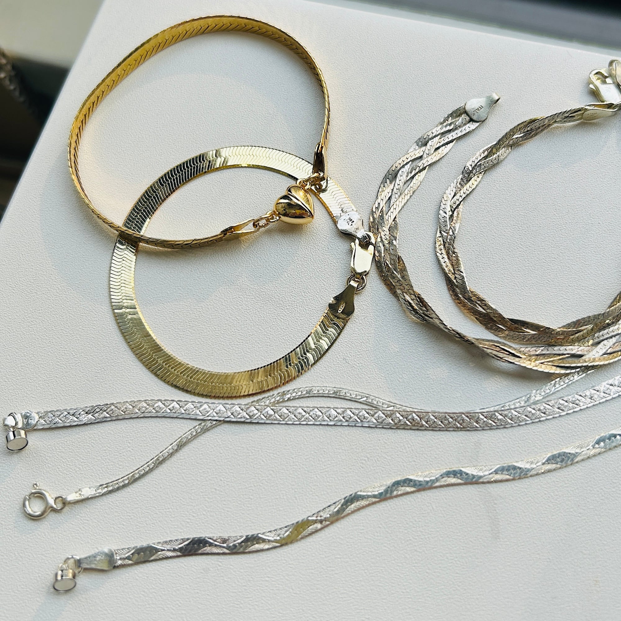片手で着脱が難しかったブレスレットをマグネット金具に交換しました。両面同じ模様が施されたアルミ調のセミマットなヘリンボーンシルバーです。もう1つマグネット金具に交換したブレスレットと重ね着けもオススメです。マグネット金具同士がくっついてしまいますが強度が増すような感じもします。マグネット金具もシルバ925製です。Great Price❤︎