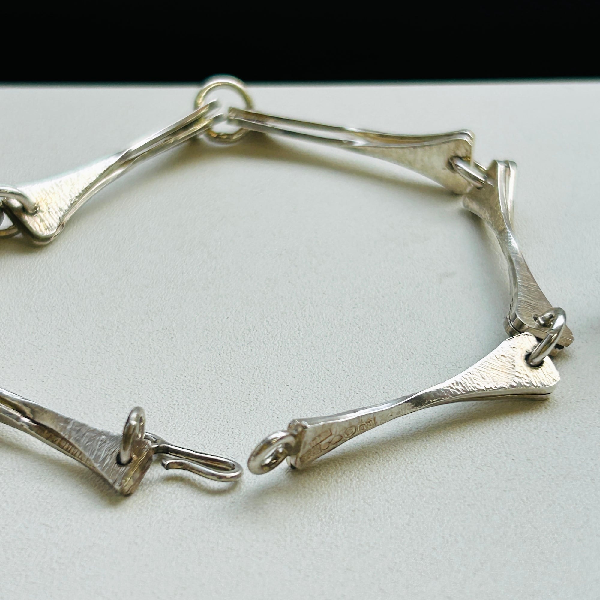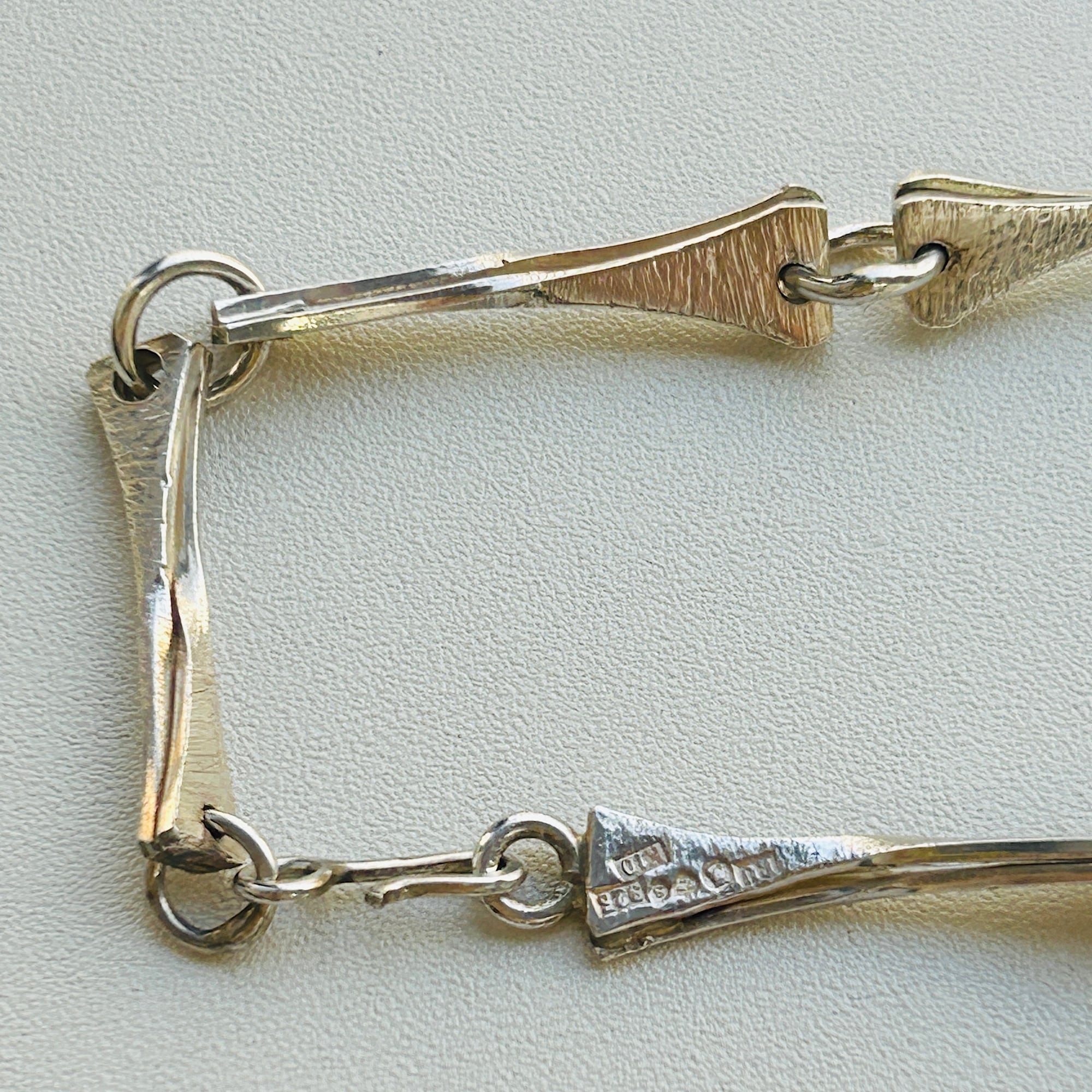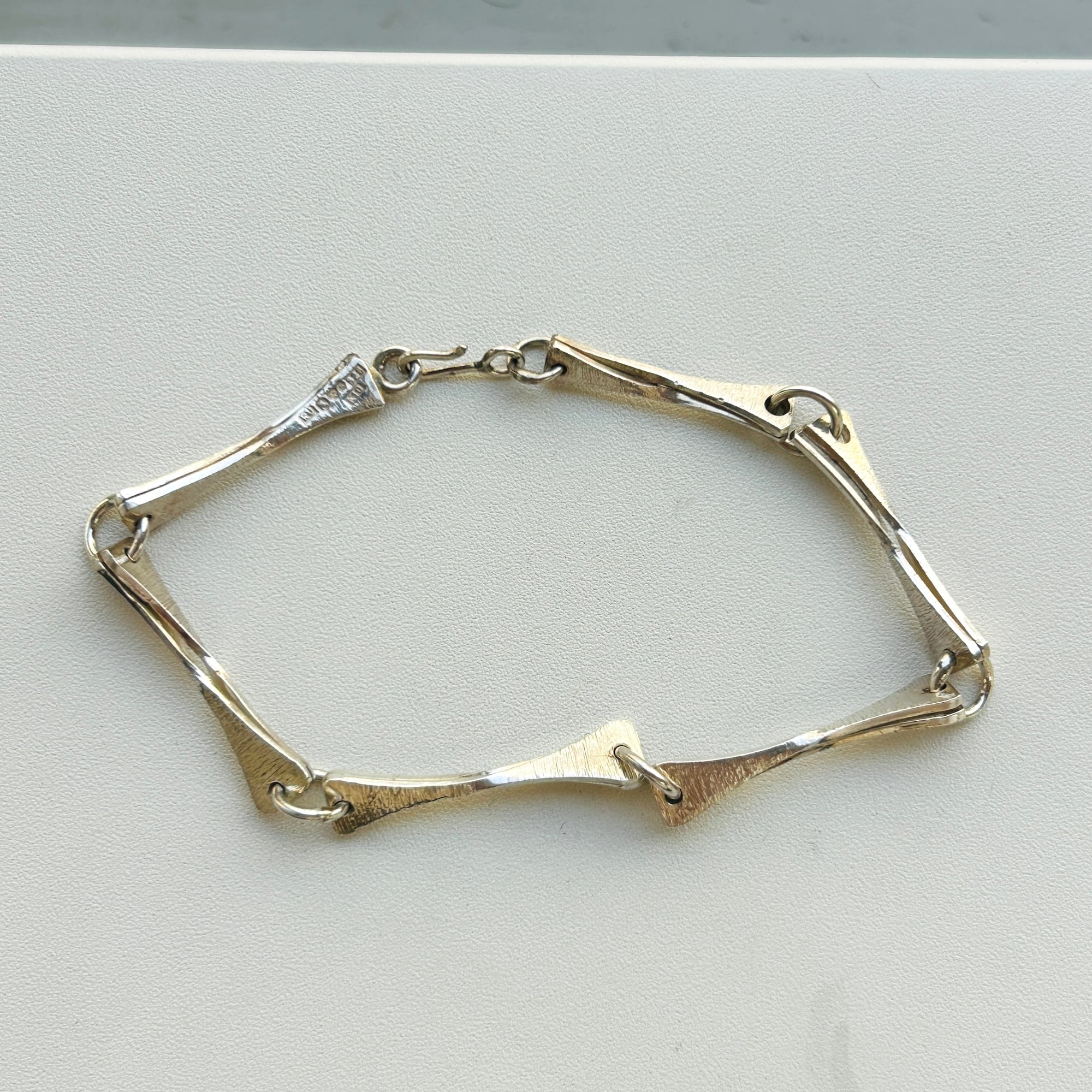 スウェーデンの名工・銀職人 Rey Urban(レイ・ウルバン・1929-2015)によるシルバーブレスレット。北欧らしいユニークパーツがリンク。シルバーの表面には浅い模様が施されています。留め具は引っ掛けフックです。グイっと押し込まないとフックがリングに通らないので外れる心配はないと思います。刻印は「Rey Urban」、「RU」「925」、「S」、Swedenマーク、製造年刻印。刻印から1984年製であることが分かります。こちらは1980年代、日本に輸入されたブレスレットの在庫品です。国内で長期保管されていました。箱やタグなど付属品はありませんが新品同様のコンディションです。